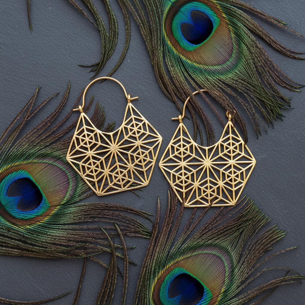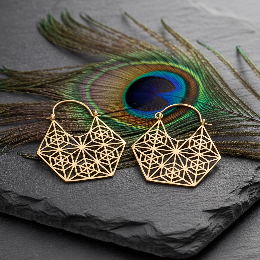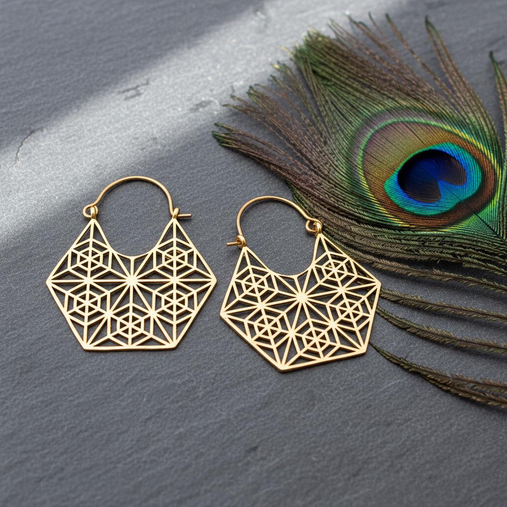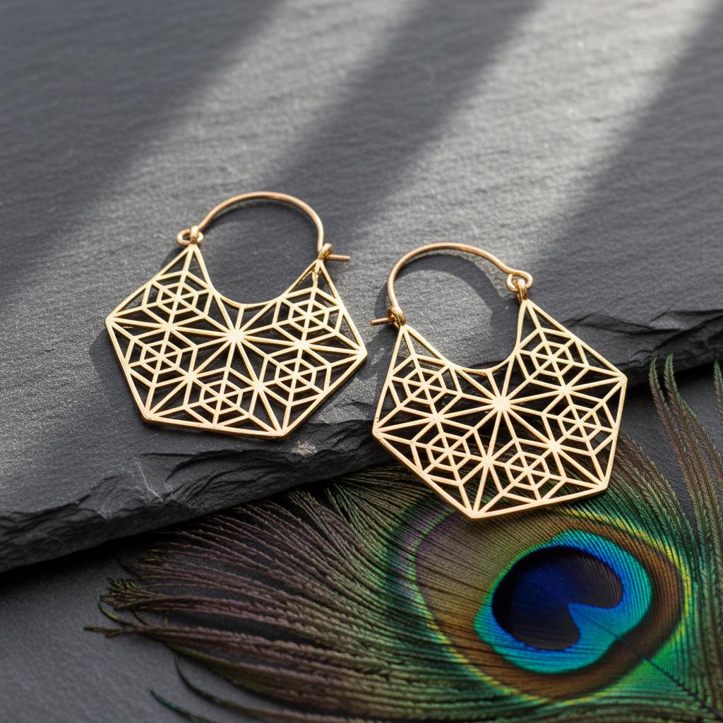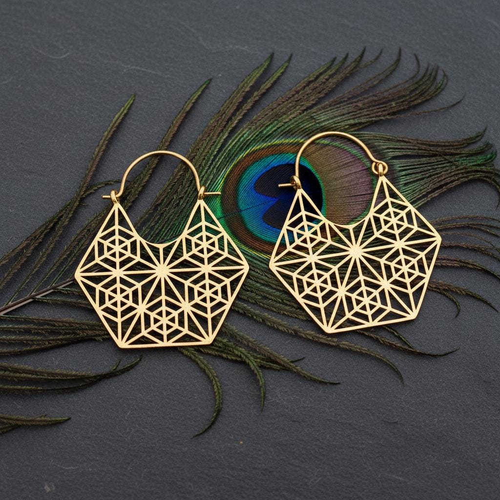These geometric hoop earrings are inspired by sacred geometry and boho ethnic design, blending symbolism with a bold yet refined aesthetic. Their intricate openwork pattern forms a harmonious geometric structure, creating a striking visual balance between lightness and statement style.