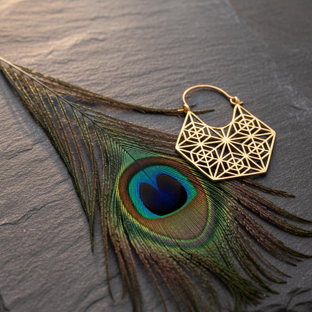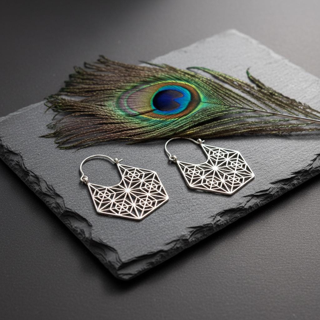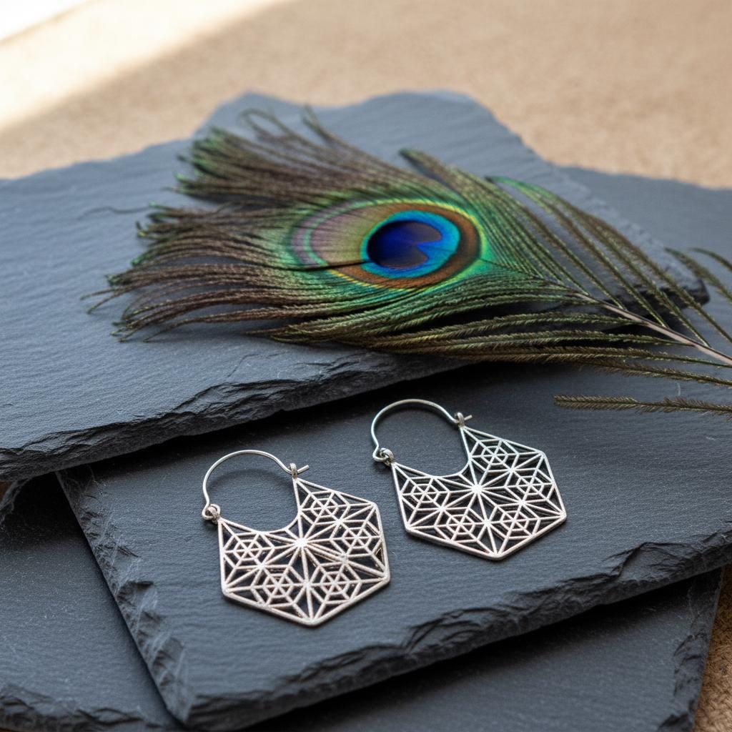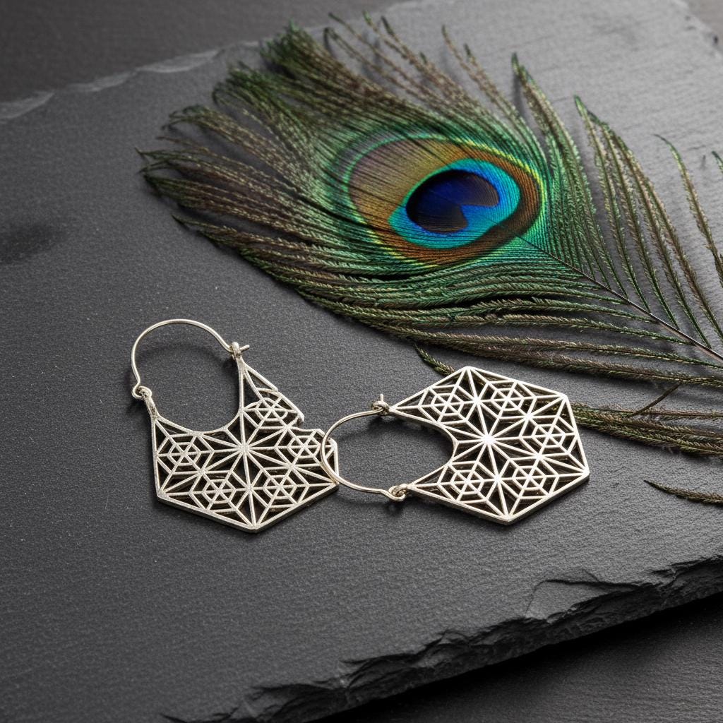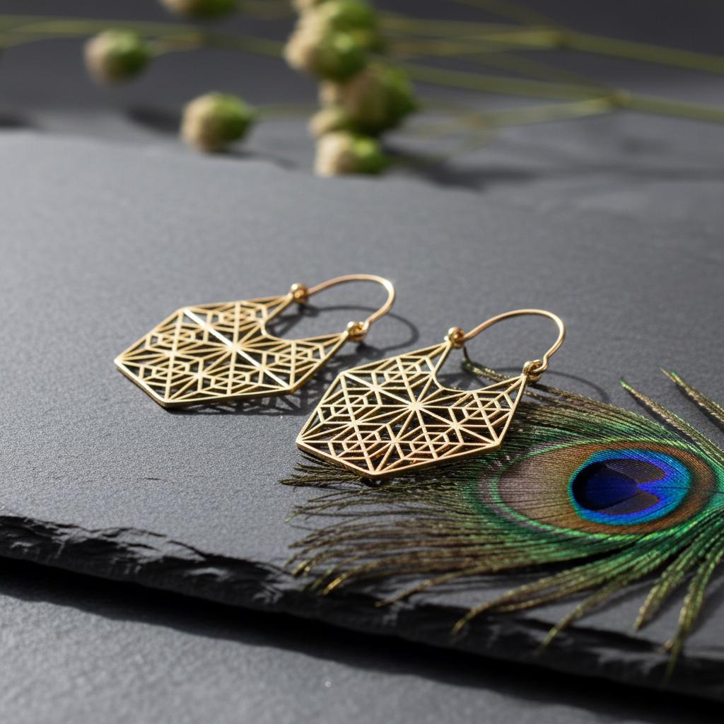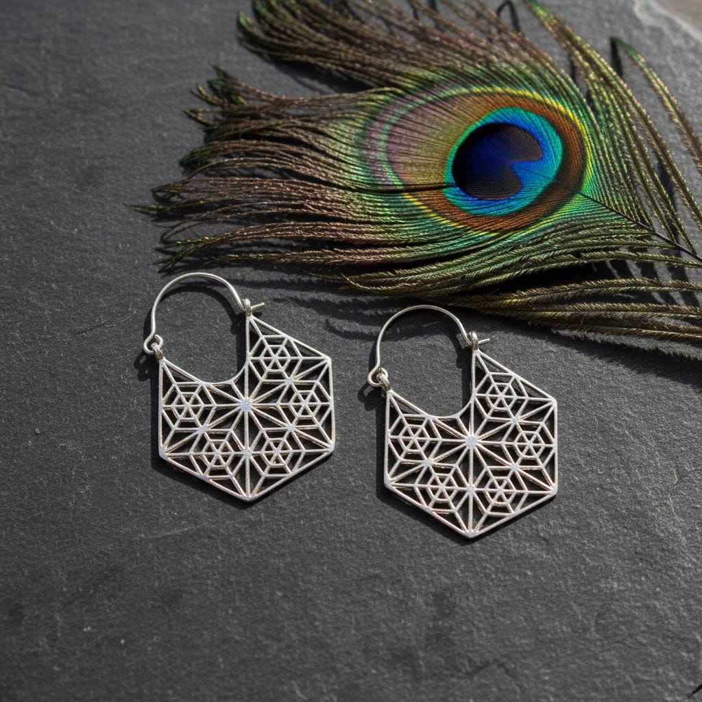 These geometric hoop earrings are inspired by sacred geometry and boho ethnic design, blending symbolism with a bold yet refined aesthetic. Their intricate openwork pattern forms a harmonious geometric structure, creating a striking visual balance between lightness and statement style.