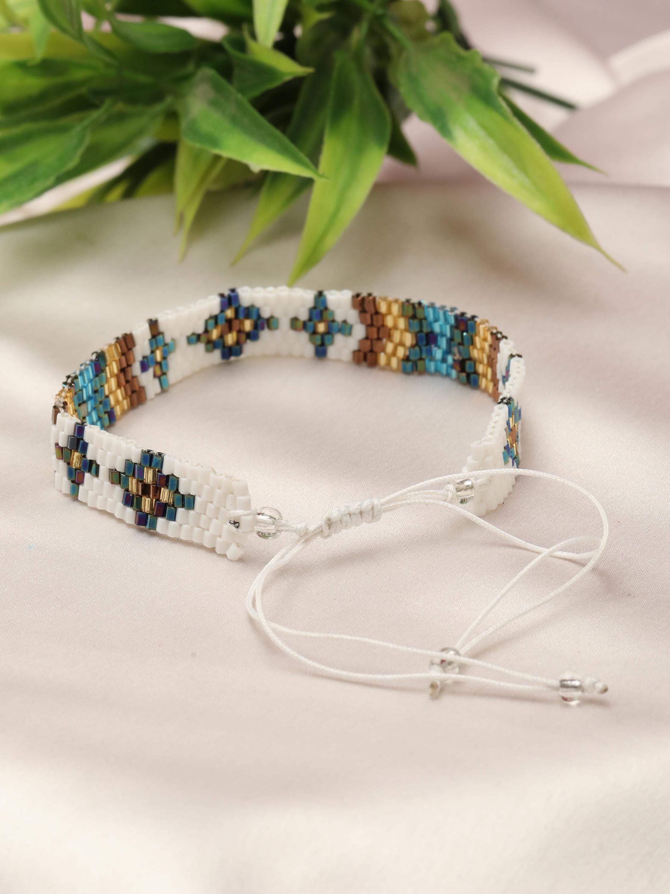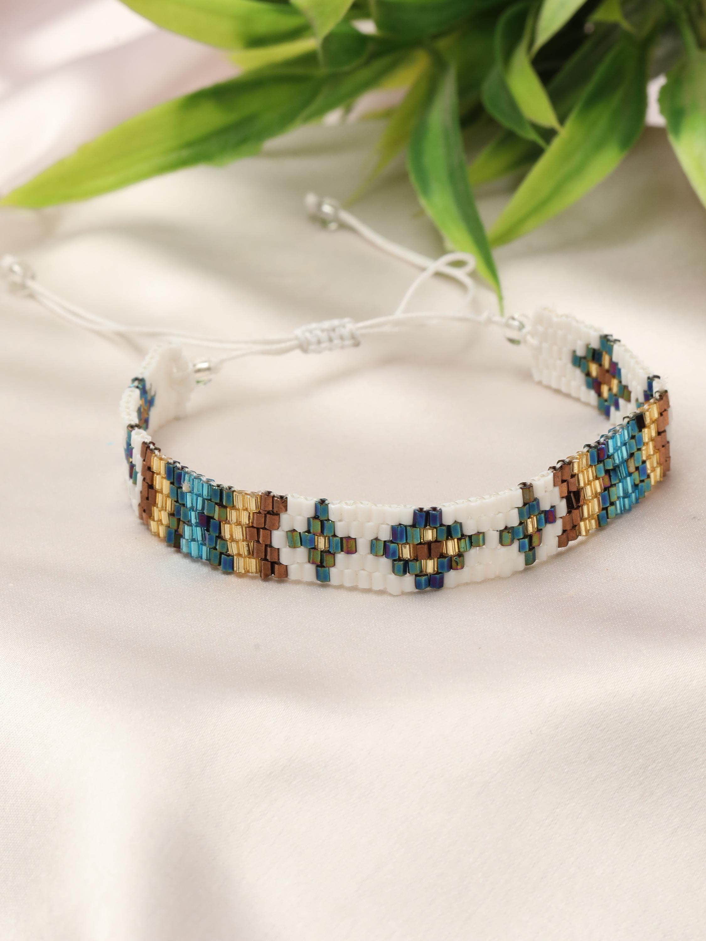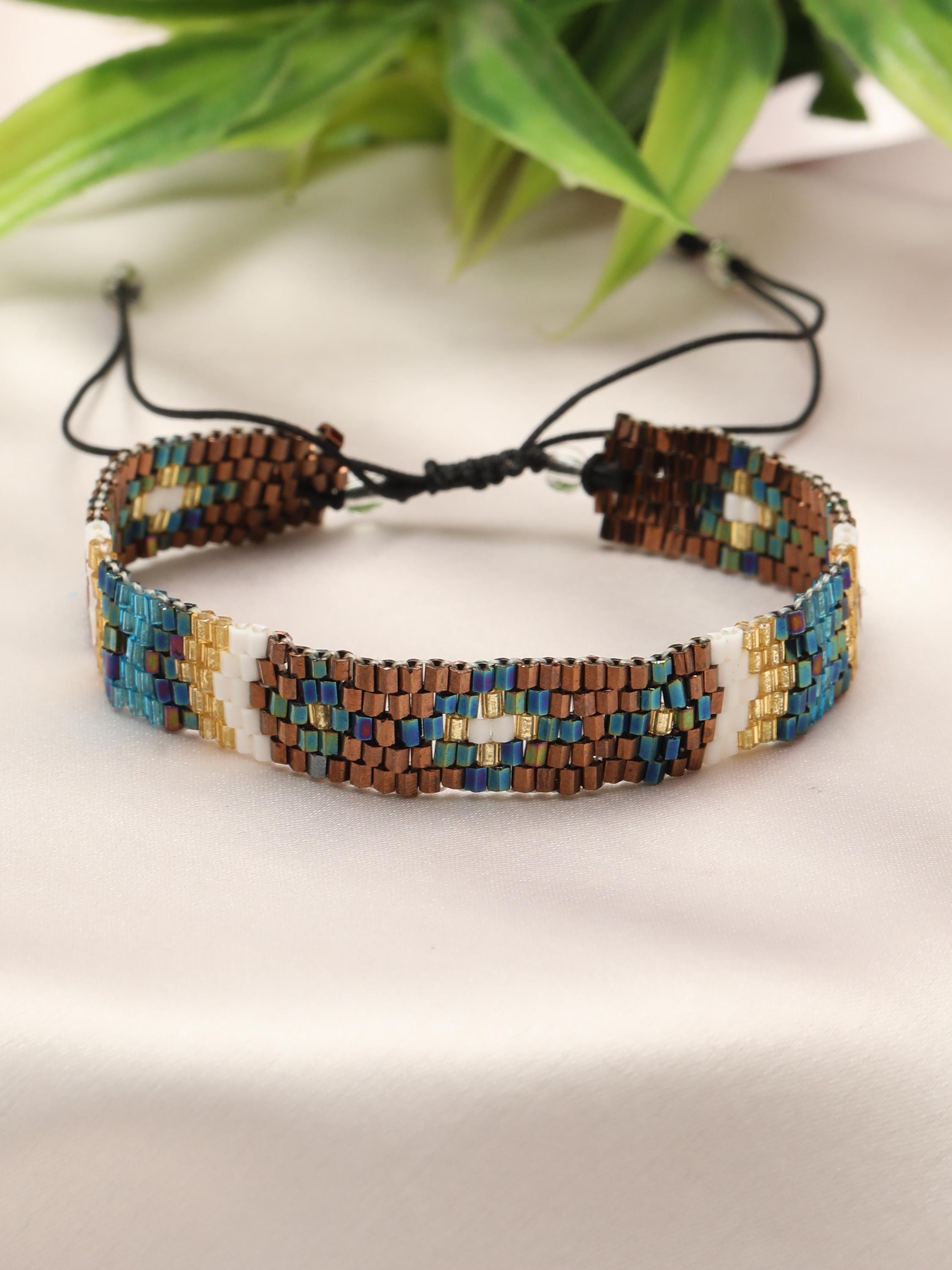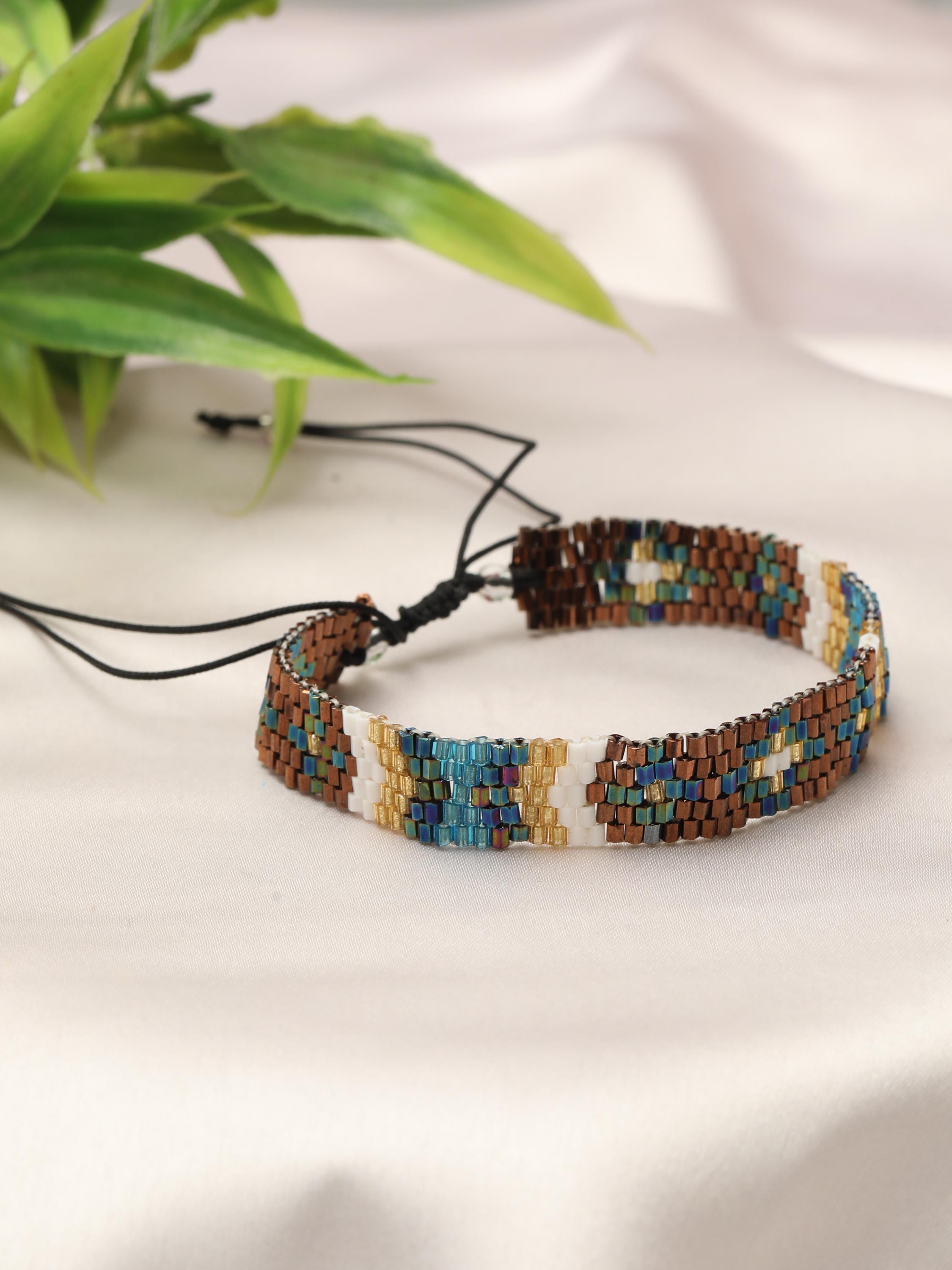 This adjustable woven bracelet is a refined statement piece designed for everyday comfort and timeless style. Carefully crafted with detailed beadwork, it blends boho, ethnic, and tribal influences into a versatile accessory.
