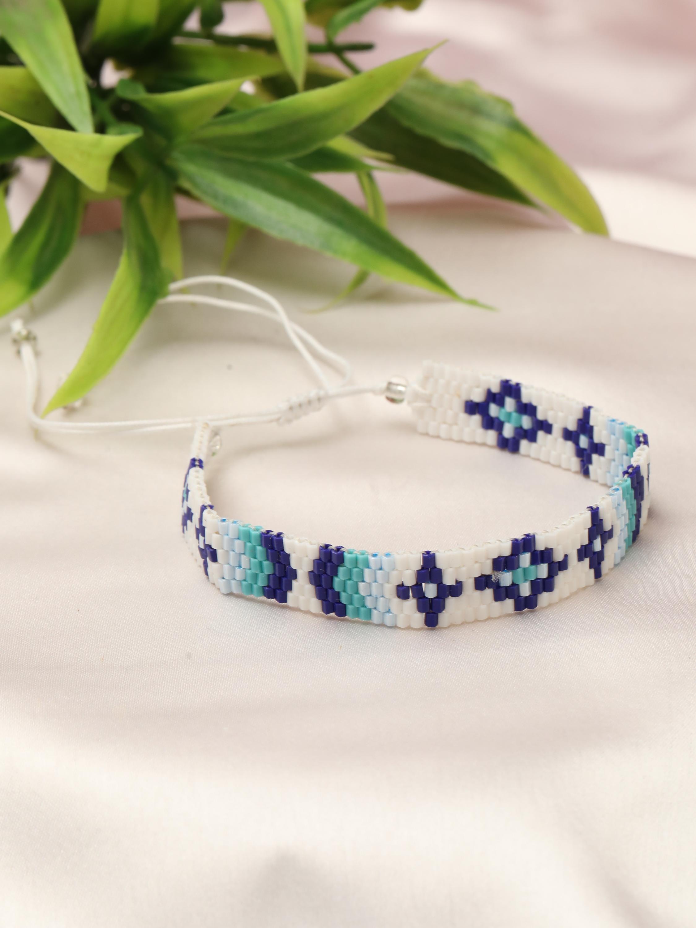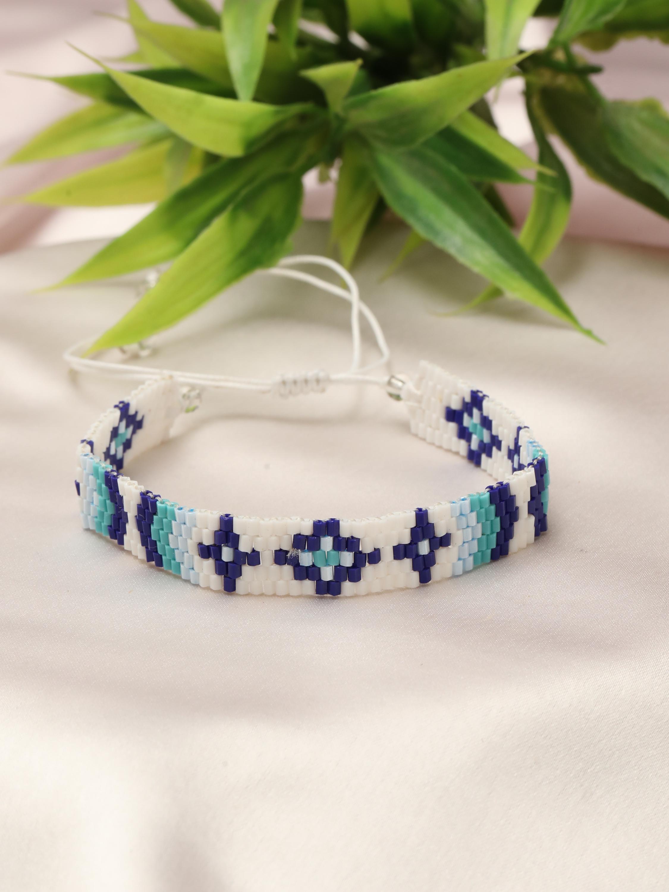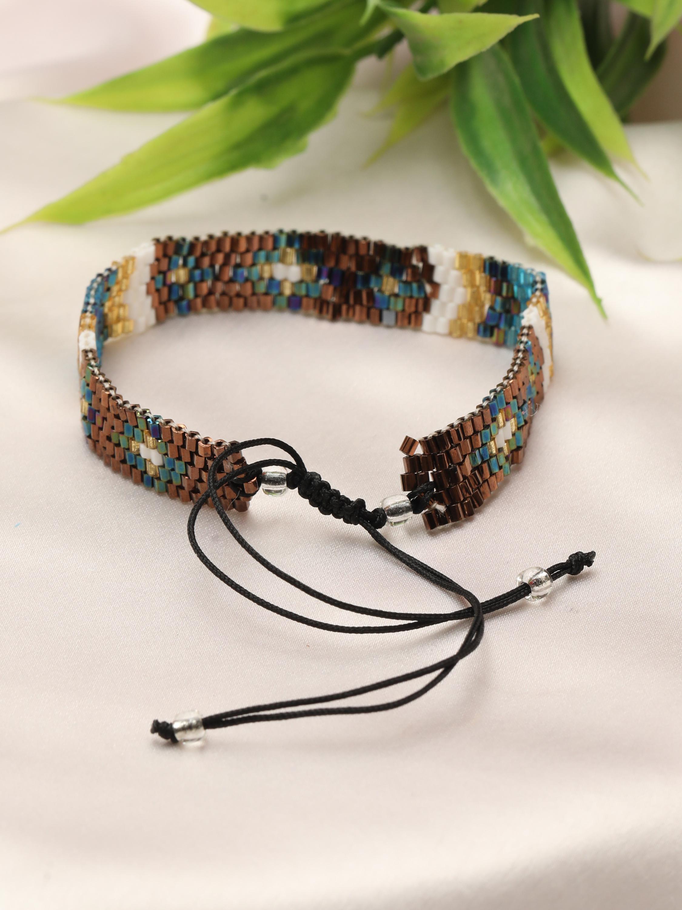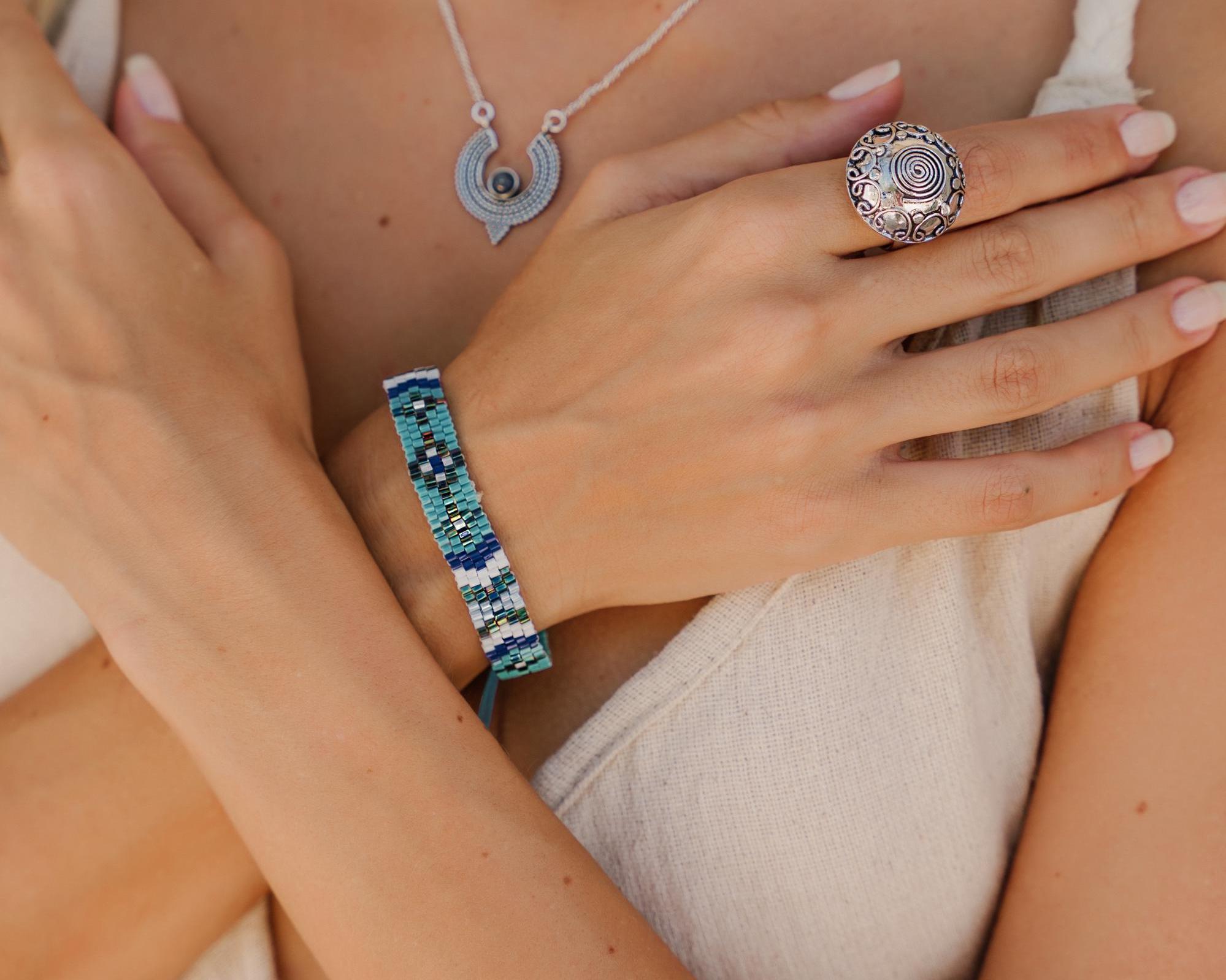 This adjustable woven bracelet is a refined statement piece designed for everyday comfort and timeless style. Carefully crafted with detailed beadwork, it blends boho, ethnic, and tribal influences into a versatile accessory.