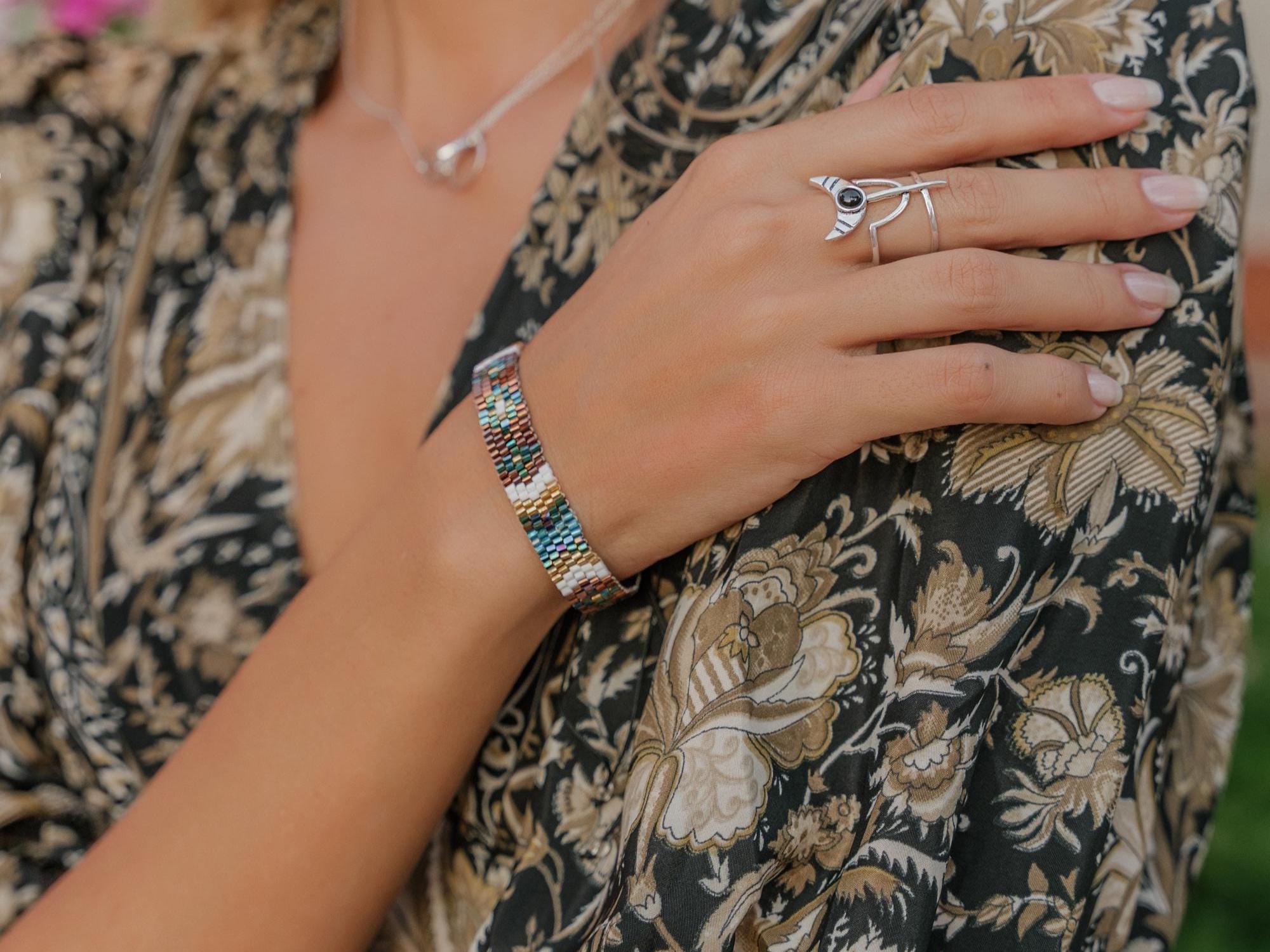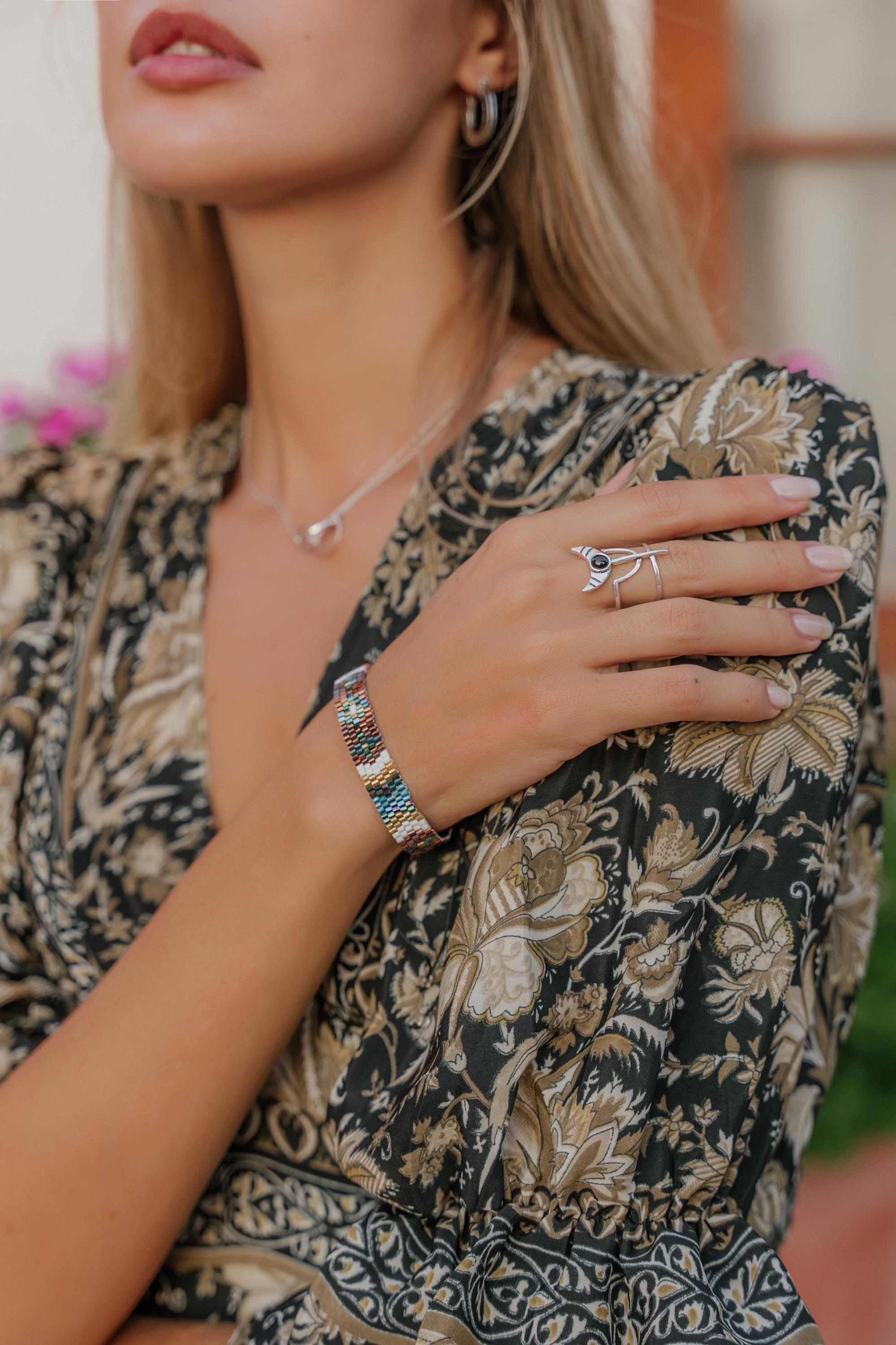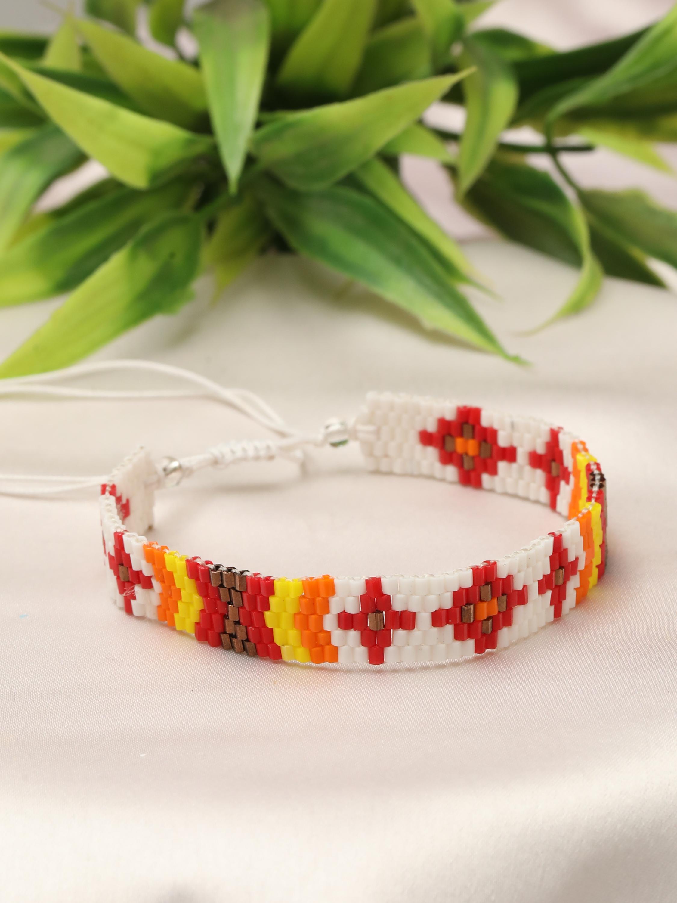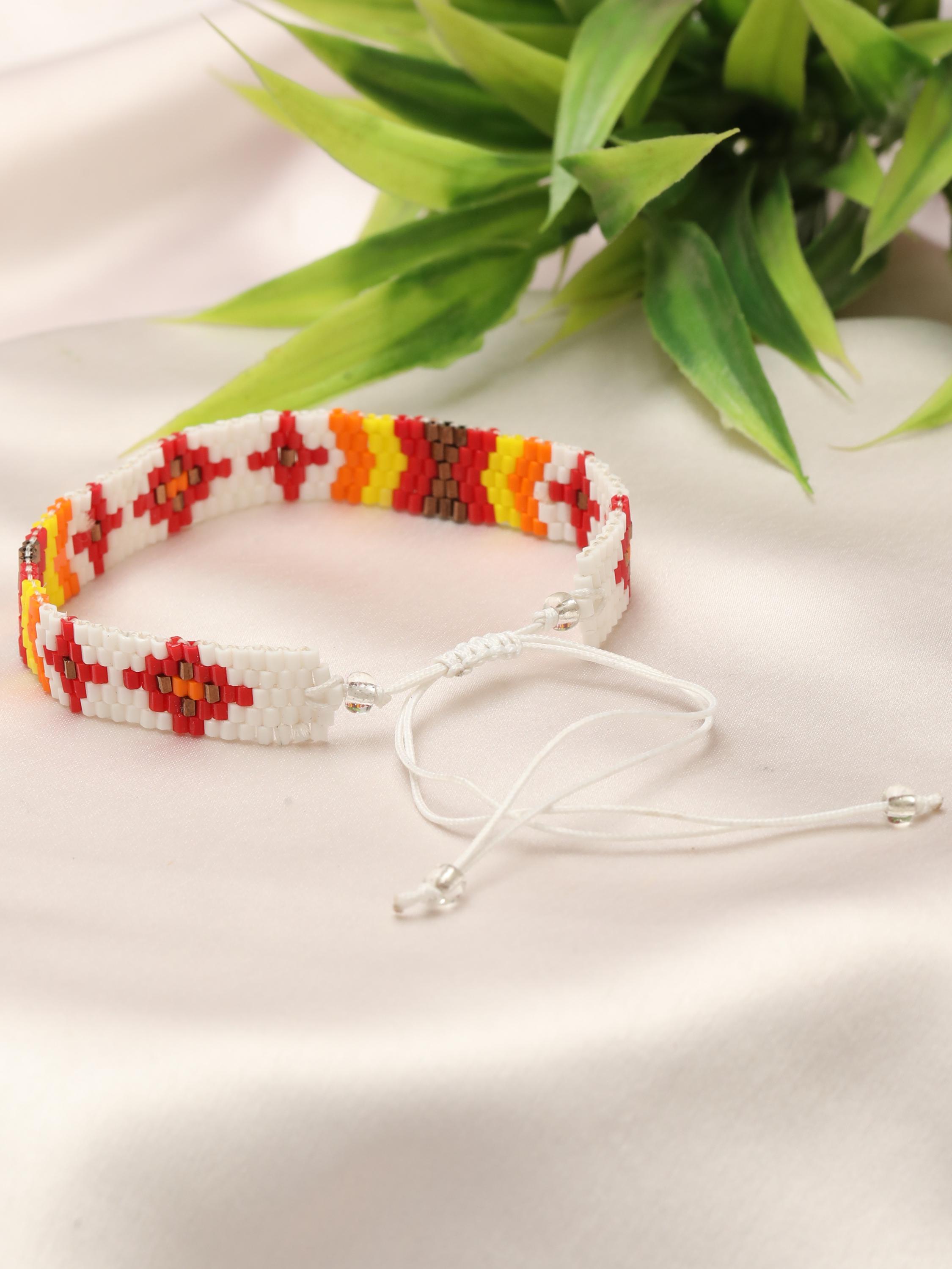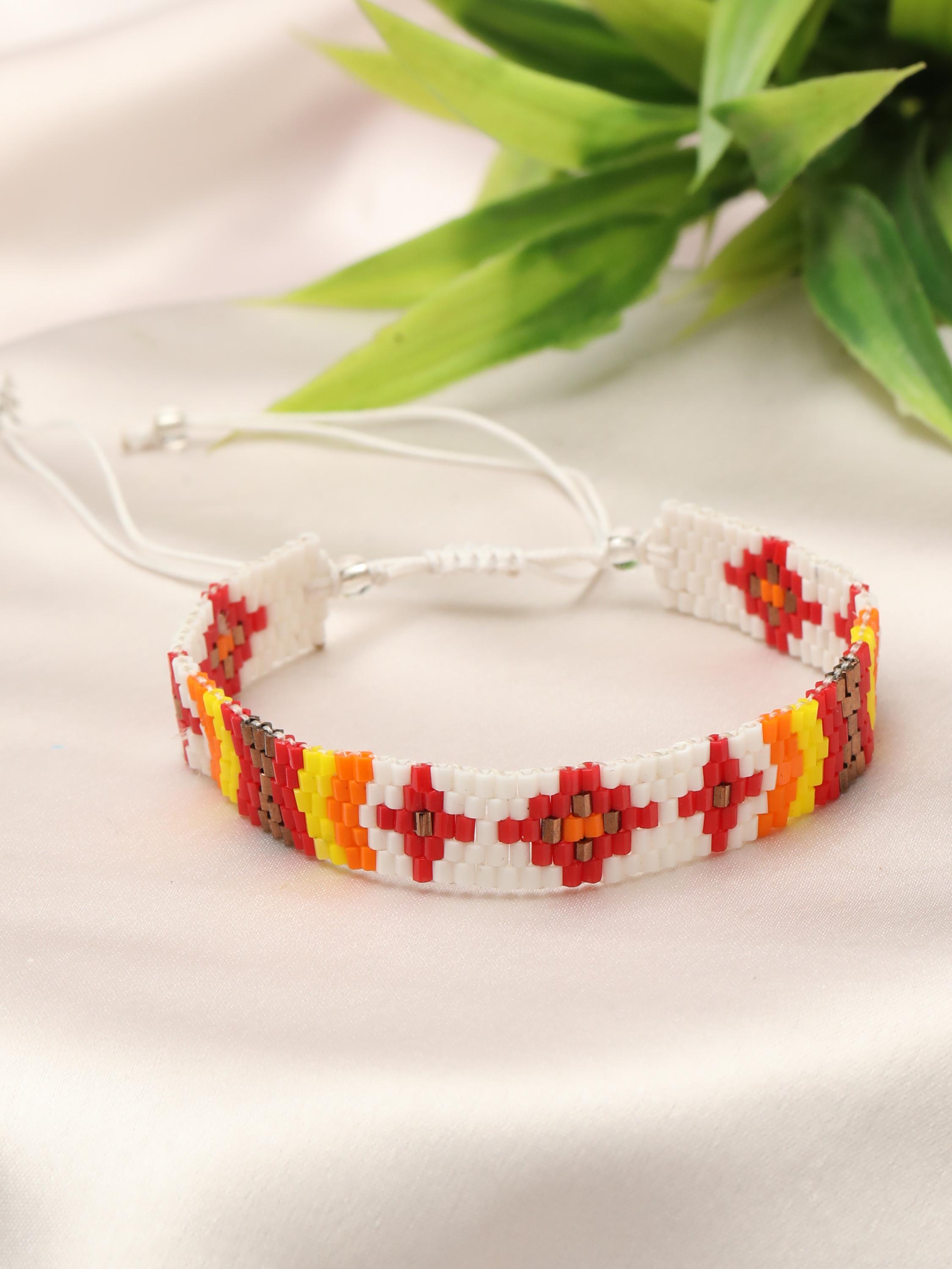 This adjustable woven bracelet is a refined statement piece designed for everyday comfort and timeless style. Carefully crafted with detailed beadwork, it blends boho, ethnic, and tribal influences into a versatile accessory.