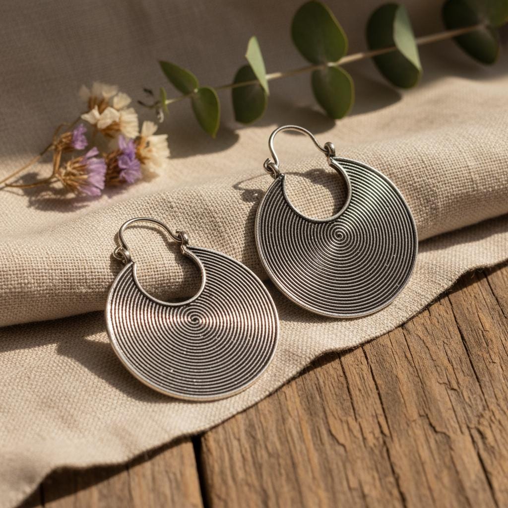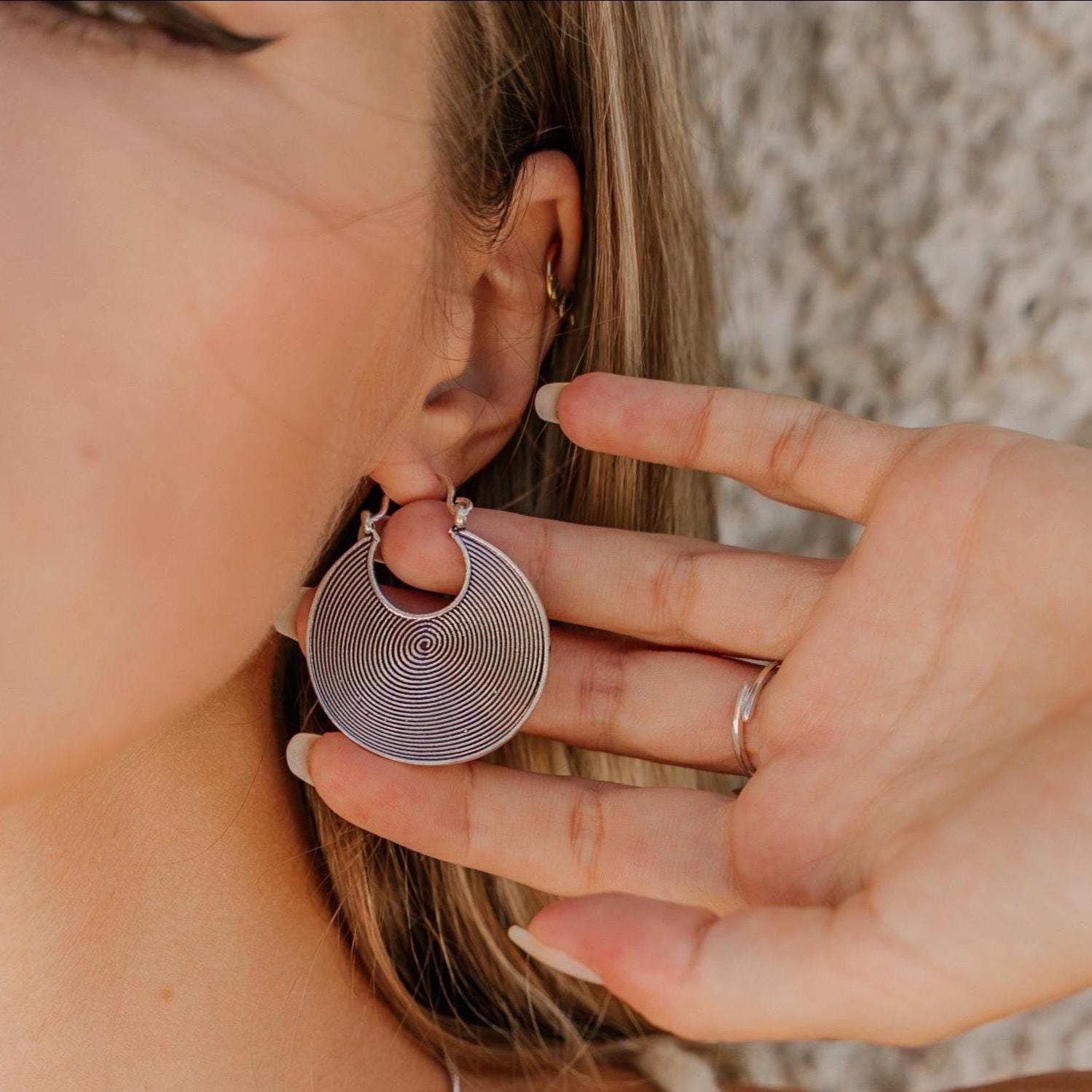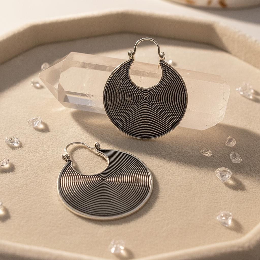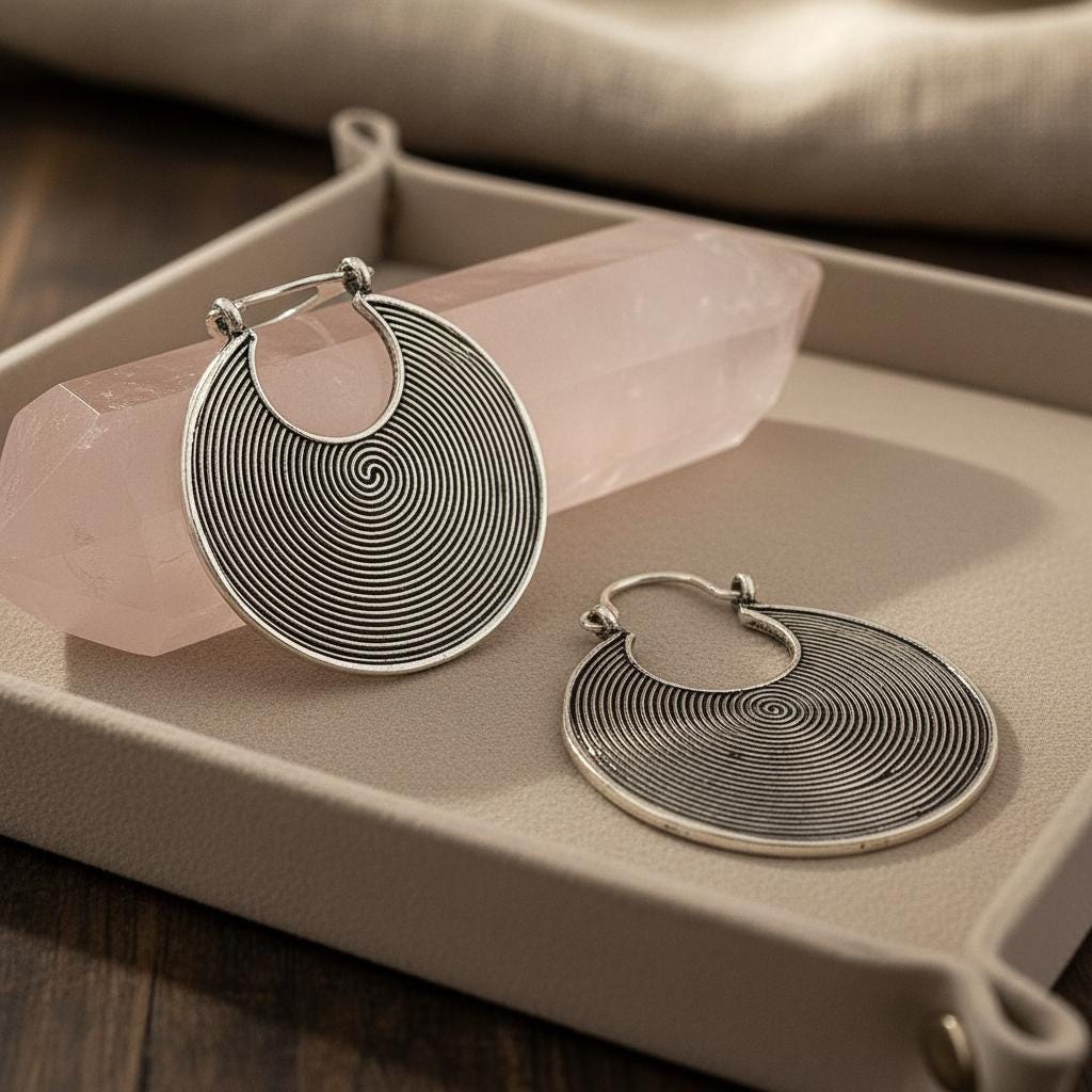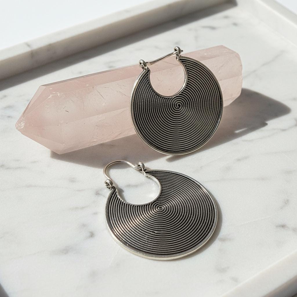 These tribal spiral hoop earrings feature a mesmerizing concentric spiral pattern, a timeless symbol of energy, protection, and spiritual movement across many ancient cultures.