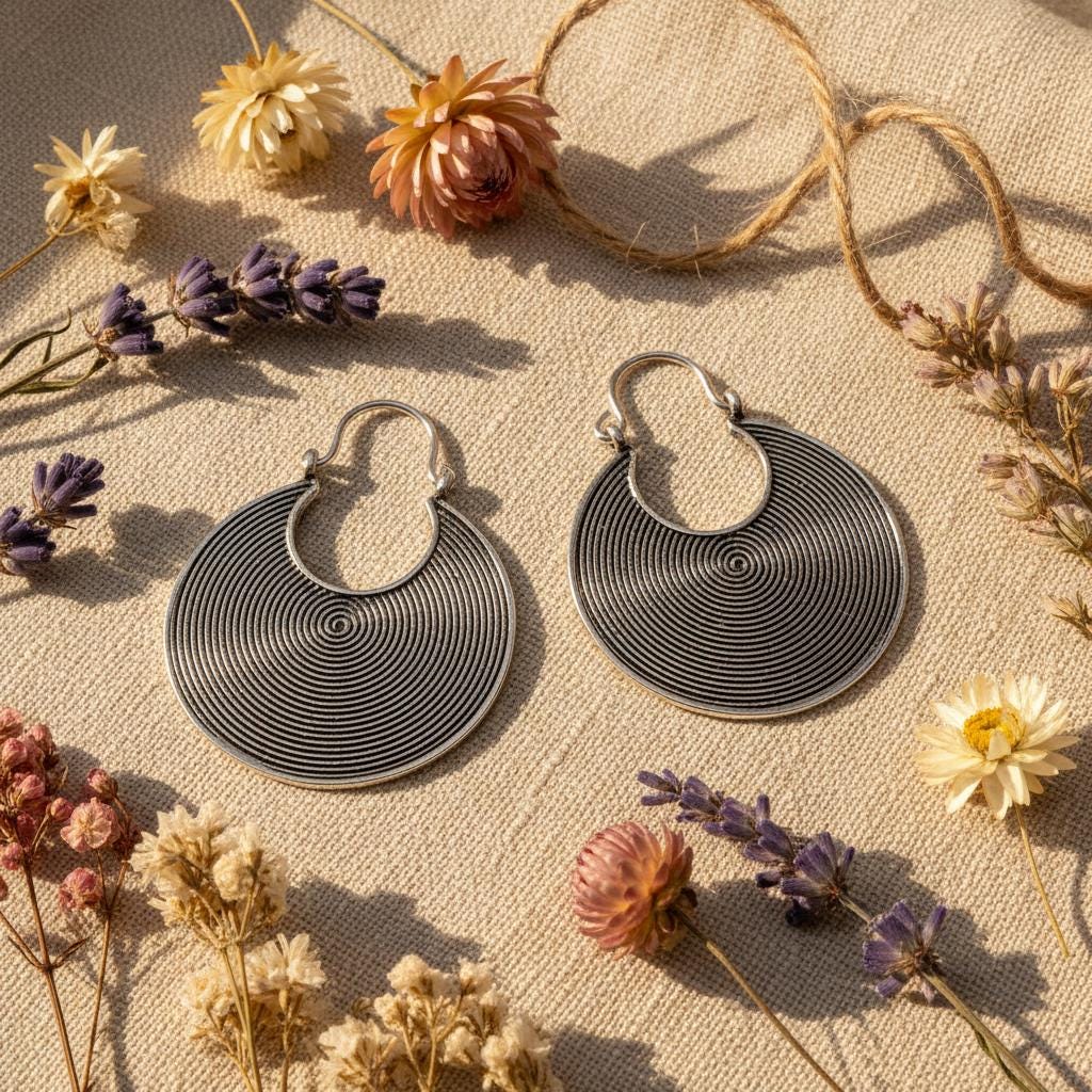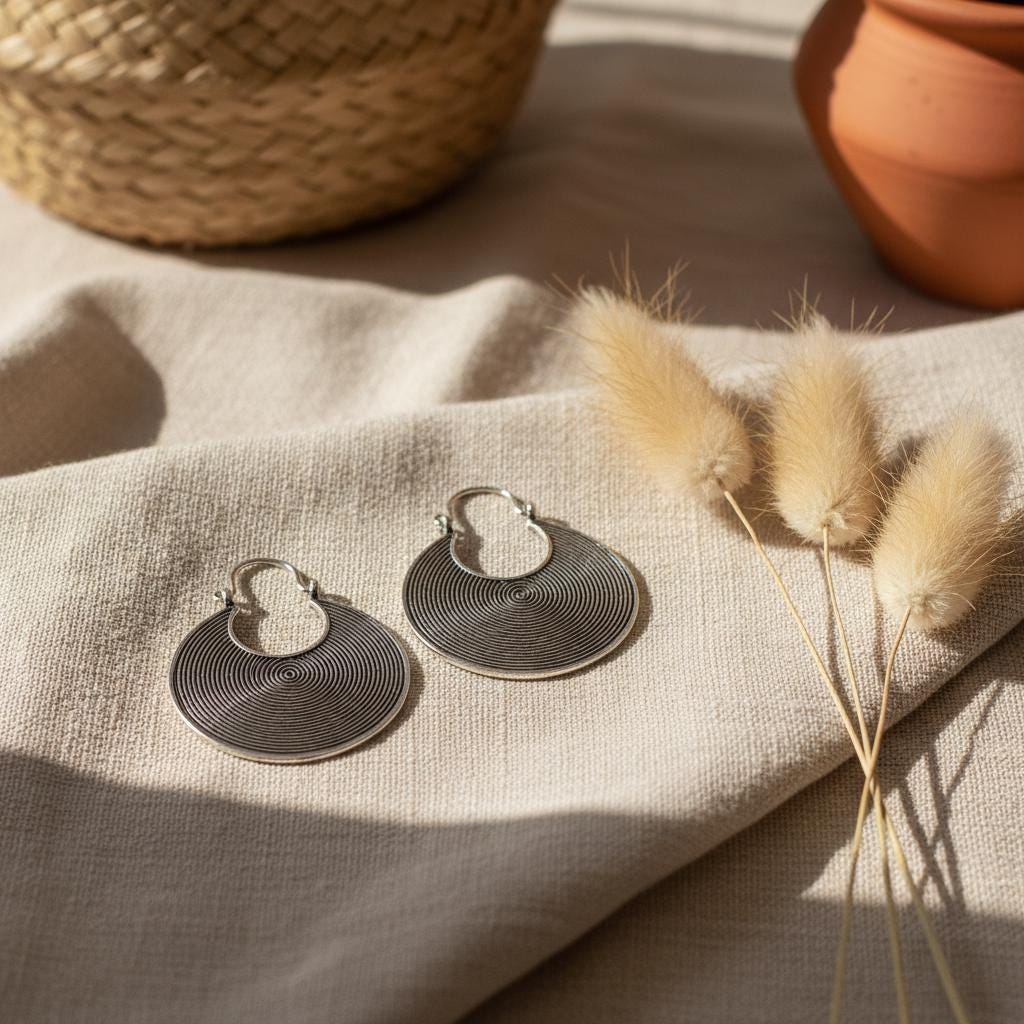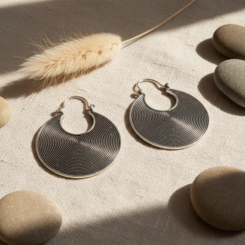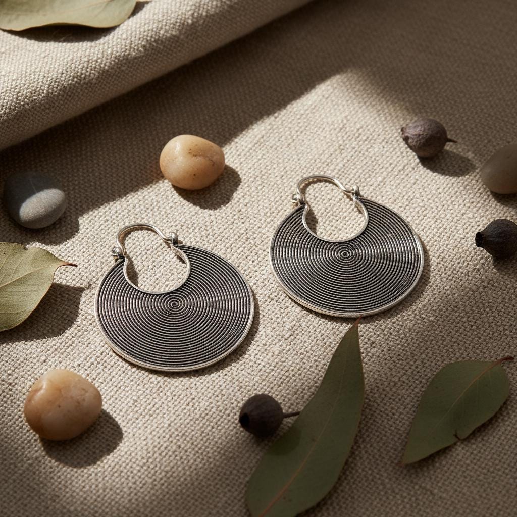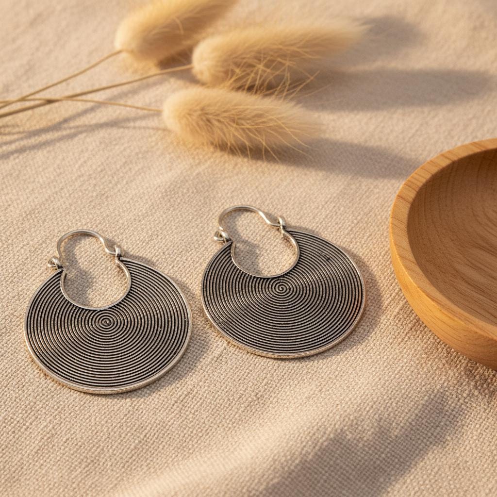 These tribal spiral hoop earrings feature a mesmerizing concentric spiral pattern, a timeless symbol of energy, protection, and spiritual movement across many ancient cultures.