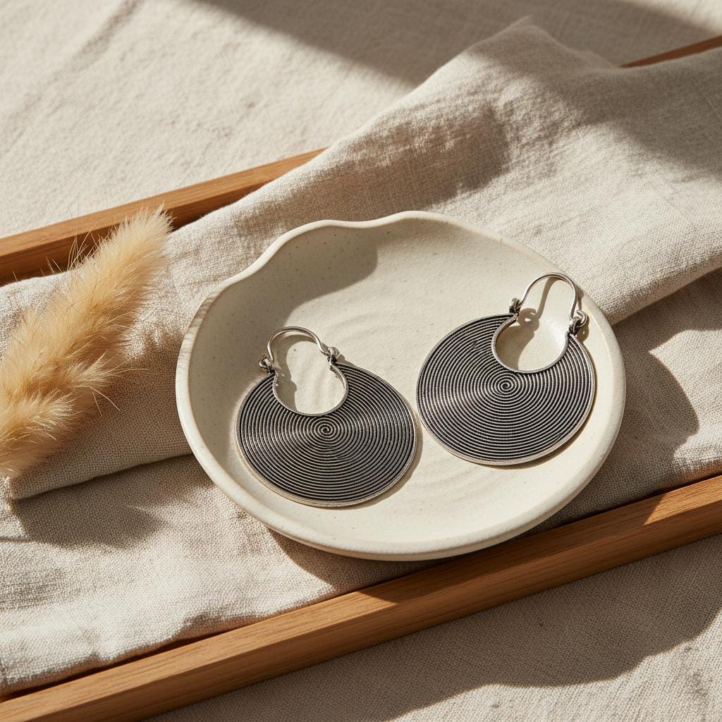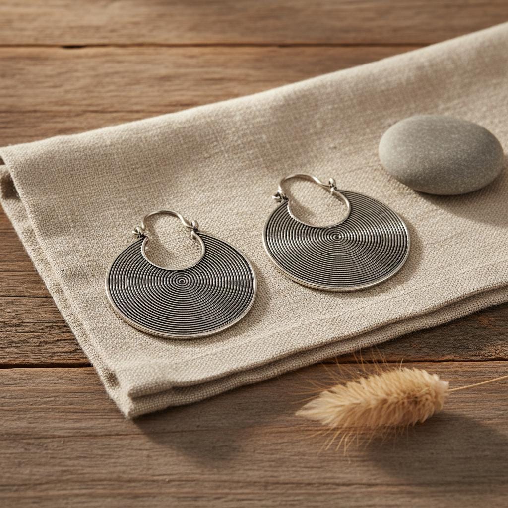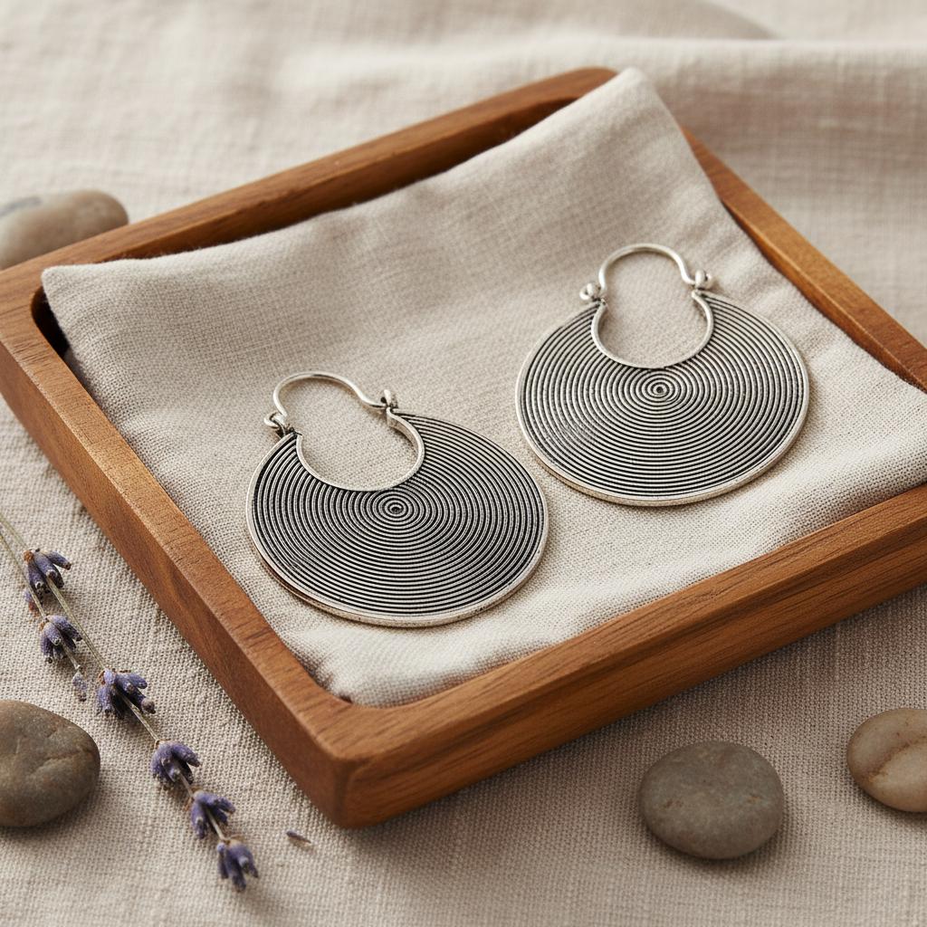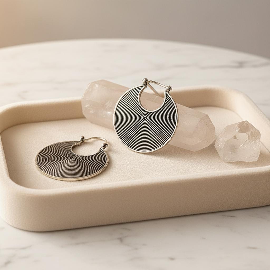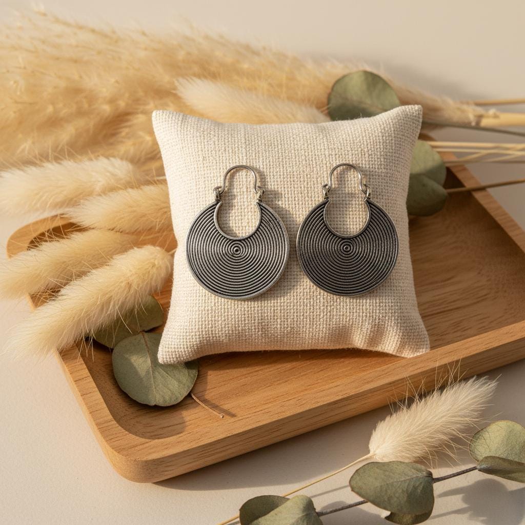 These tribal spiral hoop earrings feature a mesmerizing concentric spiral pattern, a timeless symbol of energy, protection, and spiritual movement across many ancient cultures.