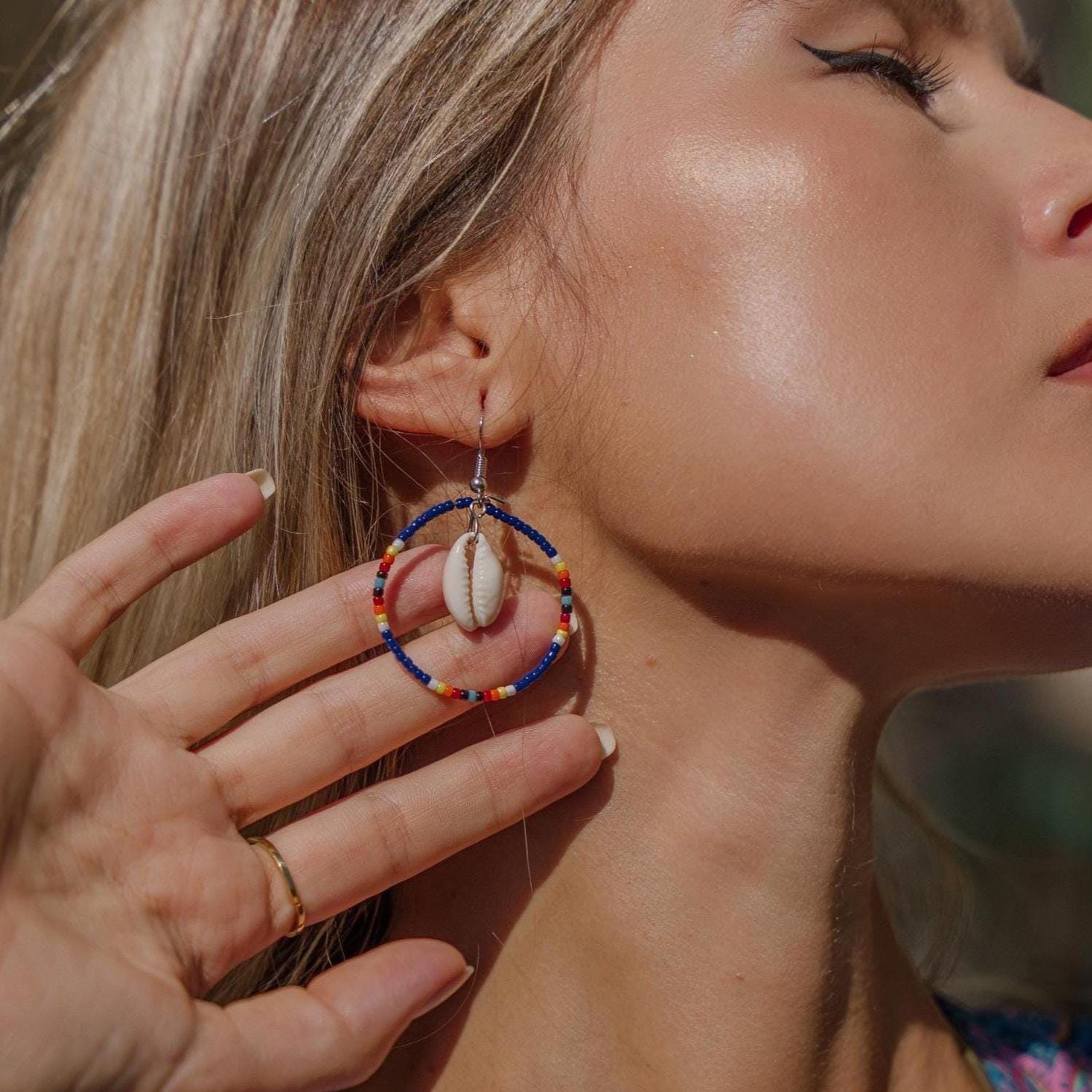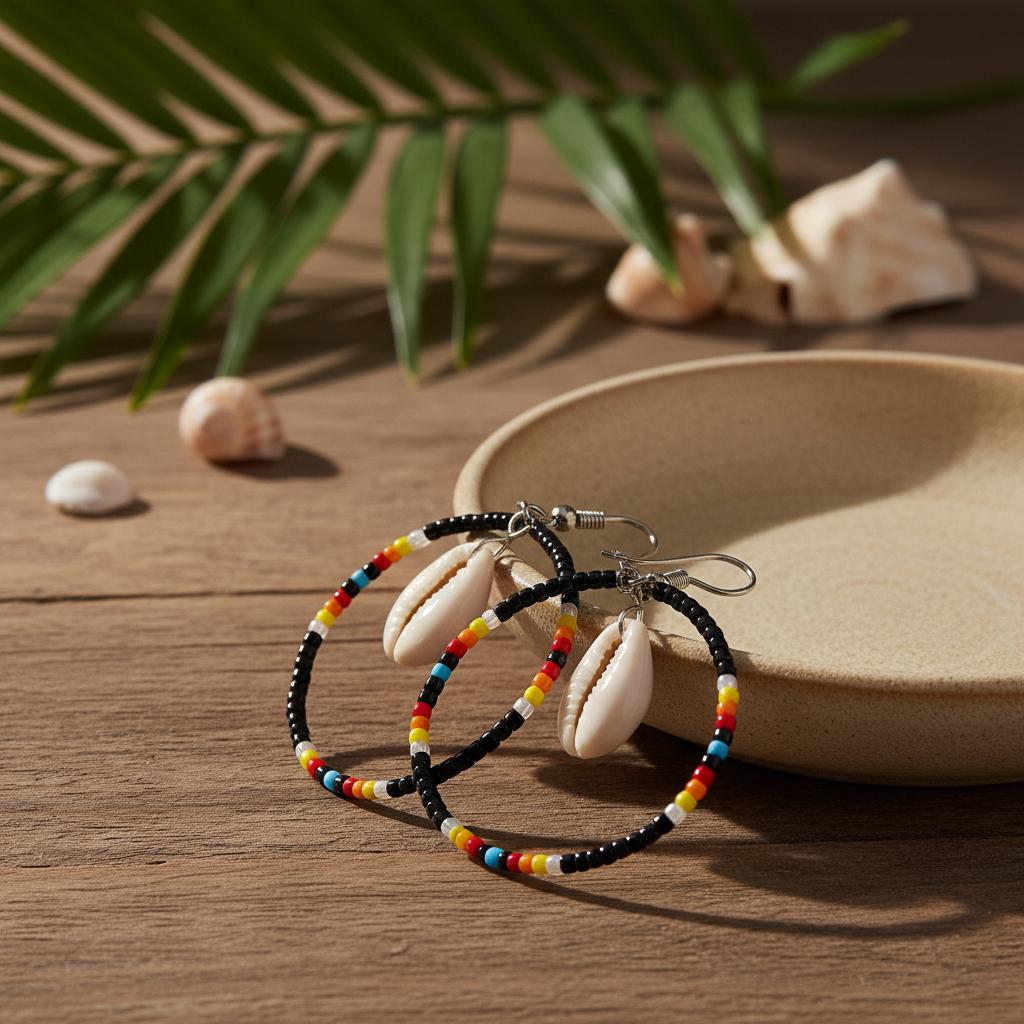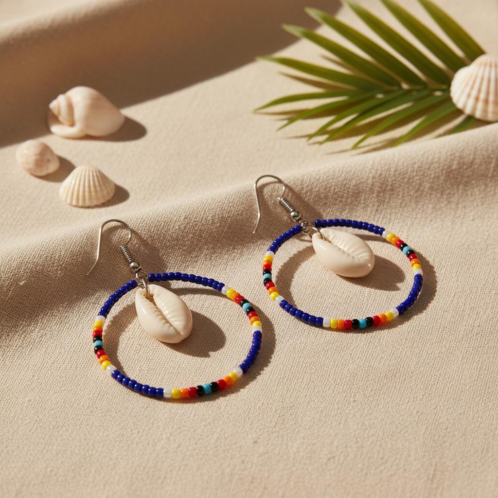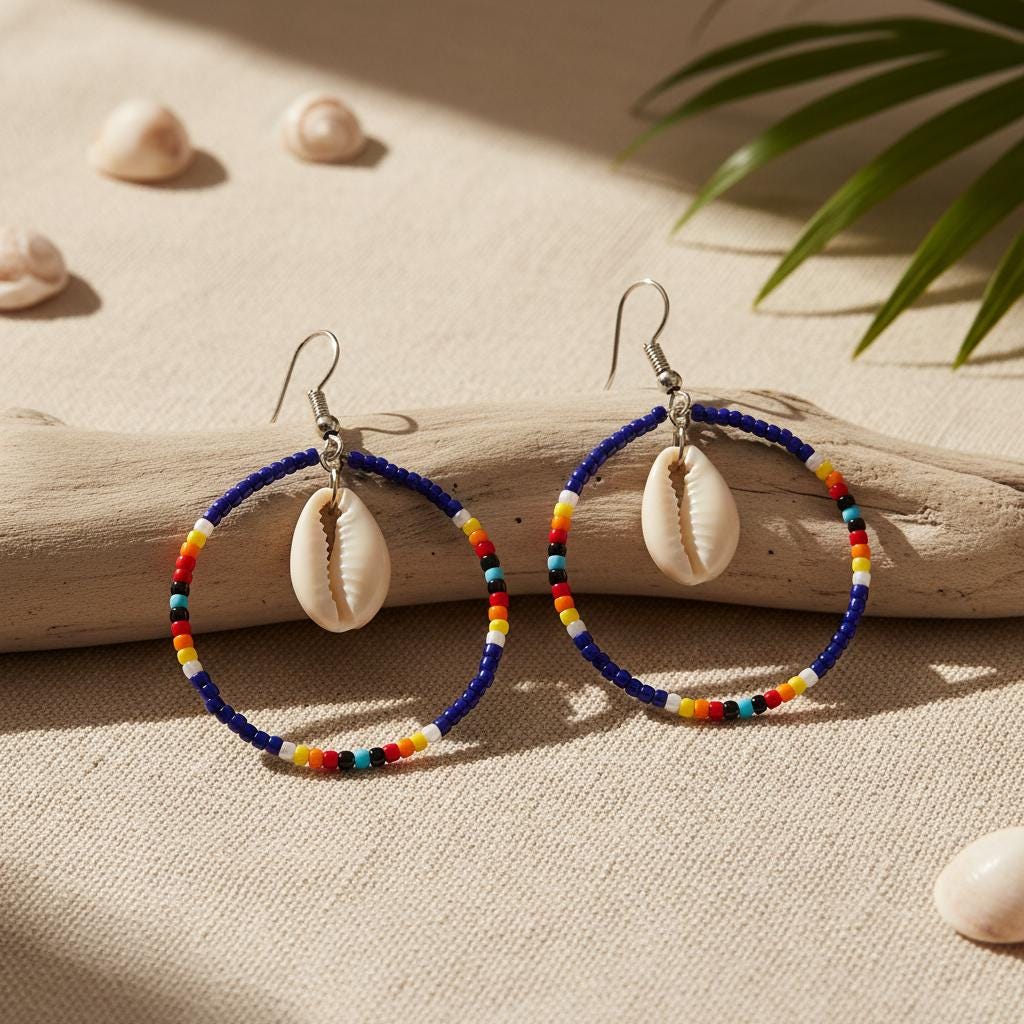 Add a touch of vibrant, free-spirited style to your accessory collection with these stunning Boho beaded dangling earrings. Handcrafted with a mix of colorful beads in shades, these earrings are designed to make a statement. At the heart of each earring is a beautiful cowrie shell, symbolizing protection and prosperity, hanging delicately at the center. Cowrie shell has long been worn as a talisman of abundance, femininity, and energy. These earrings combine ethnic symbolism with bold bohemian style.
