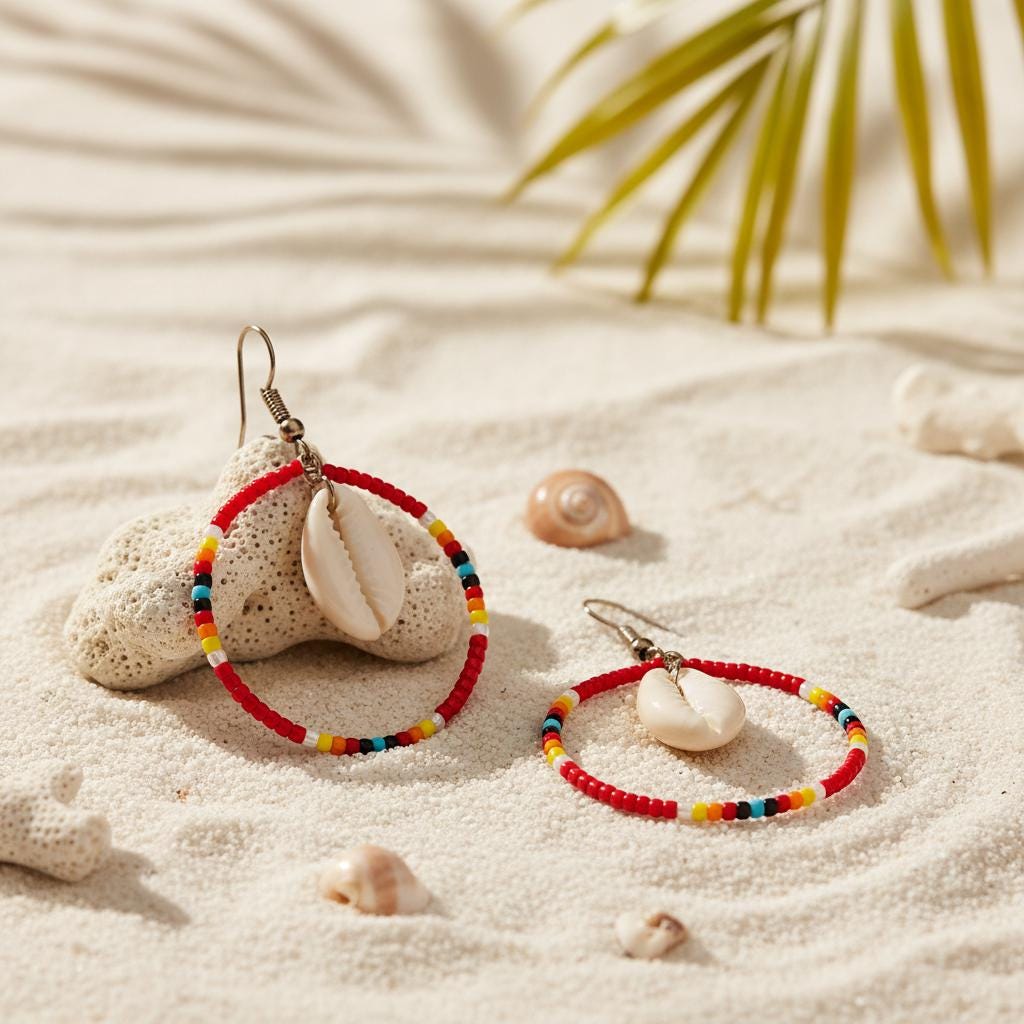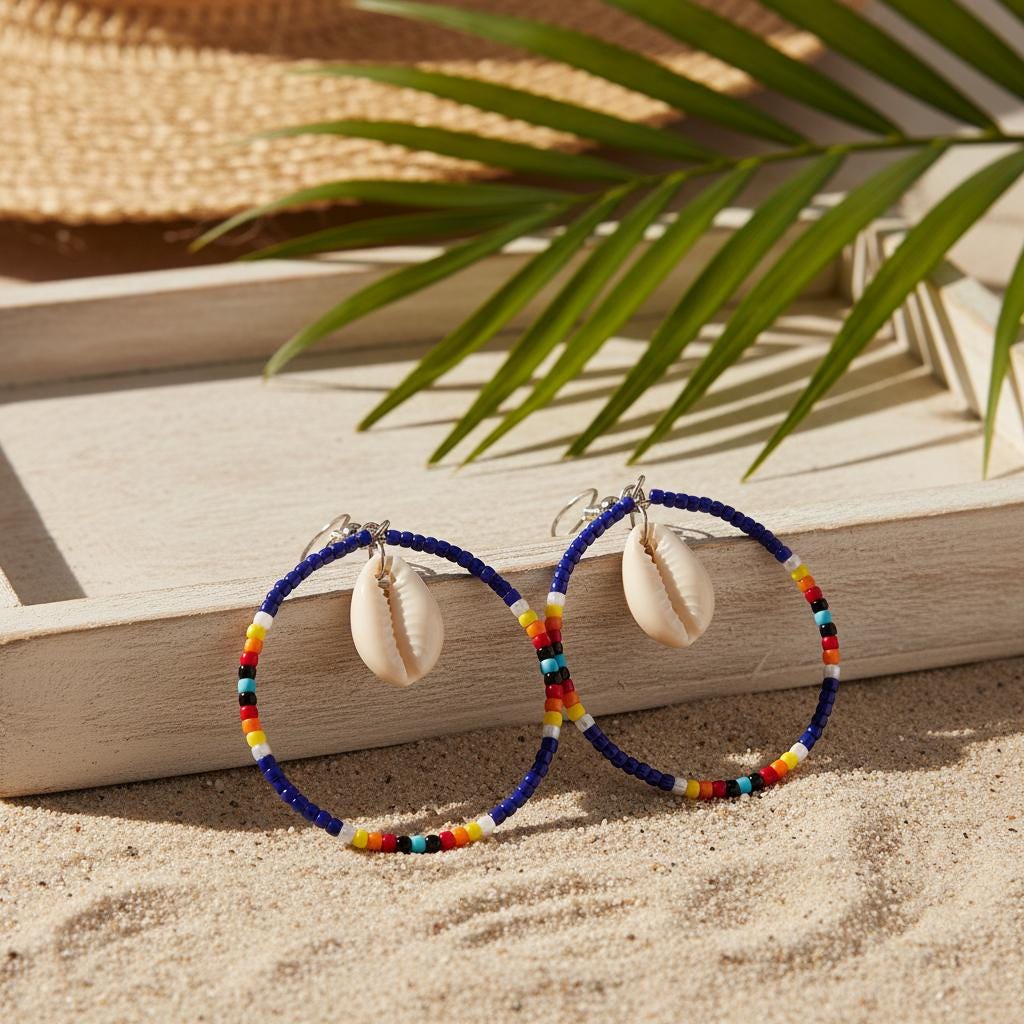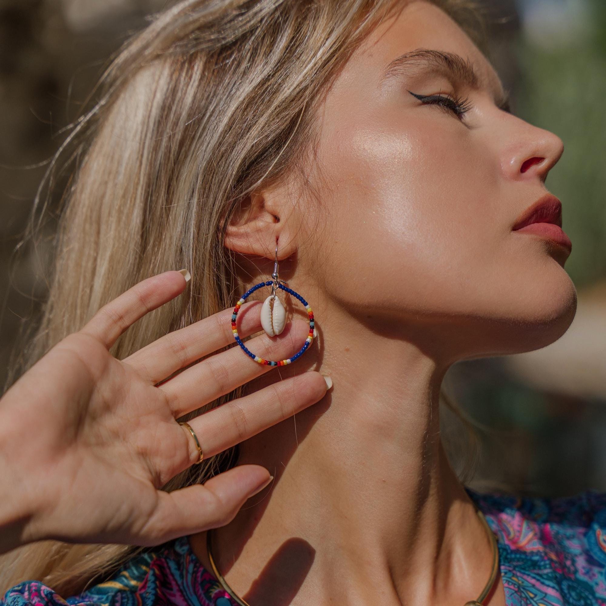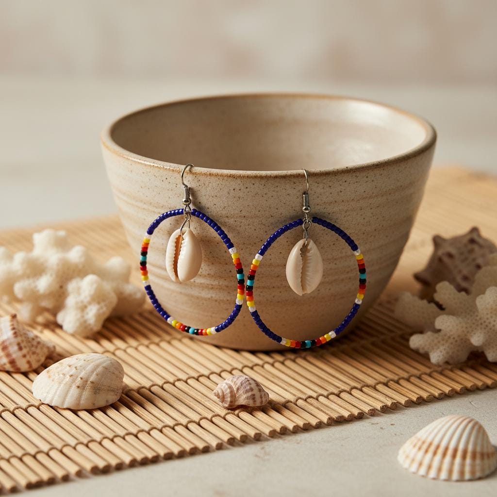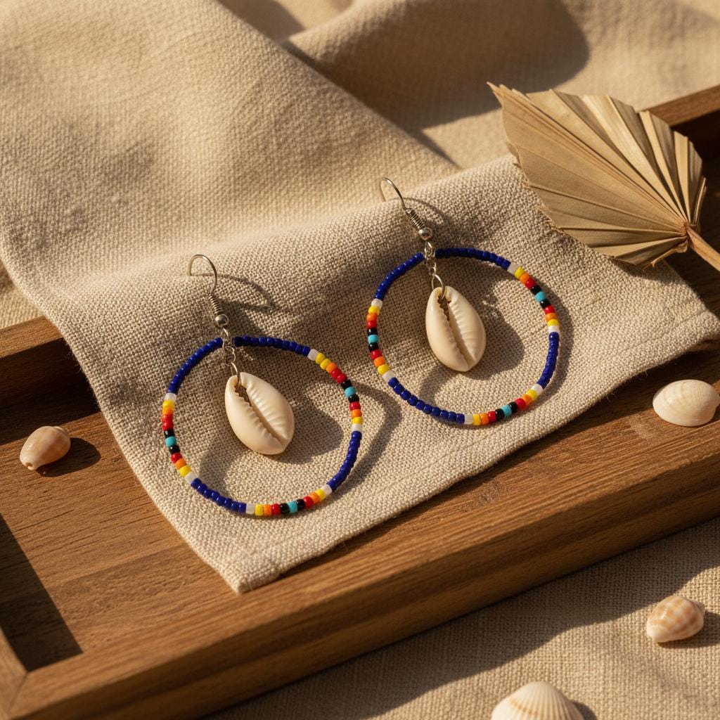 Add a touch of vibrant, free-spirited style to your accessory collection with these stunning Boho beaded dangling earrings. Handcrafted with a mix of colorful beads in shades, these earrings are designed to make a statement. At the heart of each earring is a beautiful cowrie shell, symbolizing protection and prosperity, hanging delicately at the center. Cowrie shell has long been worn as a talisman of abundance, femininity, and energy. These earrings combine ethnic symbolism with bold bohemian style.