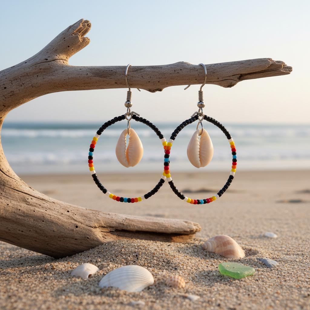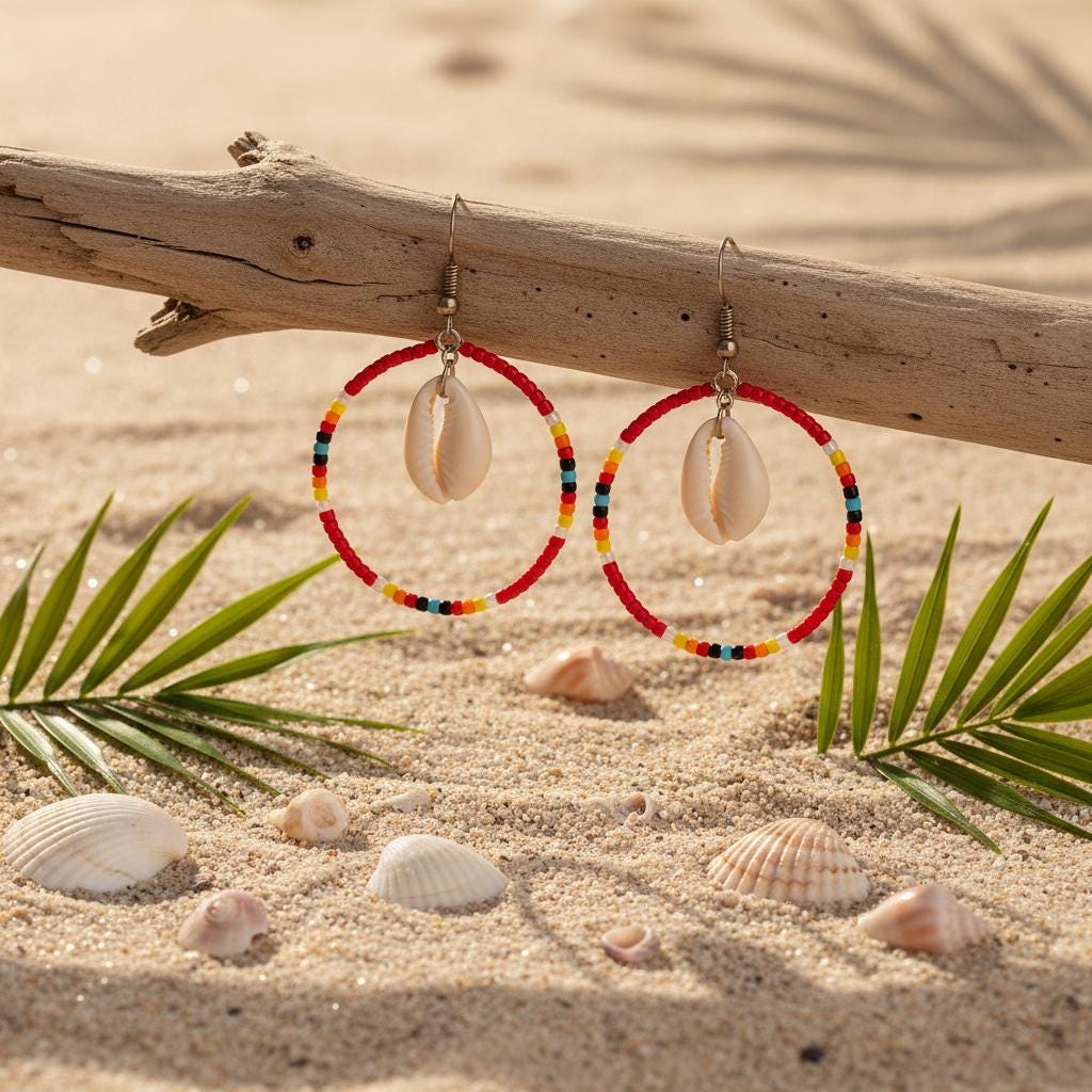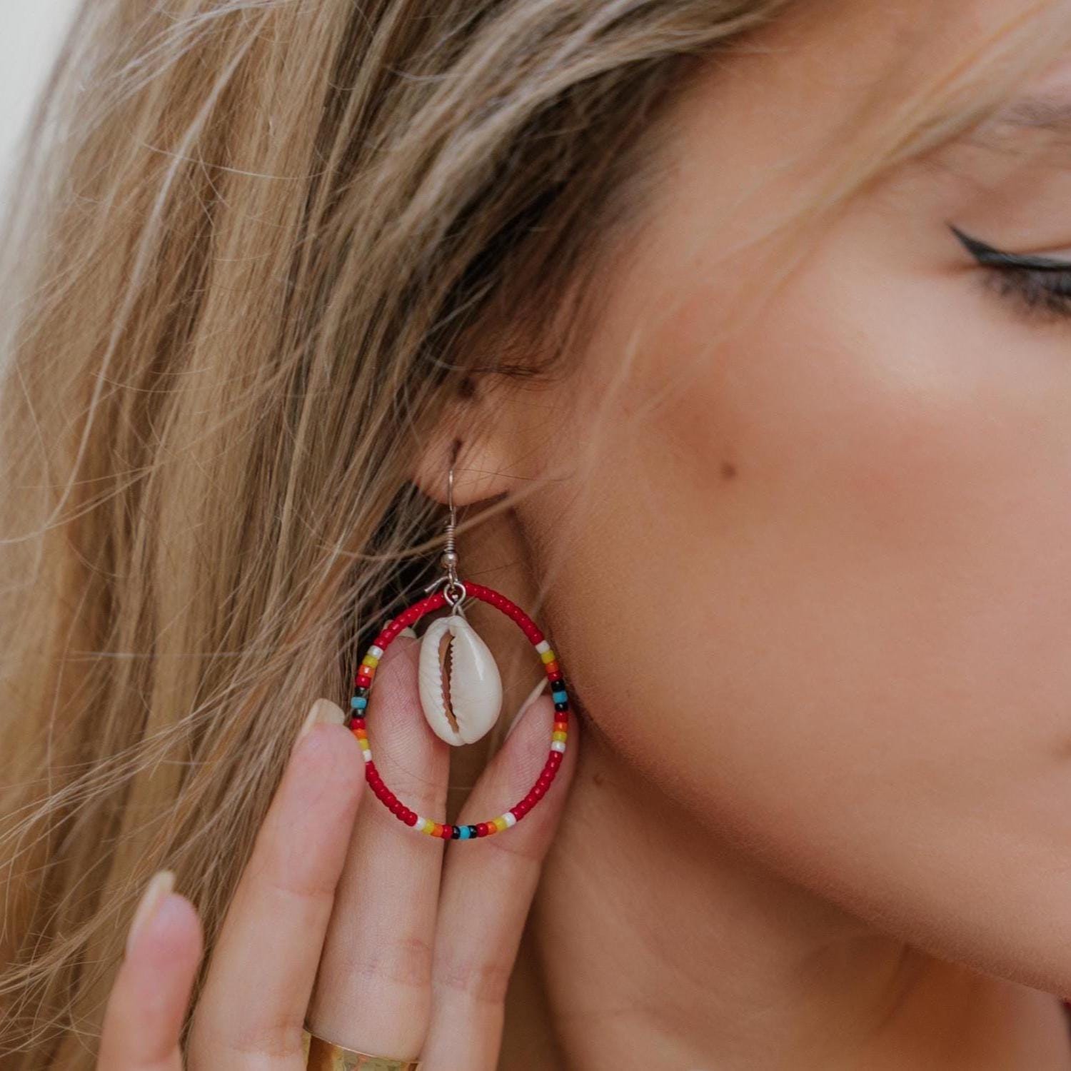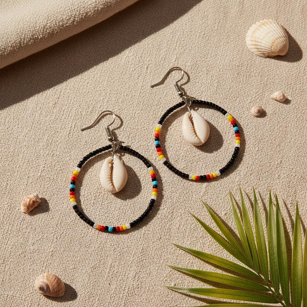 Add a touch of vibrant, free-spirited style to your accessory collection with these stunning Boho beaded dangling earrings. Handcrafted with a mix of colorful beads in shades, these earrings are designed to make a statement. At the heart of each earring is a beautiful cowrie shell, symbolizing protection and prosperity, hanging delicately at the center. Cowrie shell has long been worn as a talisman of abundance, femininity, and energy. These earrings combine ethnic symbolism with bold bohemian style.