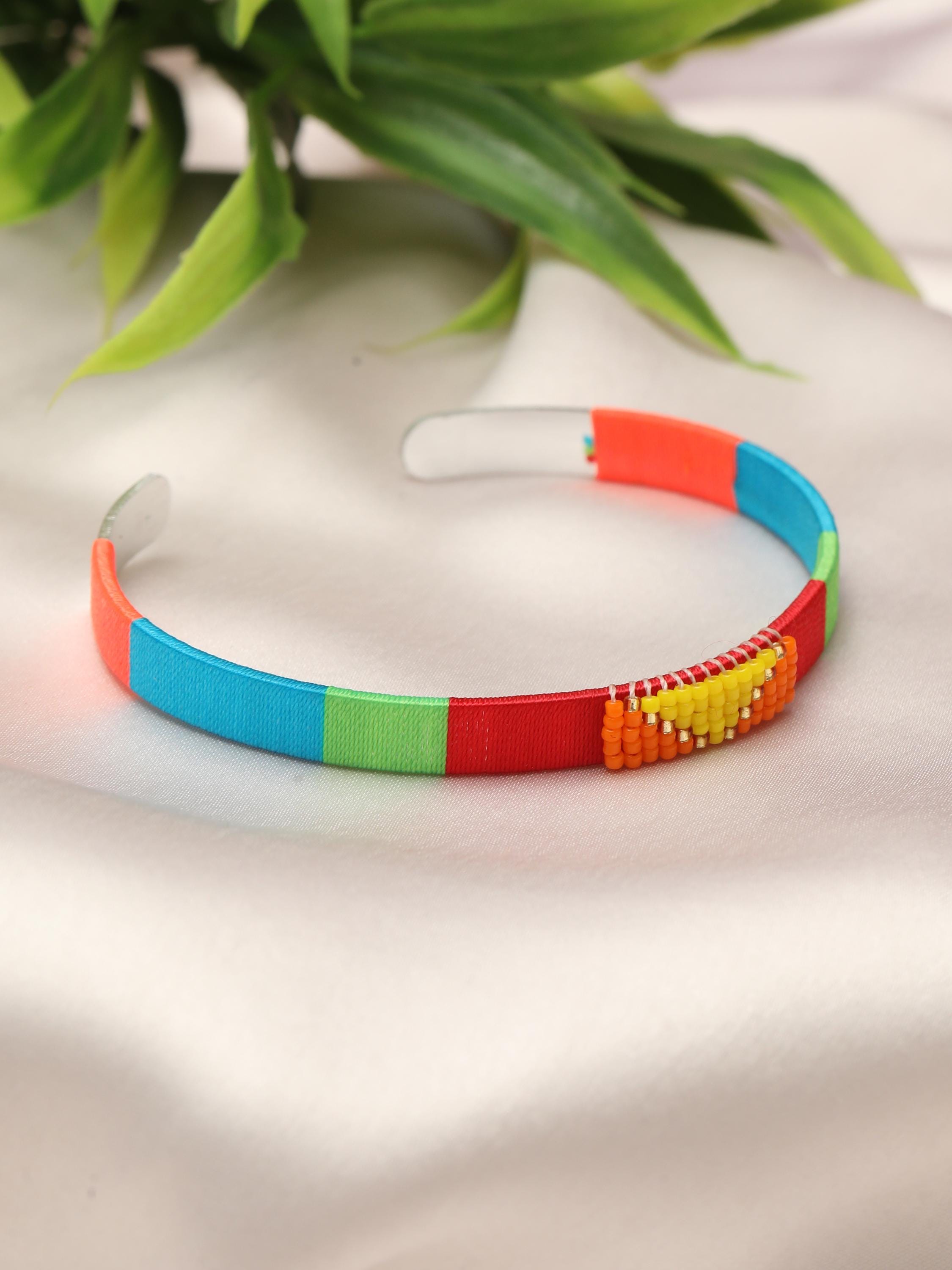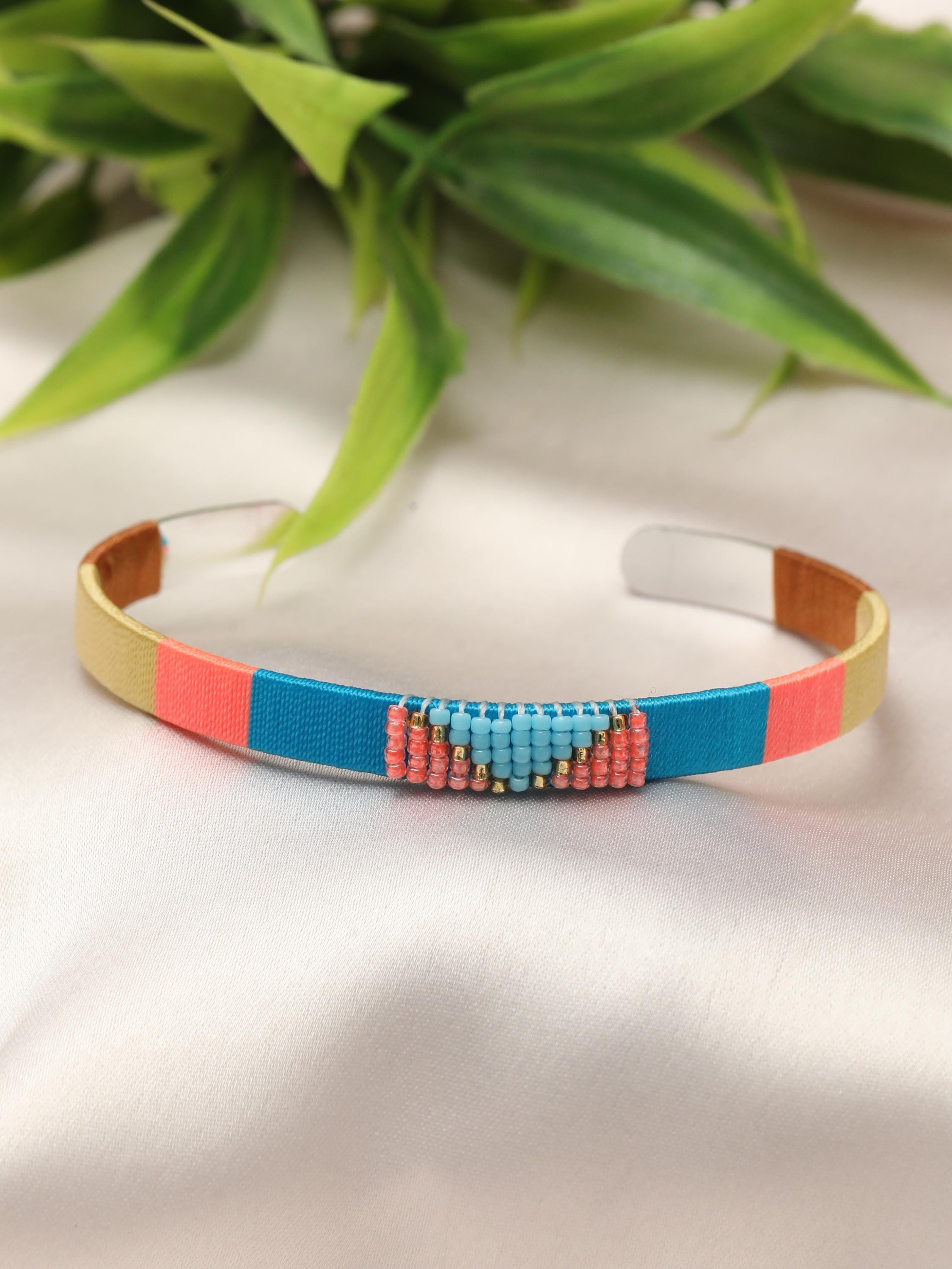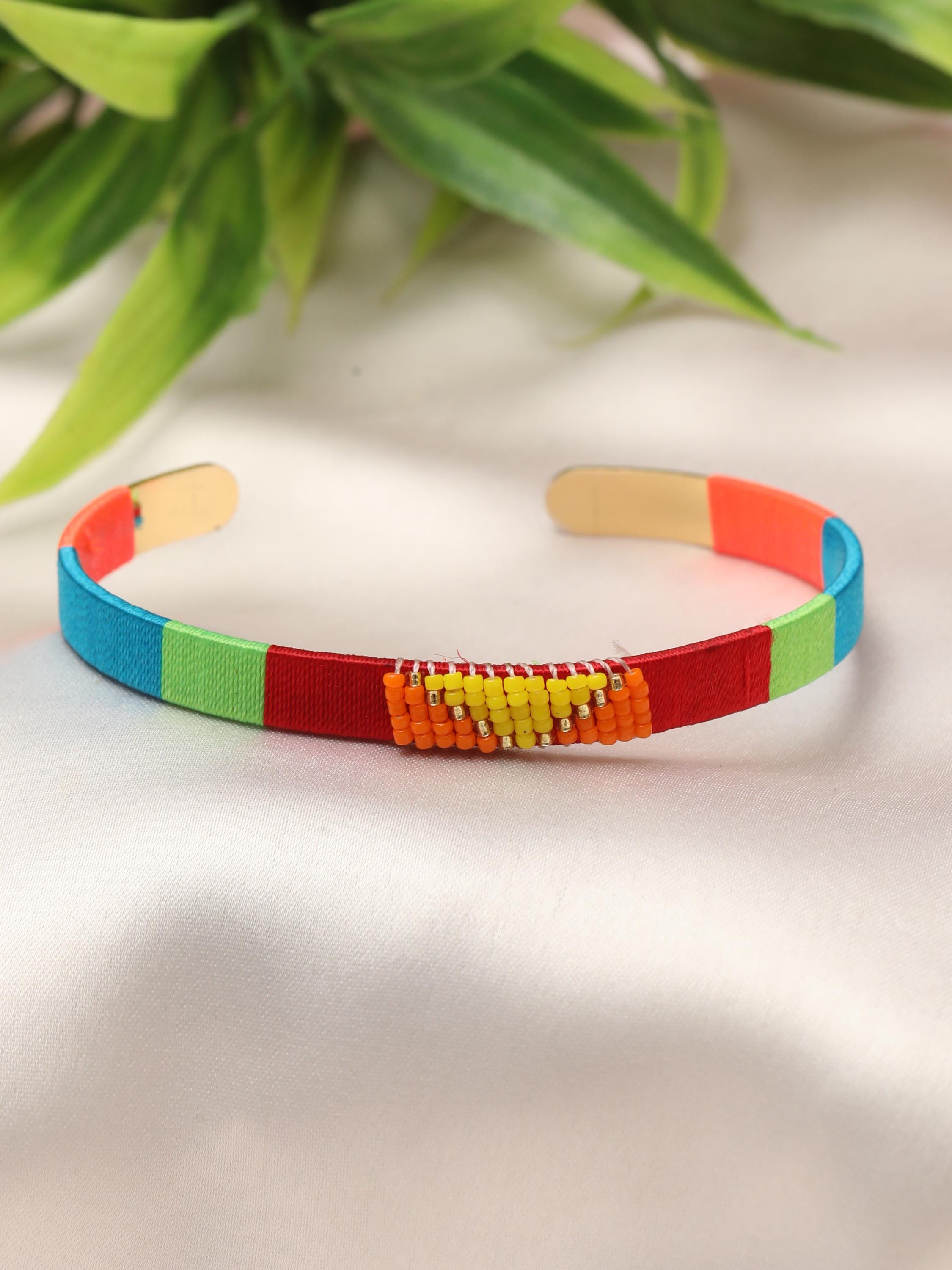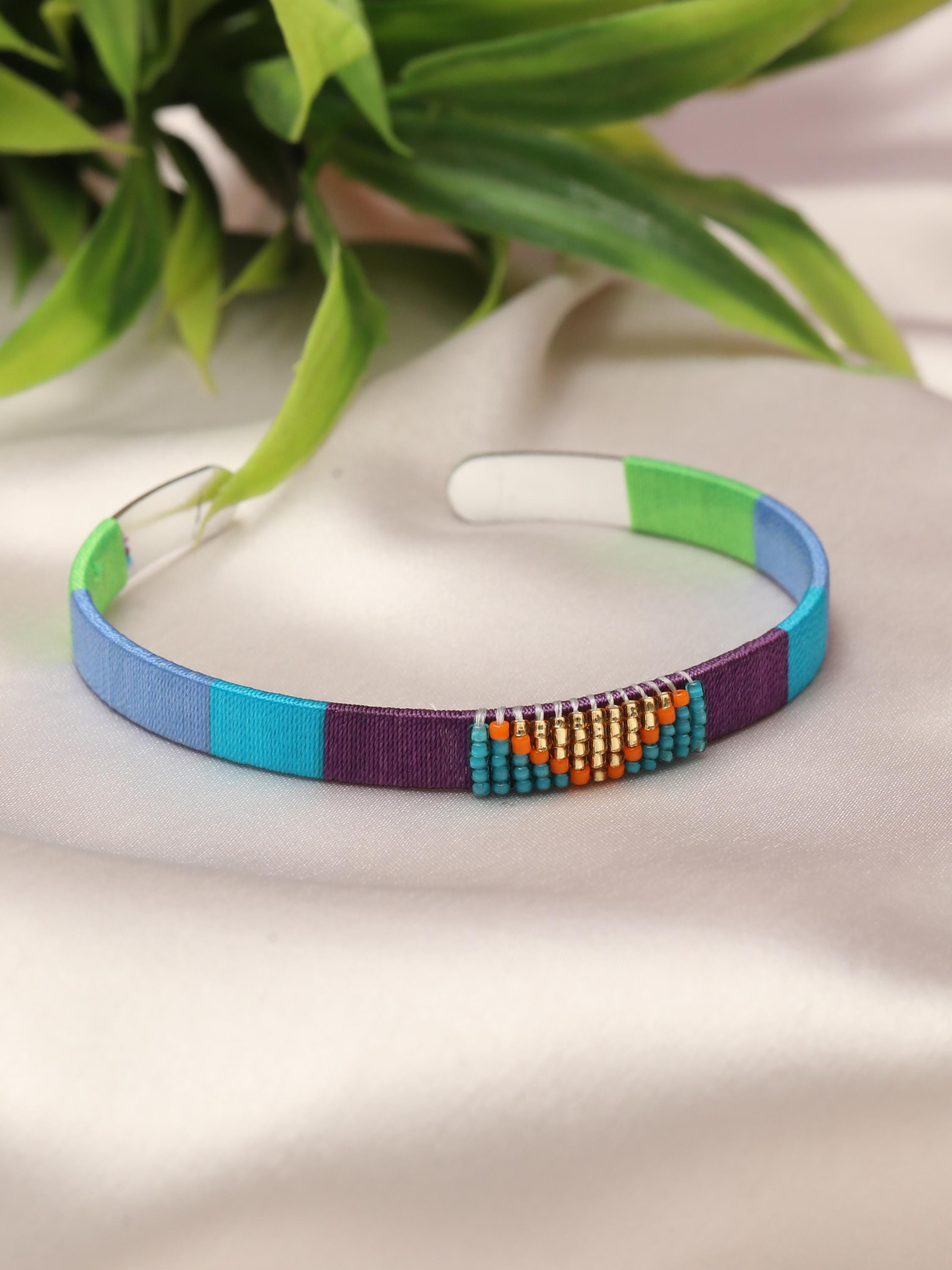 Add a vibrant pop of color and texture to your look with this handmade stainless steel cuff bracelet, beautifully adorned with colorful threads and beads arranged in bold geometric patterns. Each cuff is meticulously crafted to blend the durability of stainless steel with the artistry of woven threadwork and bead embellishments, making it the perfect boho statement bracelet for any outfit.