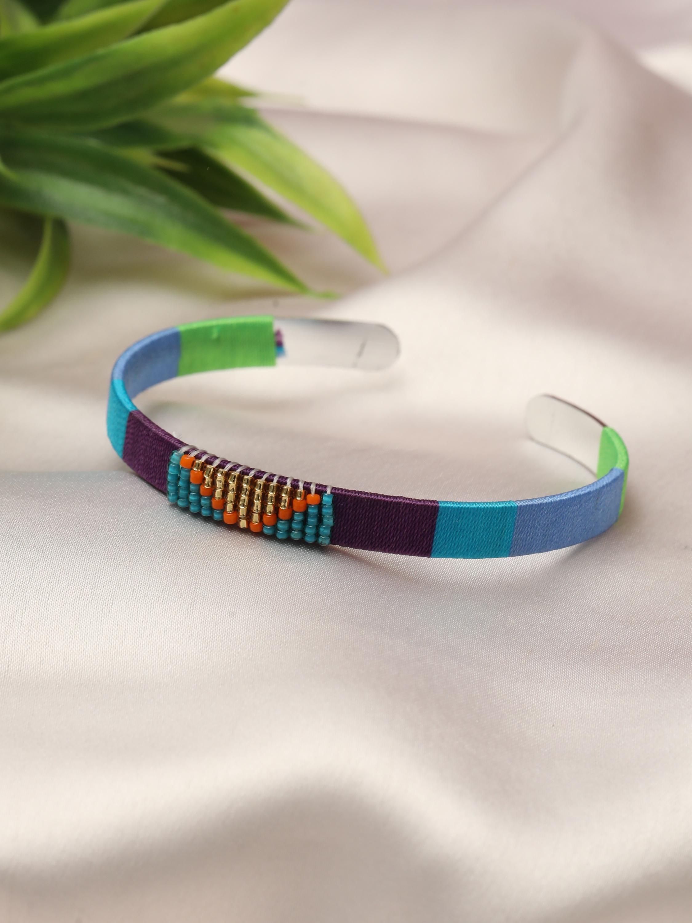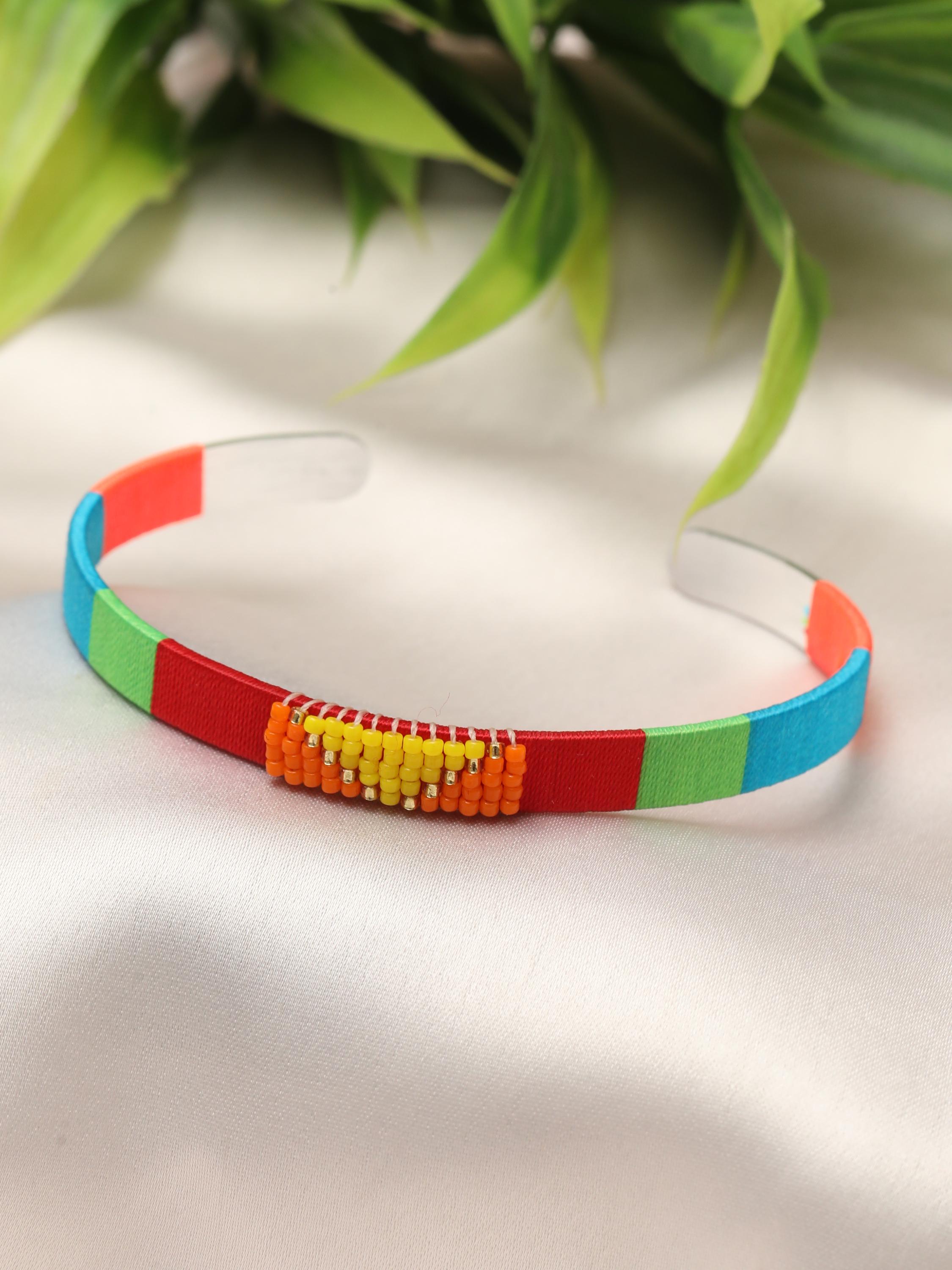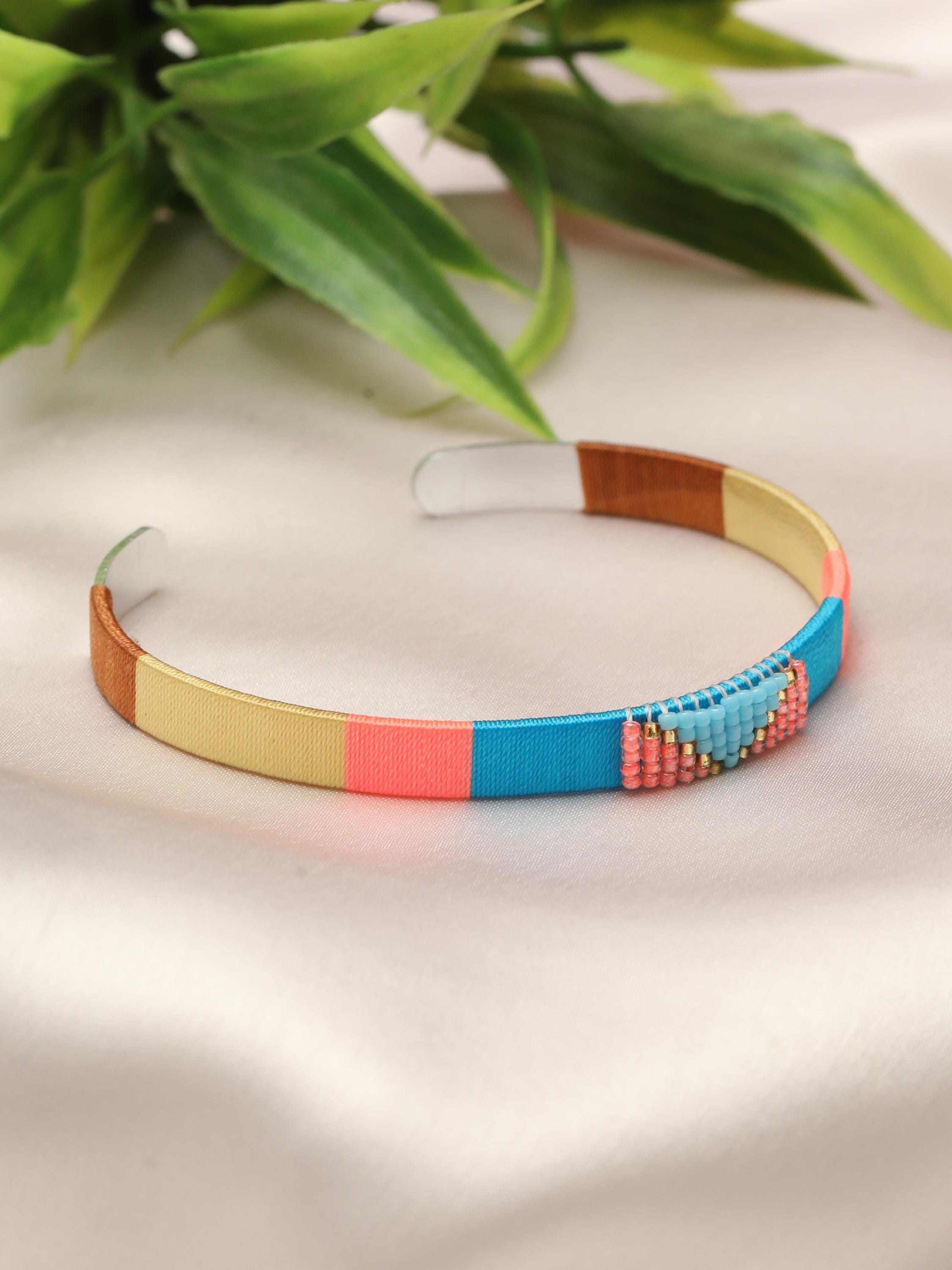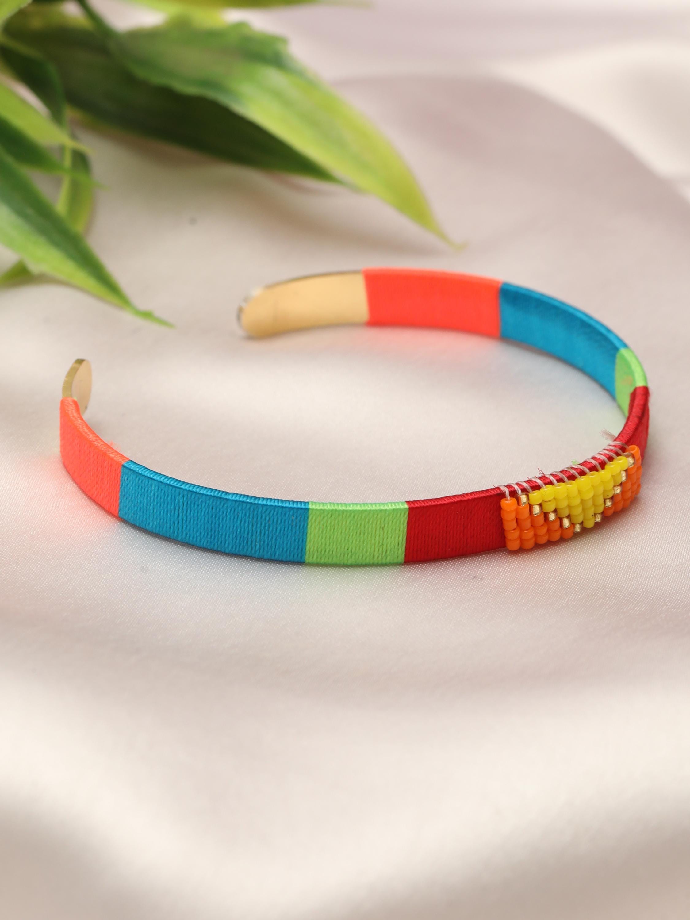 Add a vibrant pop of color and texture to your look with this handmade stainless steel cuff bracelet, beautifully adorned with colorful threads and beads arranged in bold geometric patterns. Each cuff is meticulously crafted to blend the durability of stainless steel with the artistry of woven threadwork and bead embellishments, making it the perfect boho statement bracelet for any outfit.