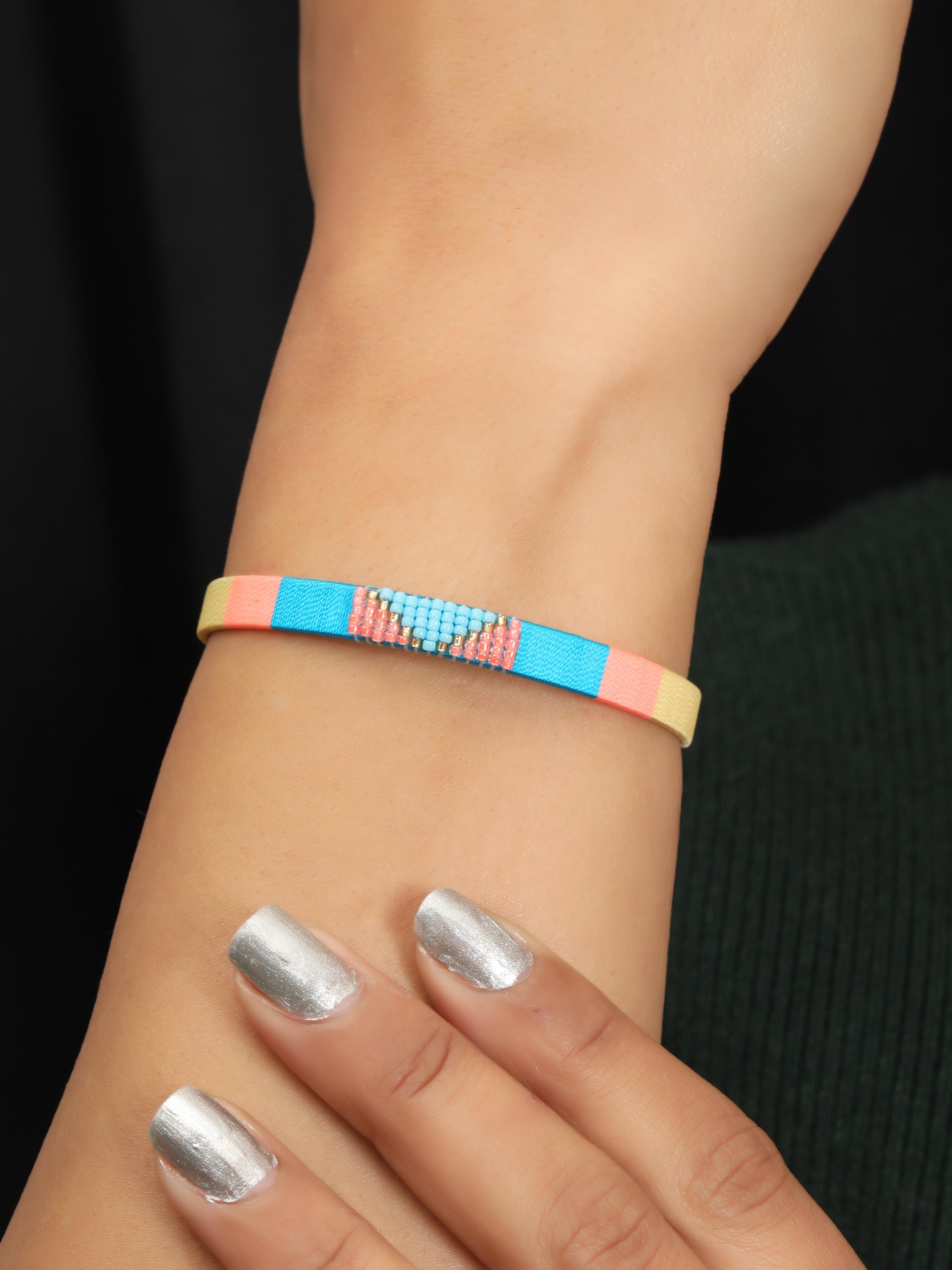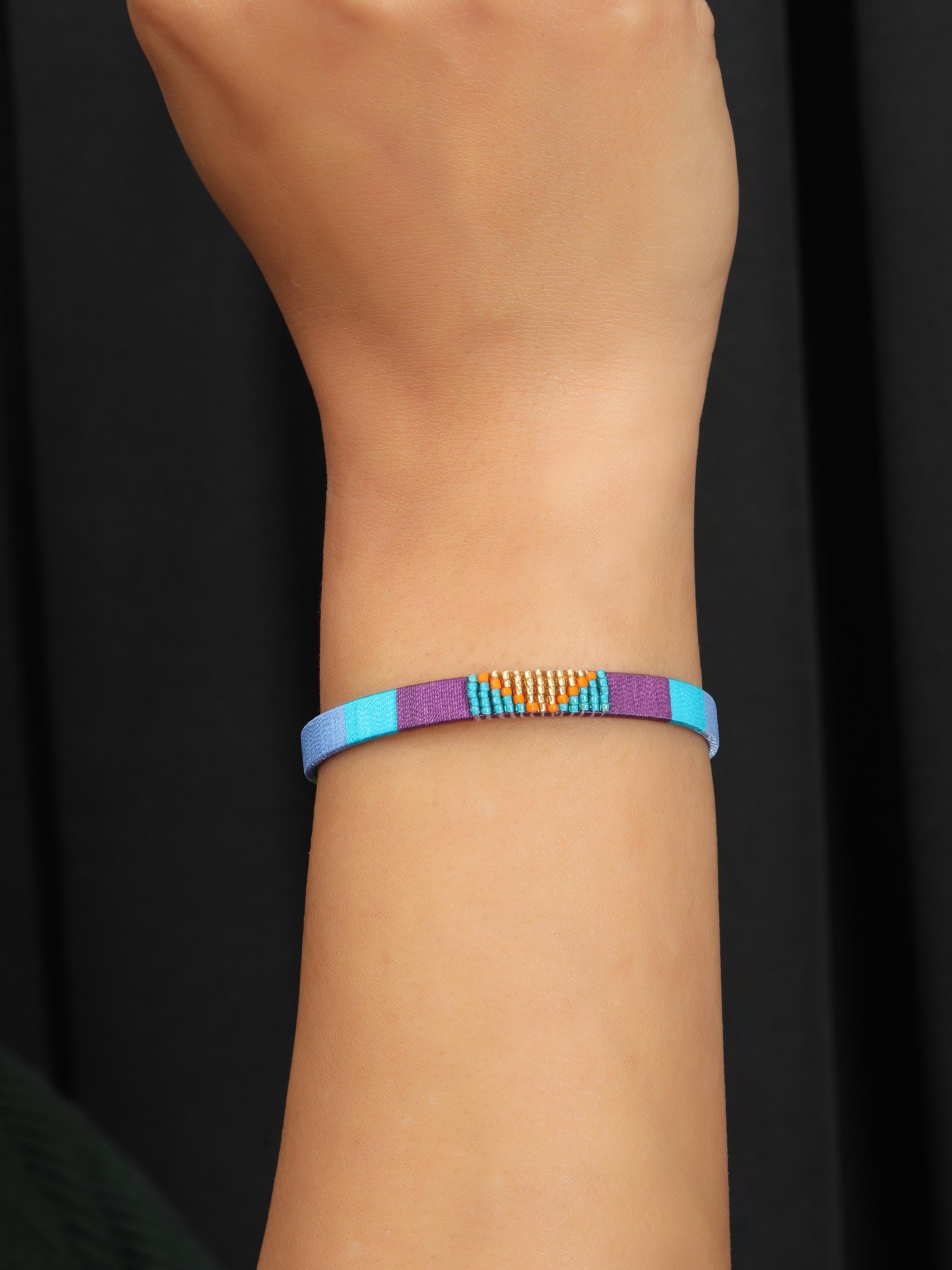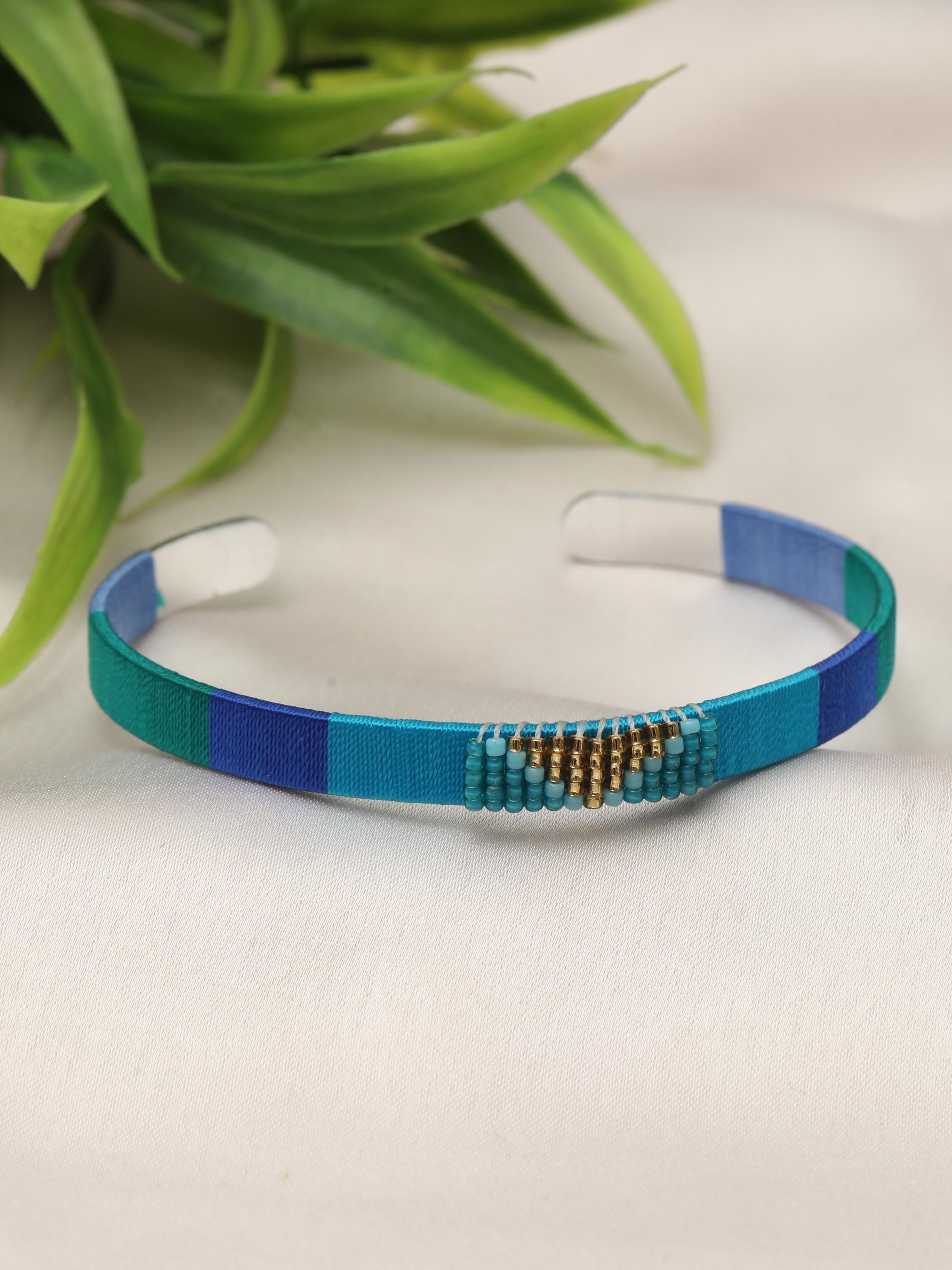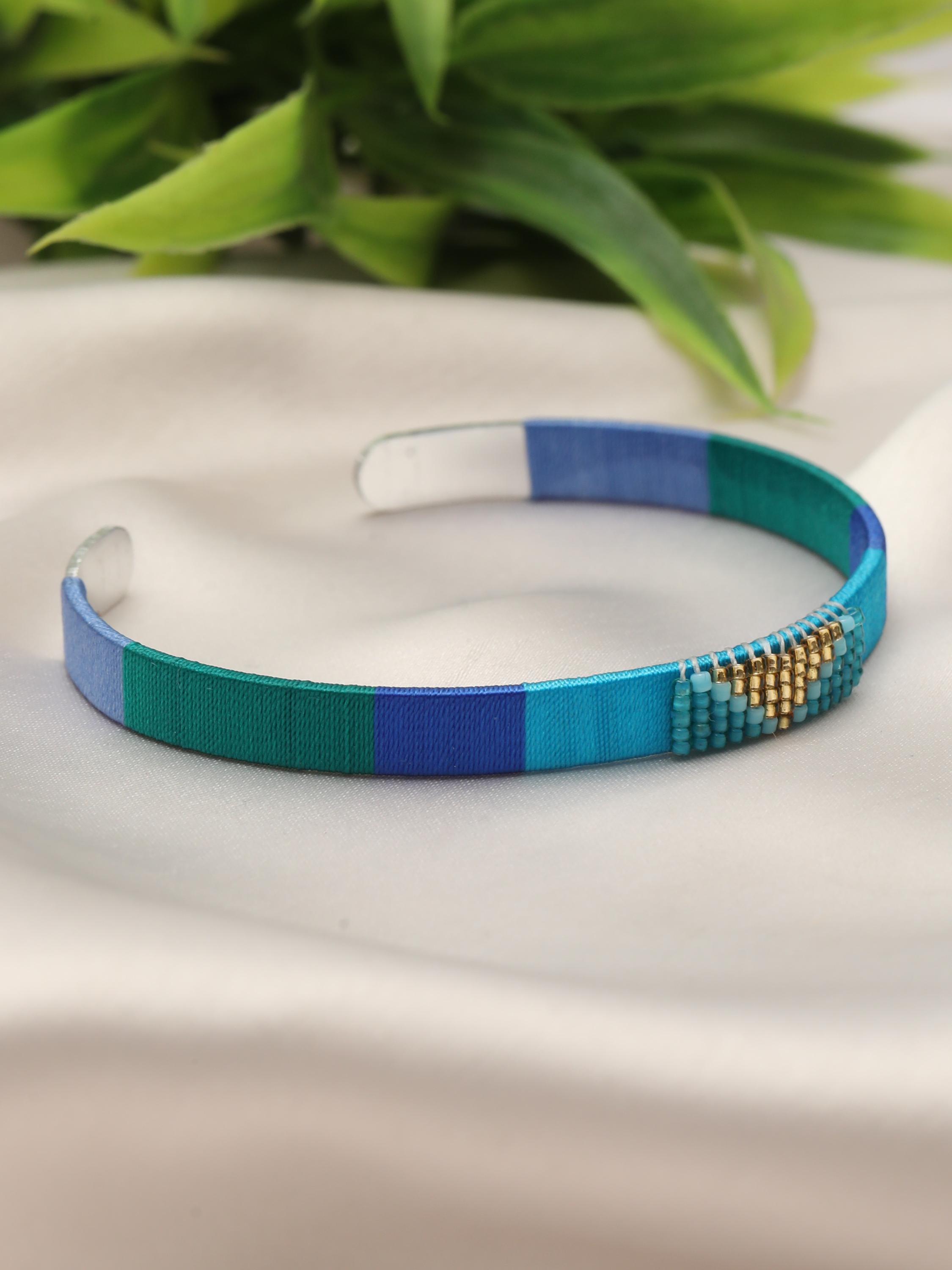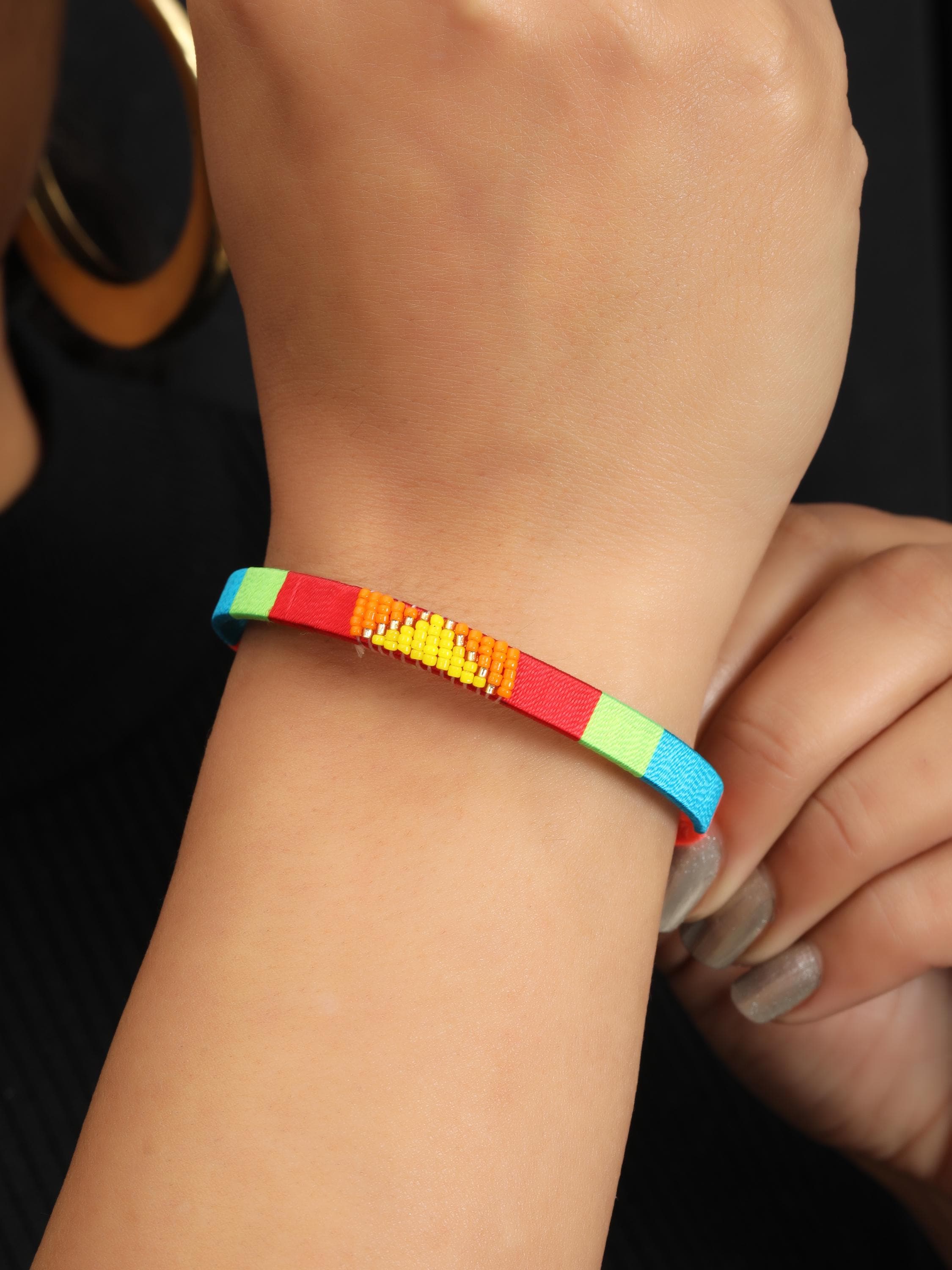 Add a vibrant pop of color and texture to your look with this handmade stainless steel cuff bracelet, beautifully adorned with colorful threads and beads arranged in bold geometric patterns. Each cuff is meticulously crafted to blend the durability of stainless steel with the artistry of woven threadwork and bead embellishments, making it the perfect boho statement bracelet for any outfit.
