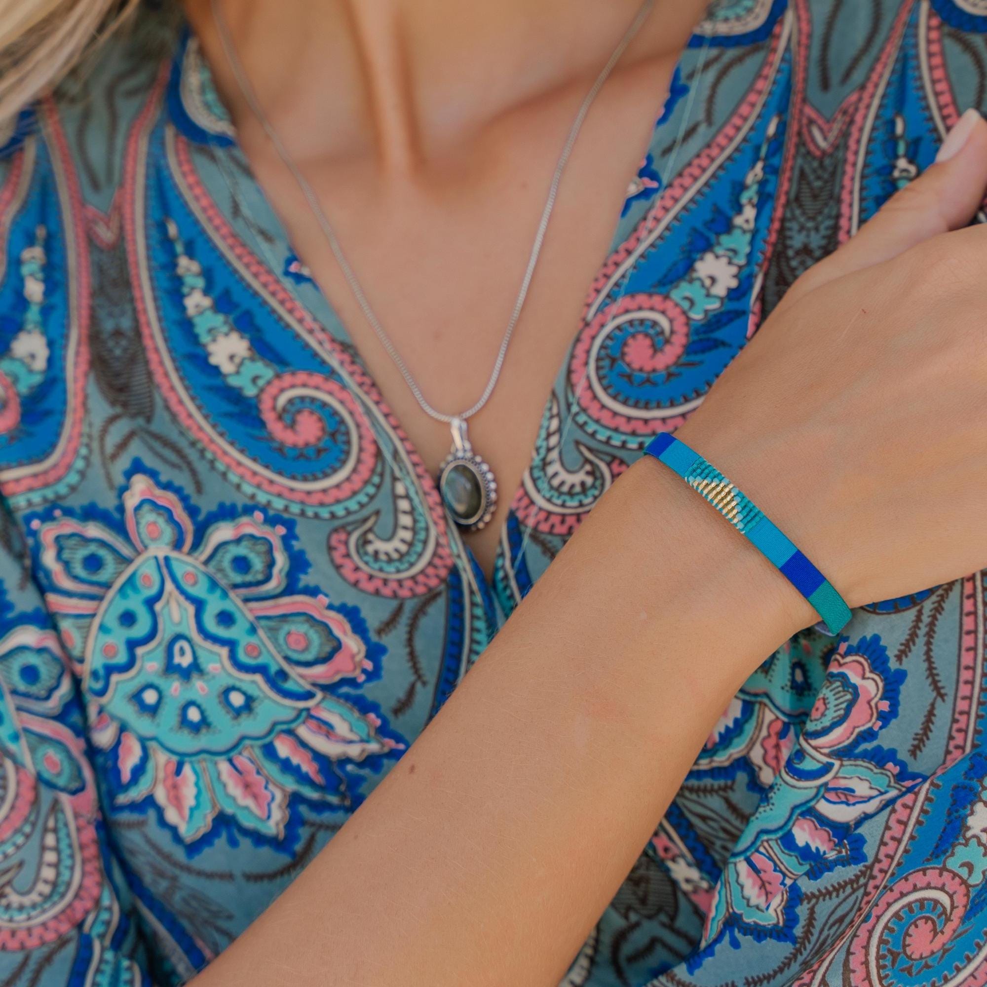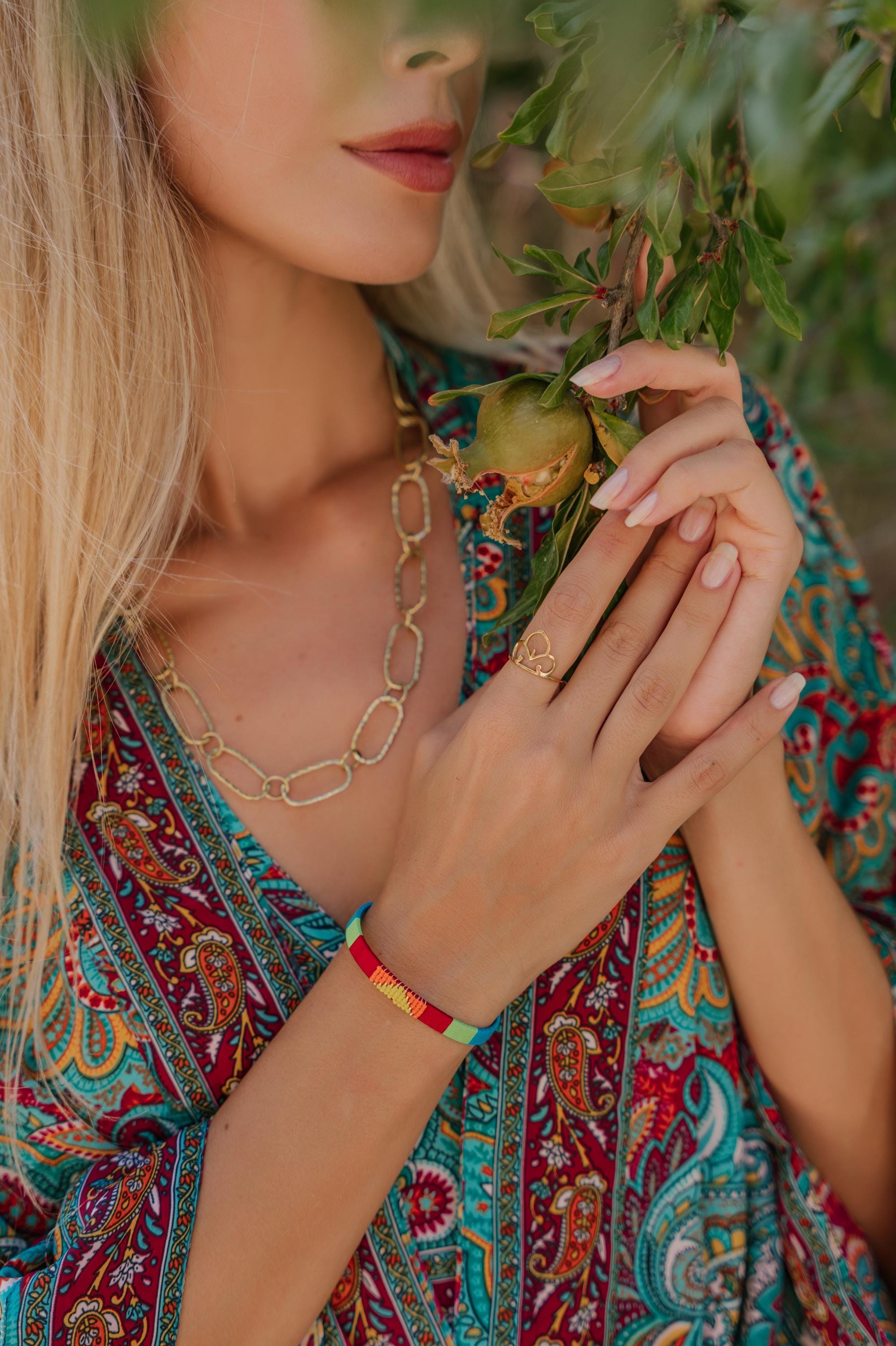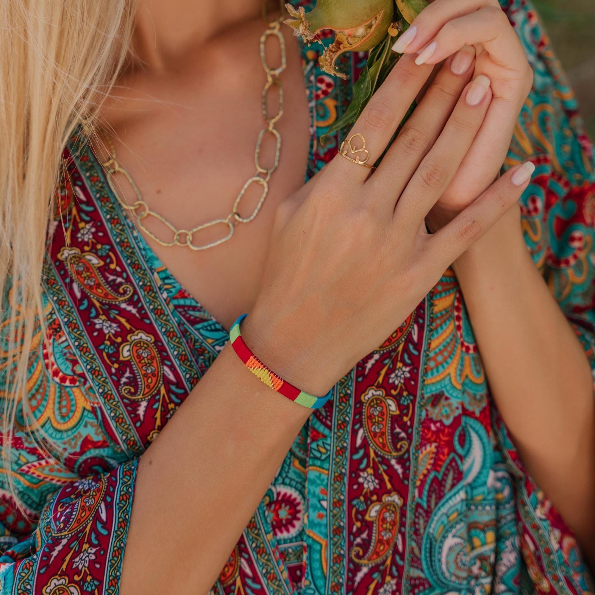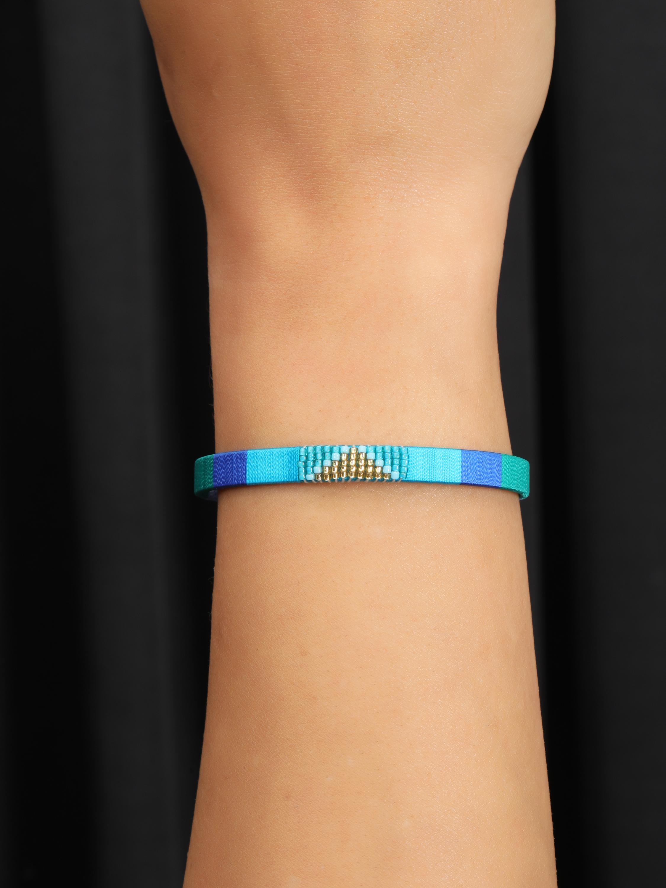 Add a vibrant pop of color and texture to your look with this handmade stainless steel cuff bracelet, beautifully adorned with colorful threads and beads arranged in bold geometric patterns. Each cuff is meticulously crafted to blend the durability of stainless steel with the artistry of woven threadwork and bead embellishments, making it the perfect boho statement bracelet for any outfit.