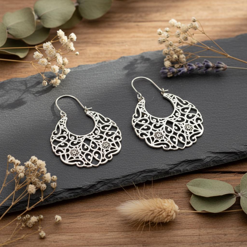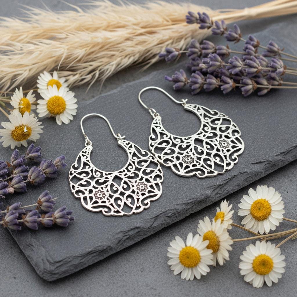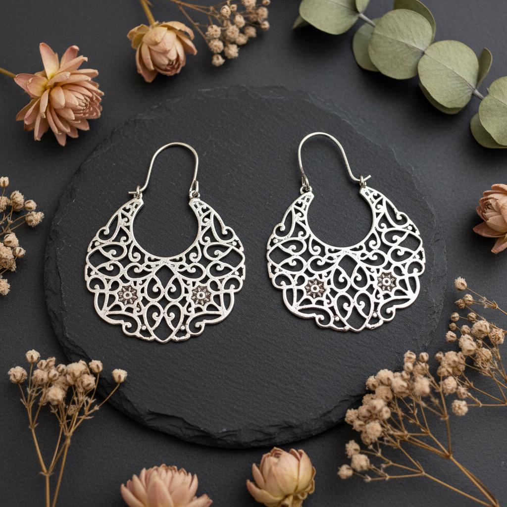 These bohemian filigree earrings are handcrafted from brass and feature an intricate oriental and ethnic design inspired by traditional tribal jewelry. The detailed openwork creates a bold yet airy silhouette, allowing the earrings to remain lightweight while making a strong statement.