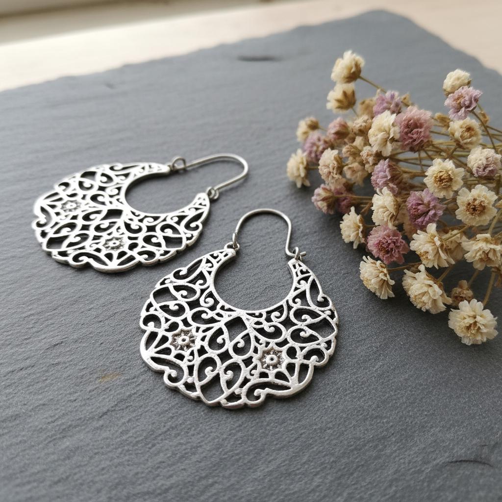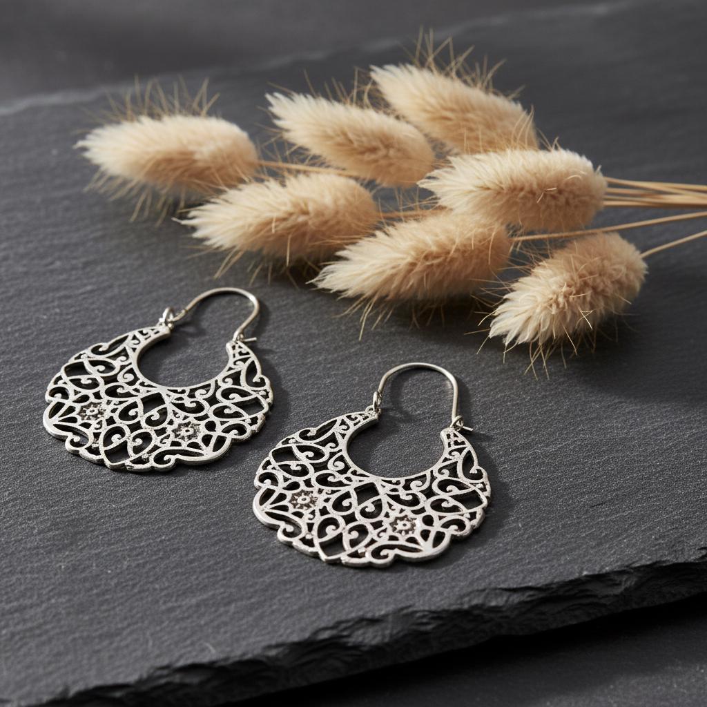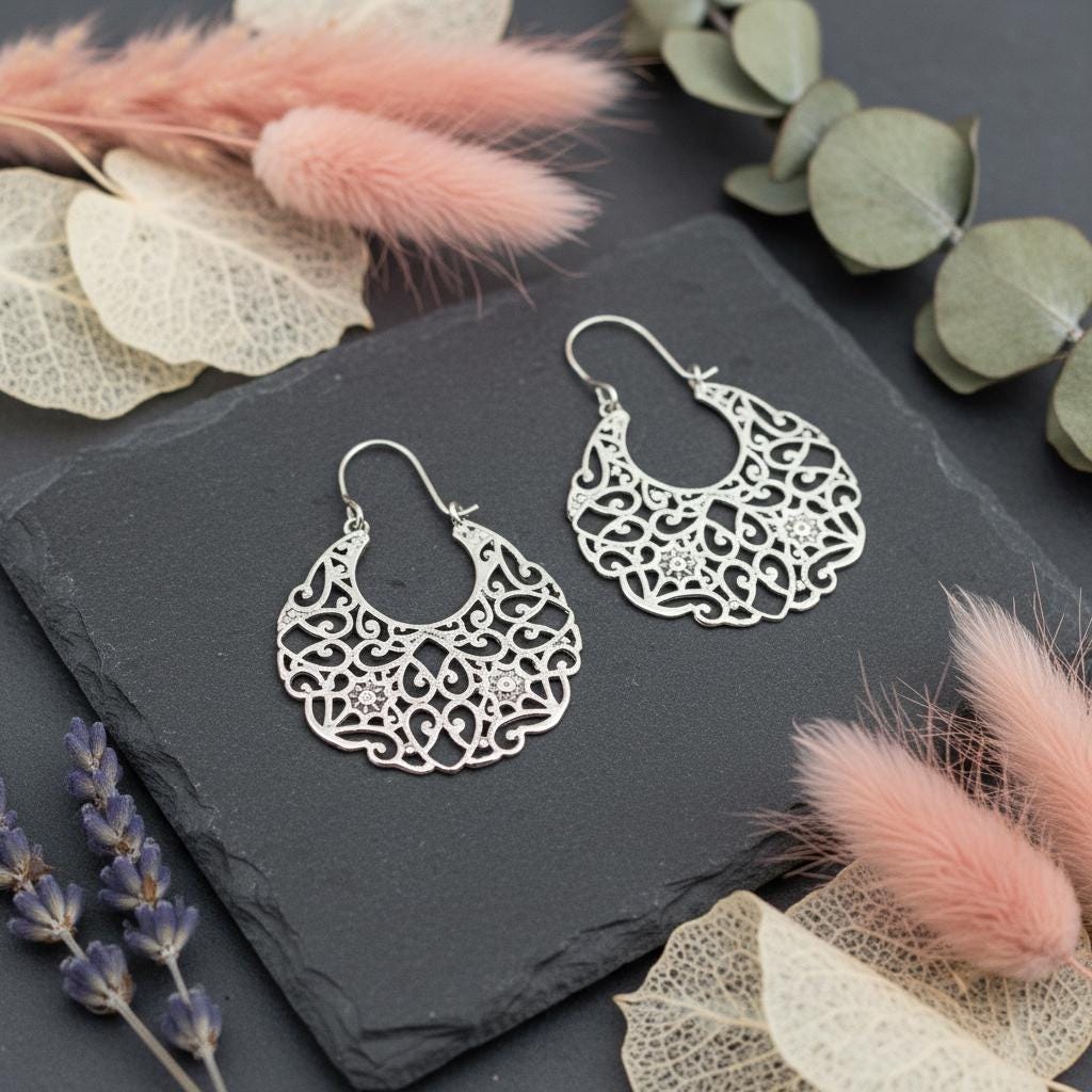 These bohemian filigree earrings are handcrafted from brass and feature an intricate oriental and ethnic design inspired by traditional tribal jewelry. The detailed openwork creates a bold yet airy silhouette, allowing the earrings to remain lightweight while making a strong statement.