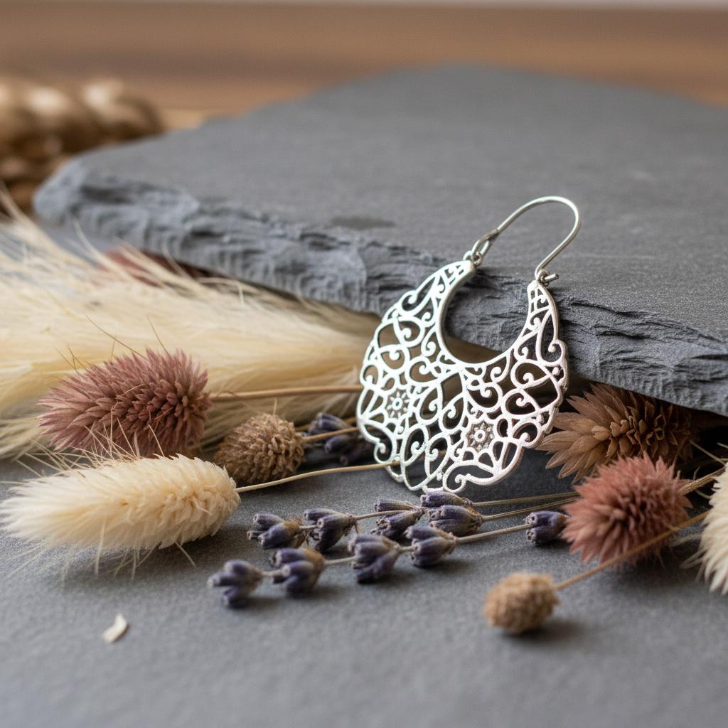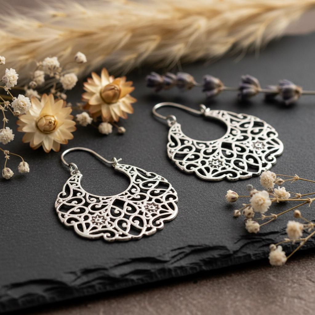 Their crescent shape and ornamental patterns echo gypsy, Middle Eastern, and North African influences, making them a perfect accessory for free spirits and lovers of cultural jewelry, symbolizing femininity, intuition, and ancient cultural heritage found across oriental and tribal traditions.