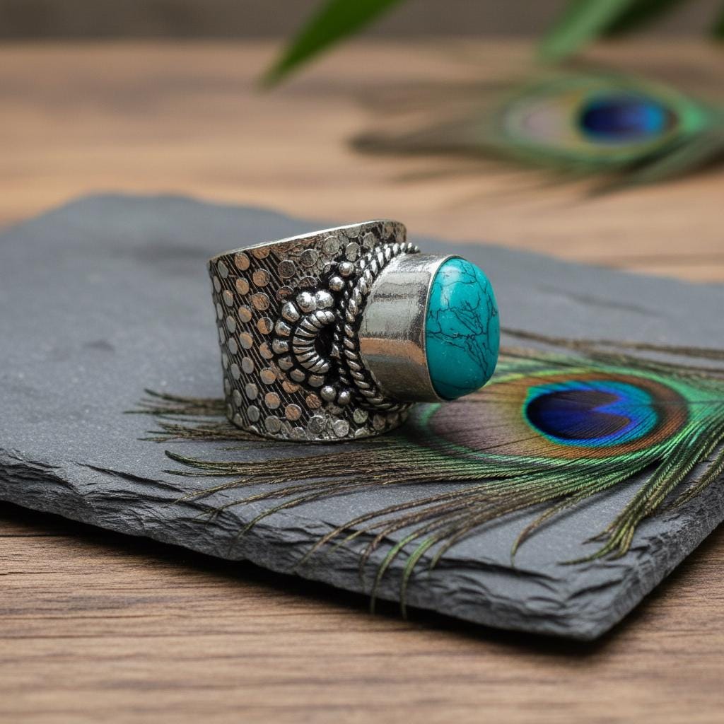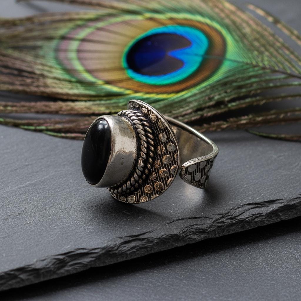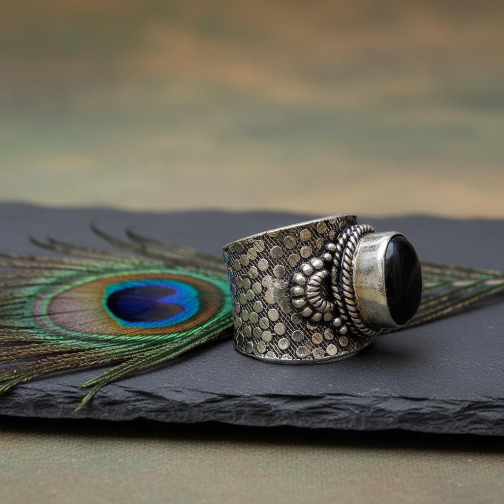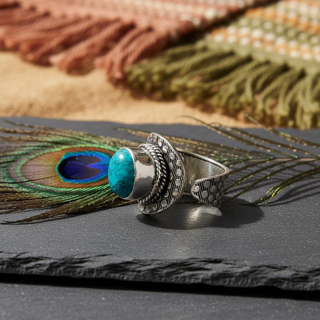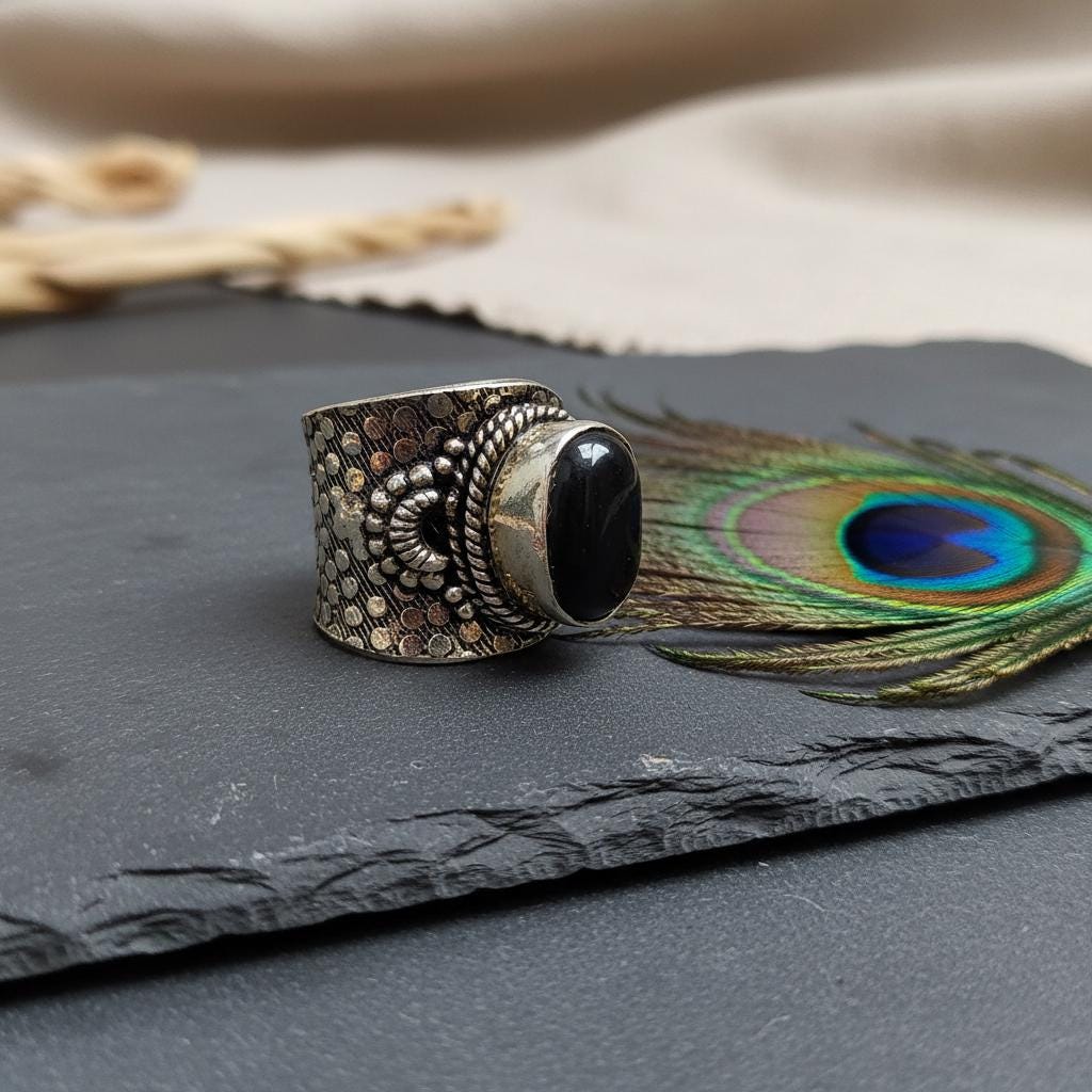 Add a bold boho touch to your look with this bohemian ethnic adjustable ring, crafted in silver tone brass and set with a gemstone. The detailed textured band and bezel setting give this ring a timeless tribal feel, perfect for lovers of ethnic, boho, and statement jewelry.
