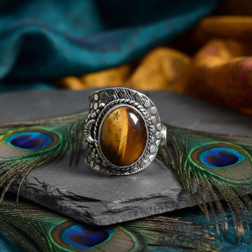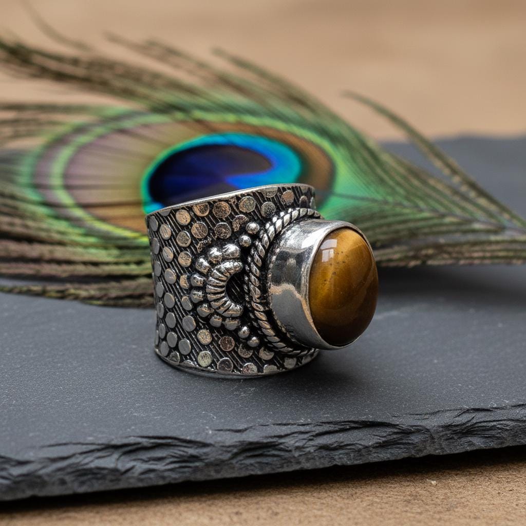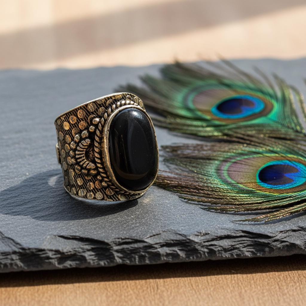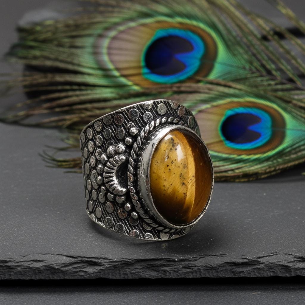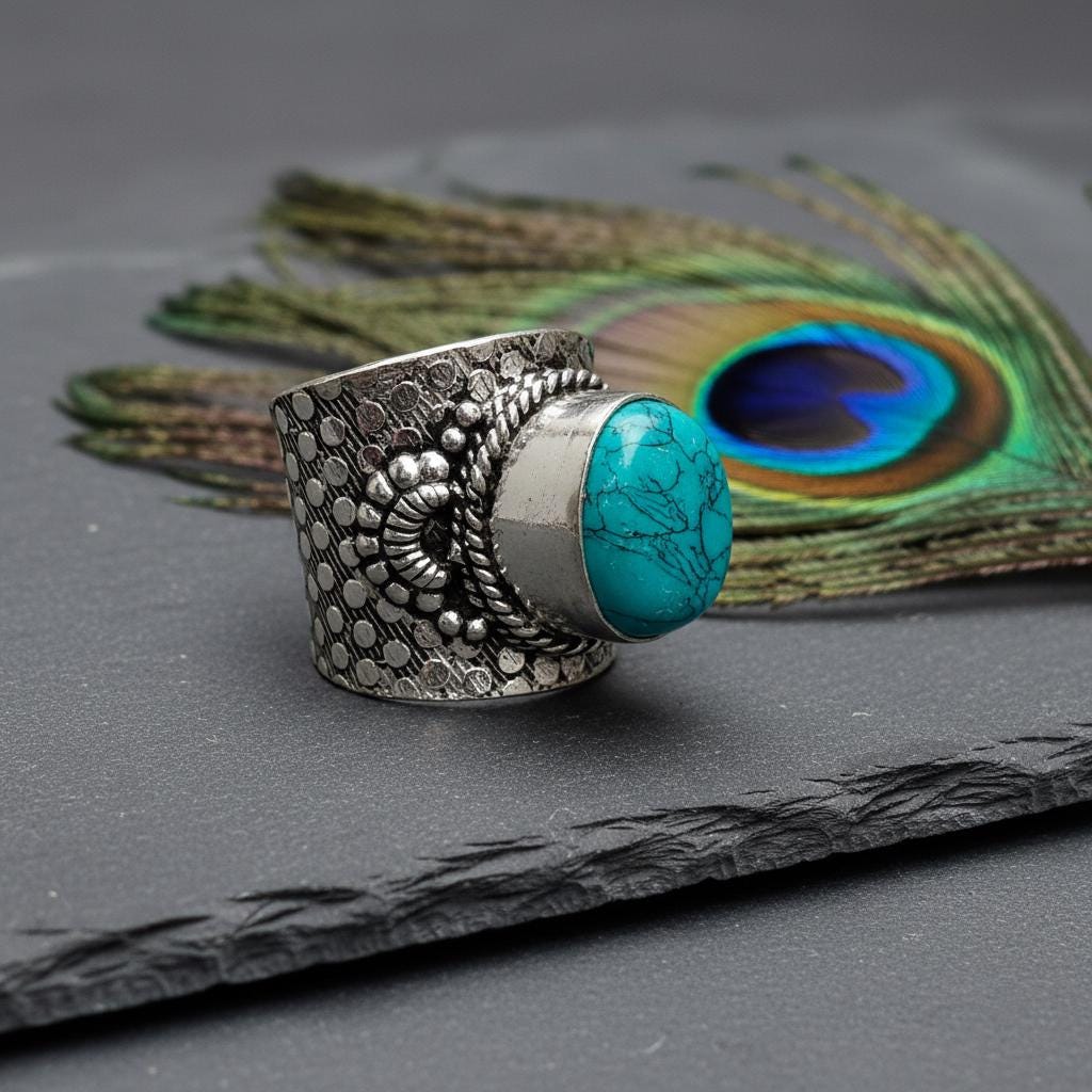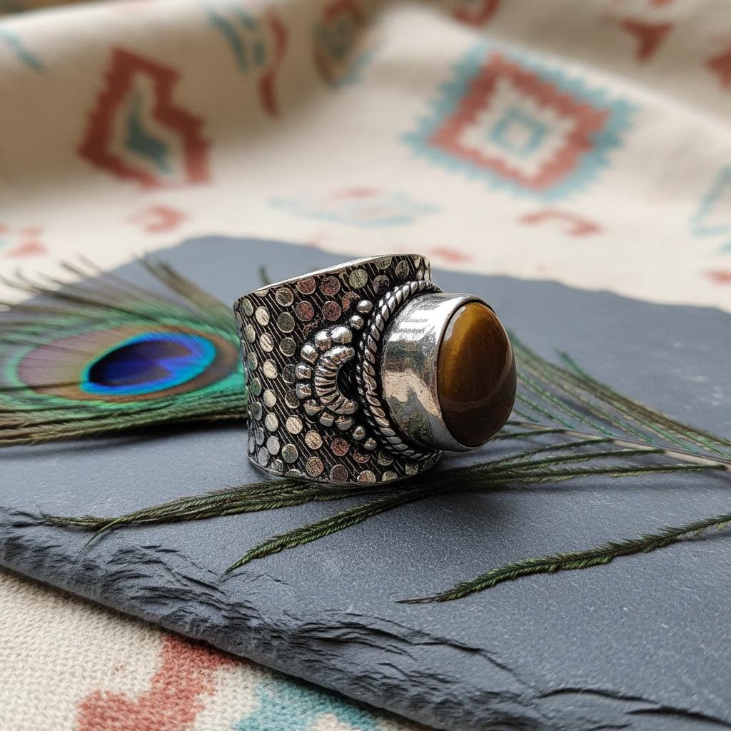 Add a bold boho touch to your look with this bohemian ethnic adjustable ring, crafted in silver tone brass and set with a gemstone. The detailed textured band and bezel setting give this ring a timeless tribal feel, perfect for lovers of ethnic, boho, and statement jewelry.
