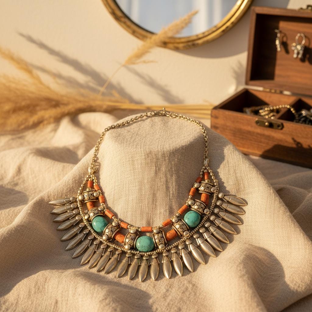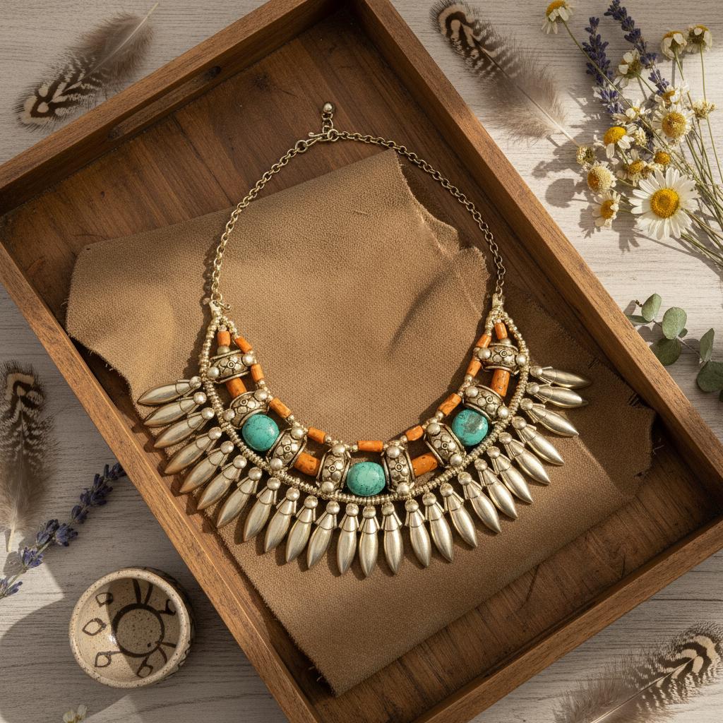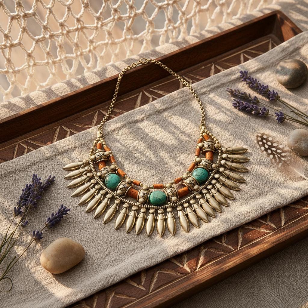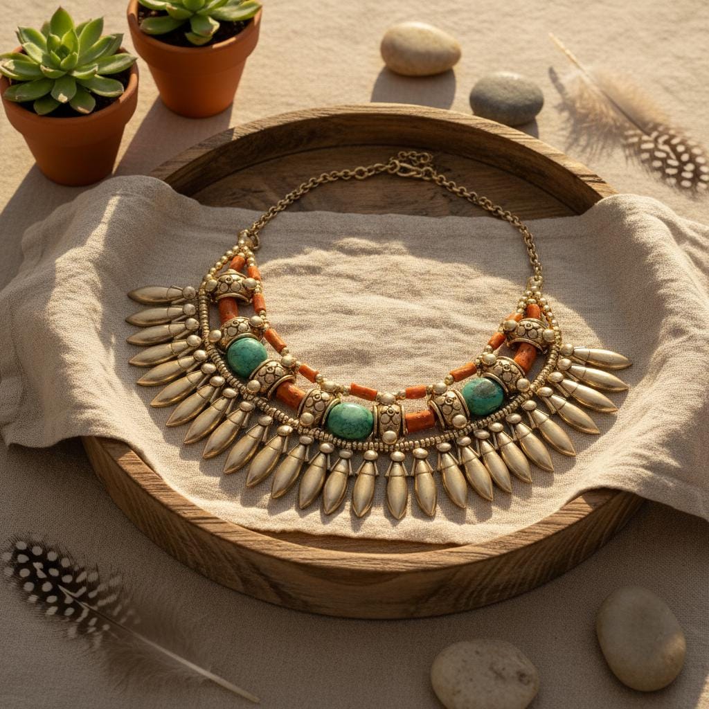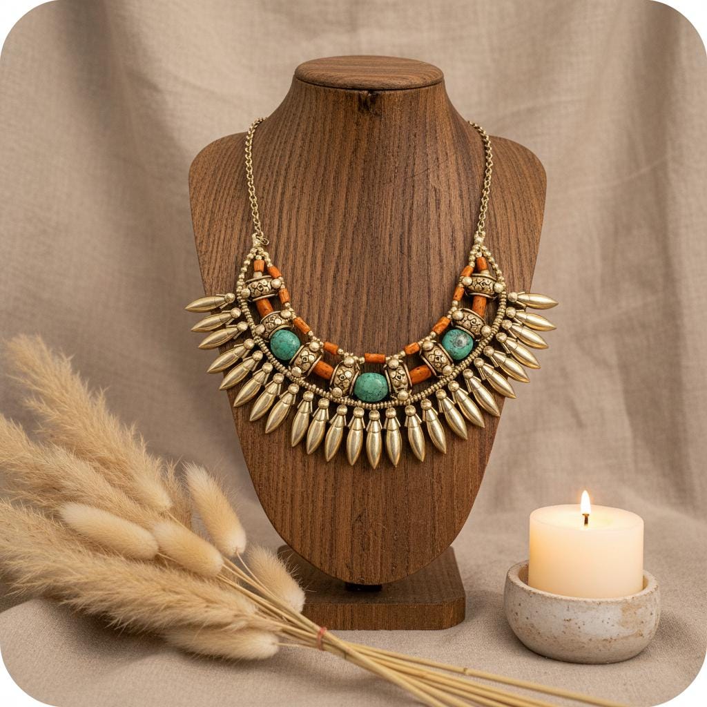 The bib-style design drapes beautifully across the collarbone, evoking a strong tribal aesthetic while remaining elegant and wearable. Carefully crafted with attention to detail, this choker is perfect for those who love boho, festival, or ethnic fashion and want a piece that tells a story.