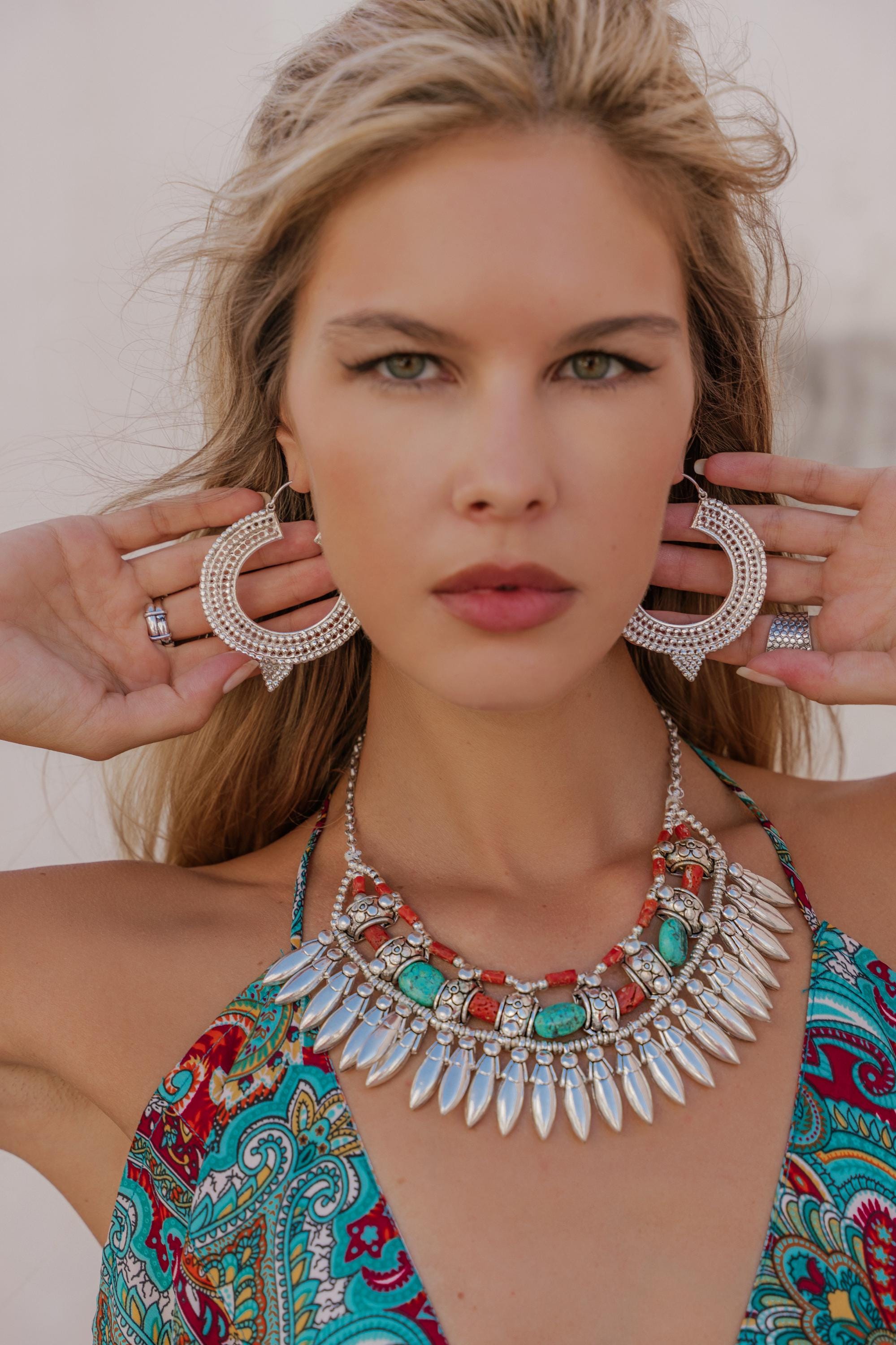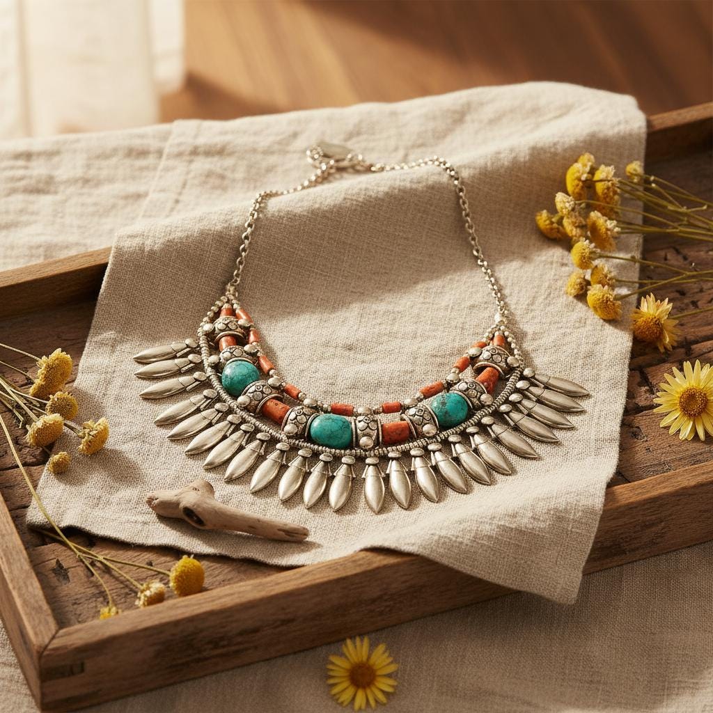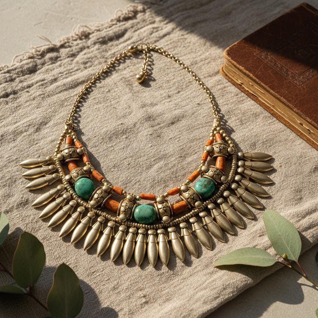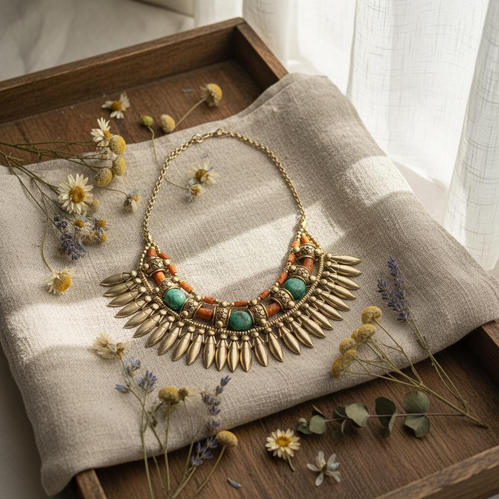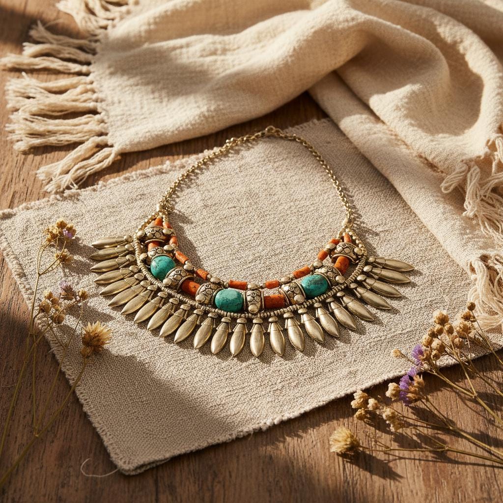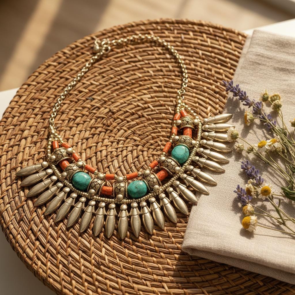 The bib-style design drapes beautifully across the collarbone, evoking a strong tribal aesthetic while remaining elegant and wearable. Carefully crafted with attention to detail, this choker is perfect for those who love boho, festival, or ethnic fashion and want a piece that tells a story.