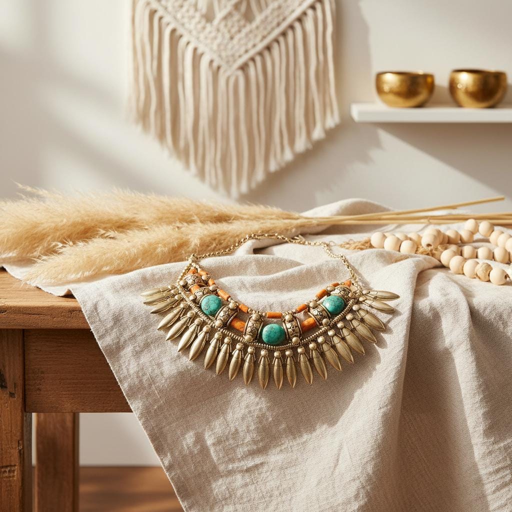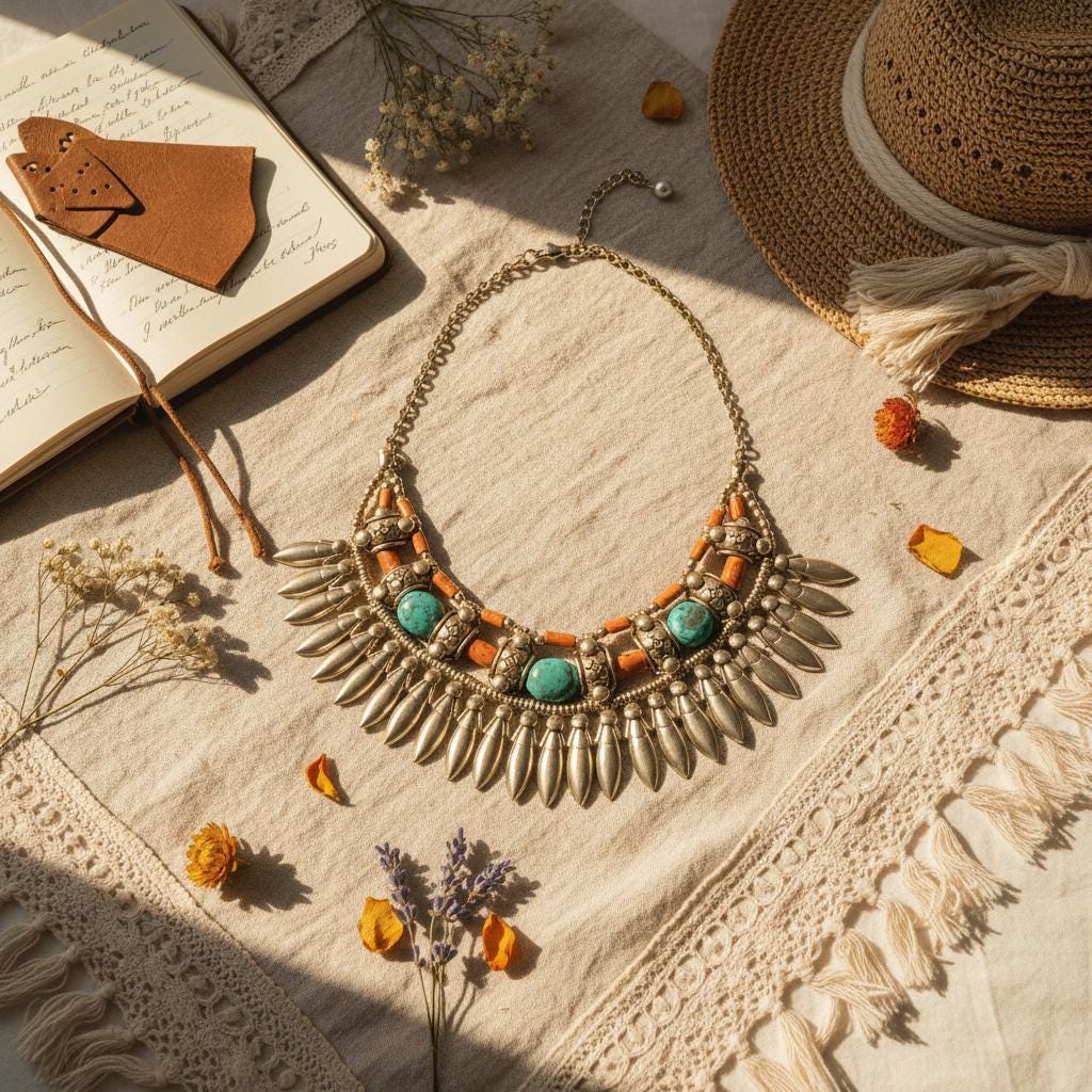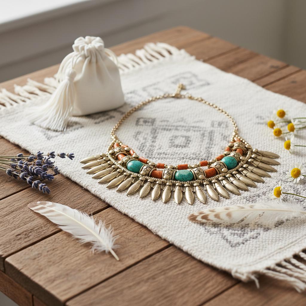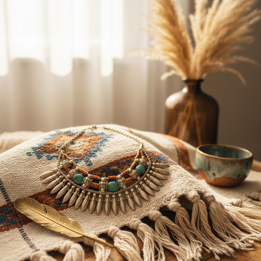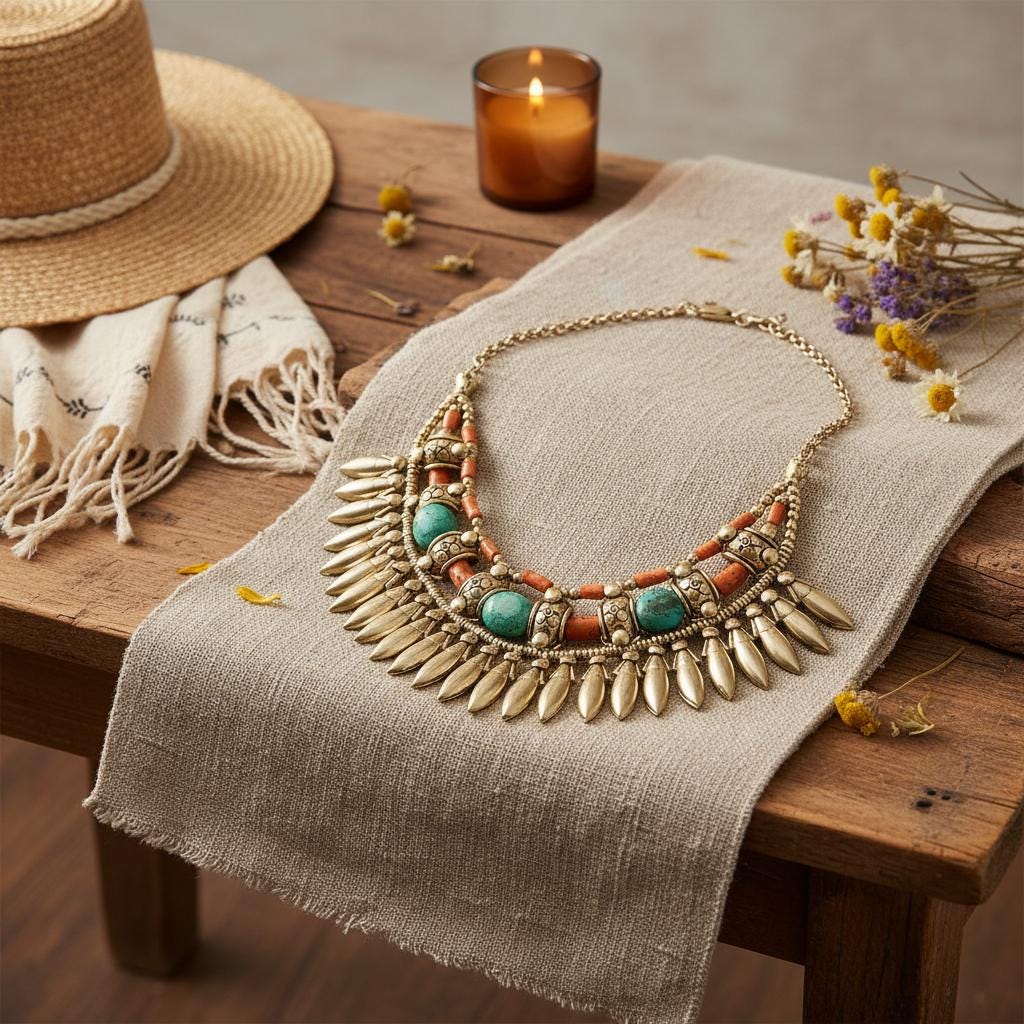 The bib-style design drapes beautifully across the collarbone, evoking a strong tribal aesthetic while remaining elegant and wearable. Carefully crafted with attention to detail, this choker is perfect for those who love boho, festival, or ethnic fashion and want a piece that tells a story.