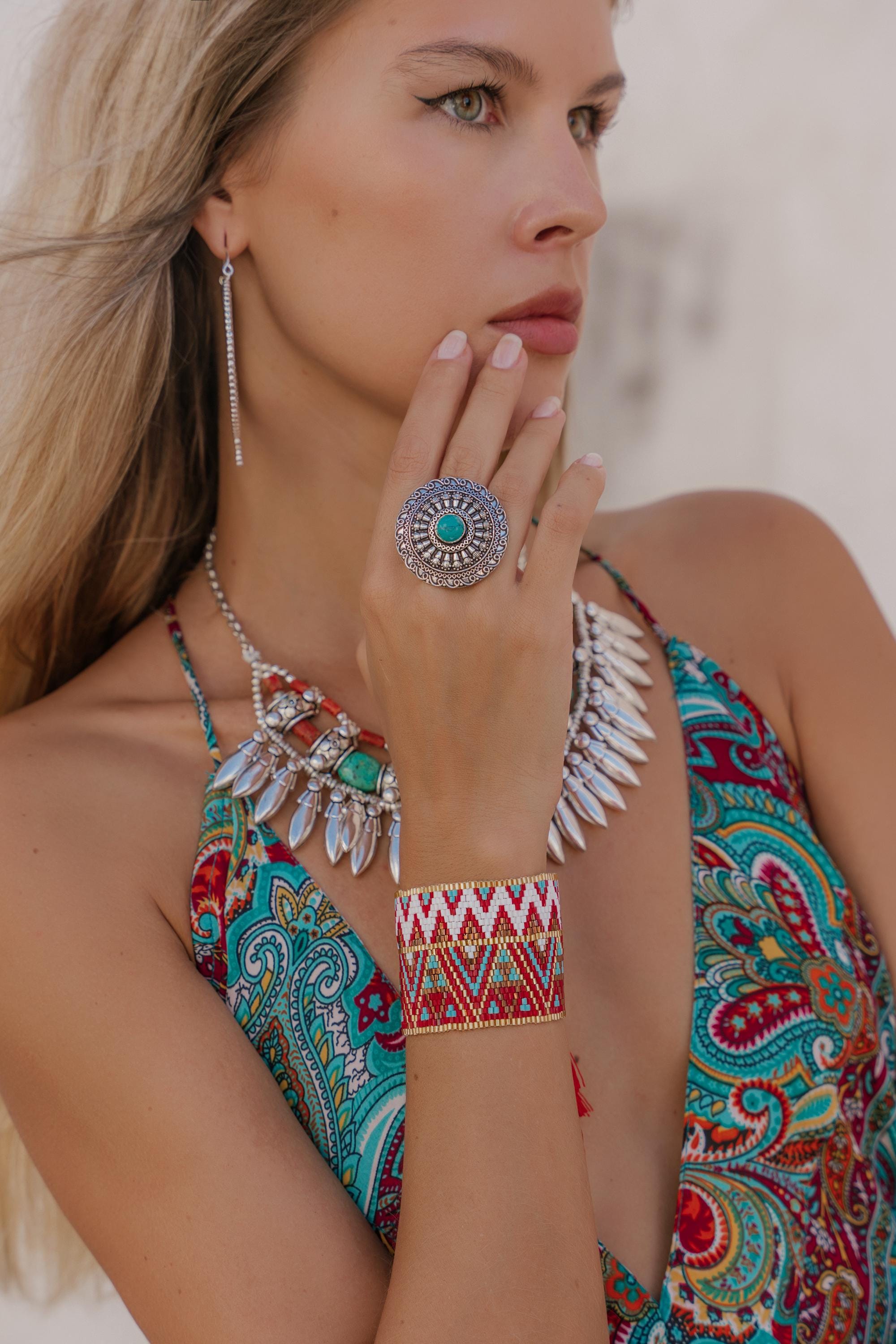 Make a bold, cultural statement with this handcrafted Silvered Brass Tribal Bib Choker Necklace. Inspired by the intricate artistry of Native American jewelry, this striking piece is adorned with vibrant turquoise and red beads, creating a stunning contrast against the rich, silver-toned brass.