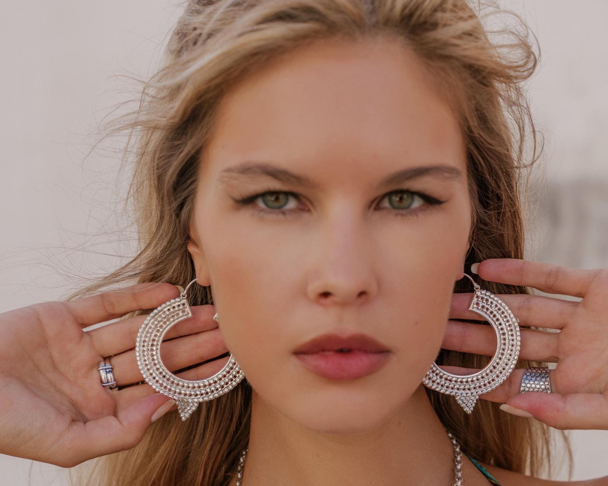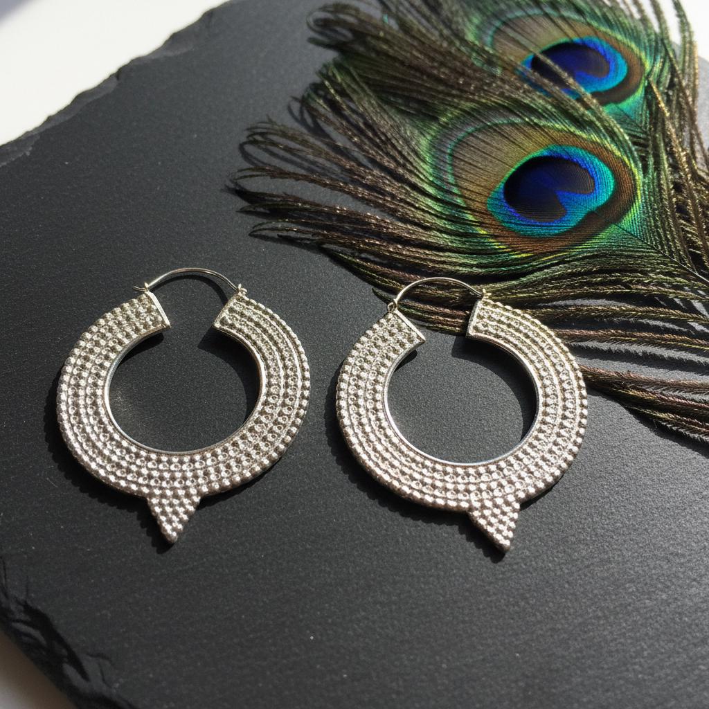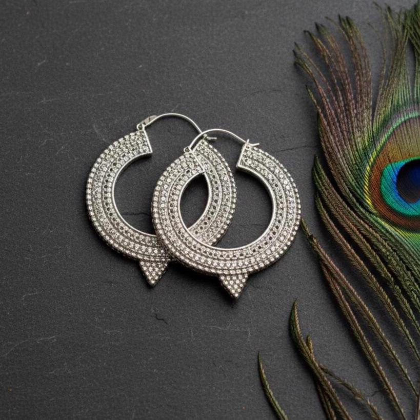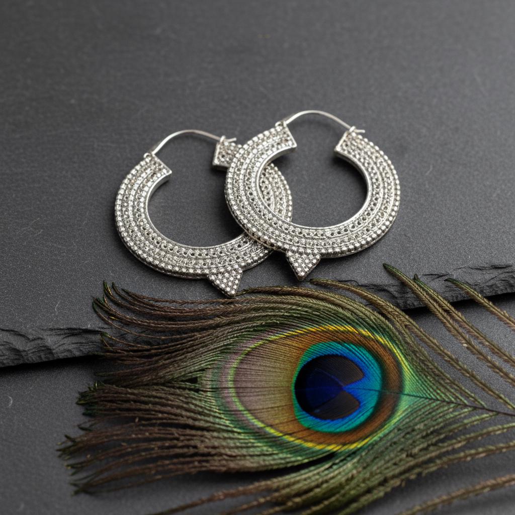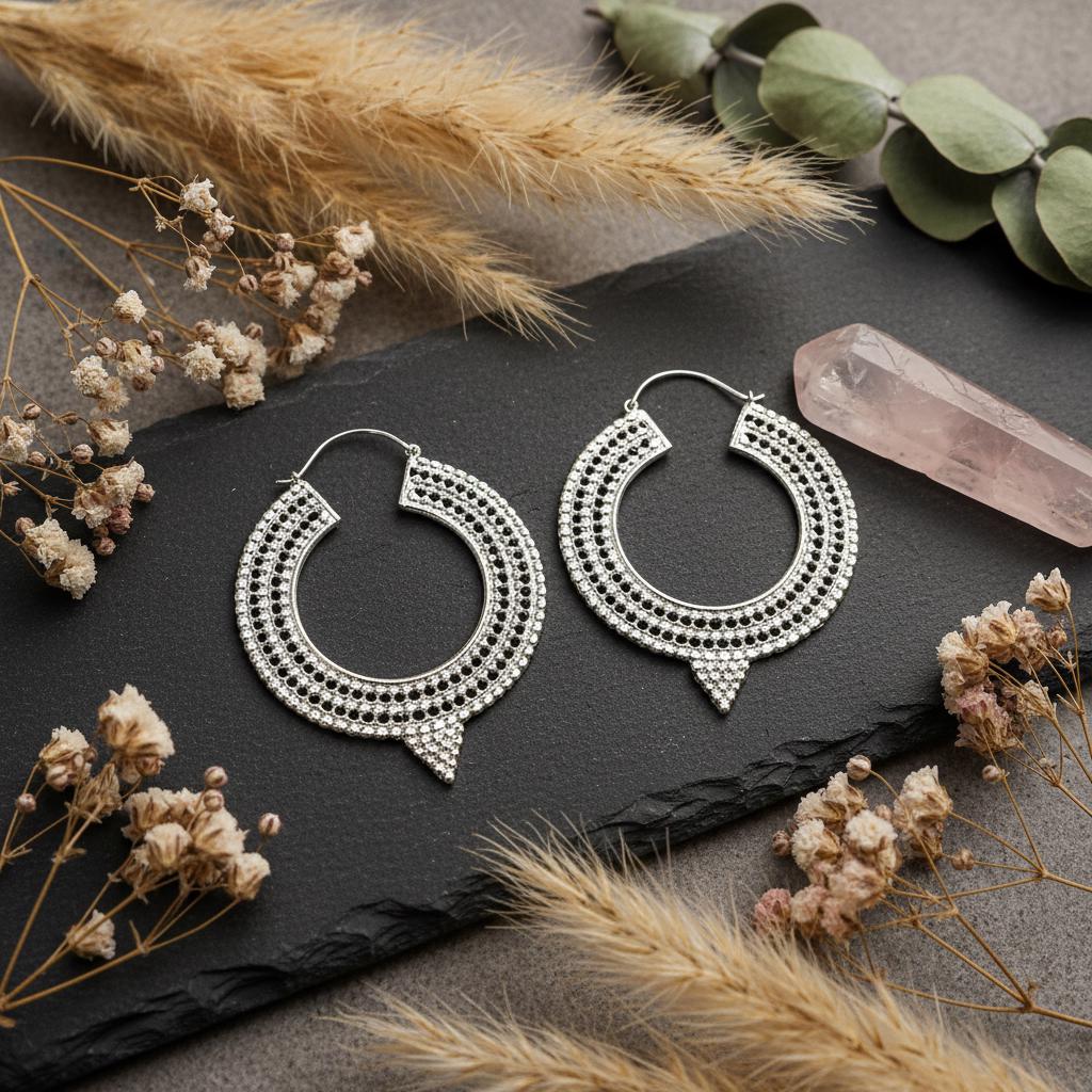 These textured crescent hoop earrings are a powerful statement piece inspired by boho, oriental, and ethnic tribal jewelry traditions. Designed with a bold crescent silhouette and rich surface detailing, they reflect an ancient, symbolic aesthetic rooted in handmade craftsmanship.