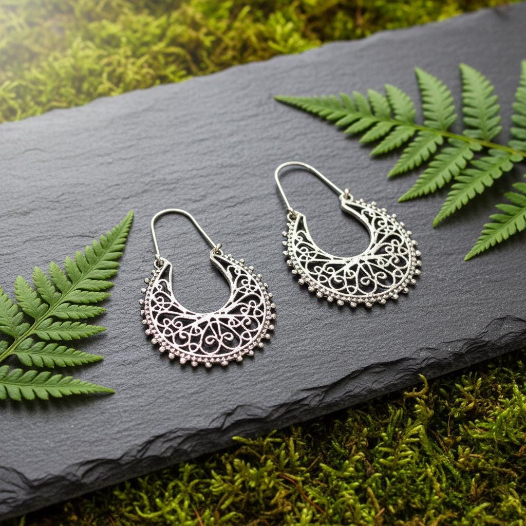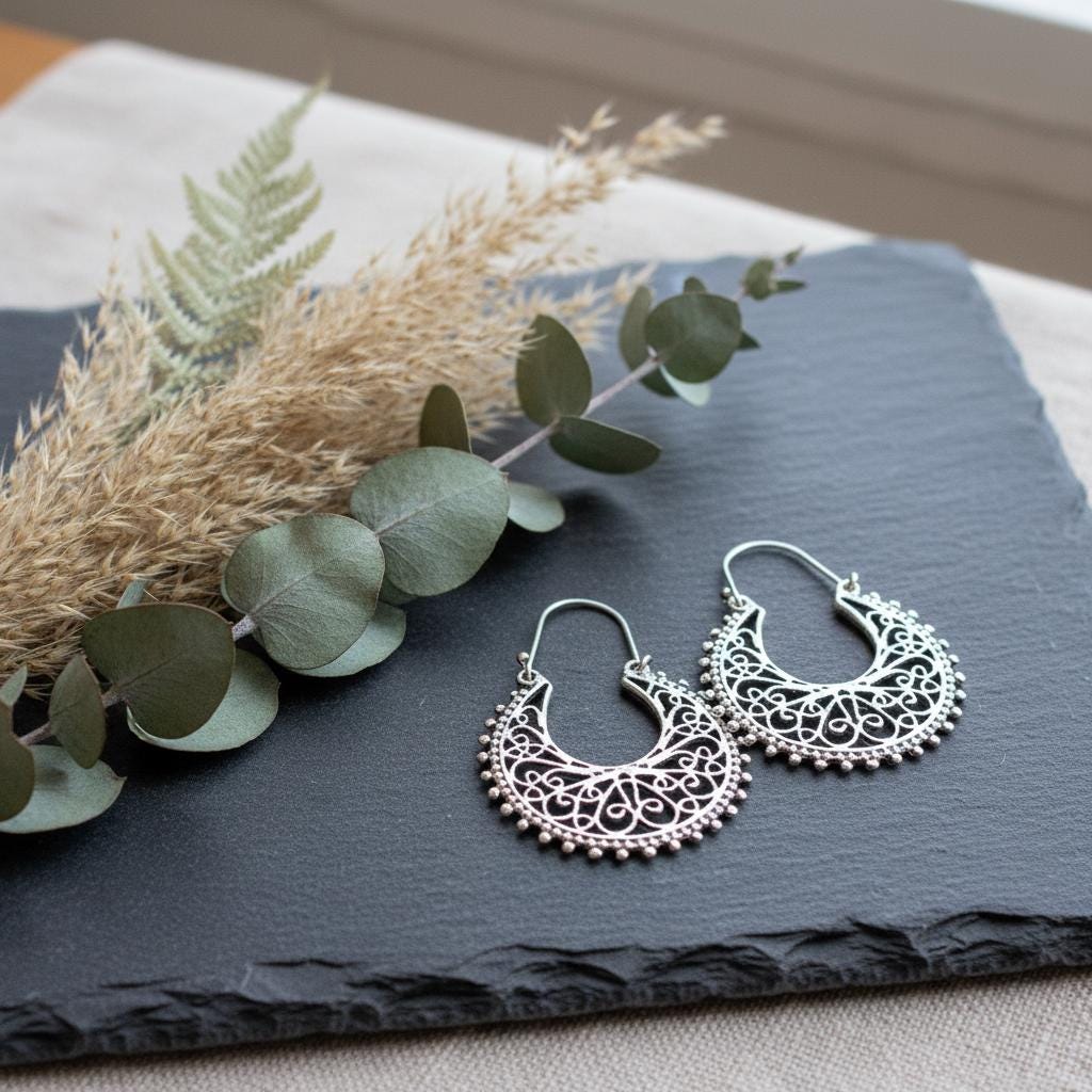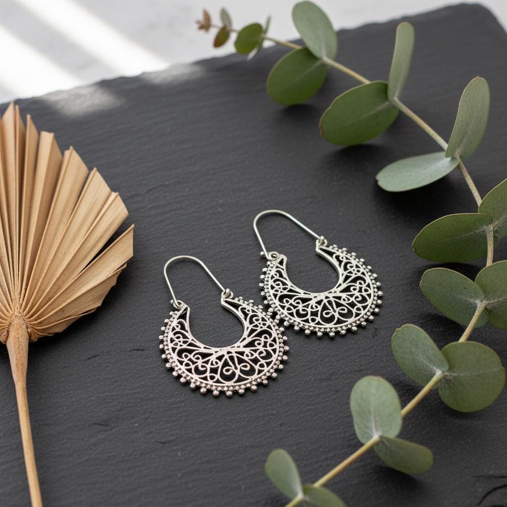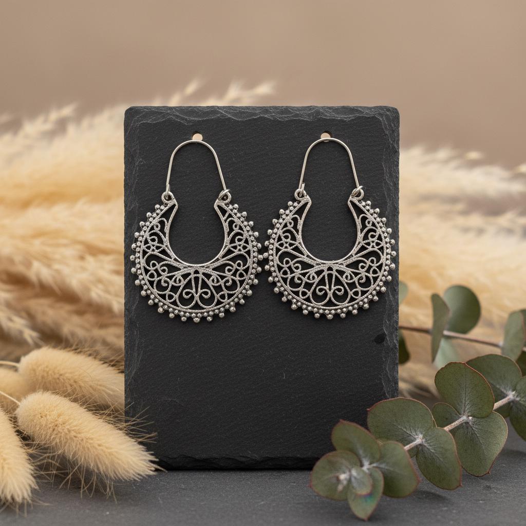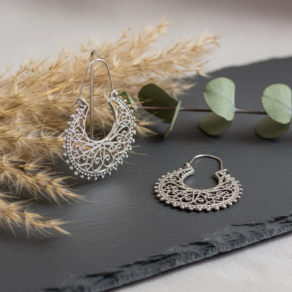 These stunning boho oriental filigree earrings are handcrafted from brass, featuring an intricate openwork mandala design inspired by ethnic, oriental, and vintage jewelry traditions. Their delicate lace-like pattern creates a bold yet elegant statement, perfect for lovers of bohemian and artisanal jewelry.