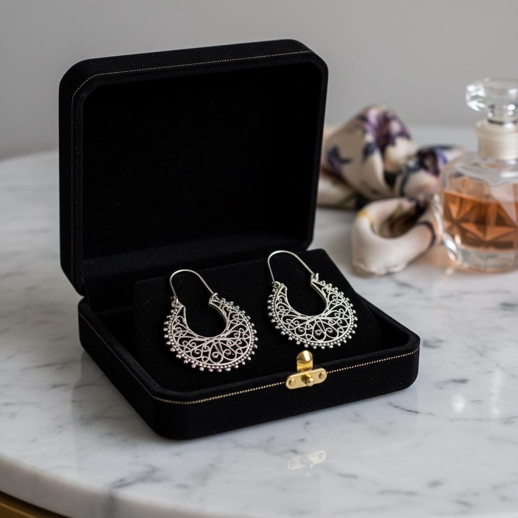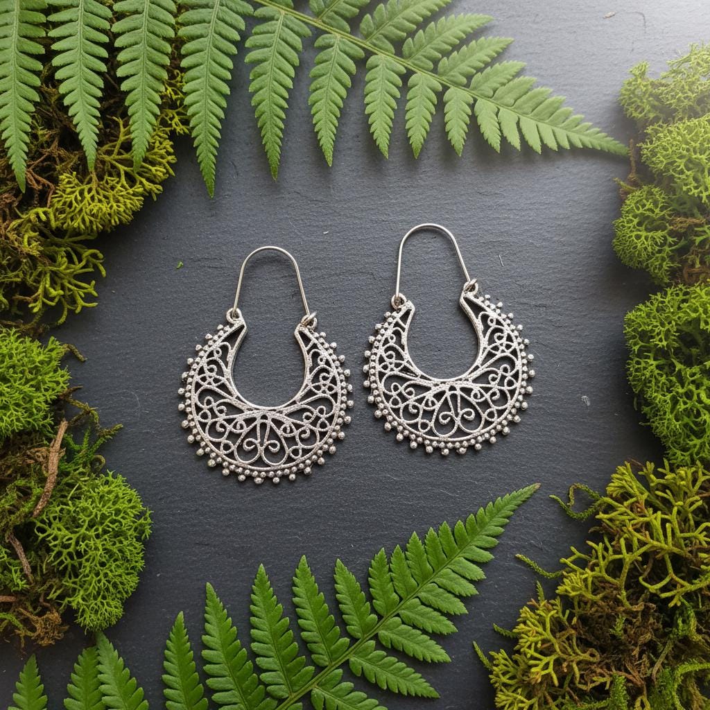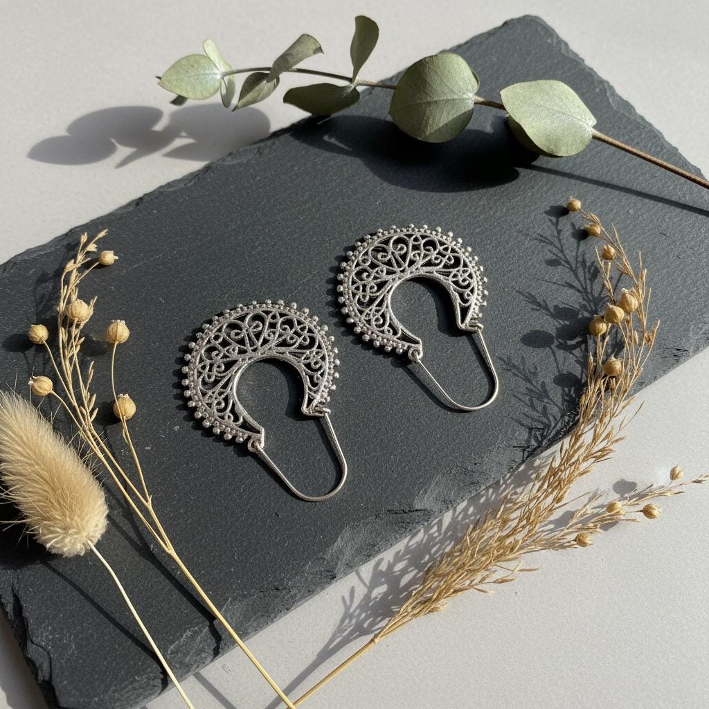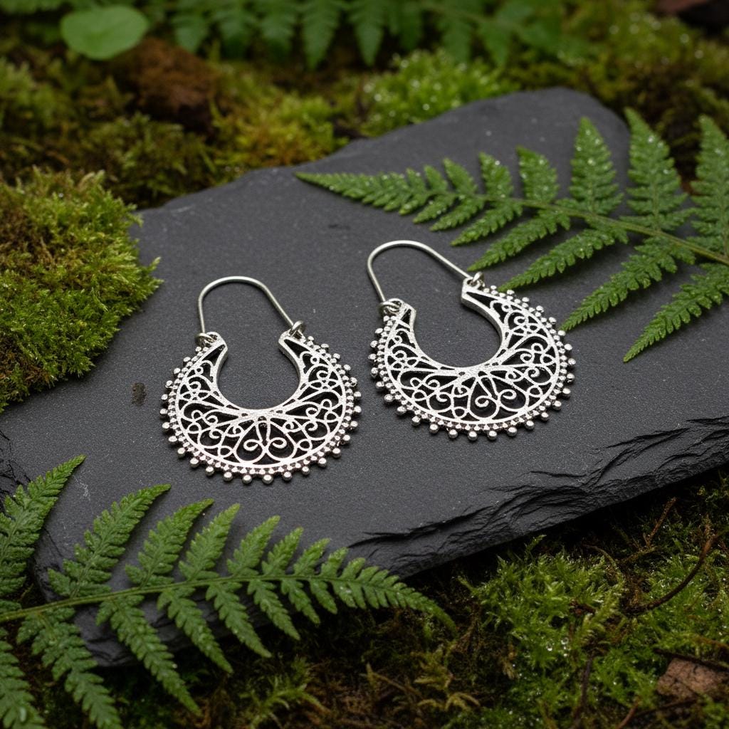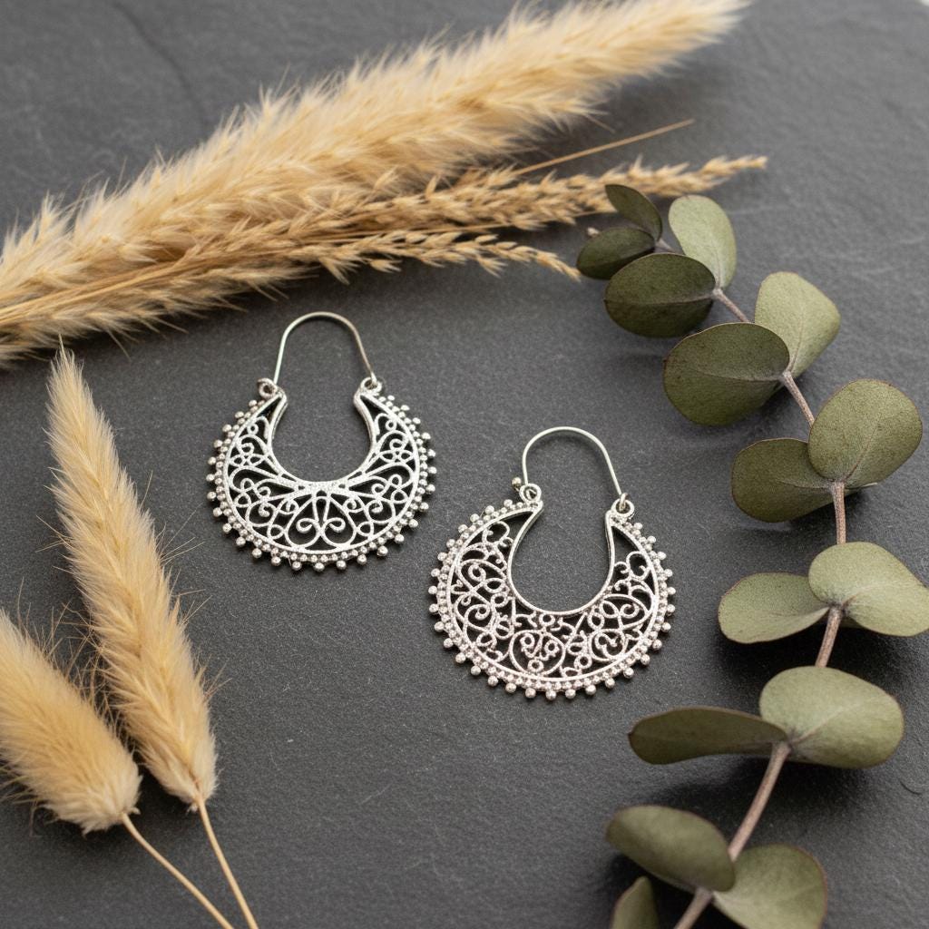 These stunning boho oriental filigree earrings are handcrafted from brass, featuring an intricate openwork mandala design inspired by ethnic, oriental, and vintage jewelry traditions. Their delicate lace-like pattern creates a bold yet elegant statement, perfect for lovers of bohemian and artisanal jewelry.