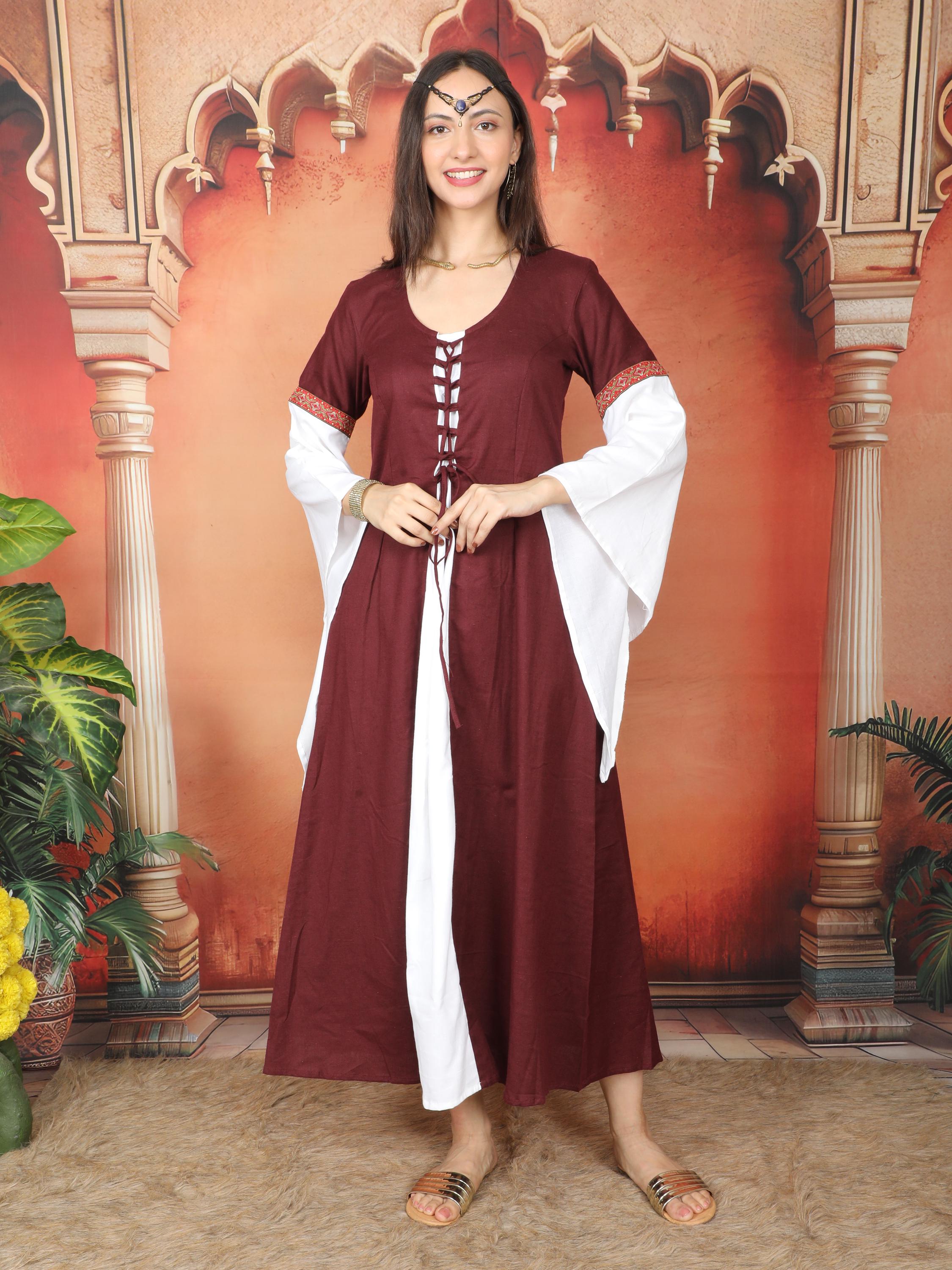 Step back in time with this breathtaking burgundy and white long medieval dress.