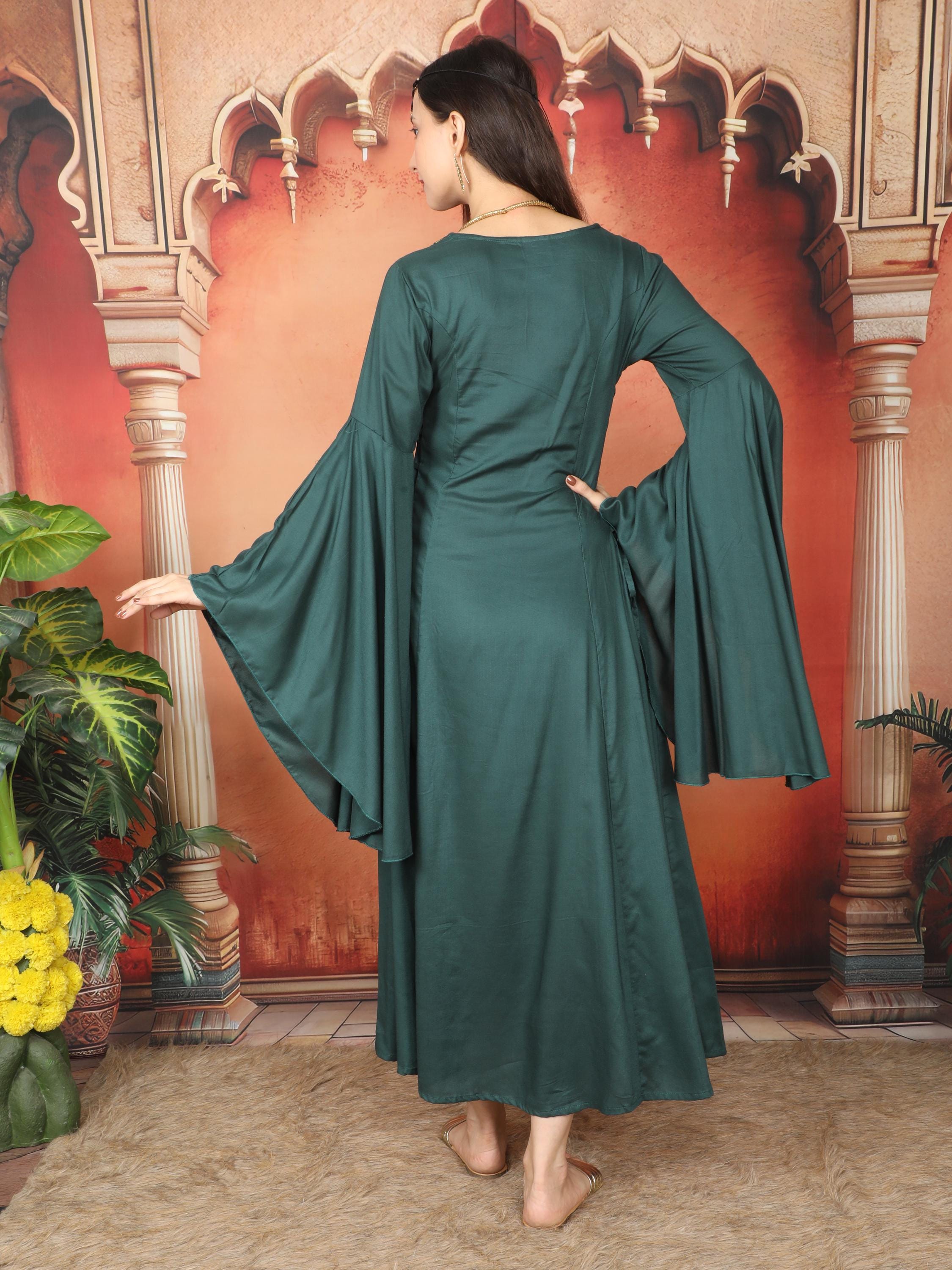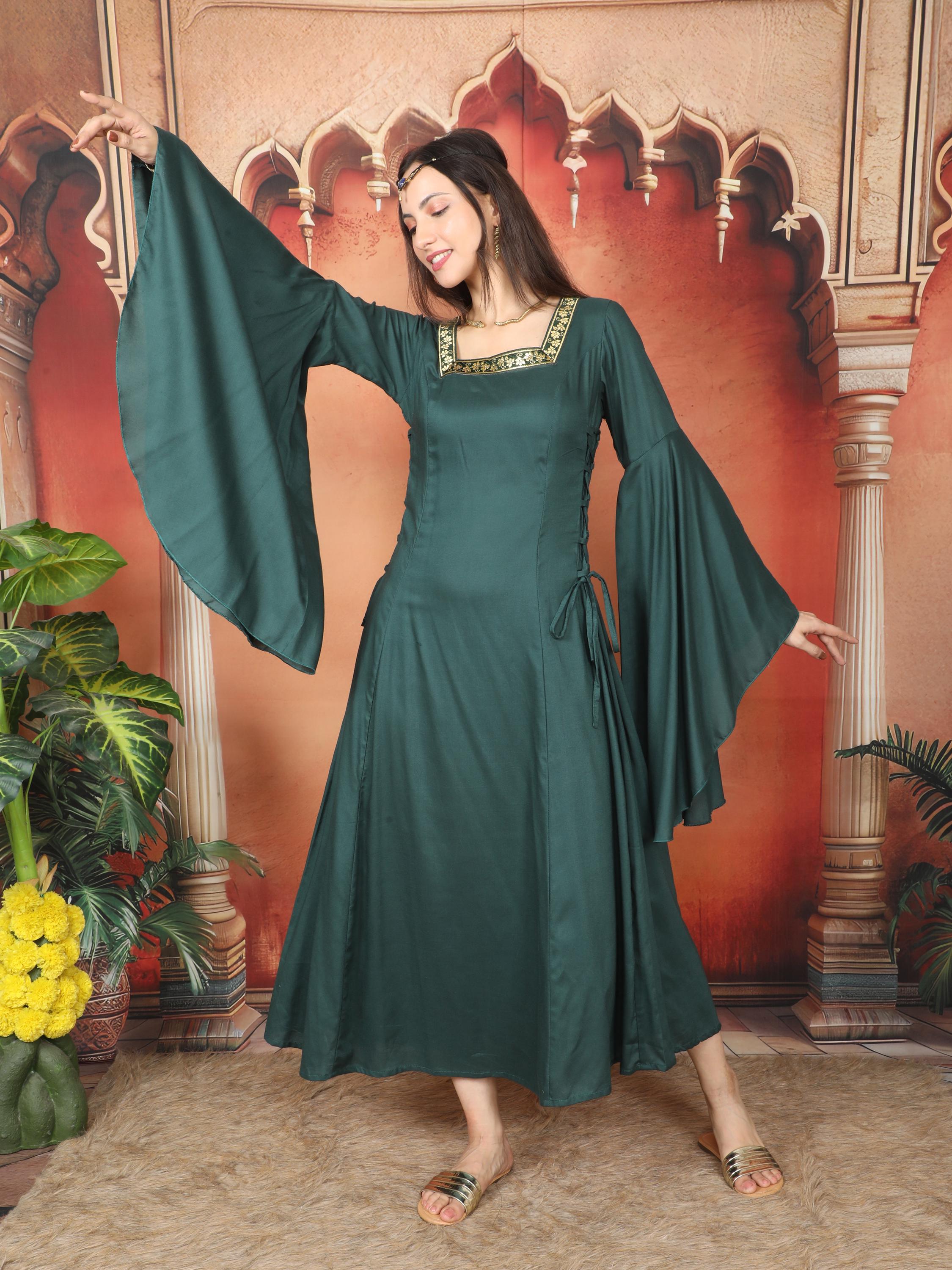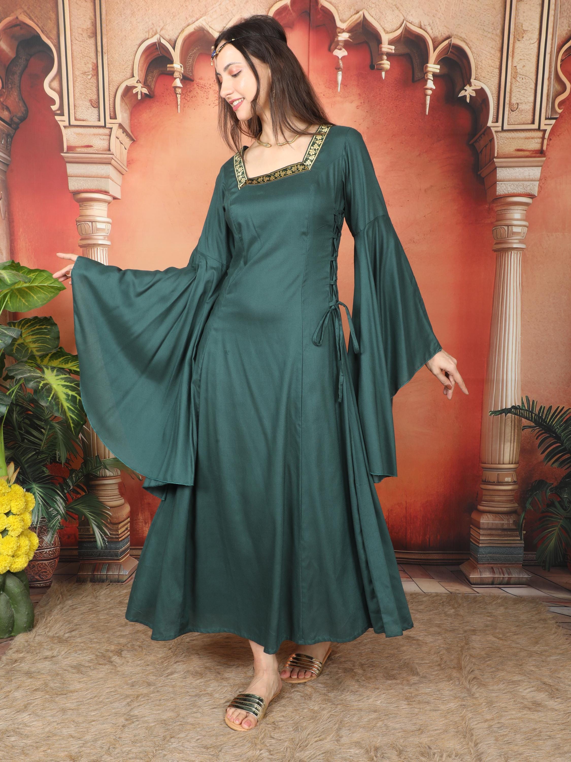 Envelop yourself in the rich allure of our bottle green long medieval gown.