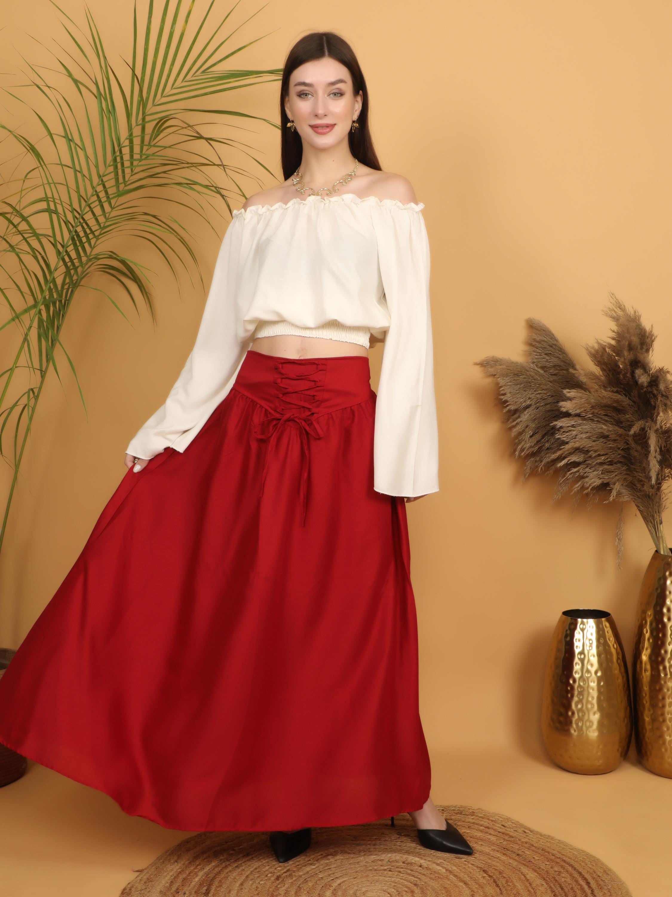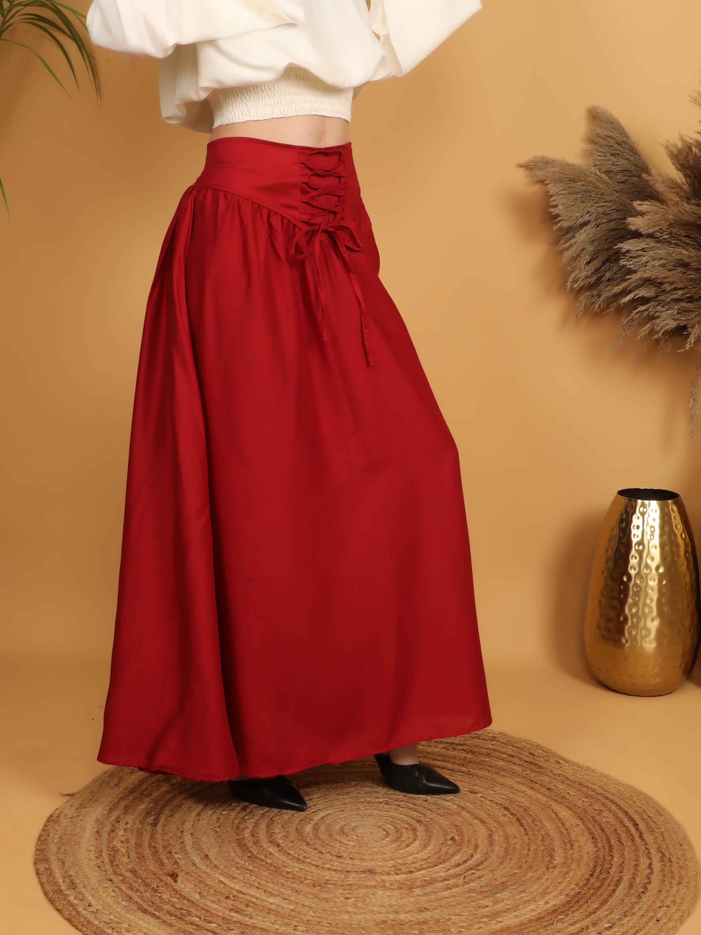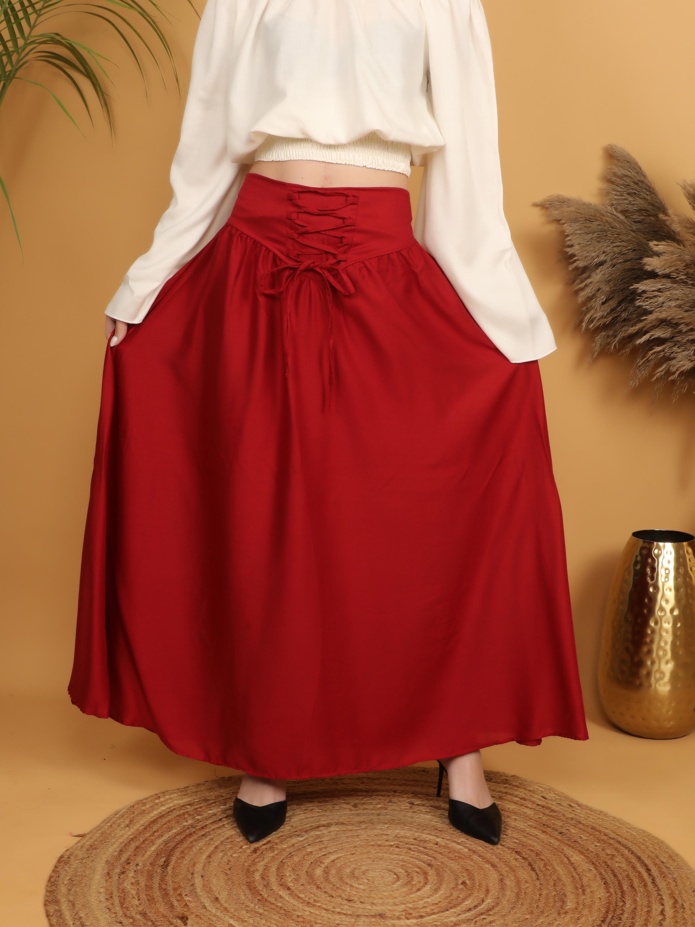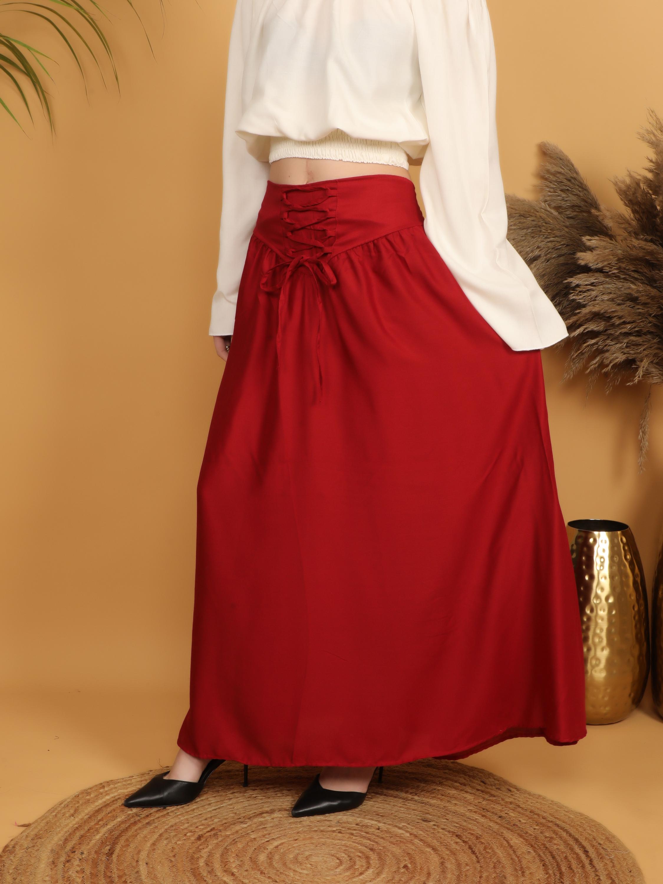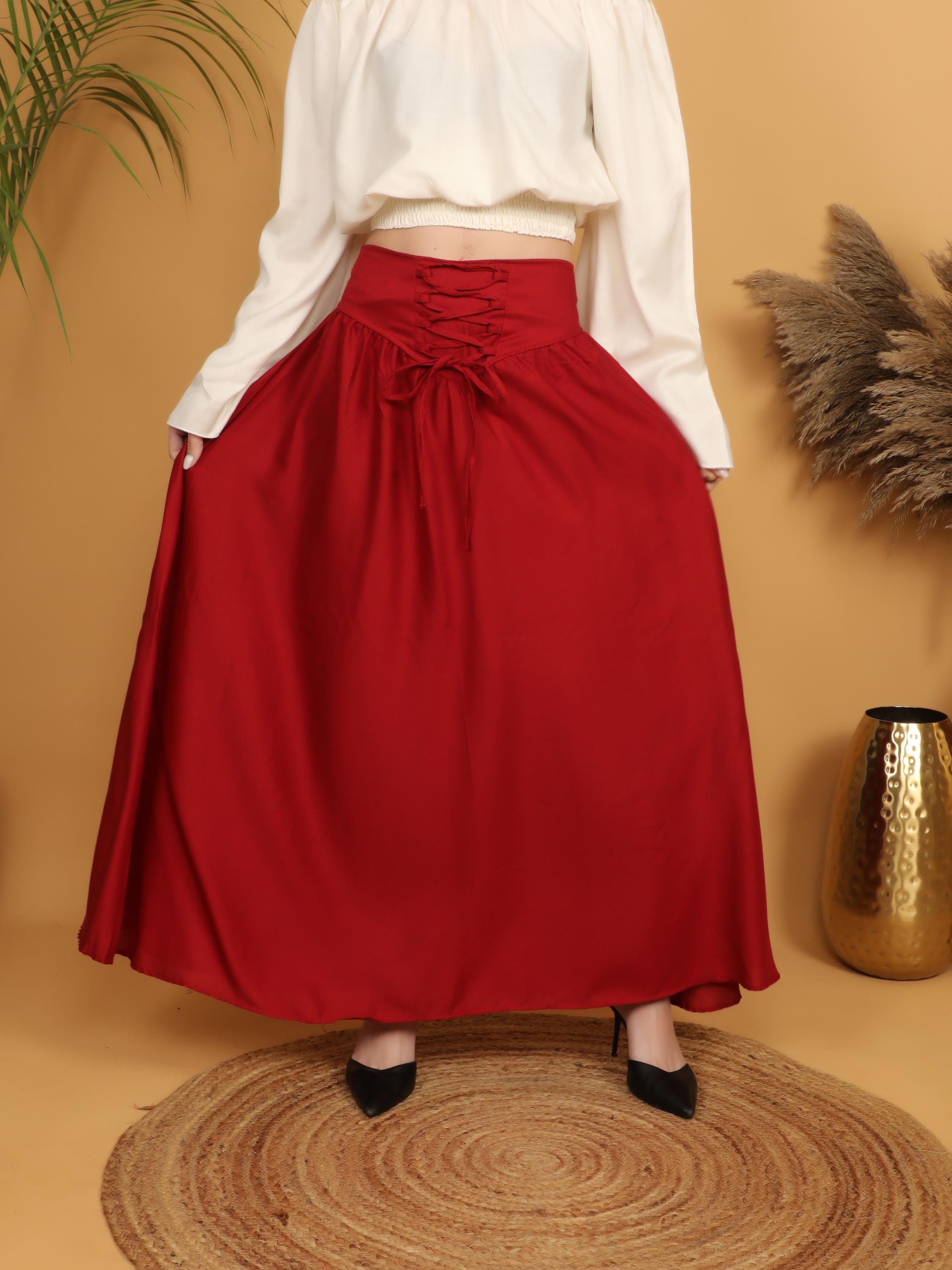 The rich wine hue evokes a sense of royalty and sophistication. Complete with a stylish laced corset belt, this skirt create a flattering figure.