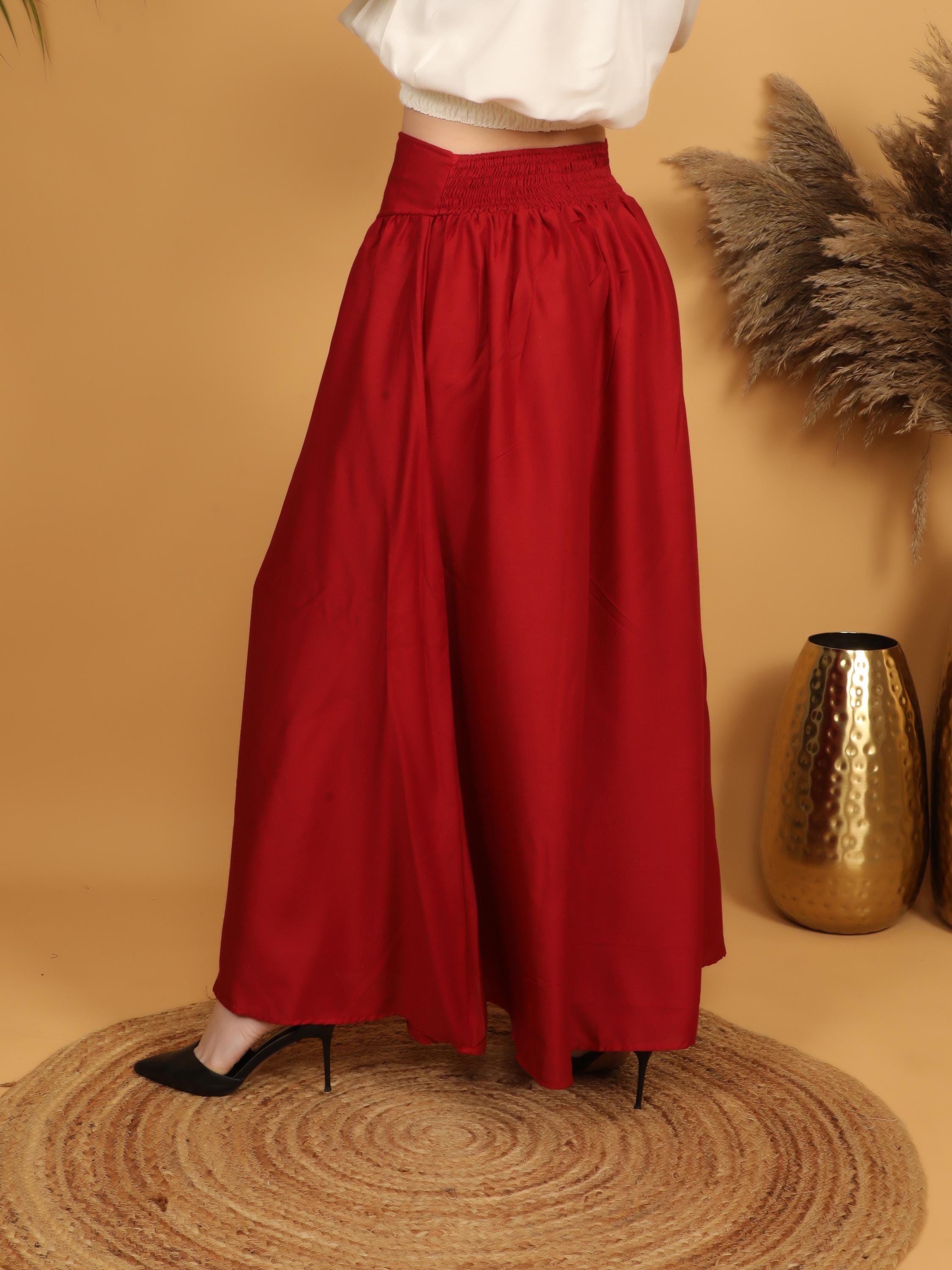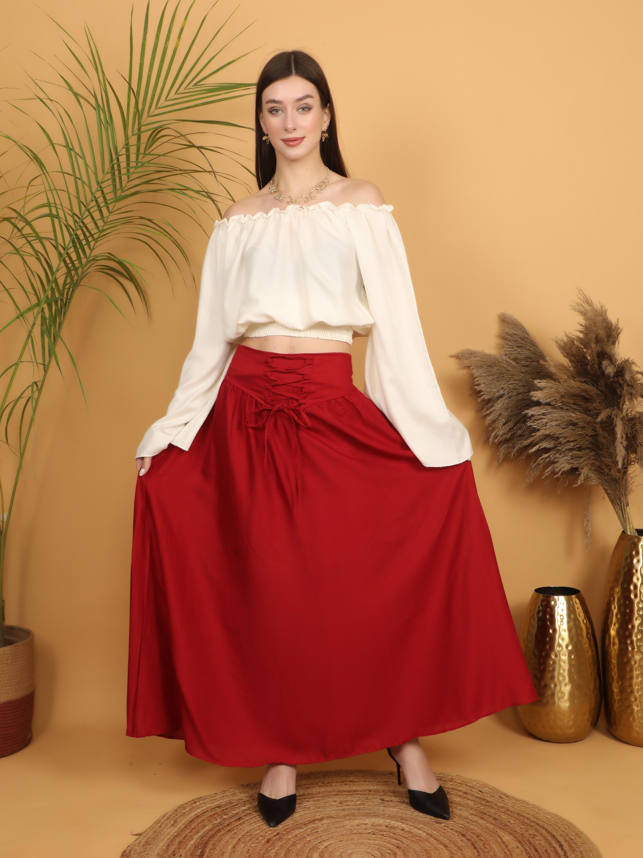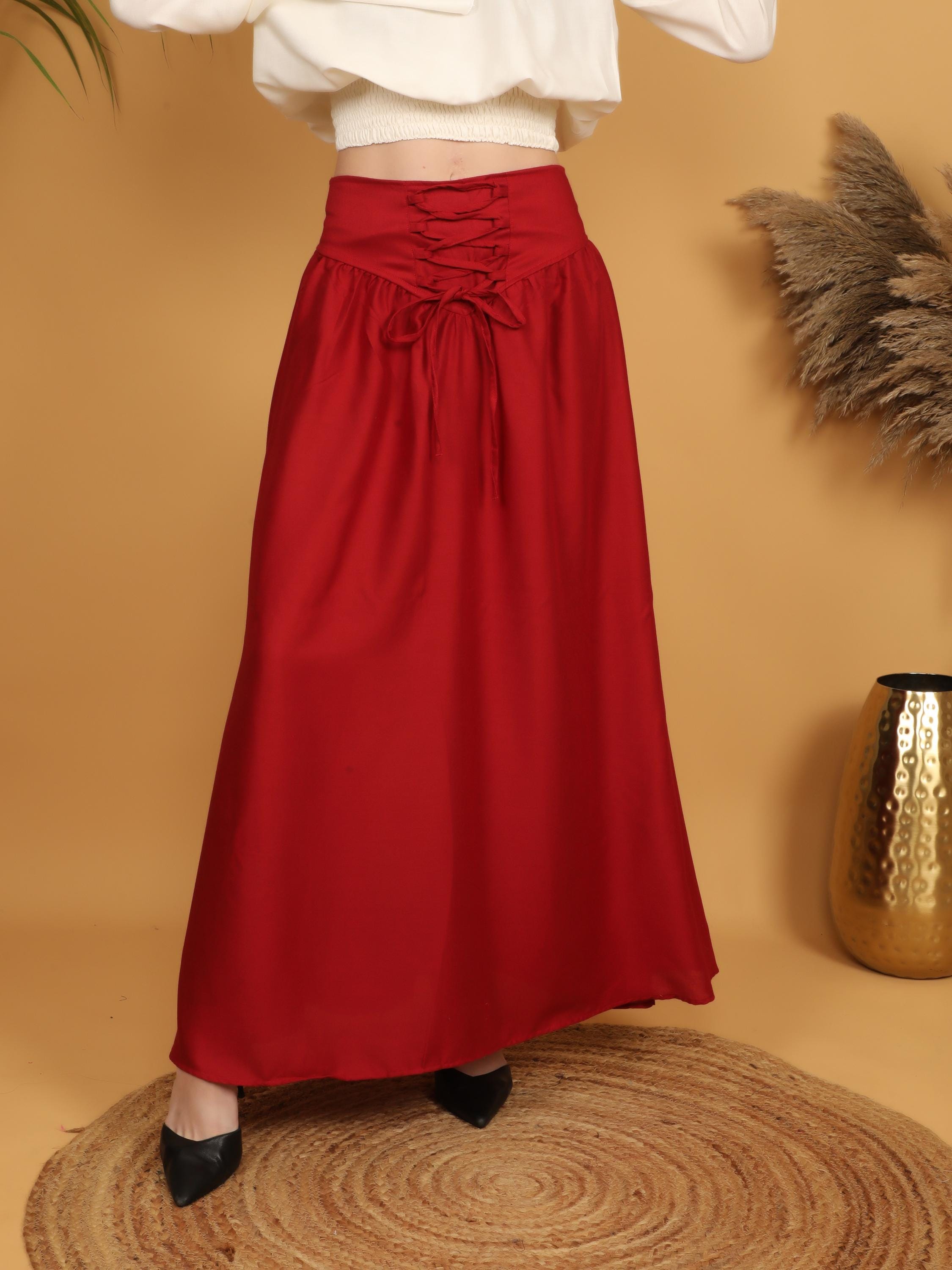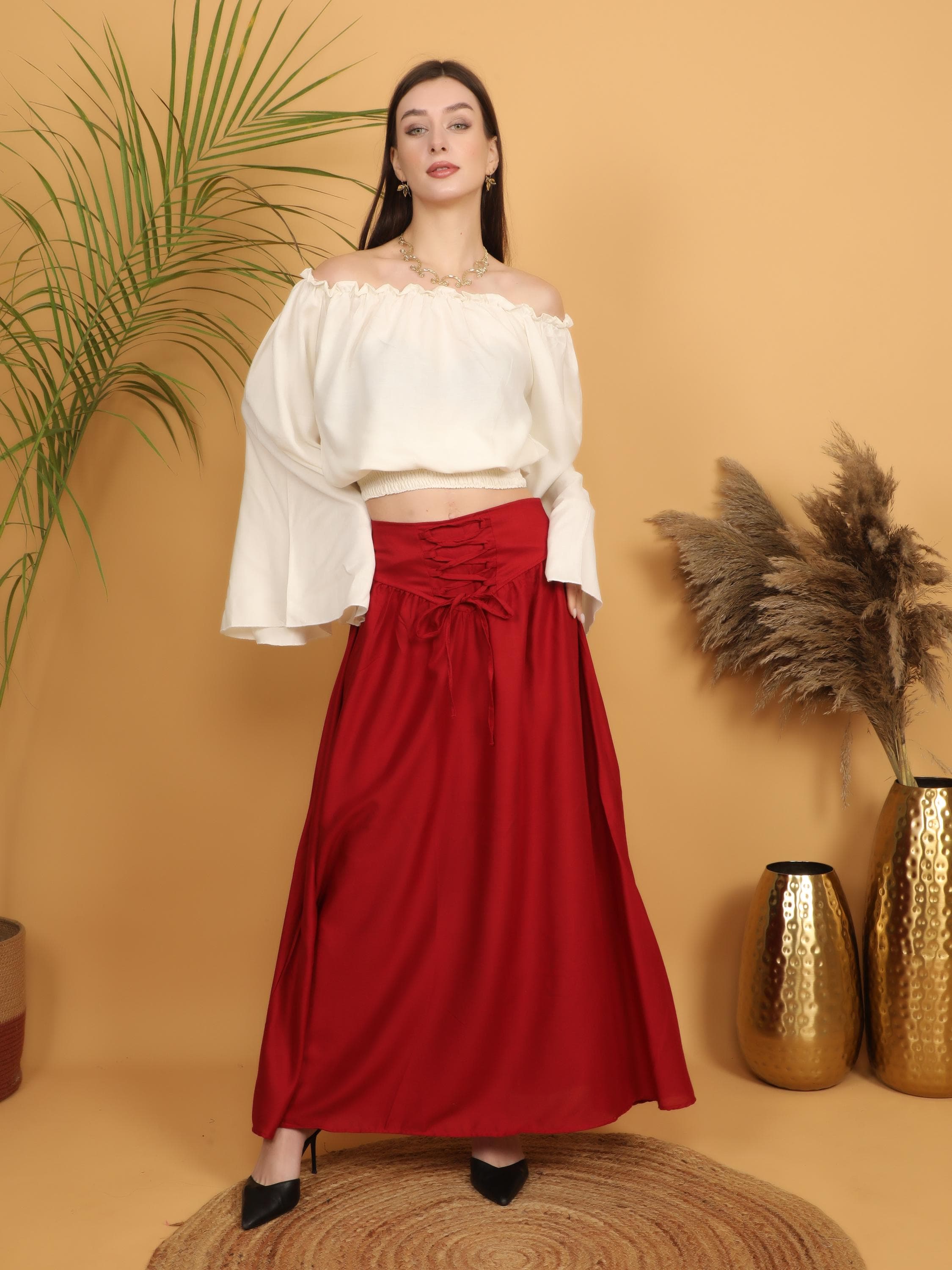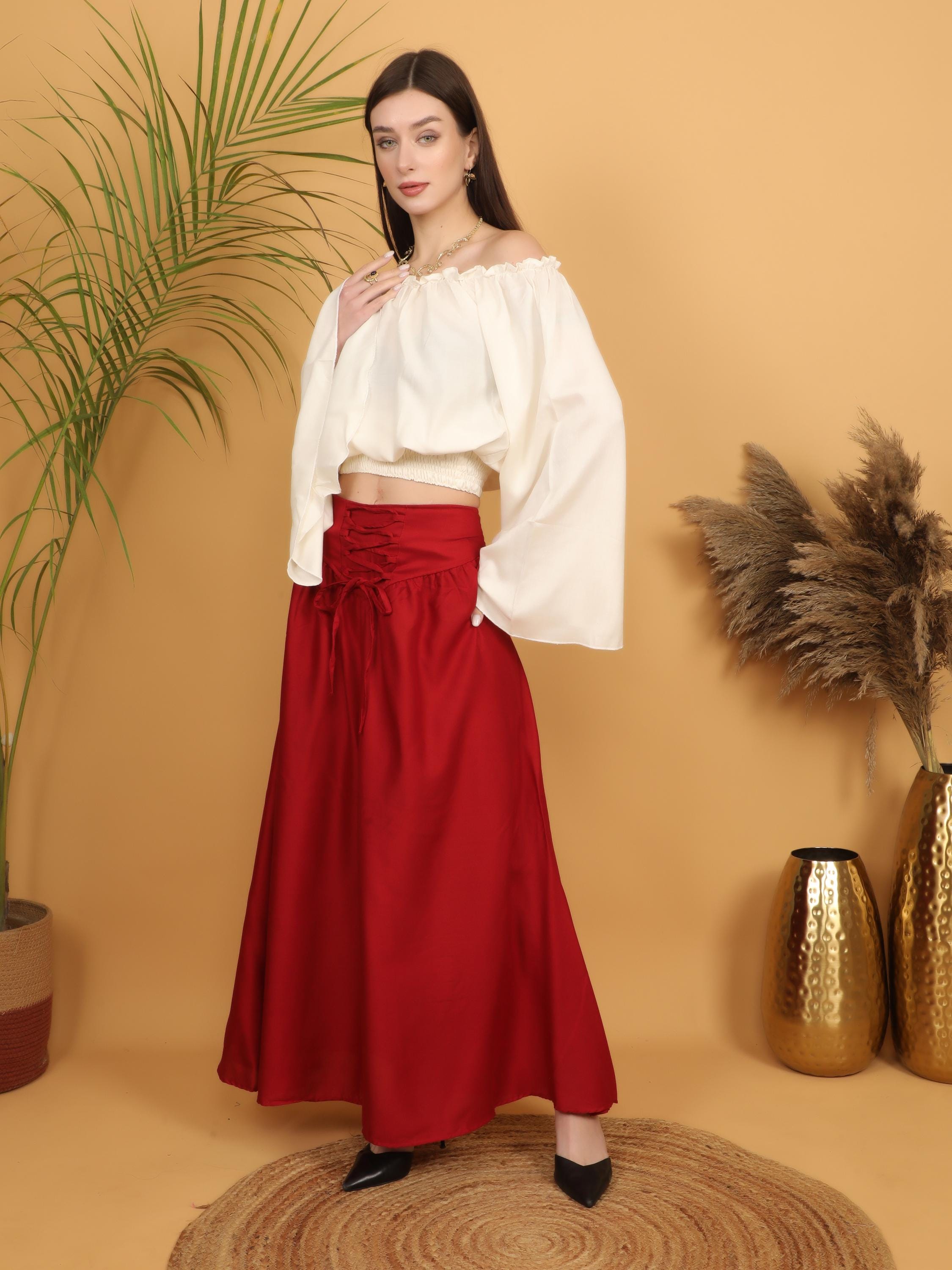 The rich wine hue evokes a sense of royalty and sophistication. Complete with a stylish laced corset belt, this skirt create a flattering figure.