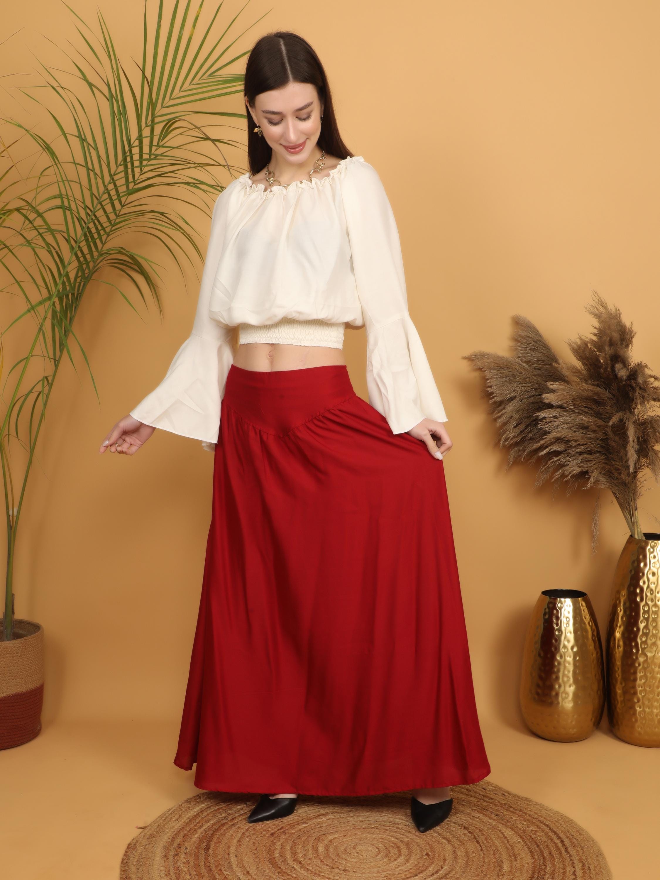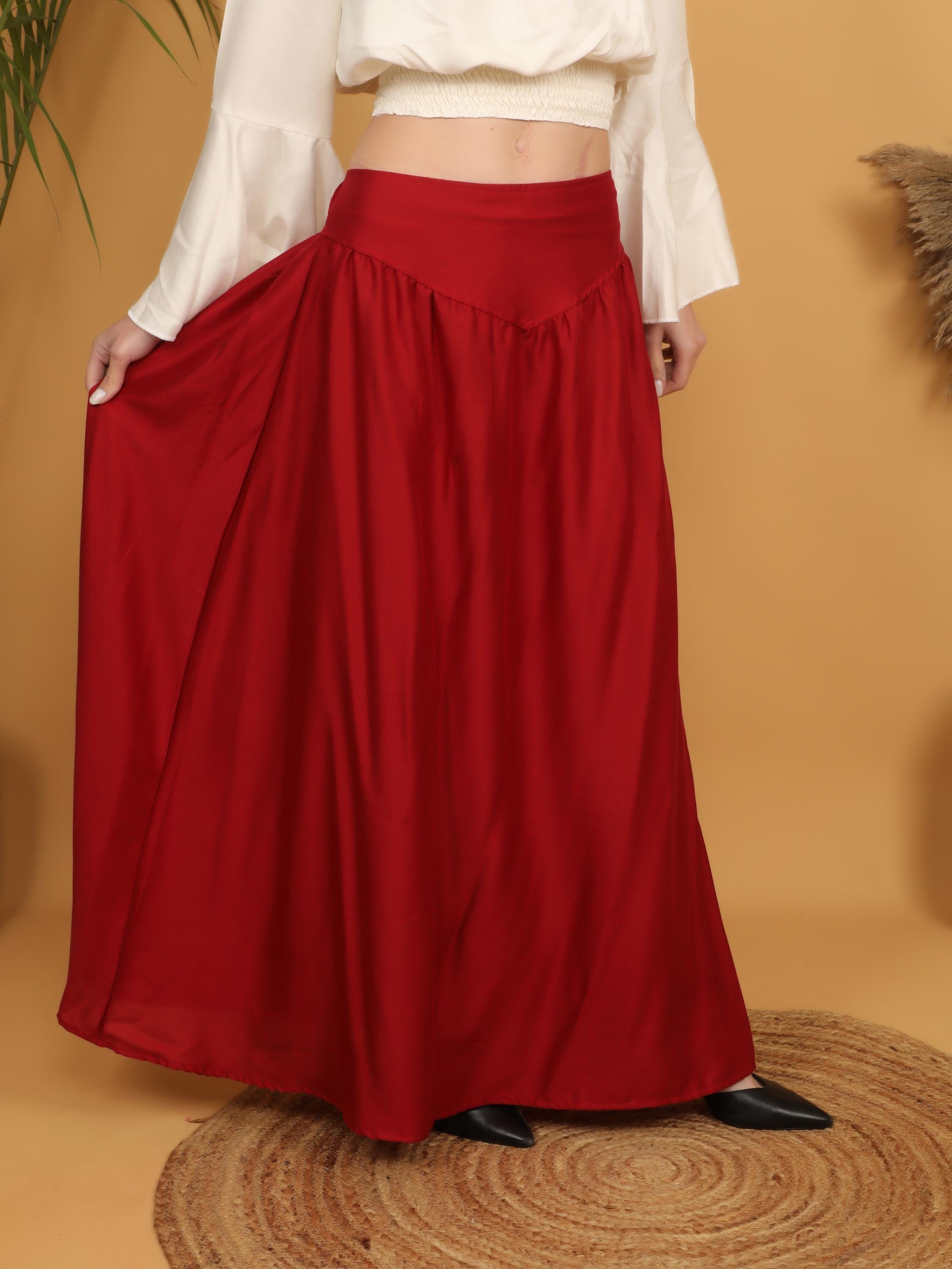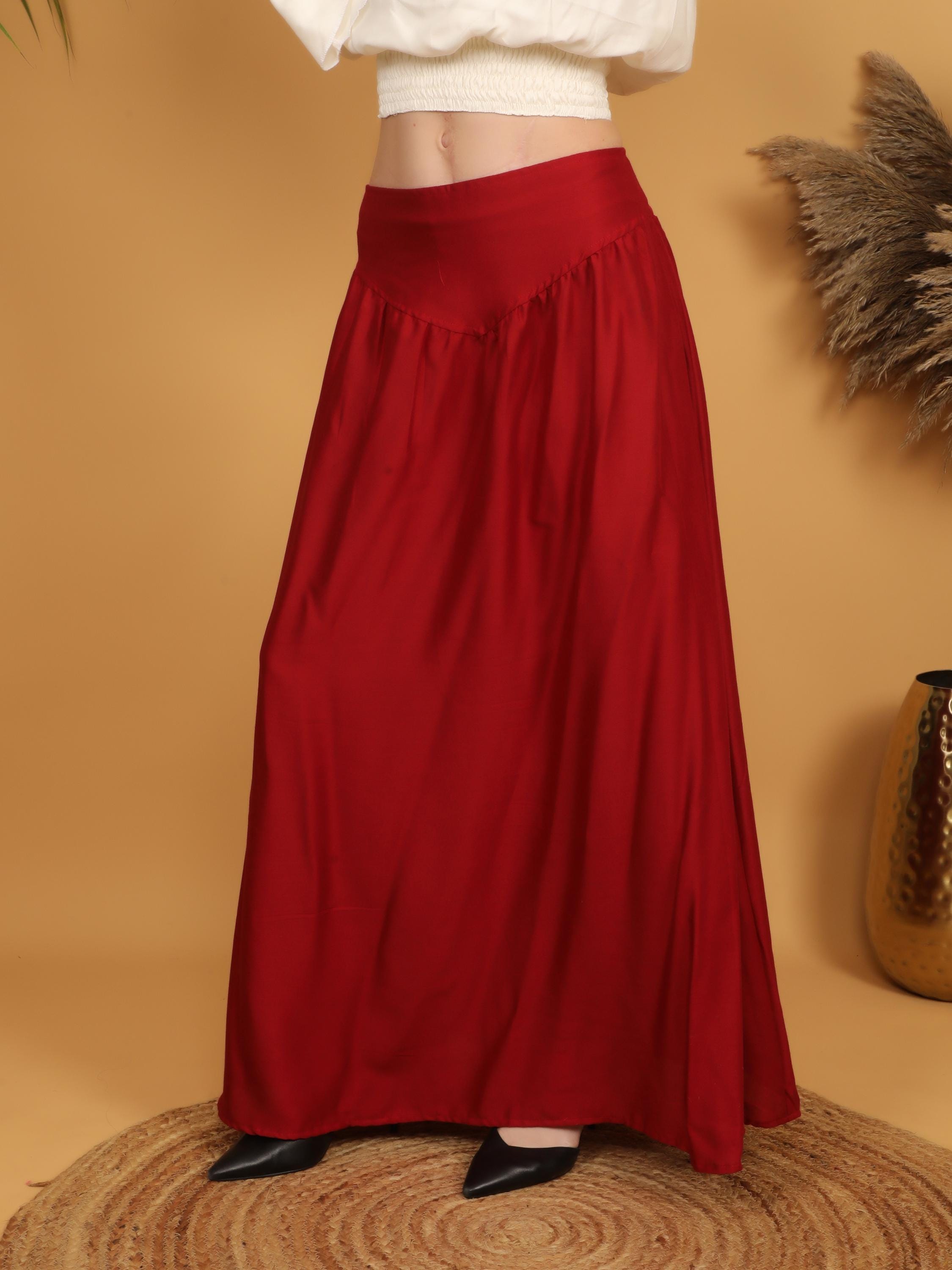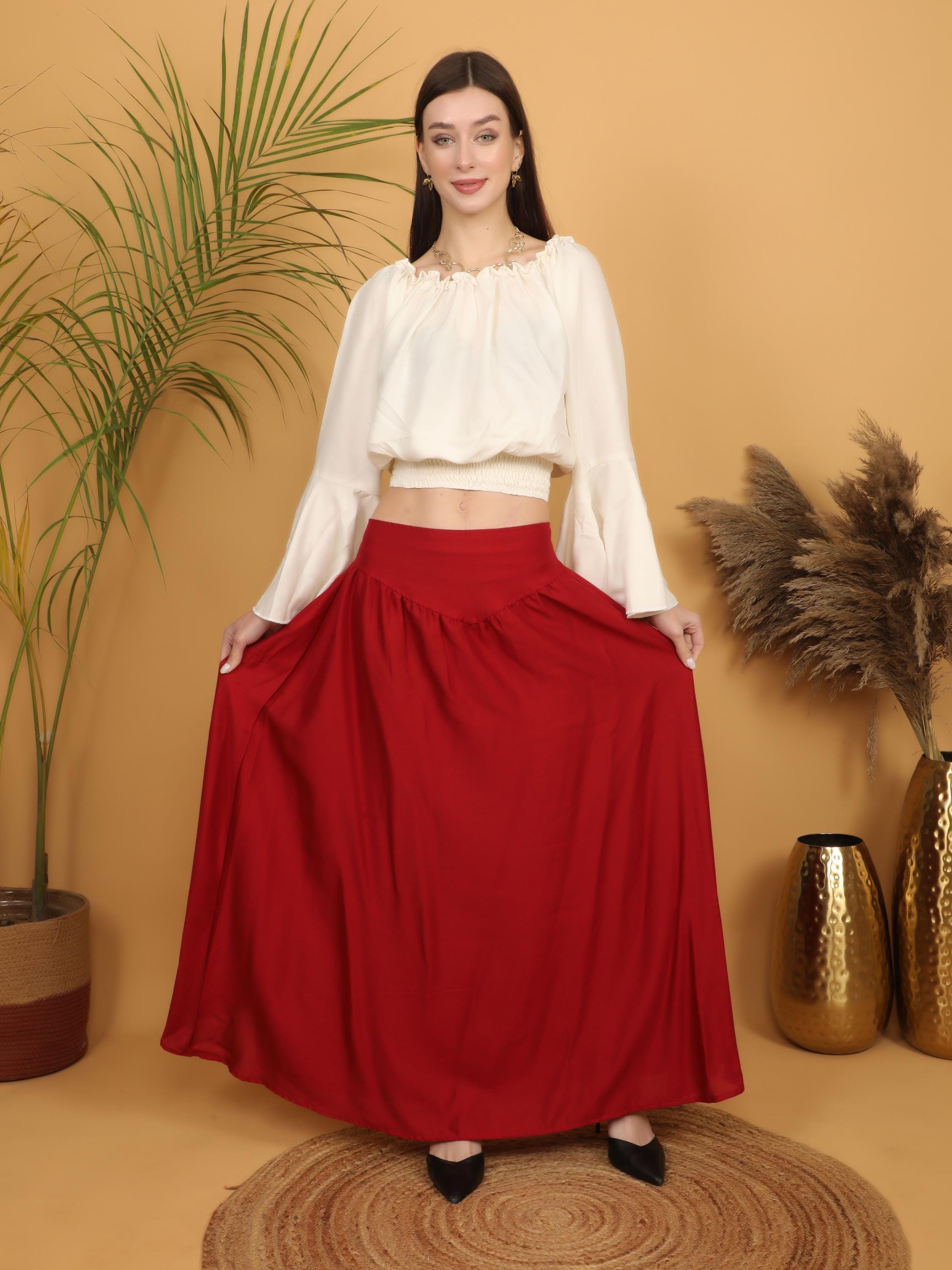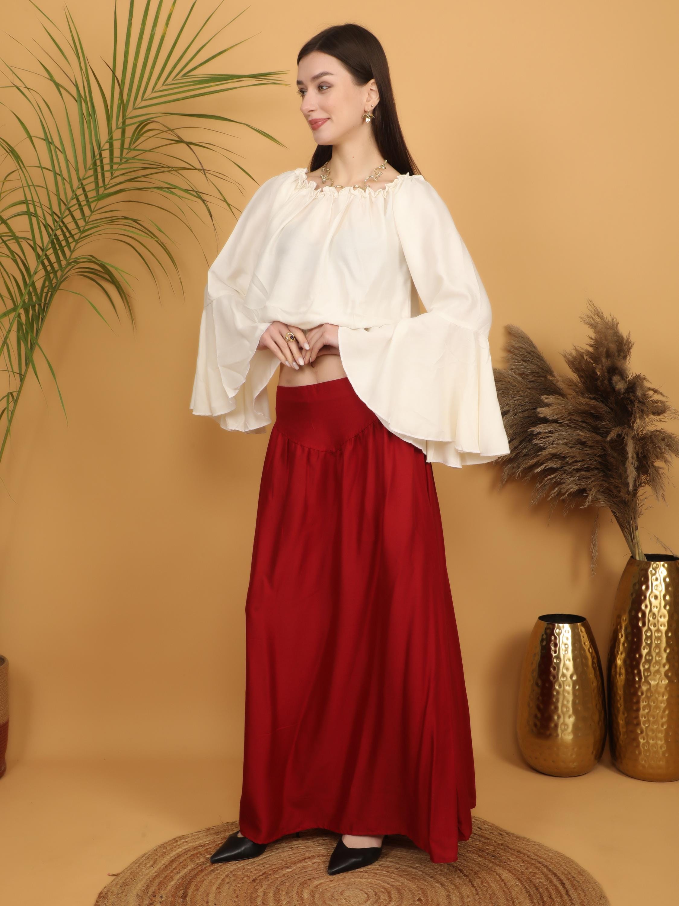 Step into a world of timeless elegance with our viscose long flowing medieval plain wine skirt.