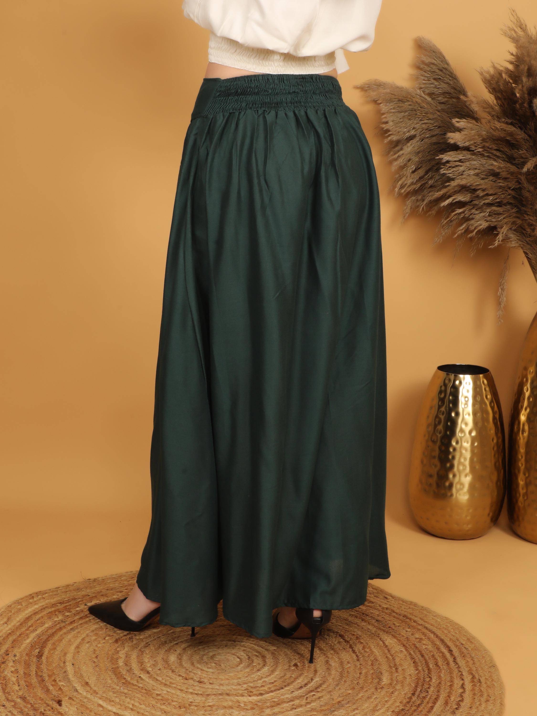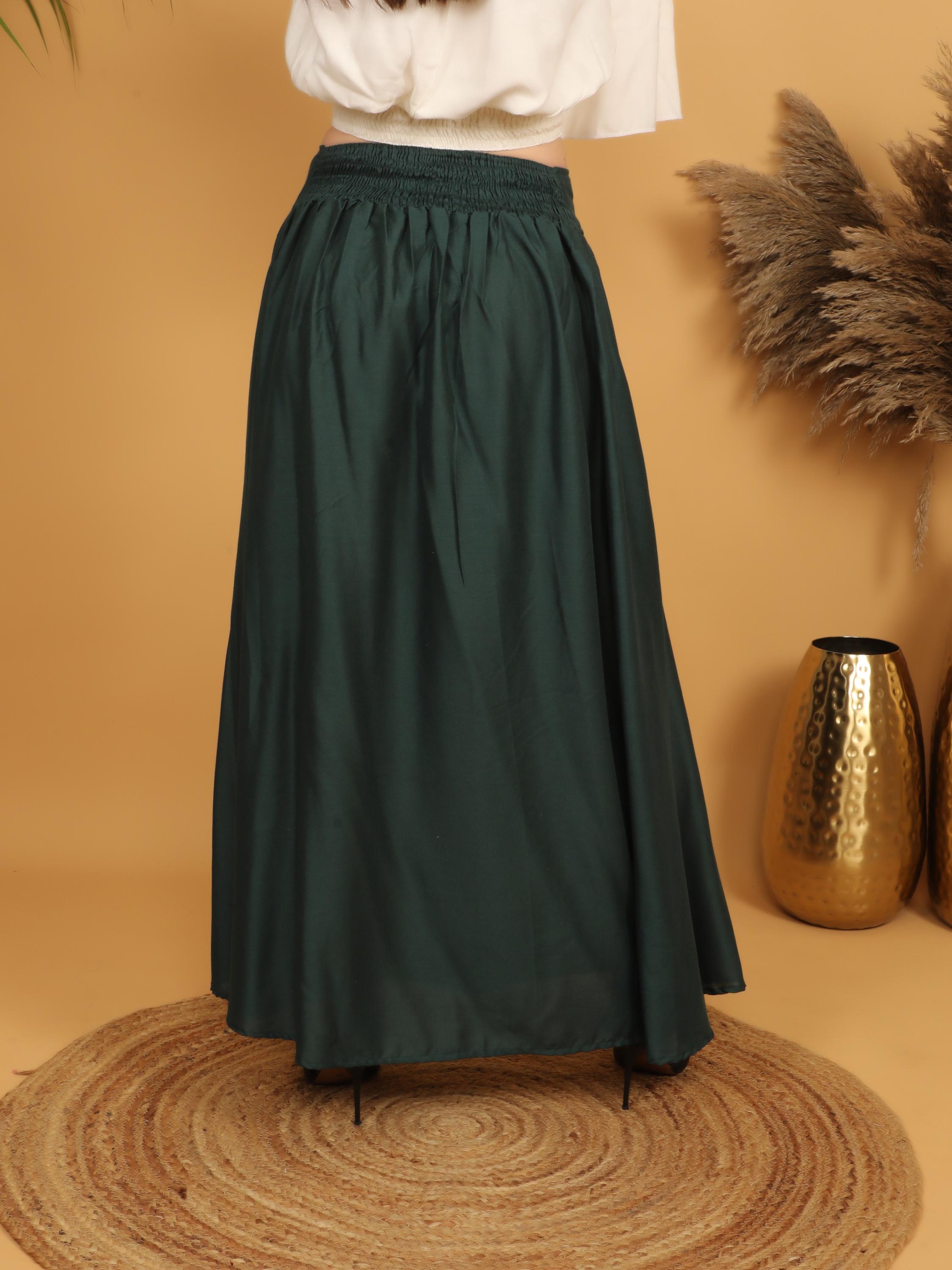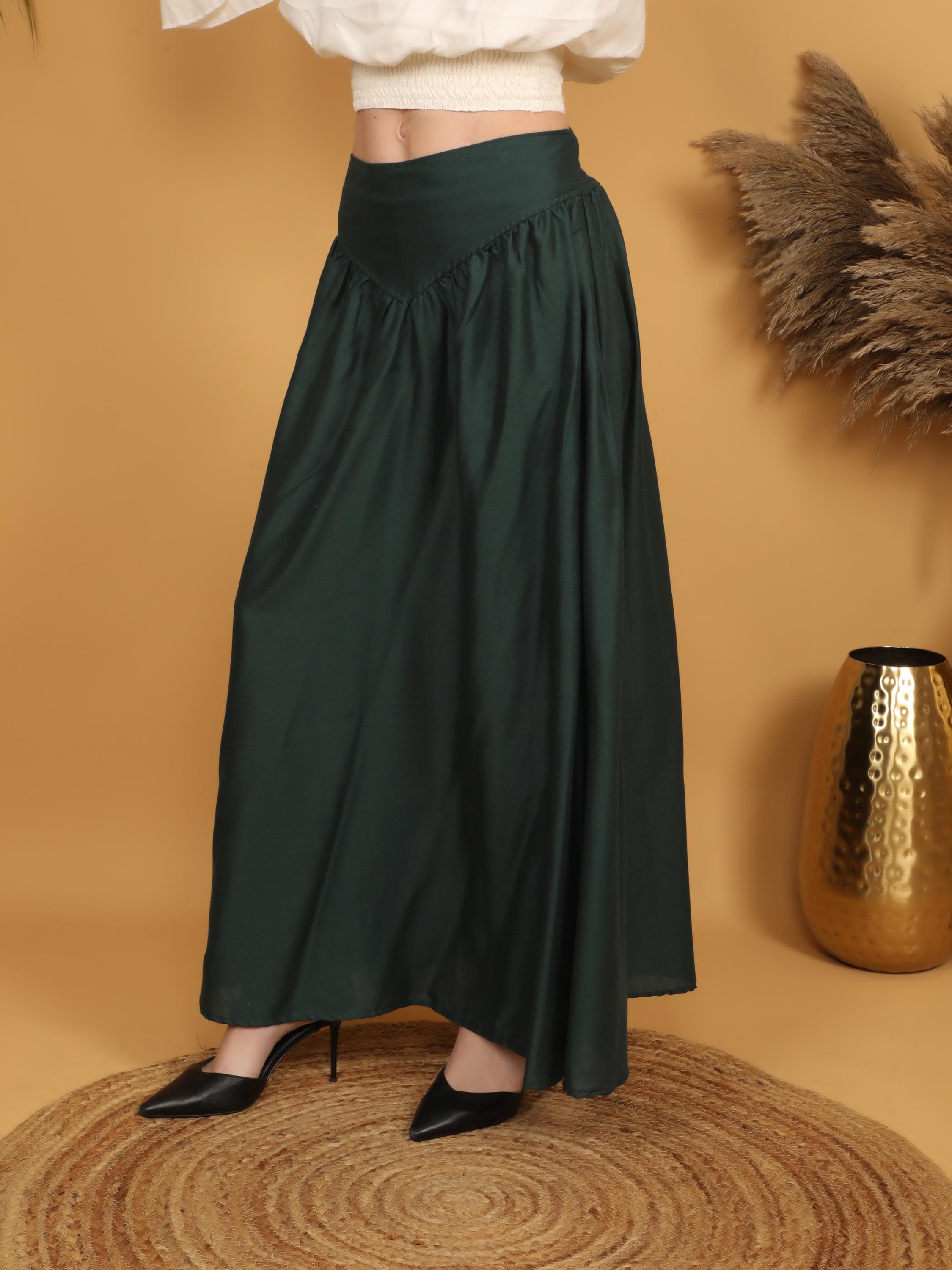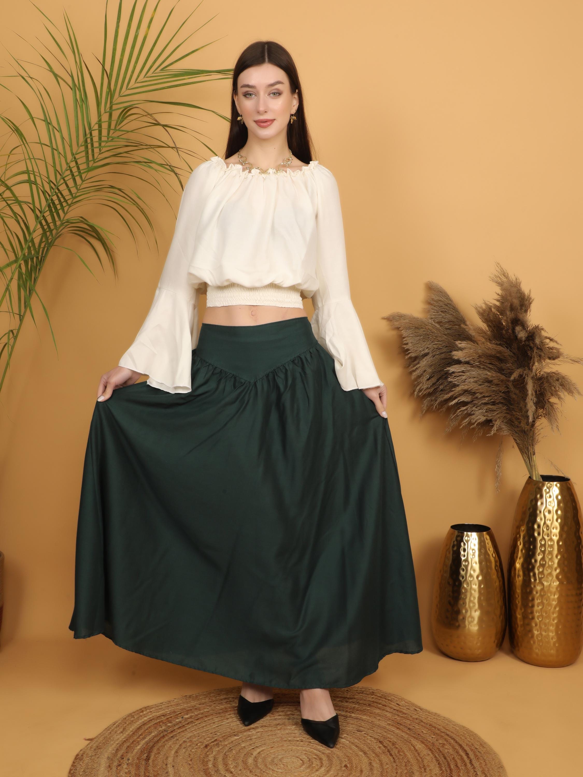 Step into a world of timeless elegance with our viscose long flowing medieval plain bottle green skirt.