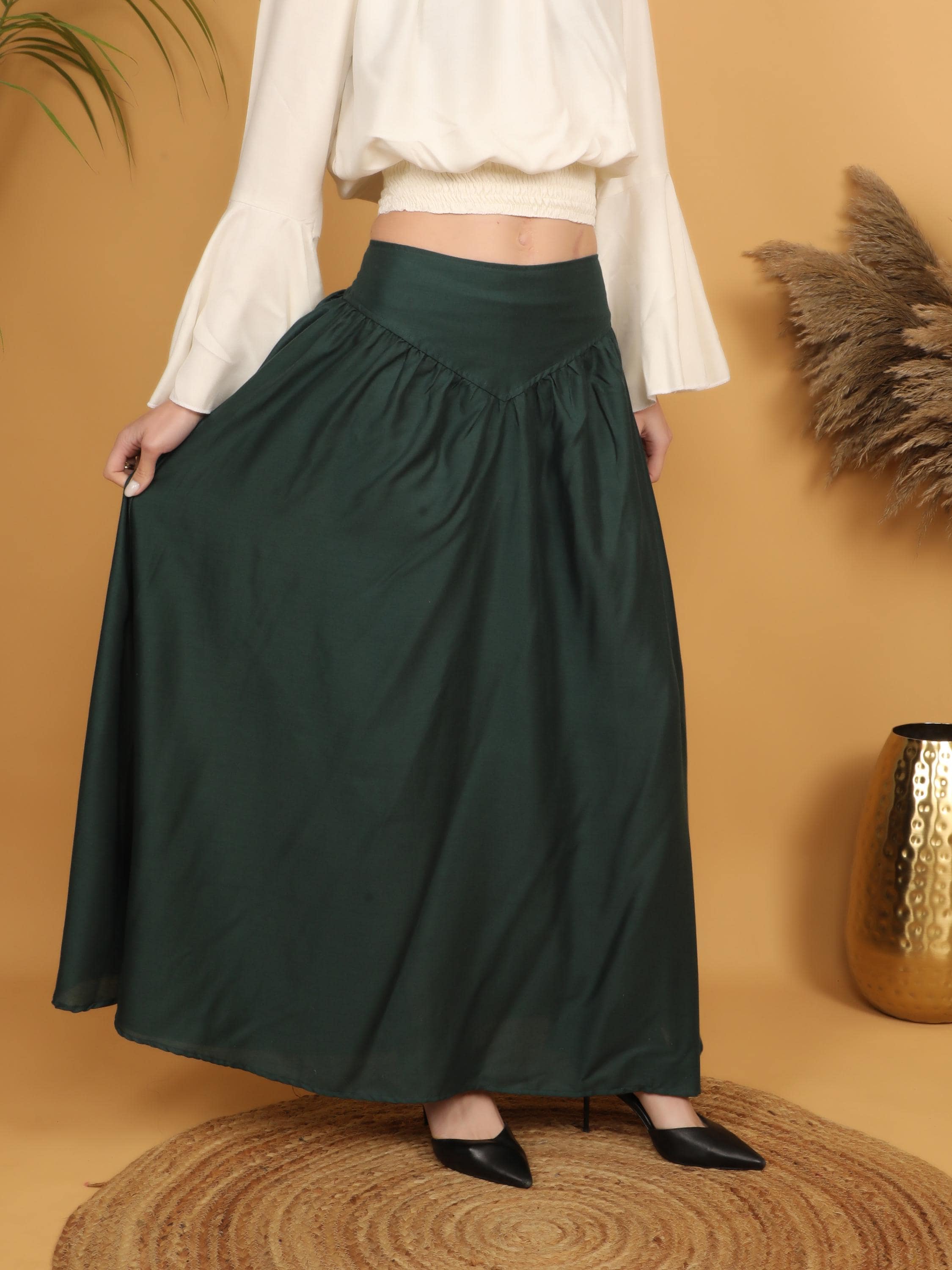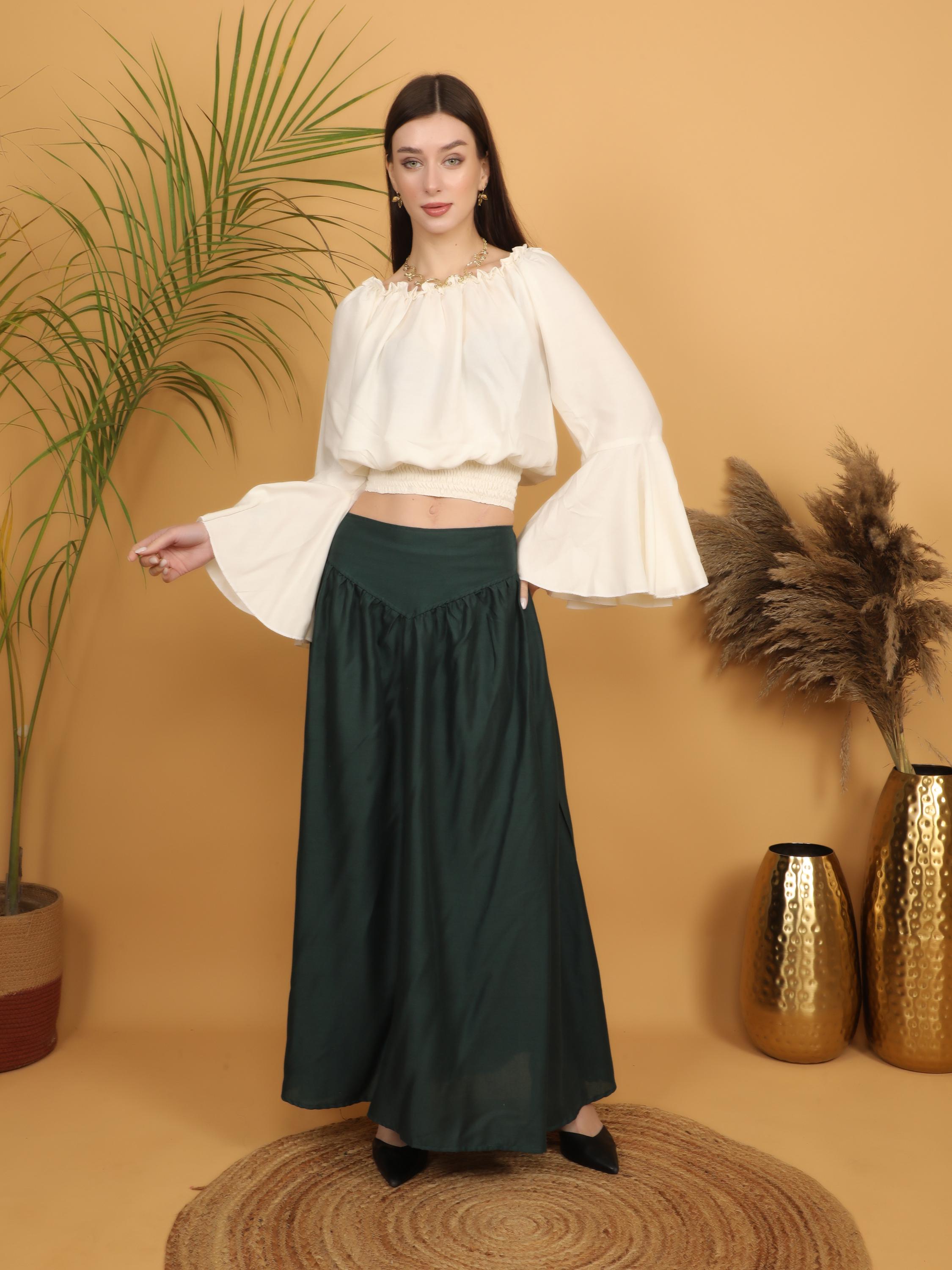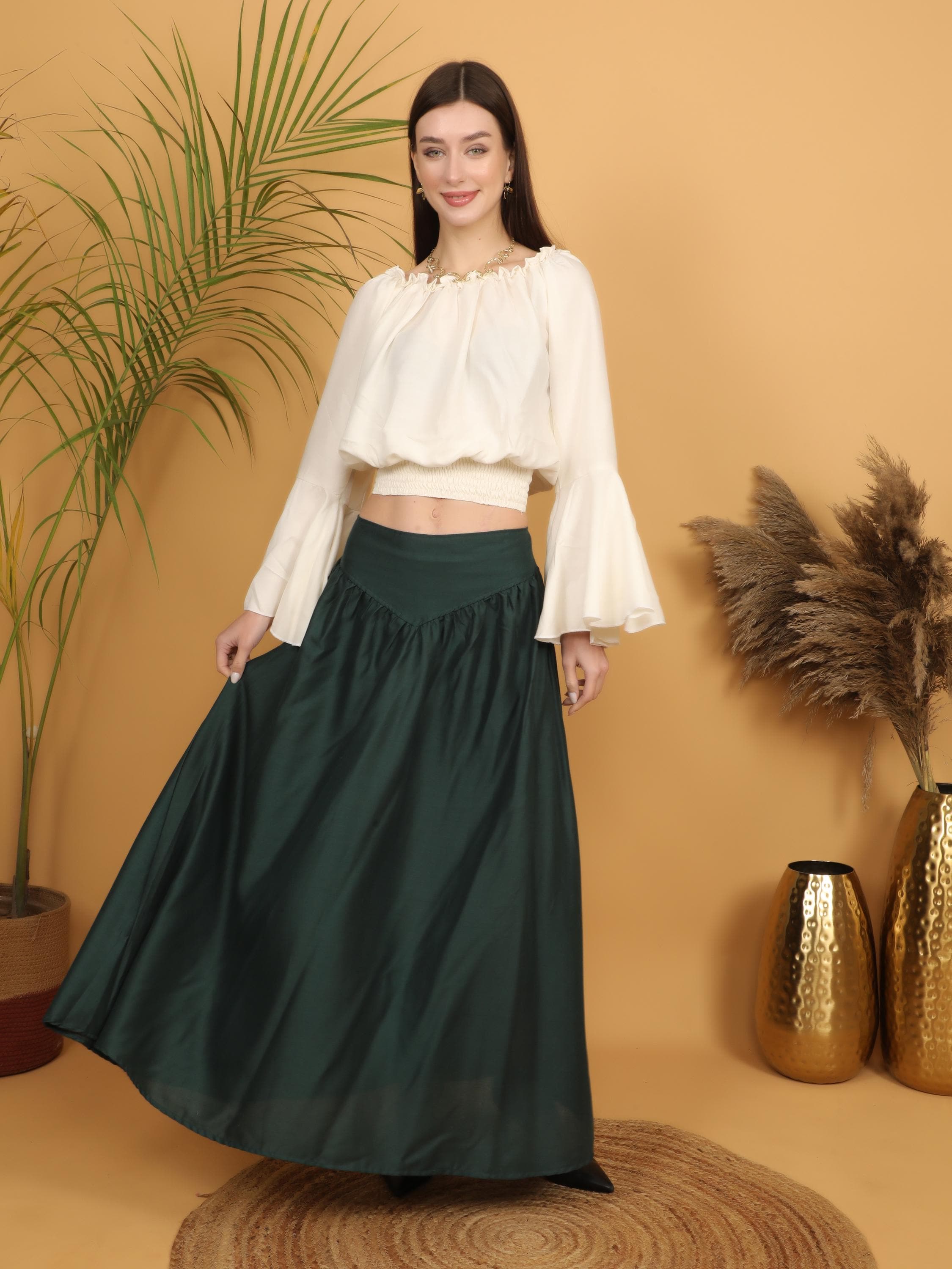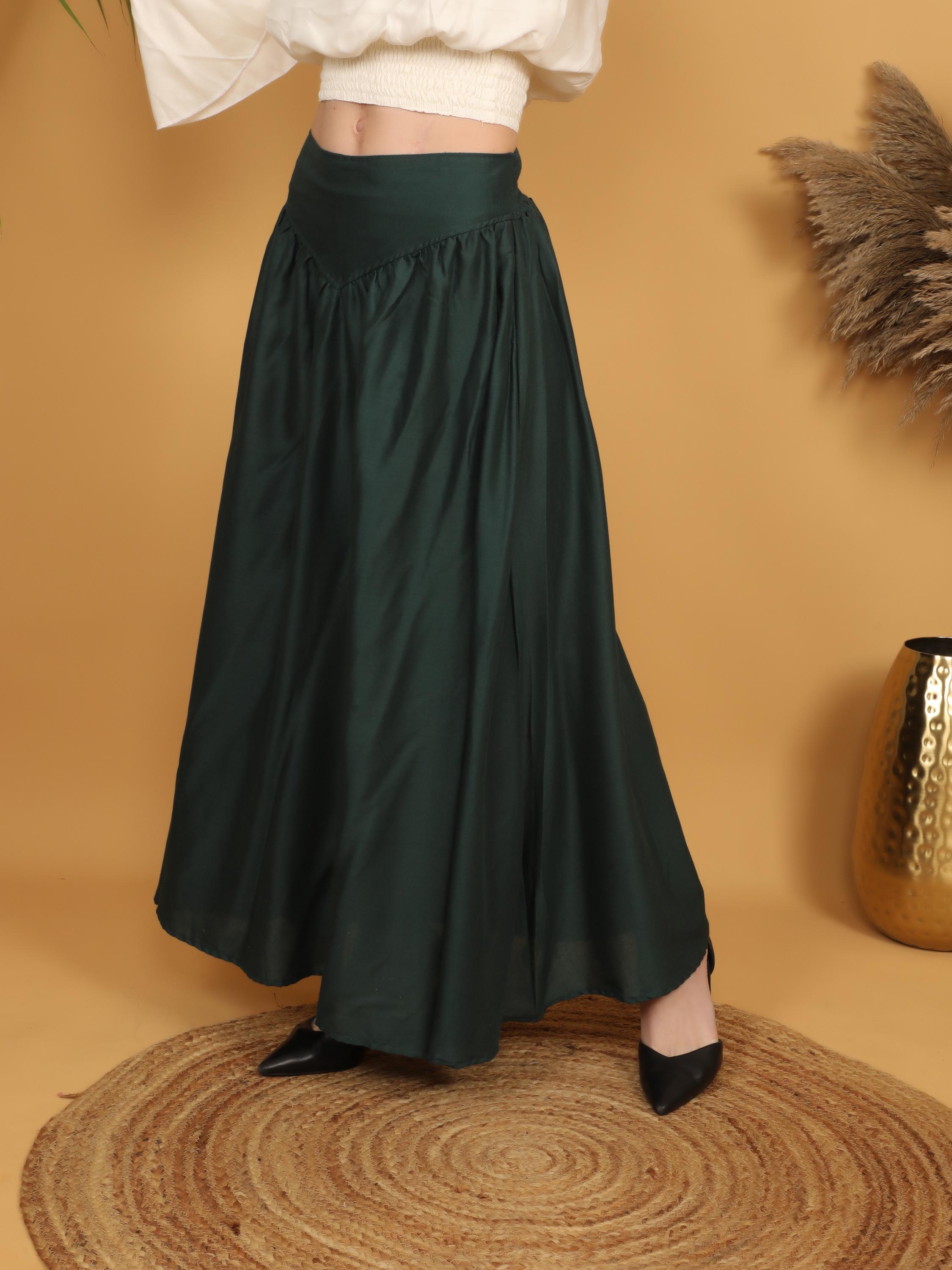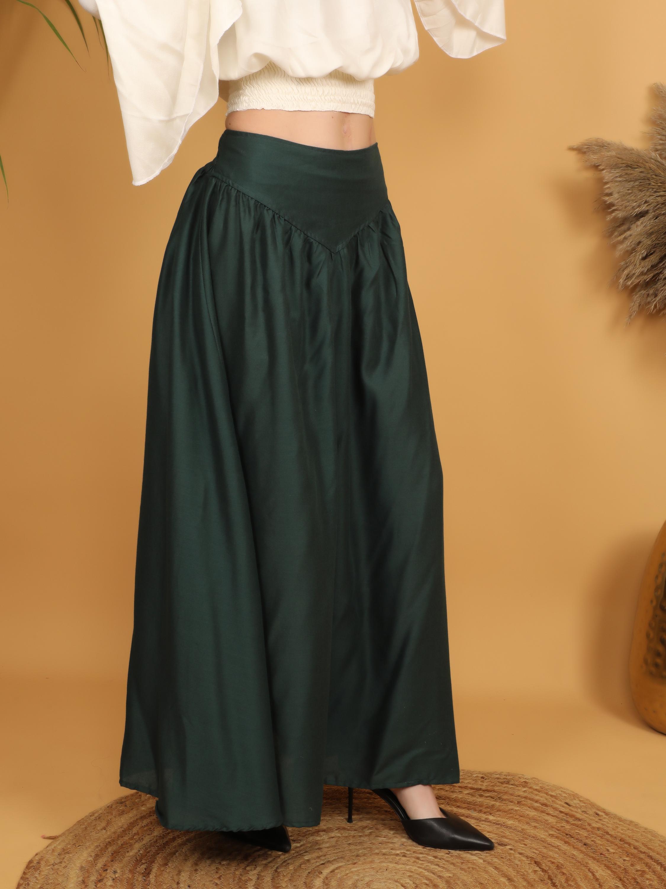 Step into a world of timeless elegance with our viscose long flowing medieval plain bottle green skirt.