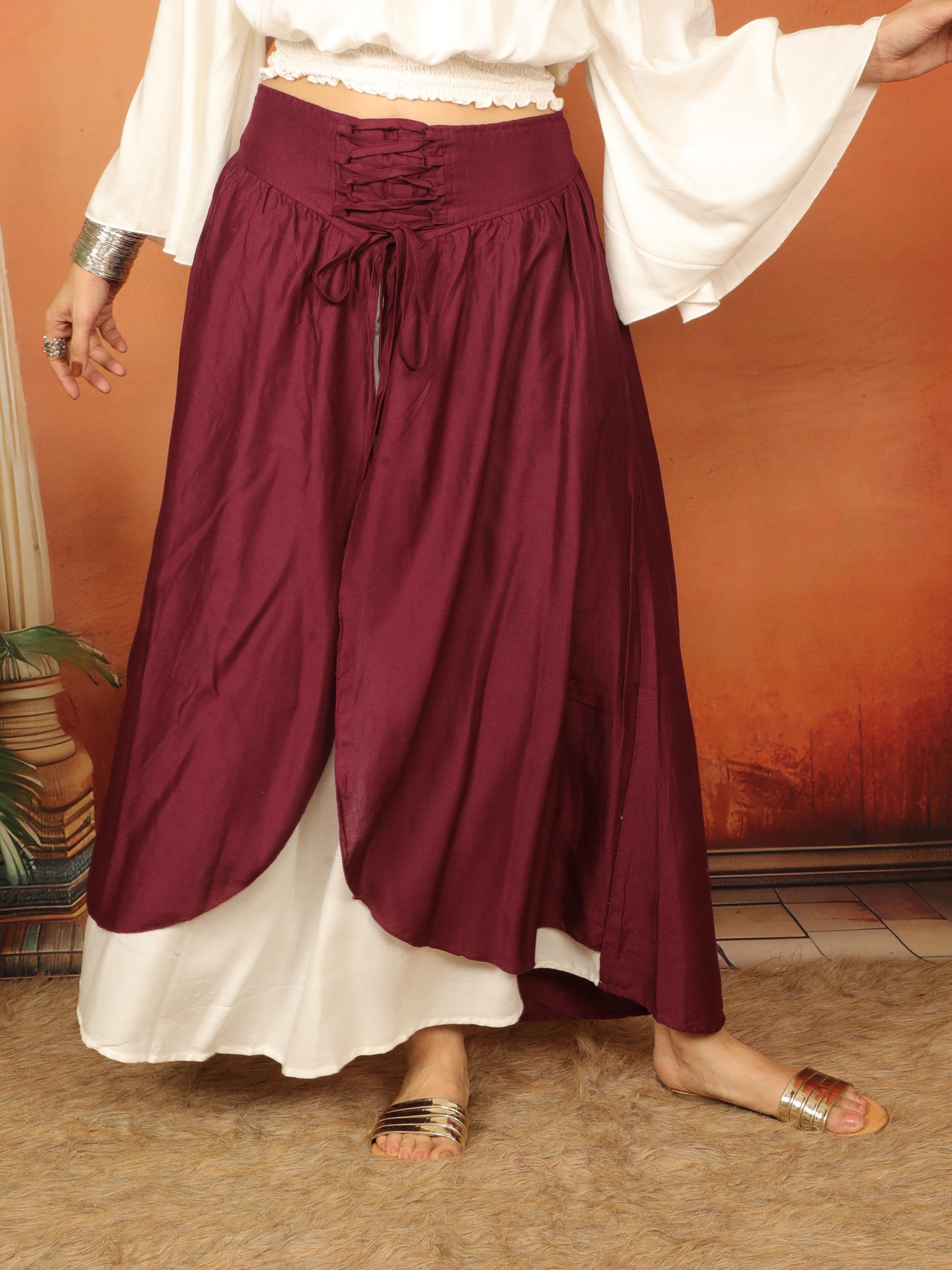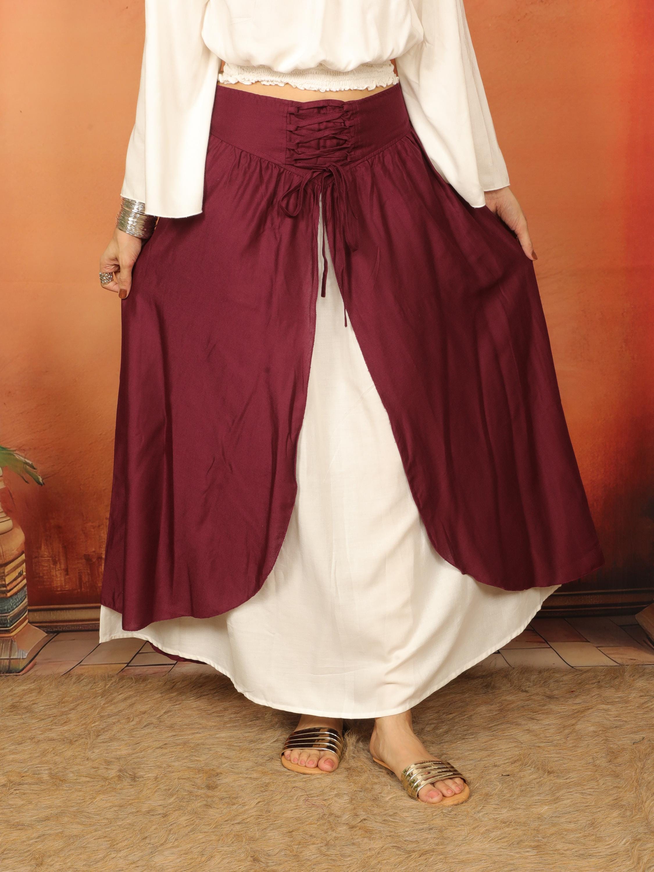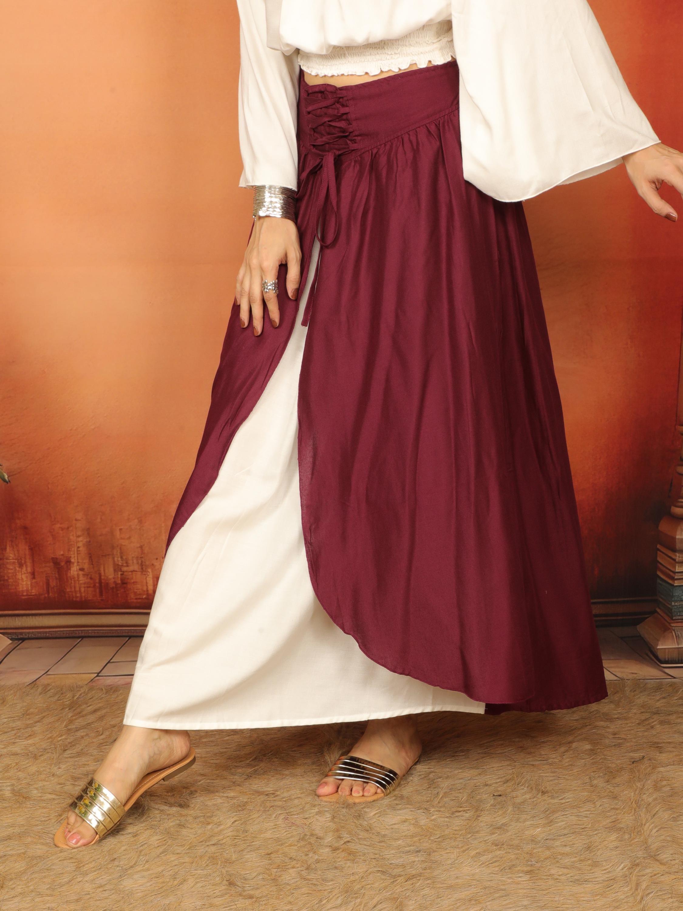The design features a pristine white petticoat layer, overlaid with a dramatic burgundy panel skirt, creating a captivating two-tone effect.