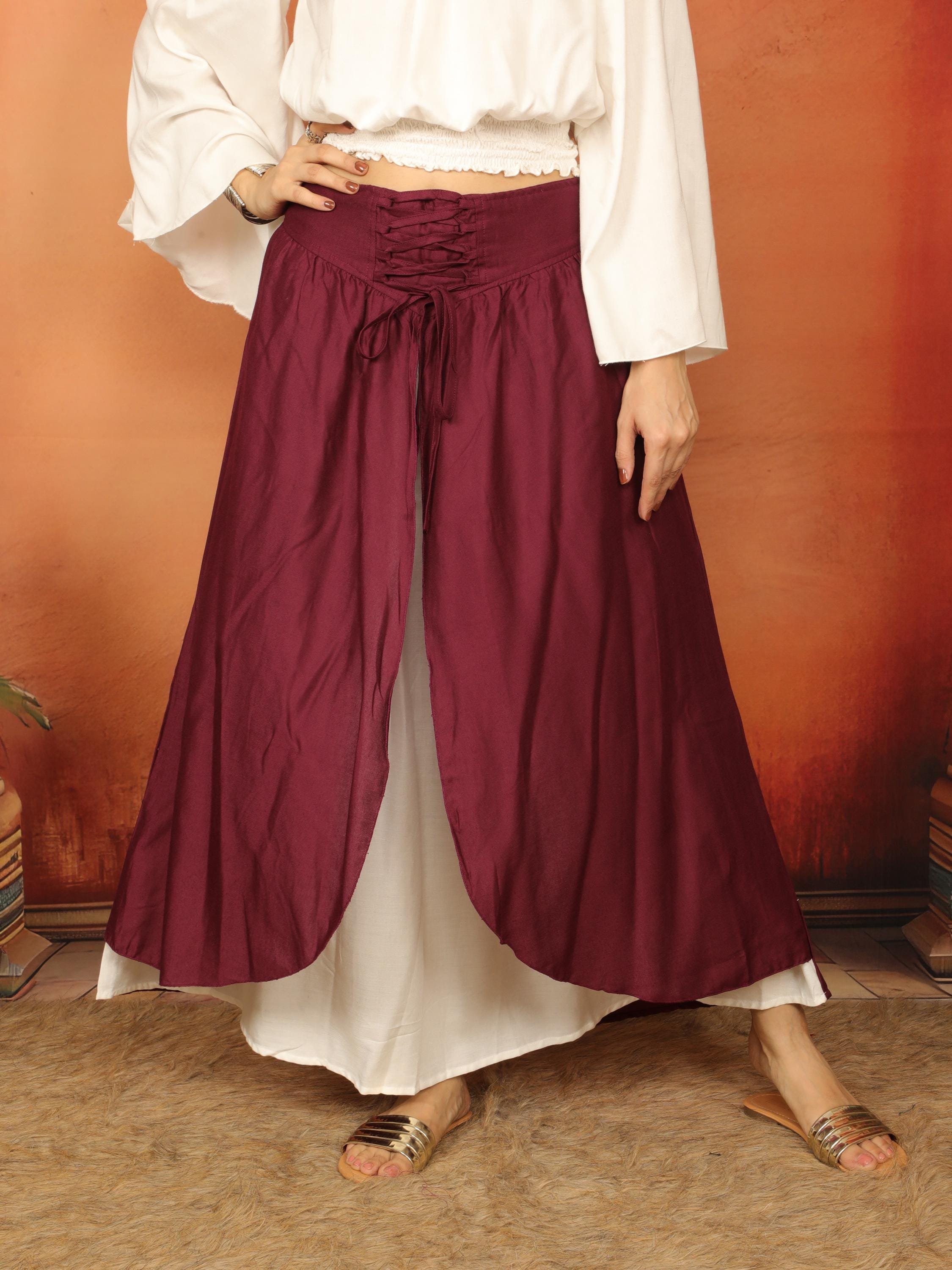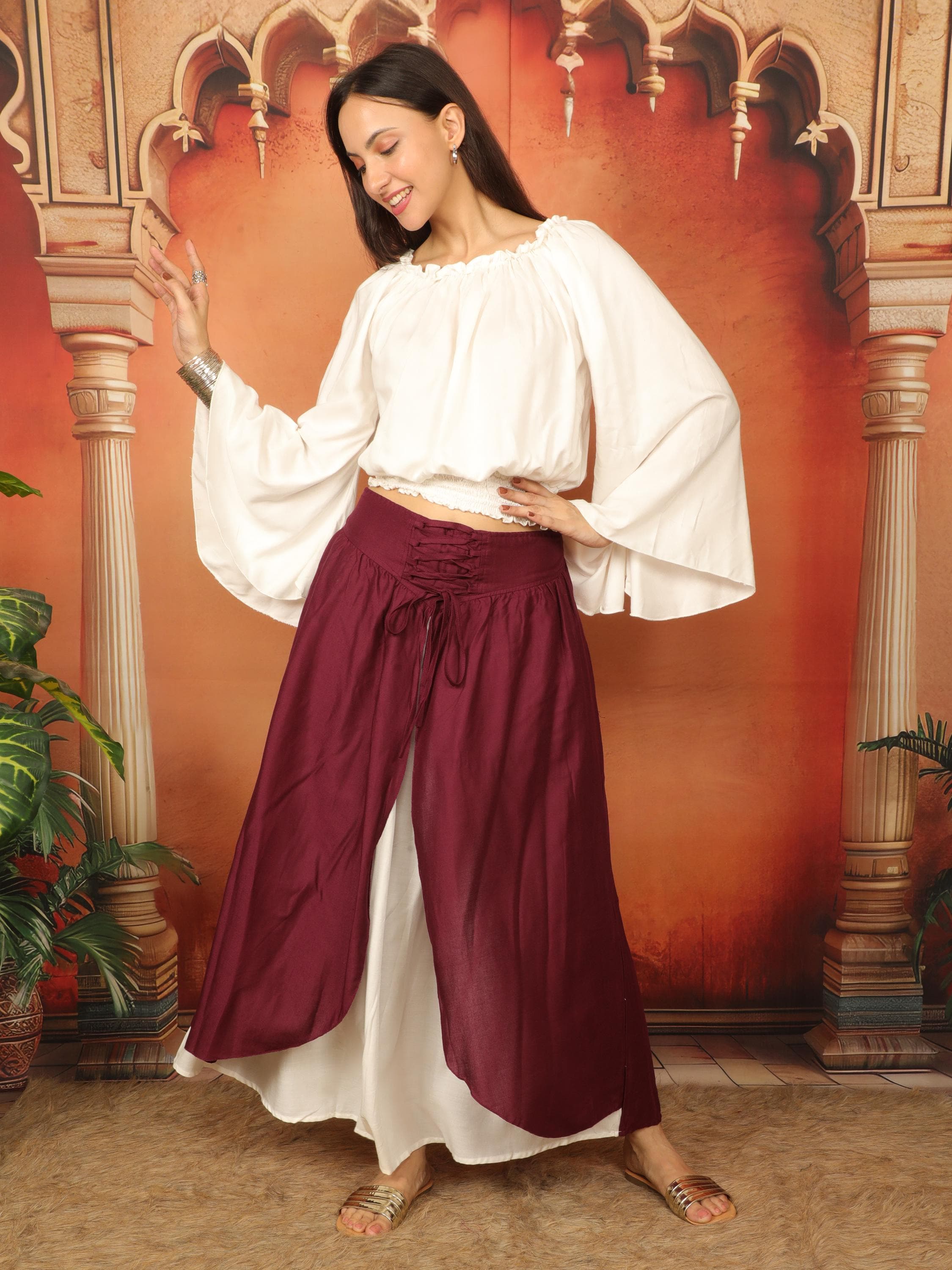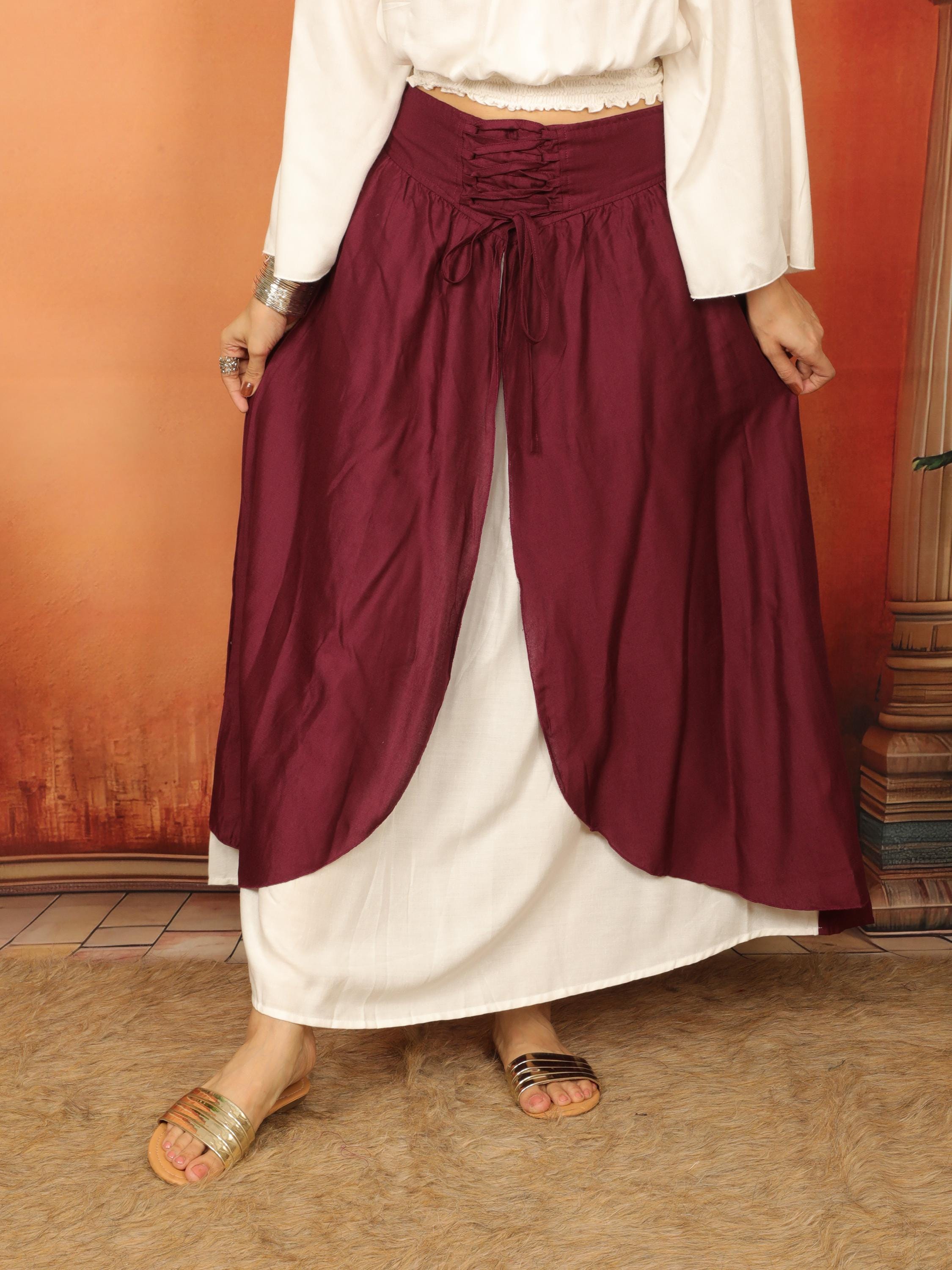 The design features a pristine white petticoat layer, overlaid with a dramatic burgundy panel skirt, creating a captivating two-tone effect.