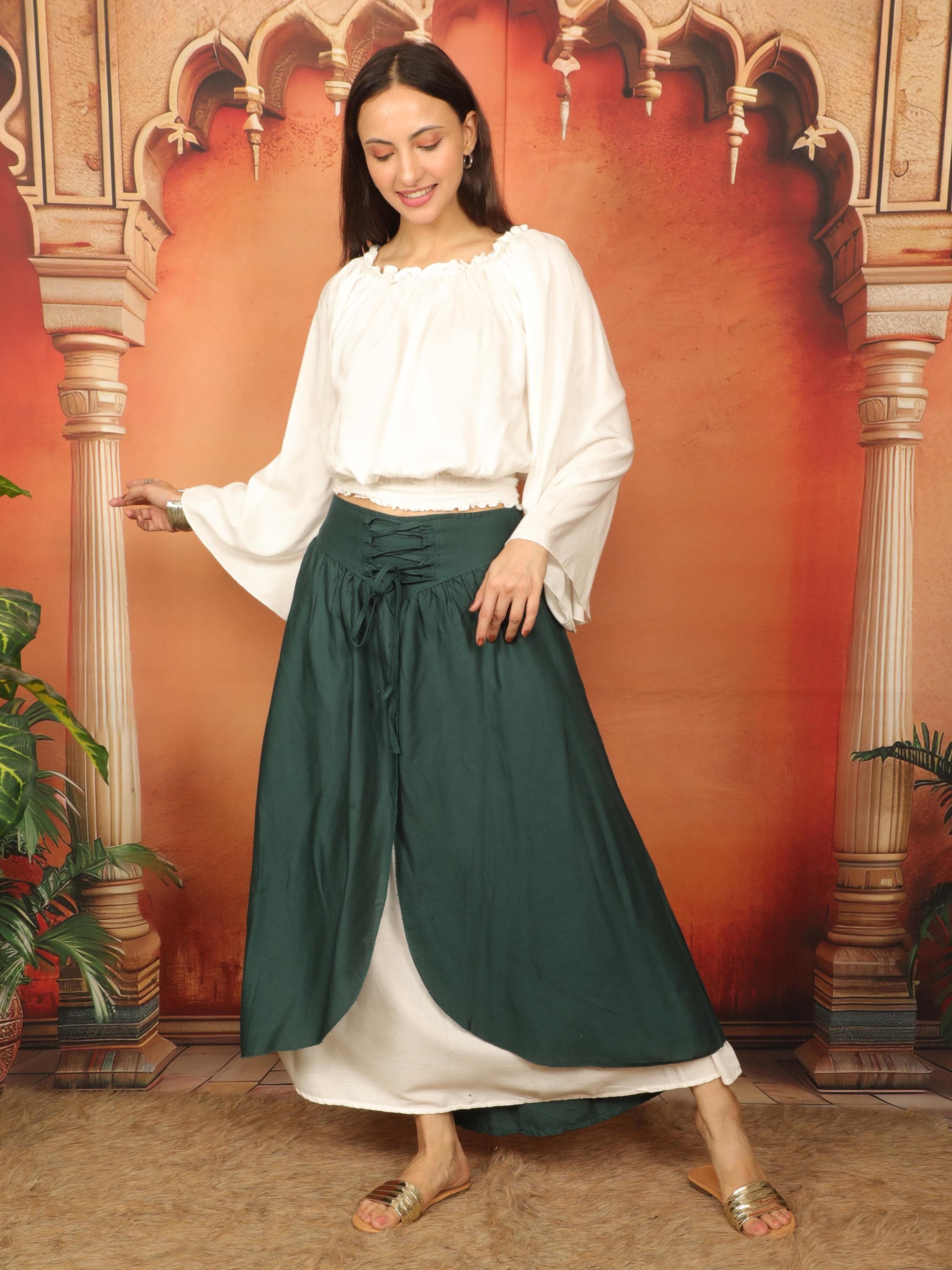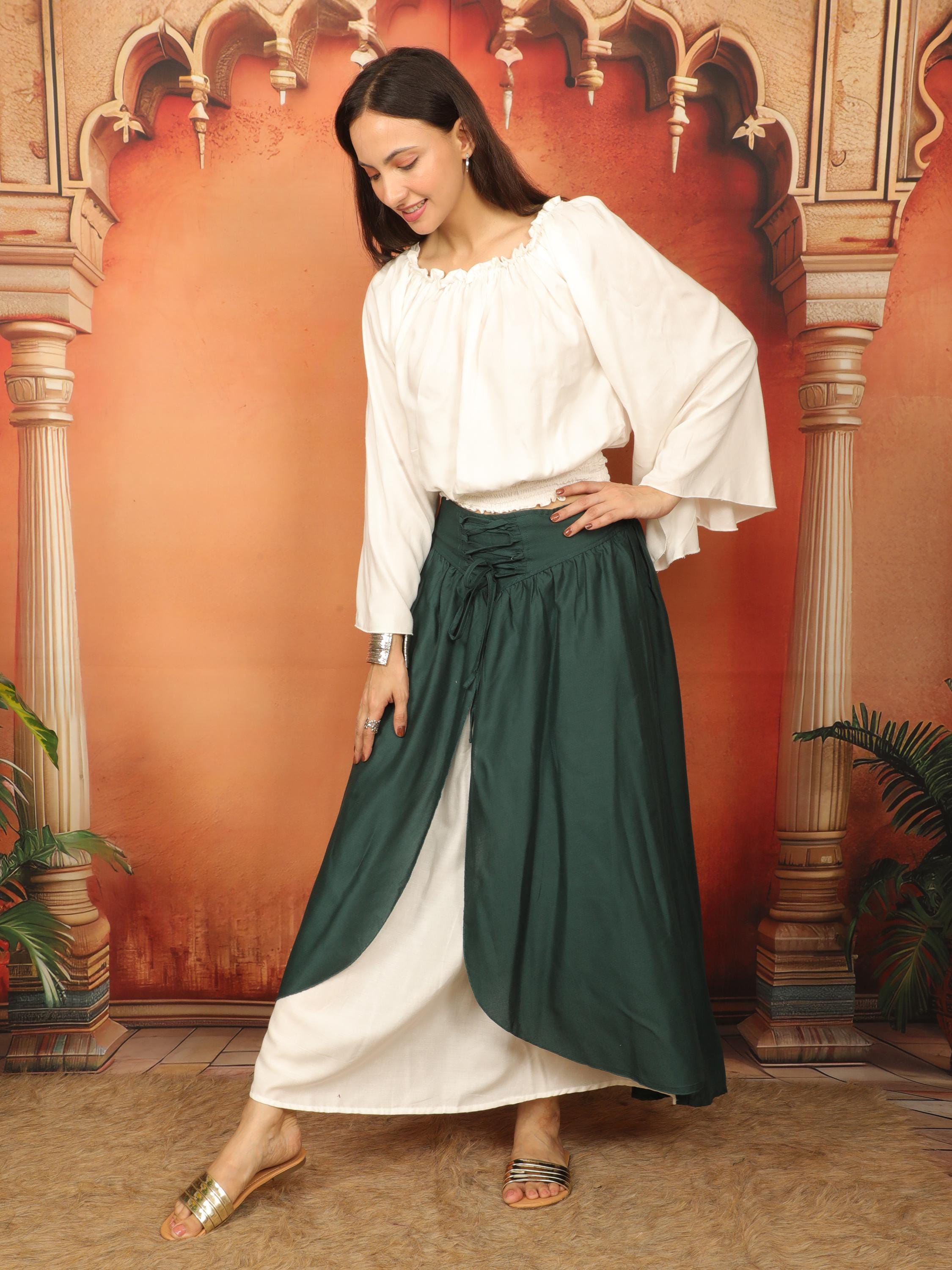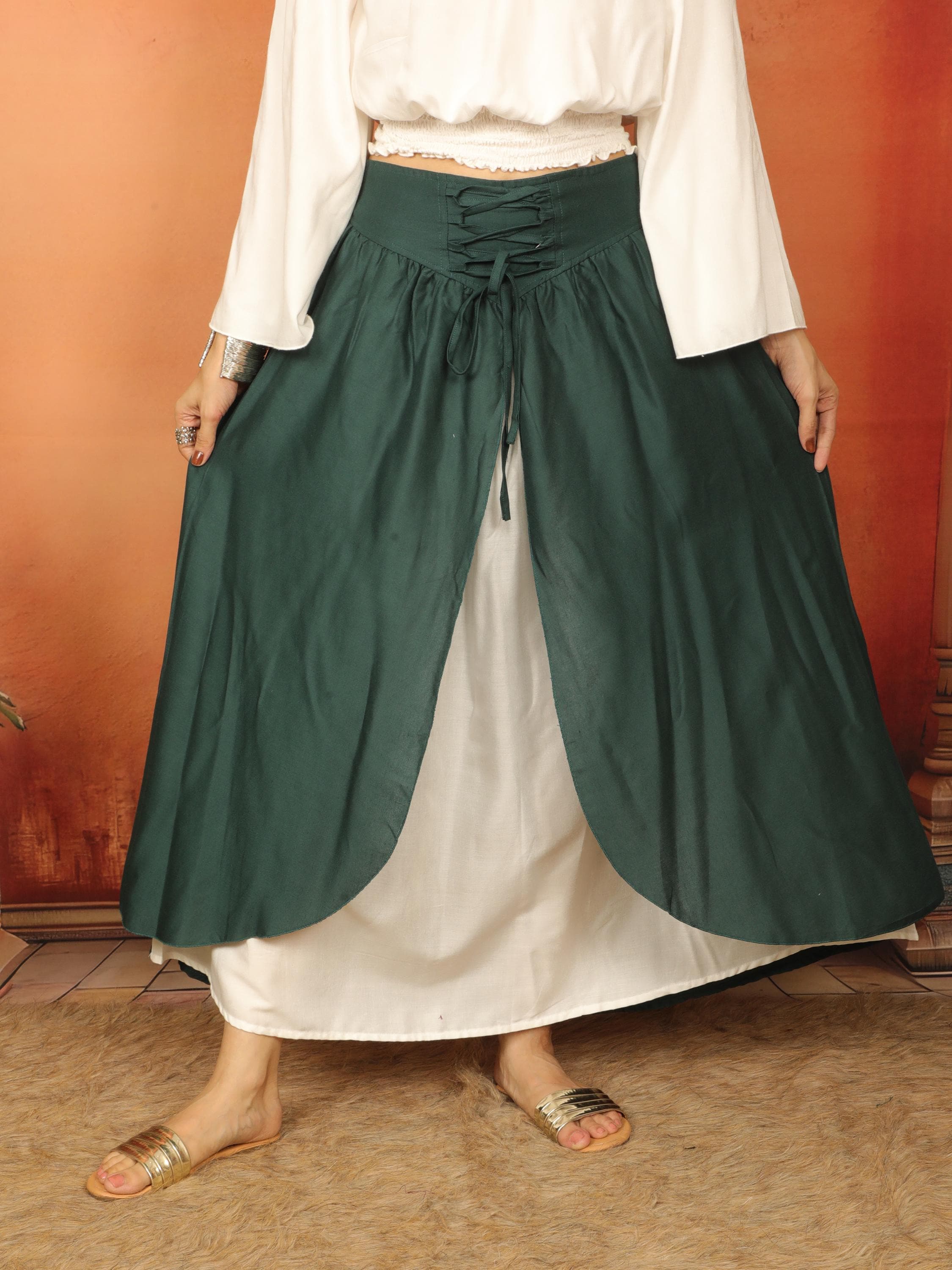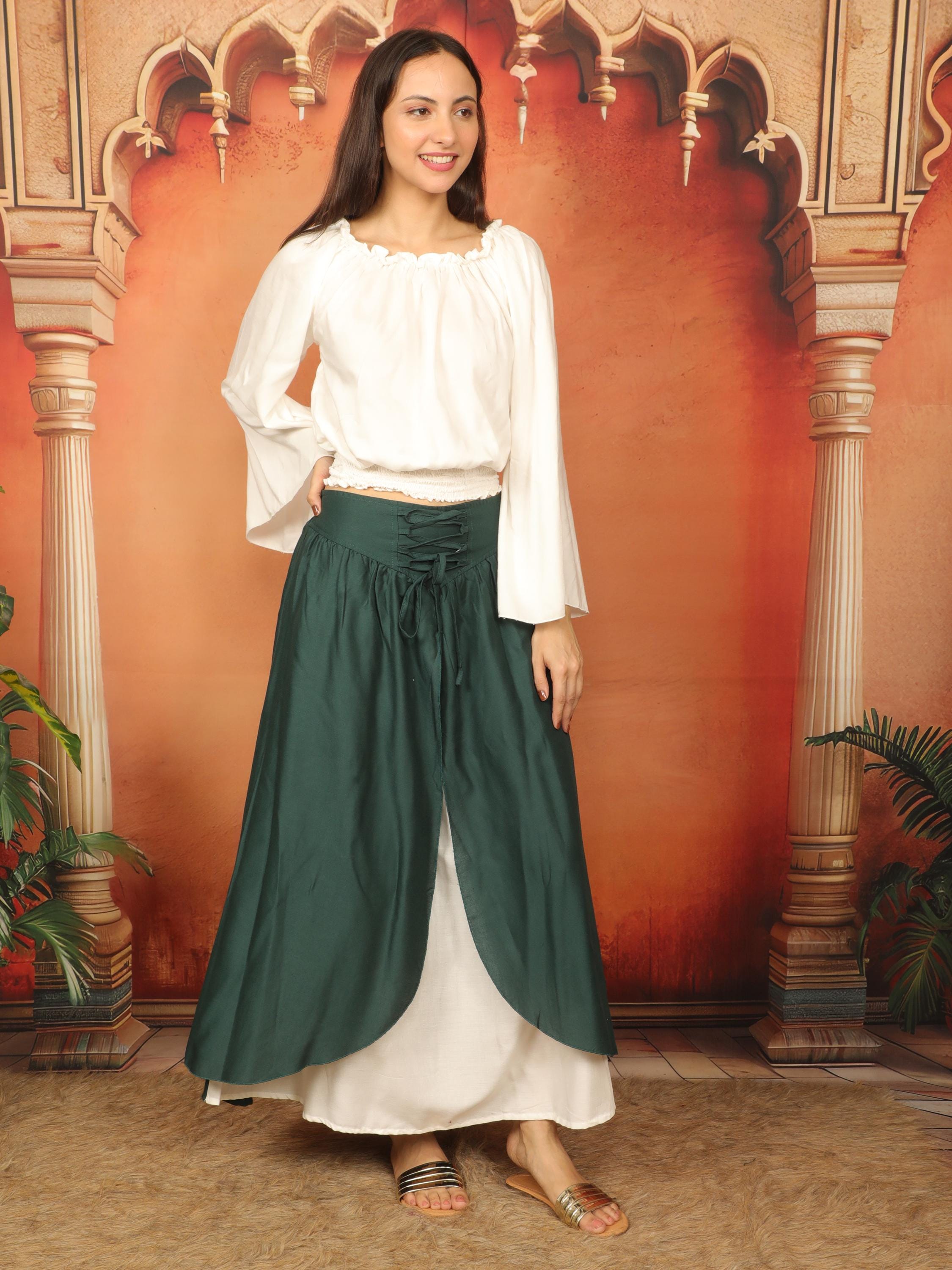 Crafted from soft, breathable viscose, this long, flowing skirt drapes beautifully and offers exceptional comfort. The design features a pristine white petticoat layer, overlaid with a dramatic bottle green panel skirt, creating a captivating two-tone effect.