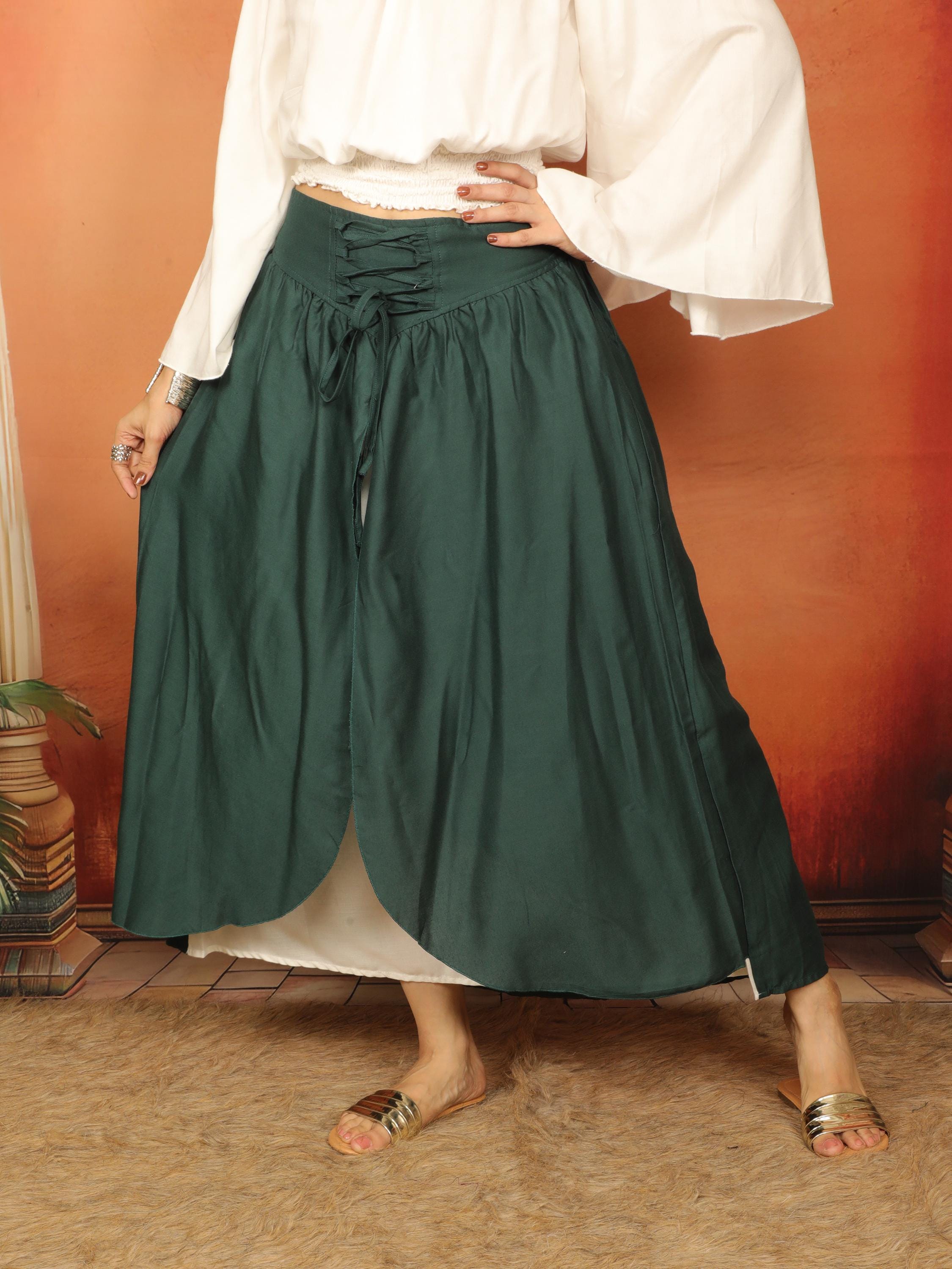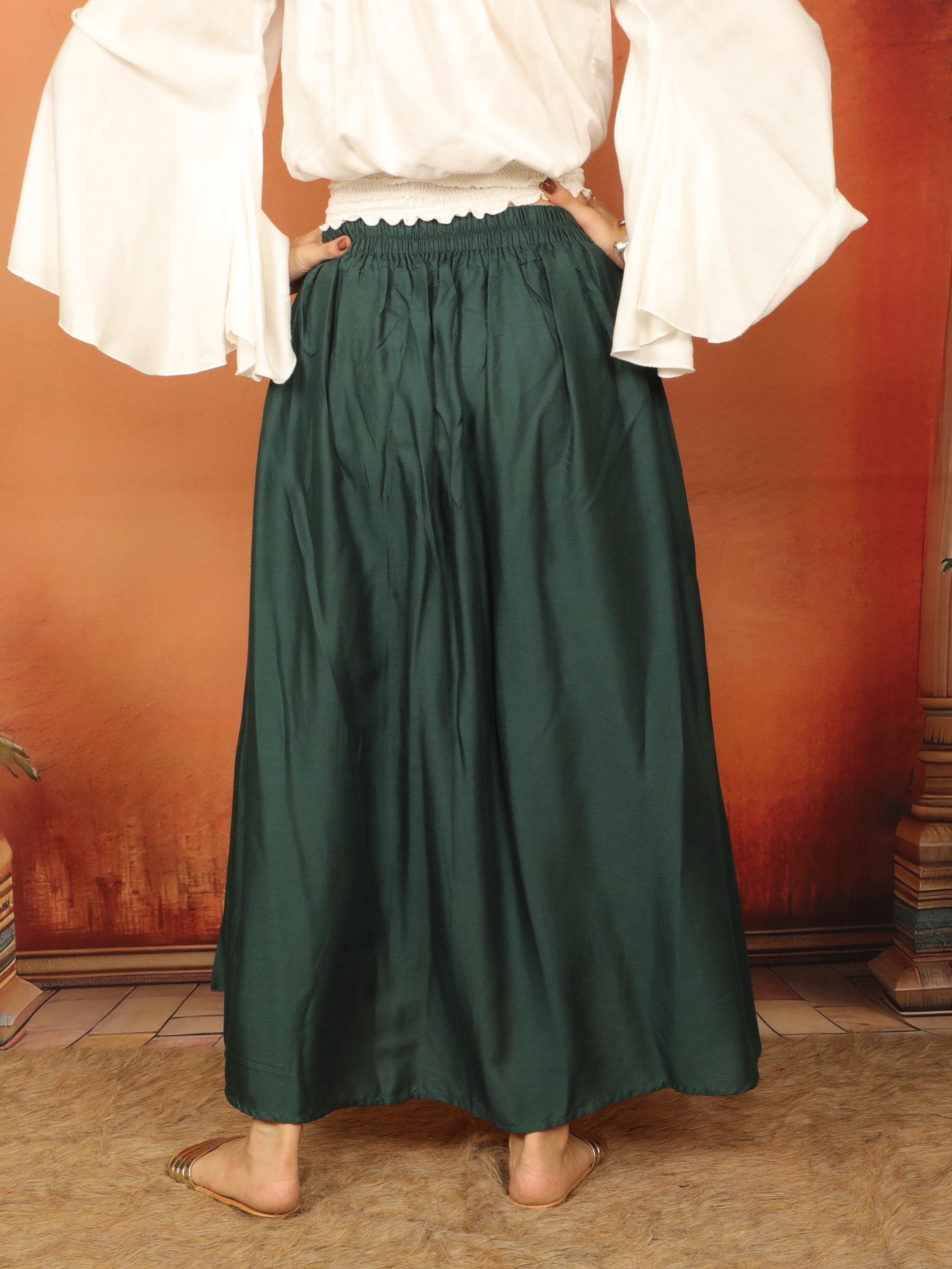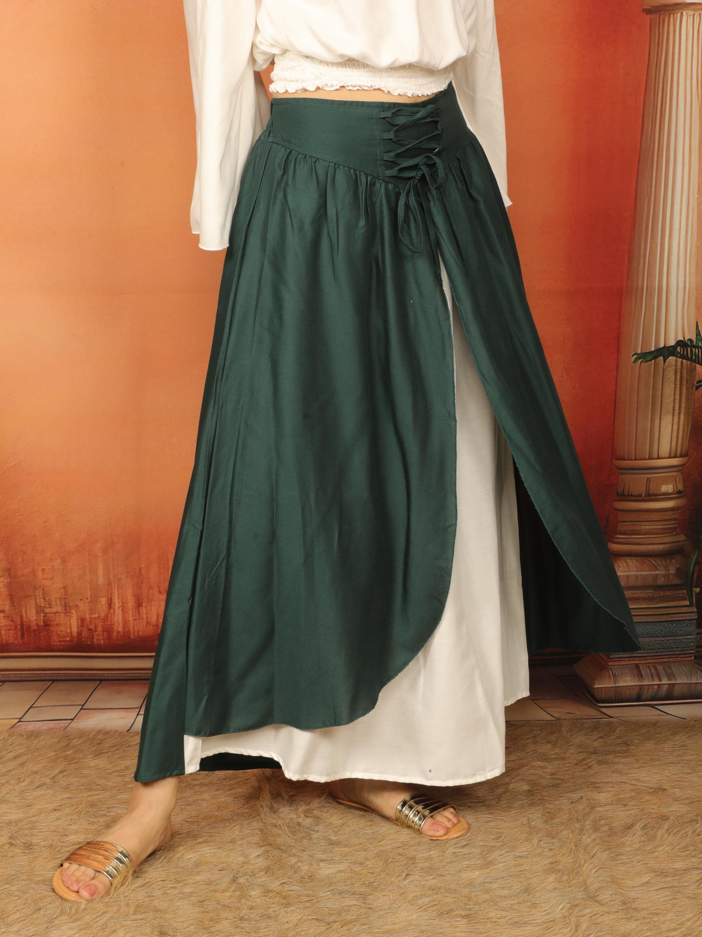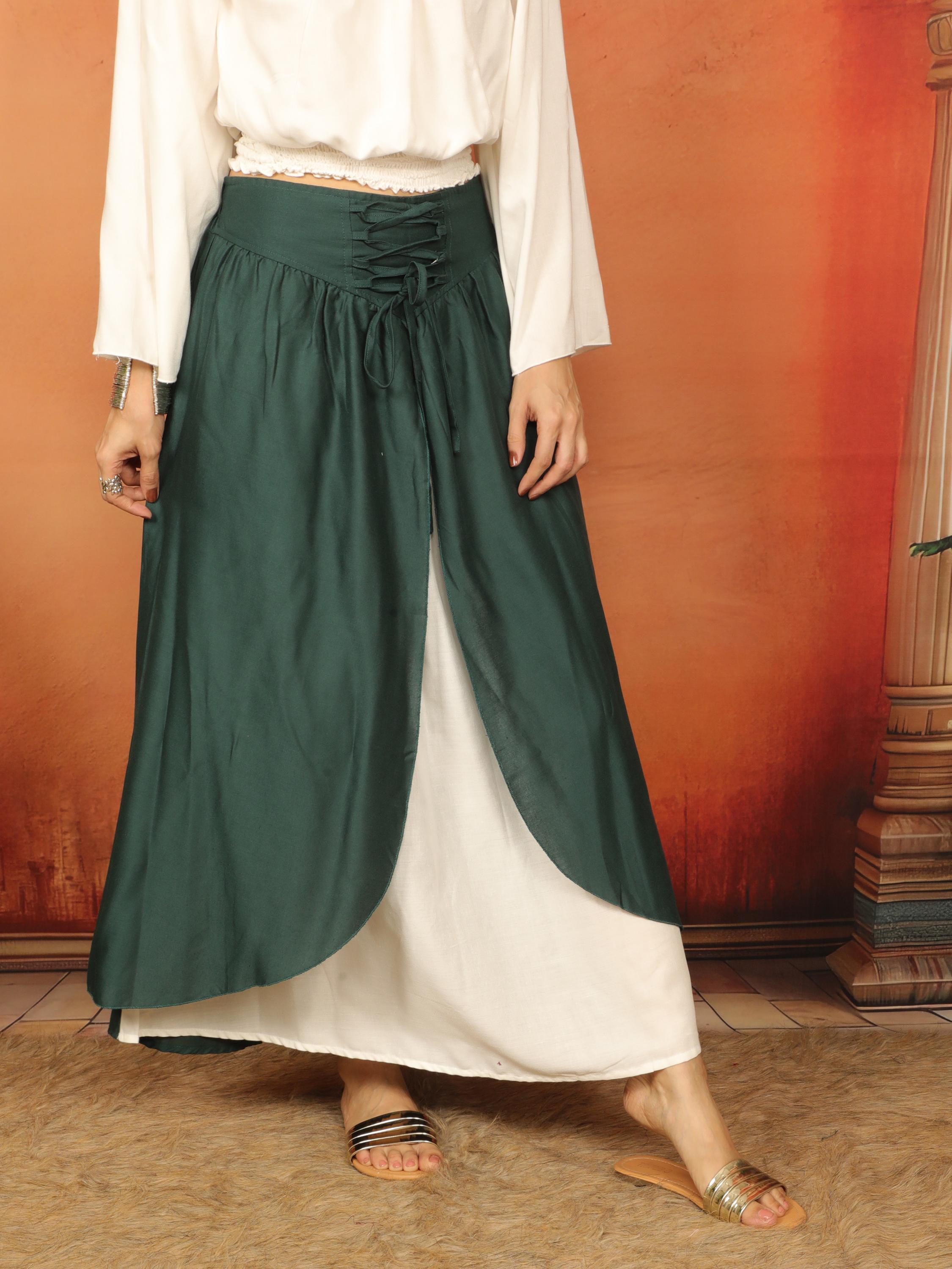 Crafted from soft, breathable viscose, this long, flowing skirt drapes beautifully and offers exceptional comfort. The design features a pristine white petticoat layer, overlaid with a dramatic bottle green panel skirt, creating a captivating two-tone effect.