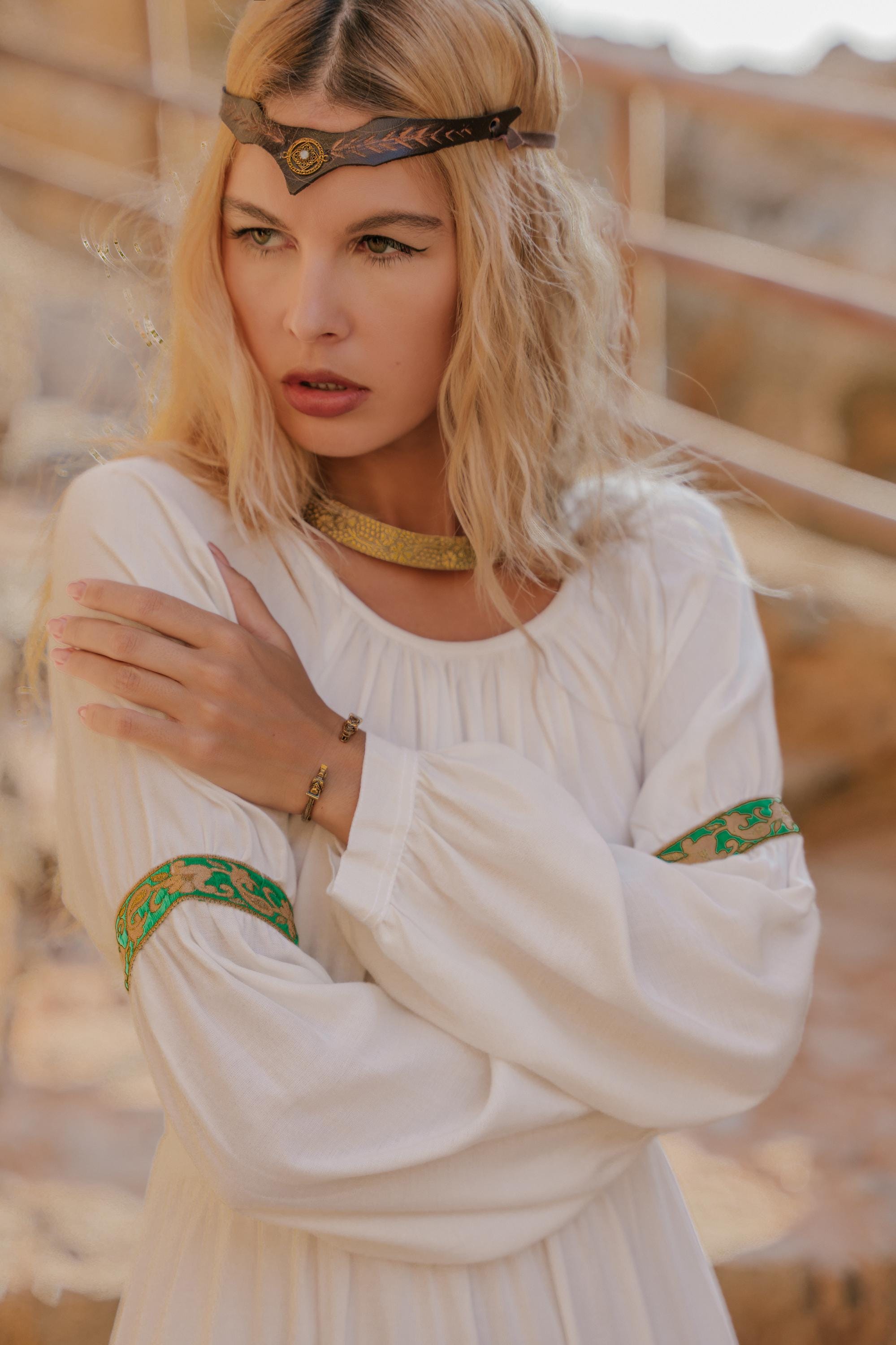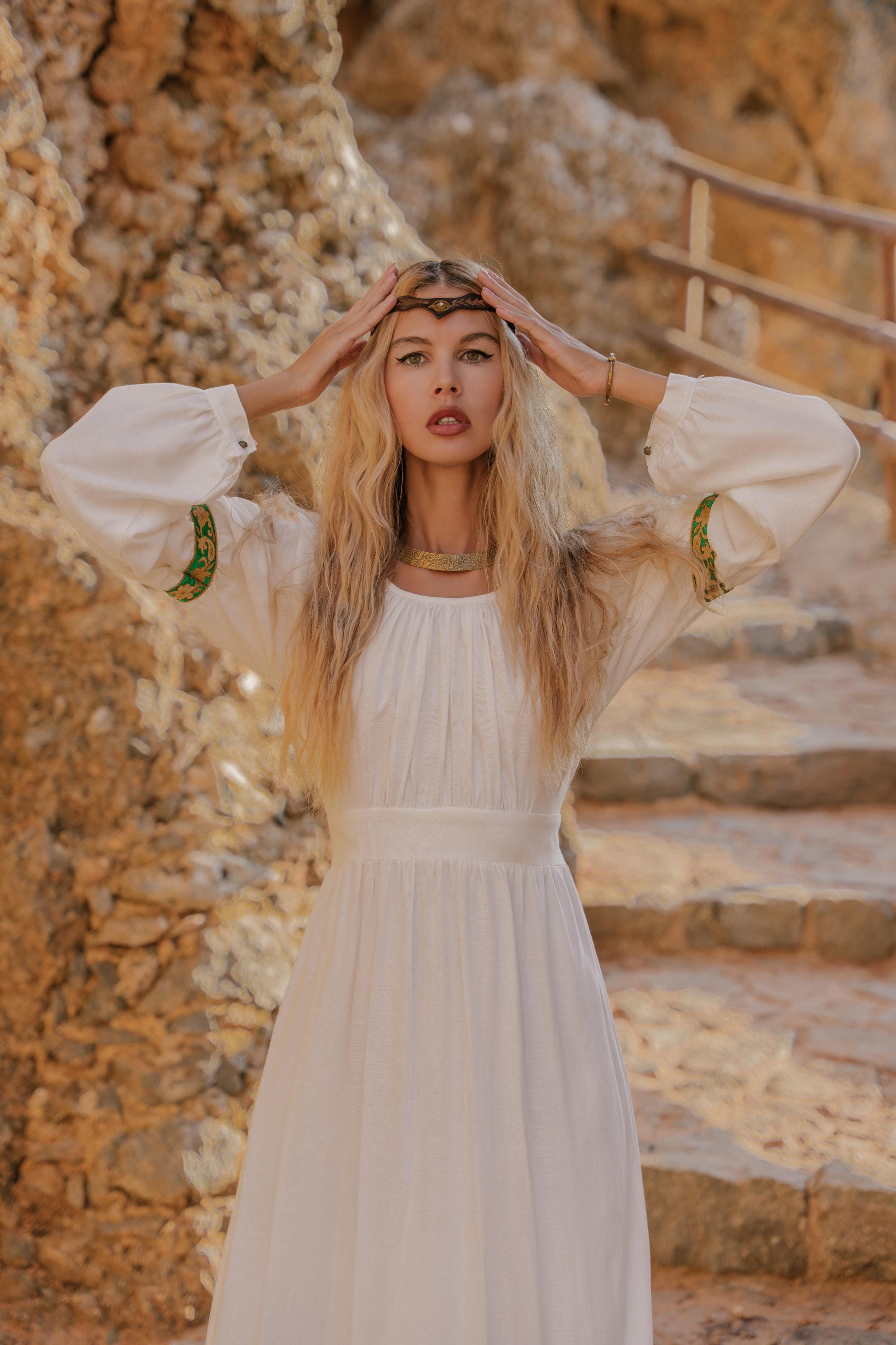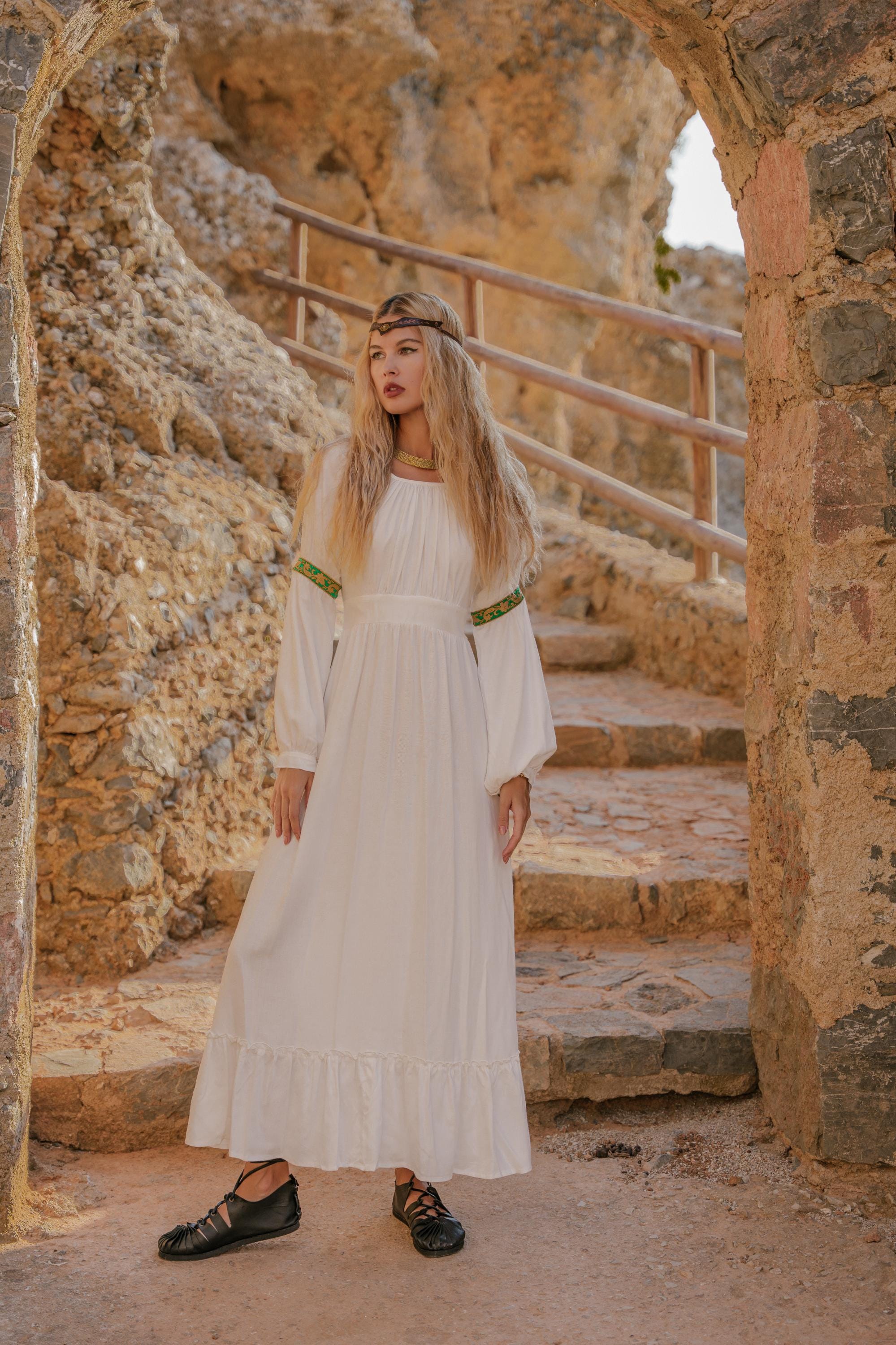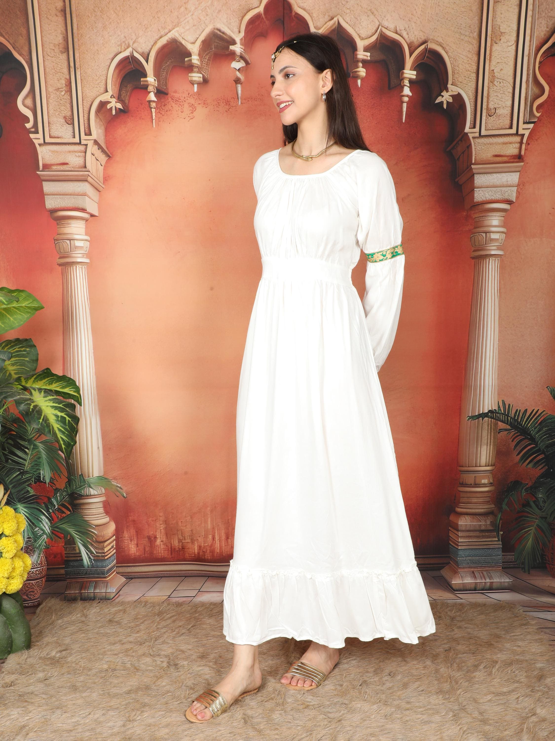 Transport yourself to a realm of ethereal beauty with our Viscose Medieval Inspired Off-White Maxi Dress.