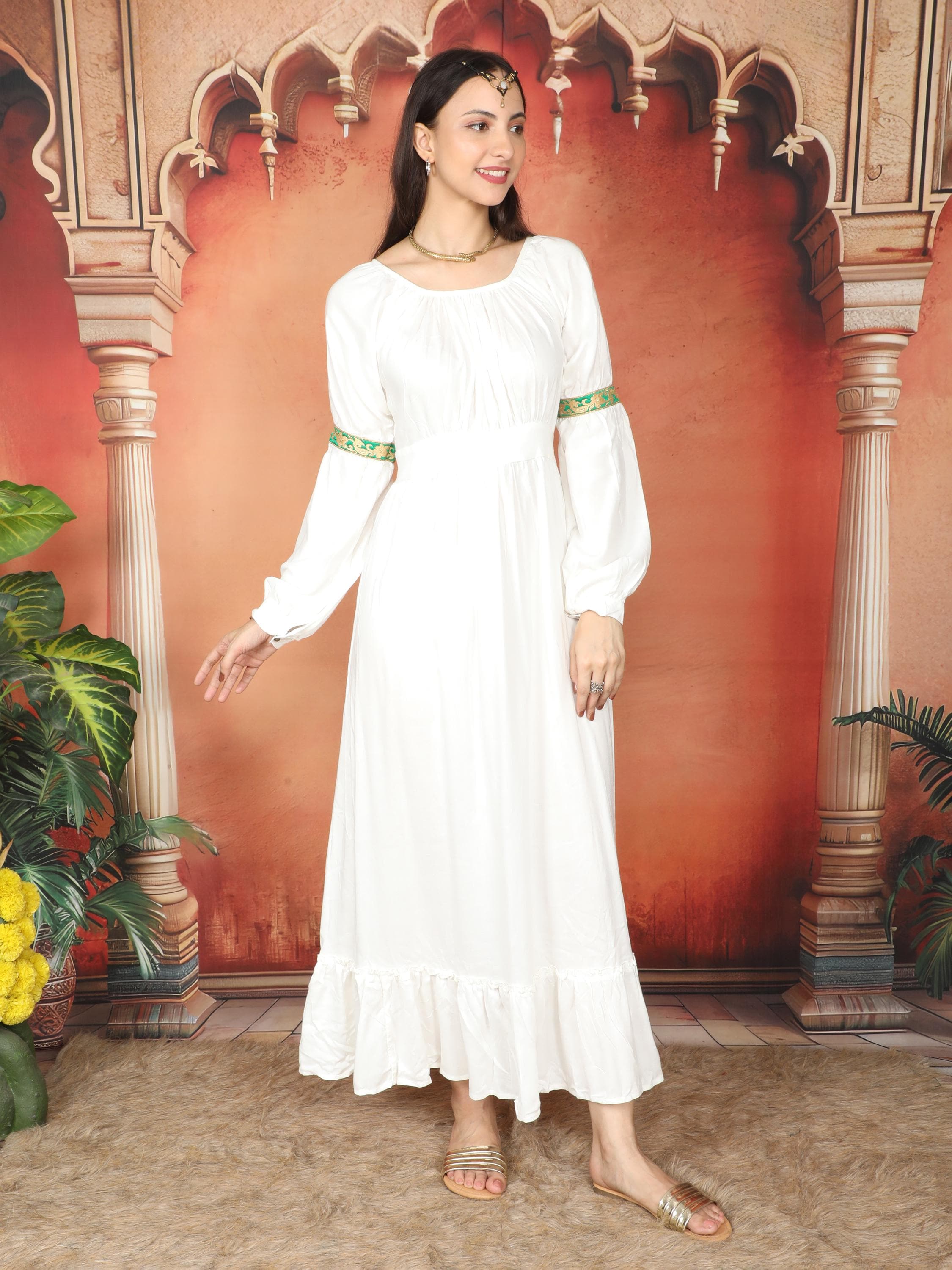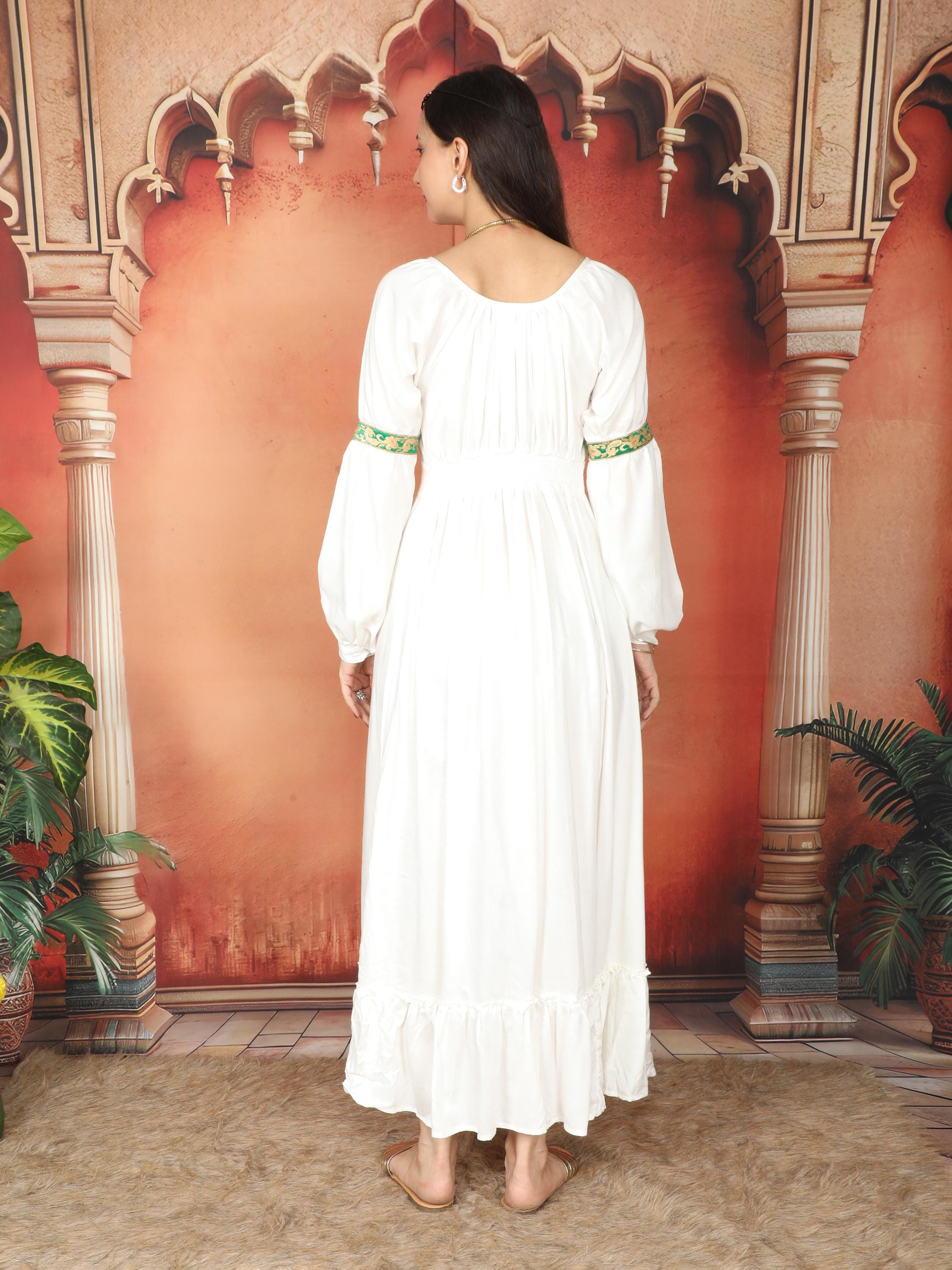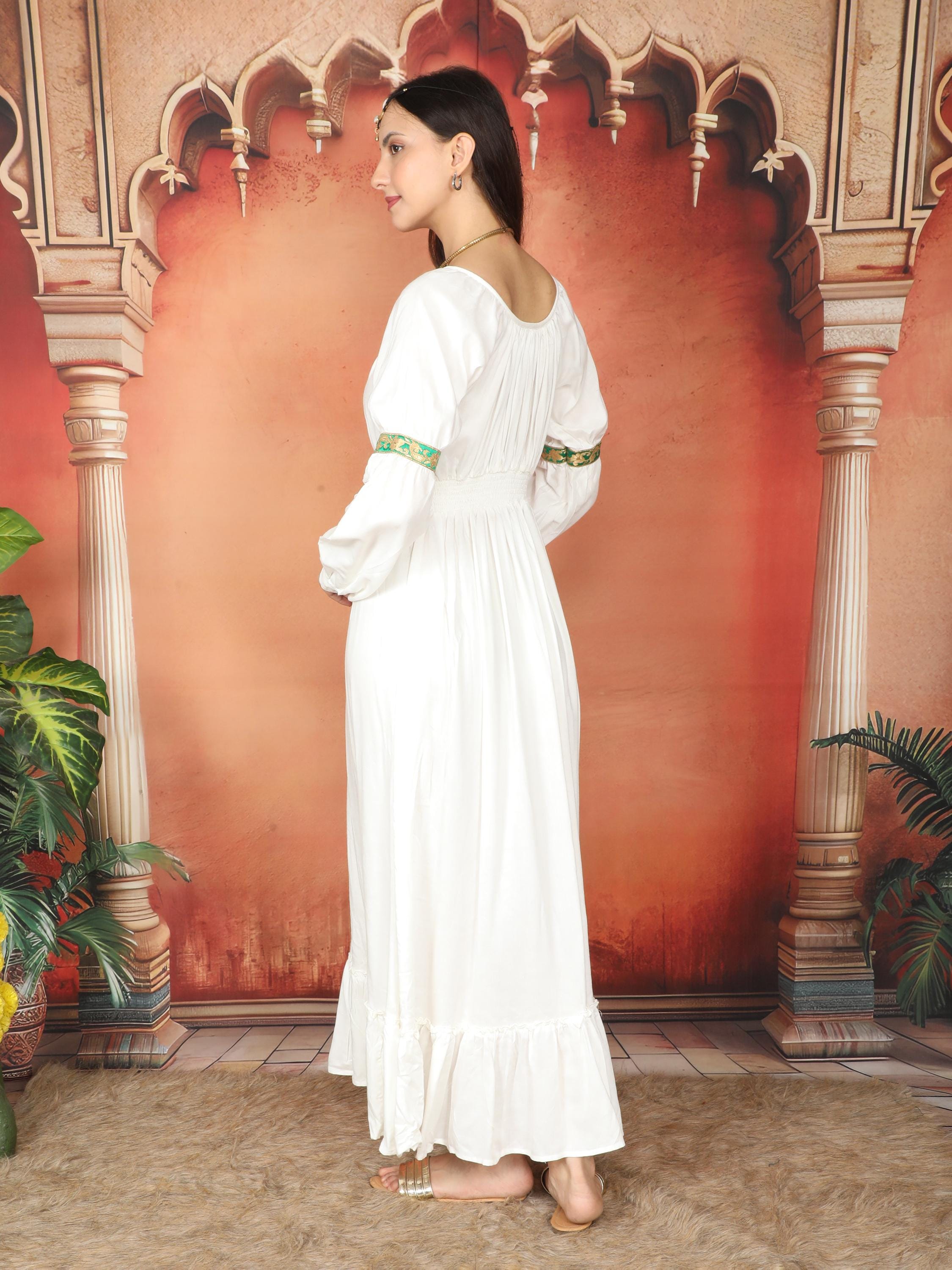 Transport yourself to a realm of ethereal beauty with our Viscose Medieval Inspired Off-White Maxi Dress.