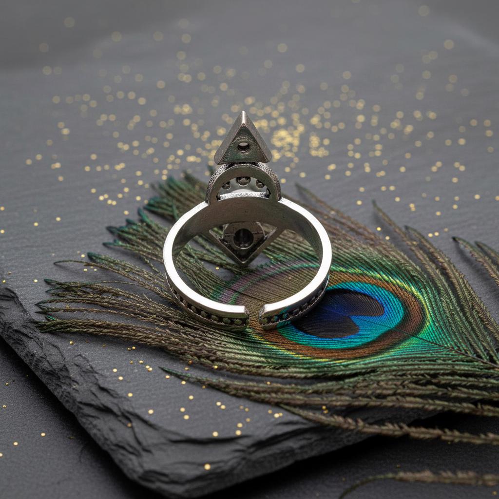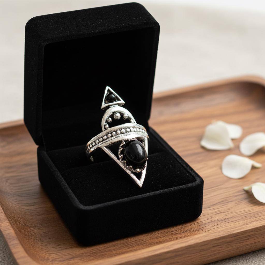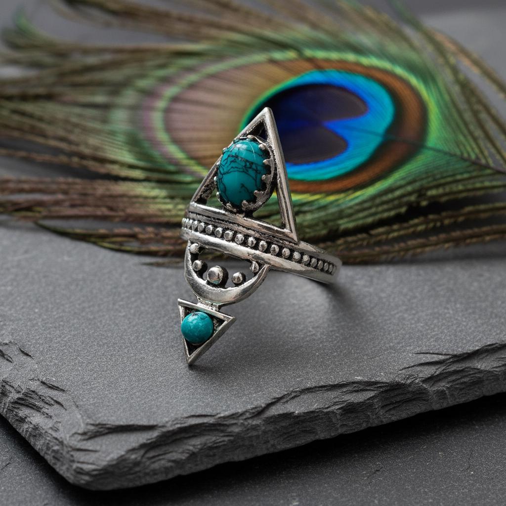 Make a bold statement with this handcrafted geometric brass ring, inspired by tribal symbolism and sacred geometry. Featuring an intricate openwork design with carefully set natural stones, this ring blends earthy elegance with a mystical, bohemian aesthetic.
