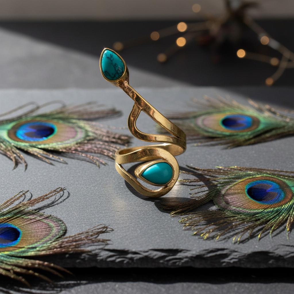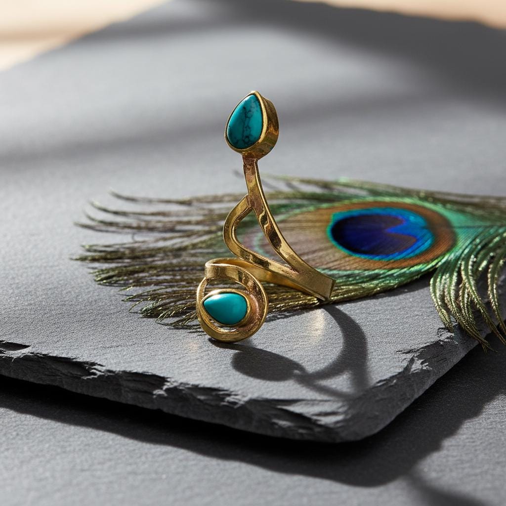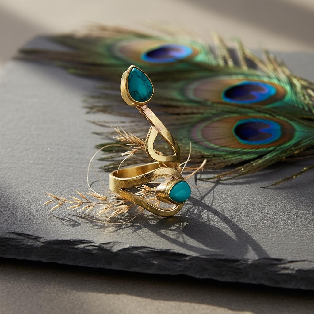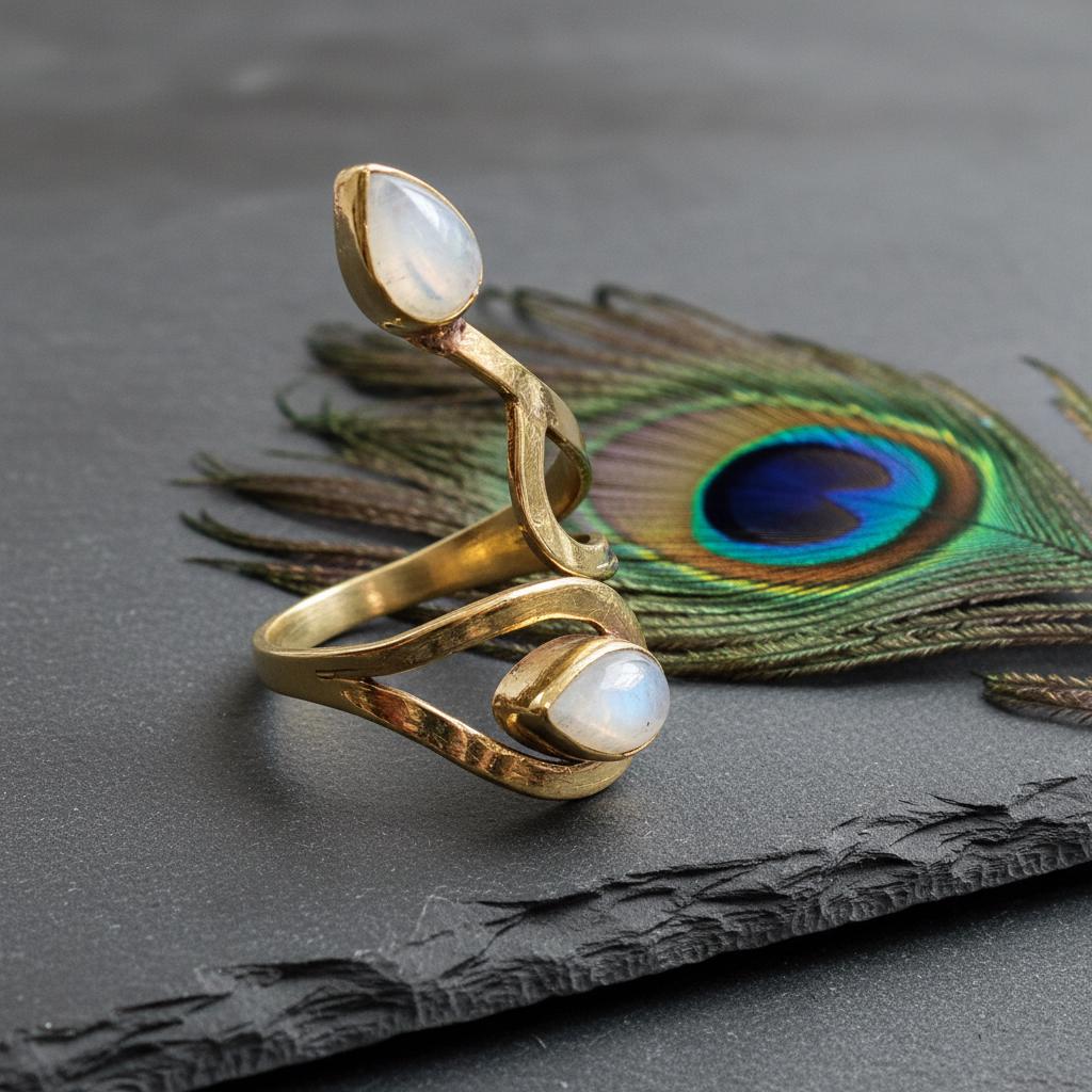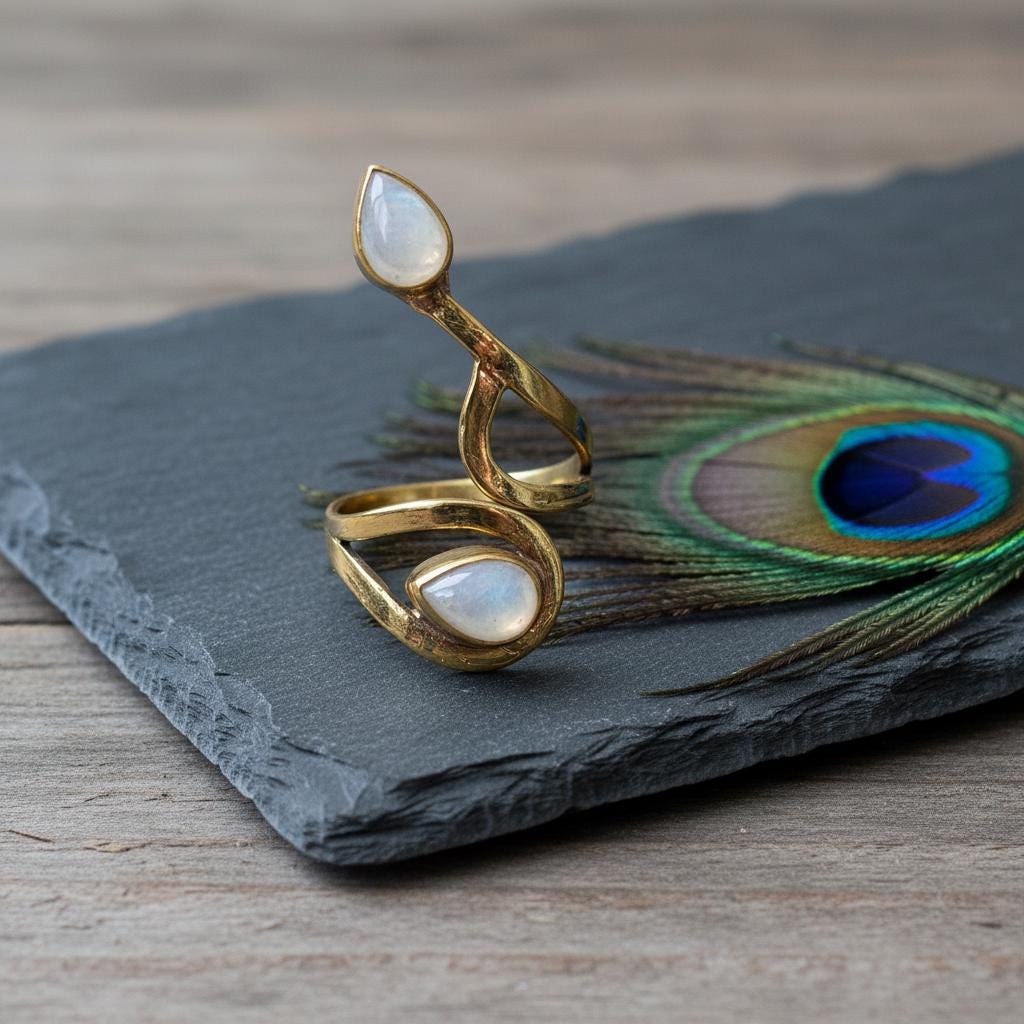 This handmade adjustable brass ring features natural gemstones shaped into elegant double teardrops, creating a flowing, organic design that wraps beautifully around the finger. Each gemstone carries its own energy, making every ring a personal talisman.