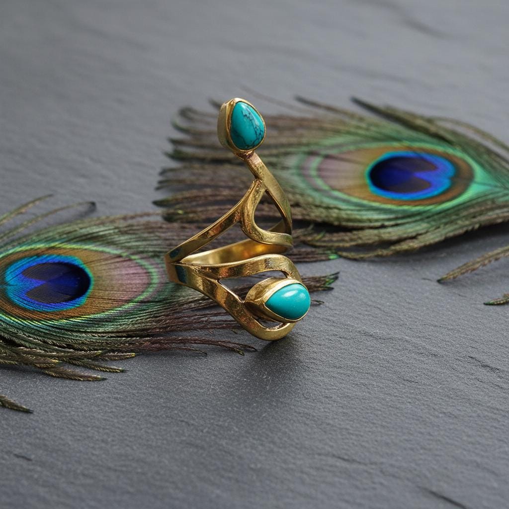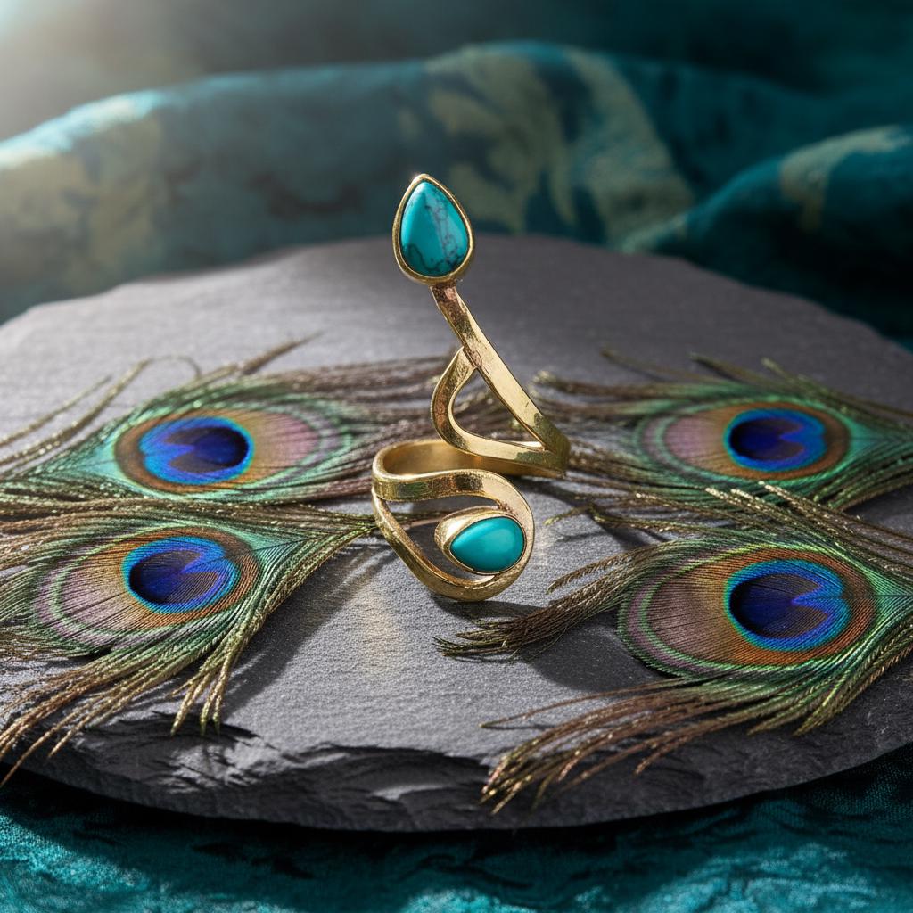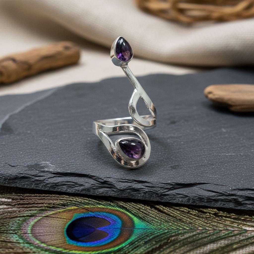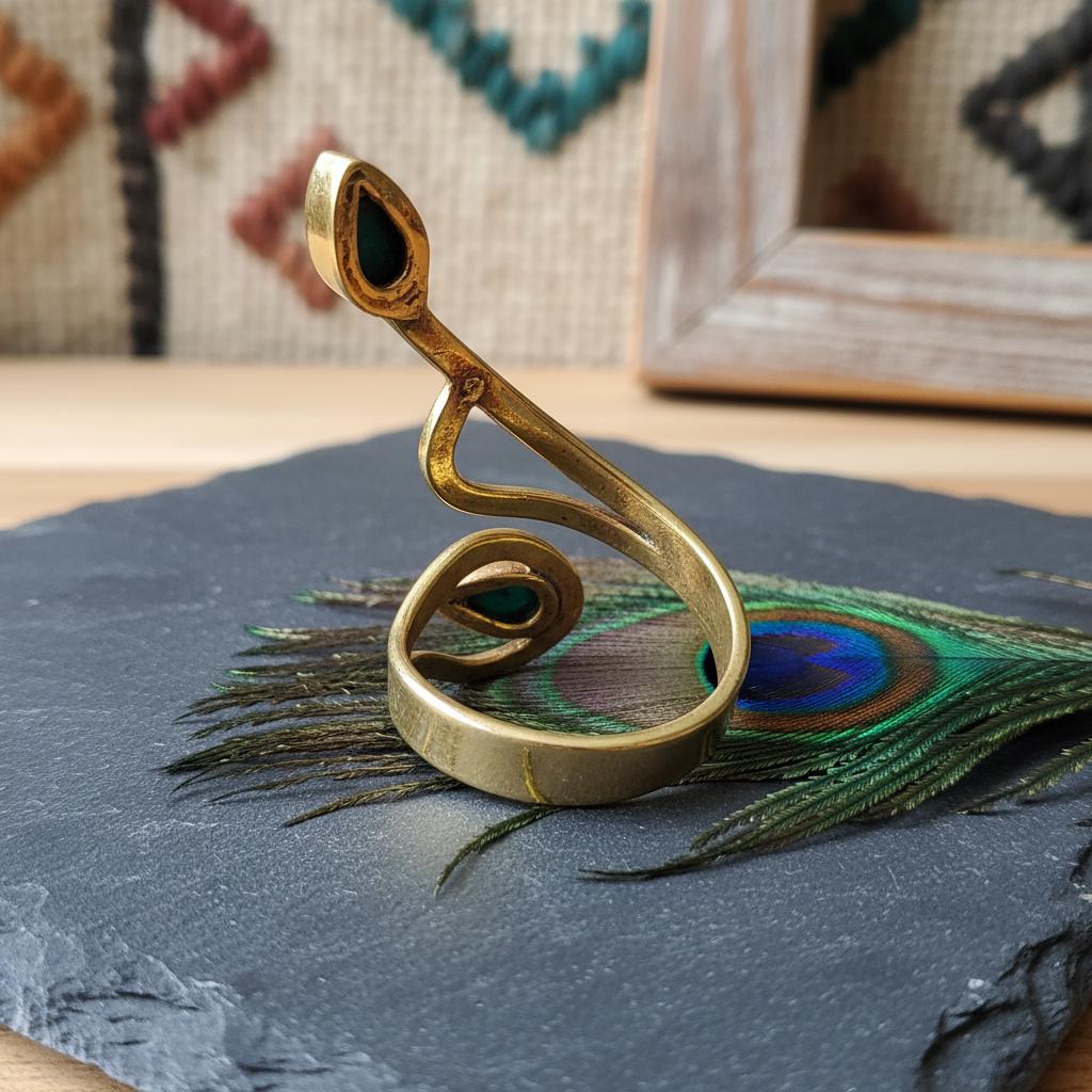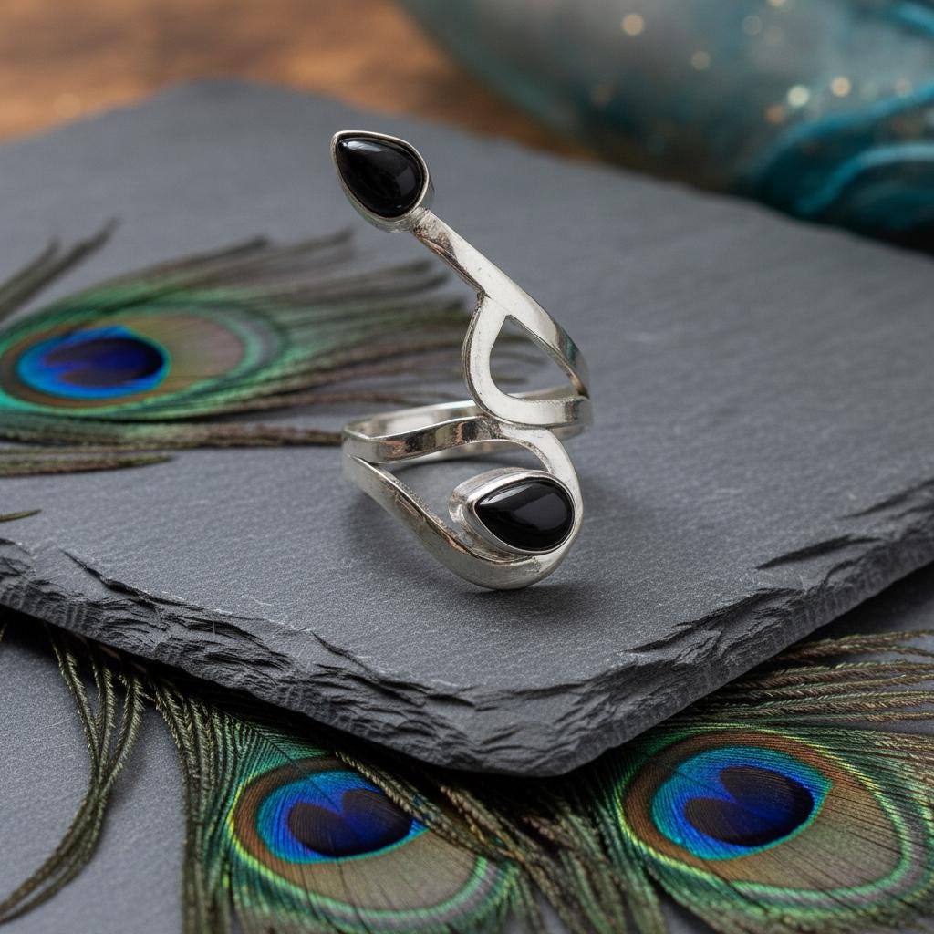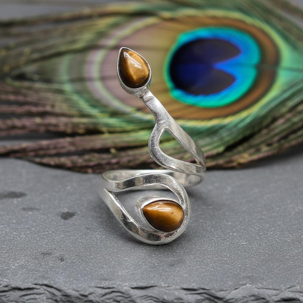 This handmade adjustable brass ring features natural gemstones shaped into elegant double teardrops, creating a flowing, organic design that wraps beautifully around the finger. Each gemstone carries its own energy, making every ring a personal talisman.