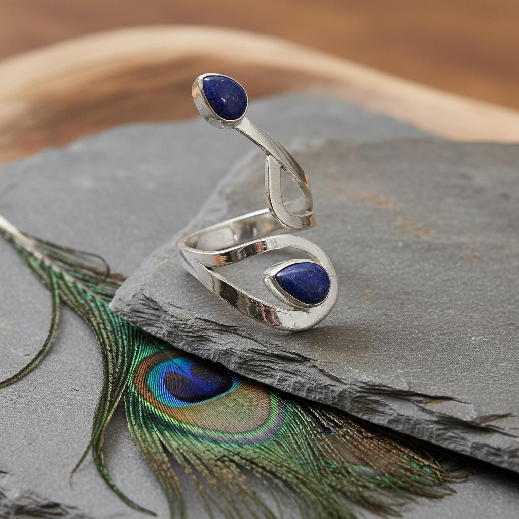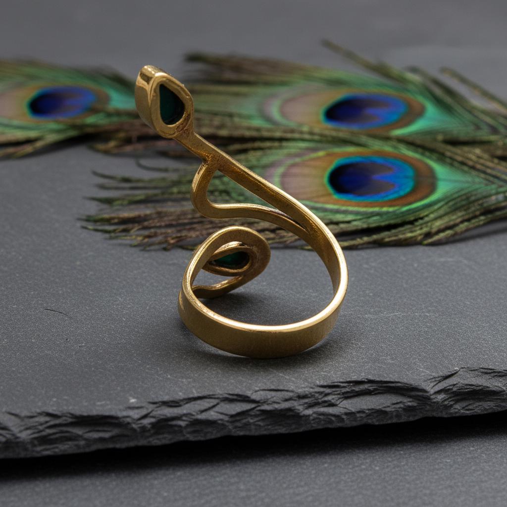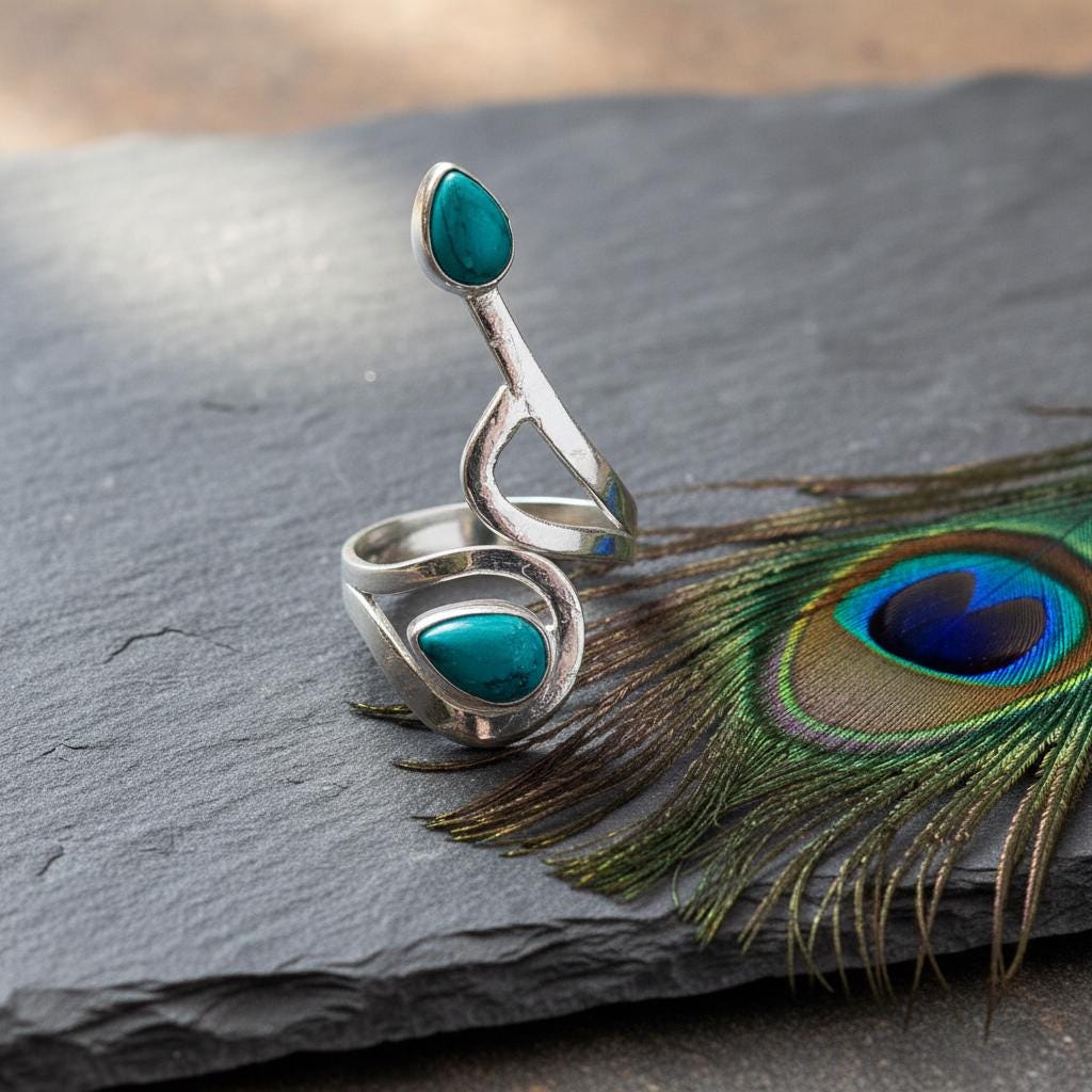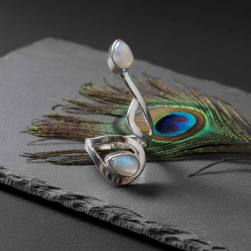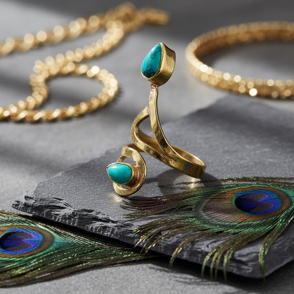 This handmade adjustable brass ring features natural gemstones shaped into elegant double teardrops, creating a flowing, organic design that wraps beautifully around the finger. Each gemstone carries its own energy, making every ring a personal talisman.