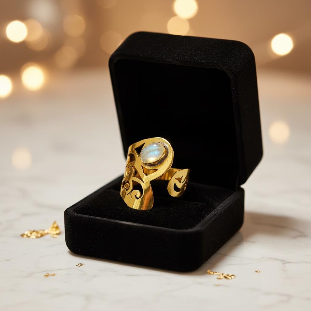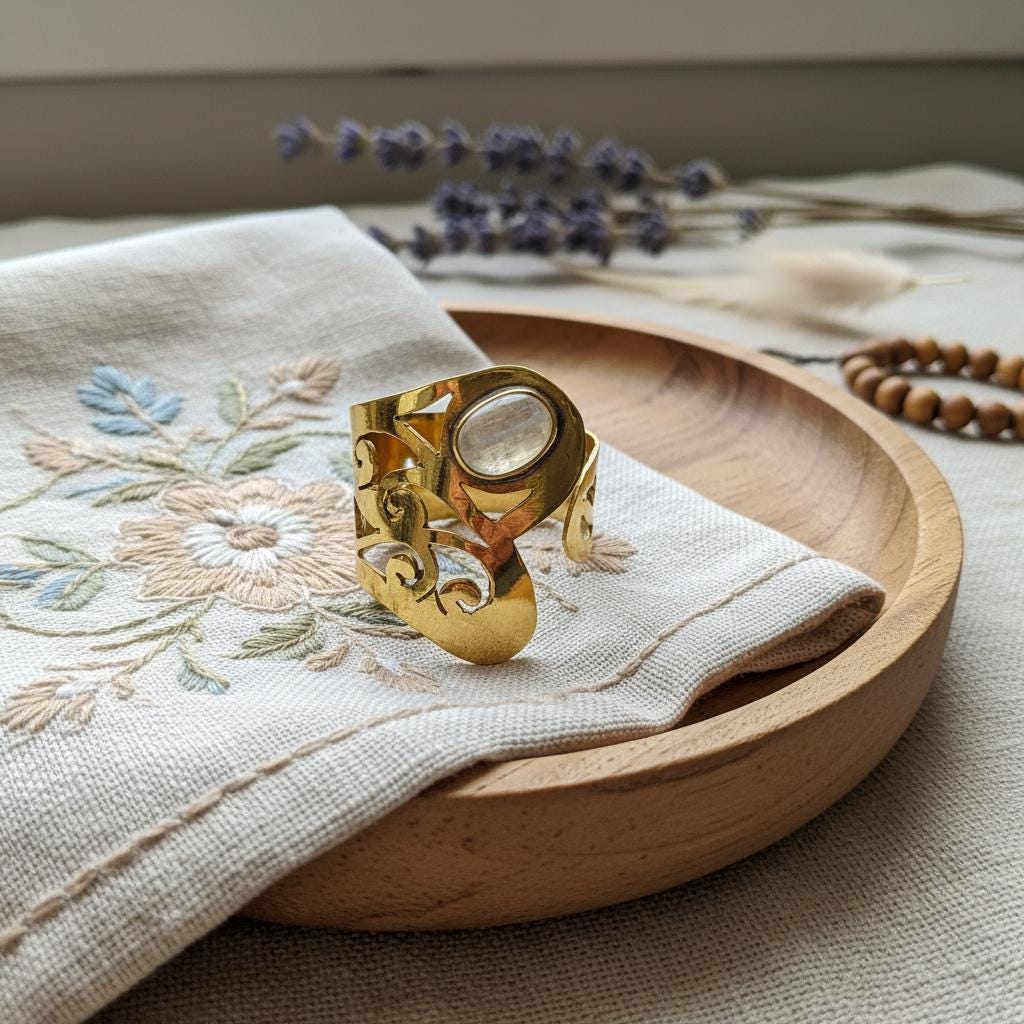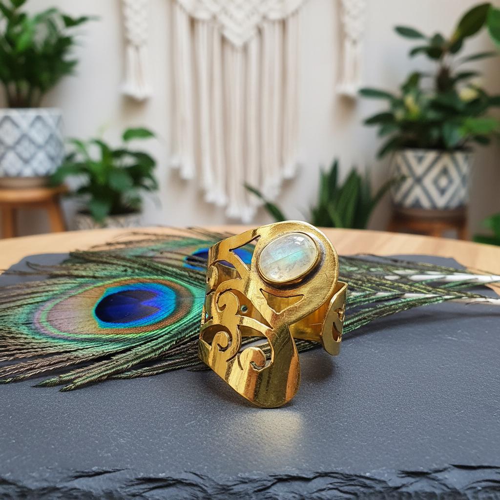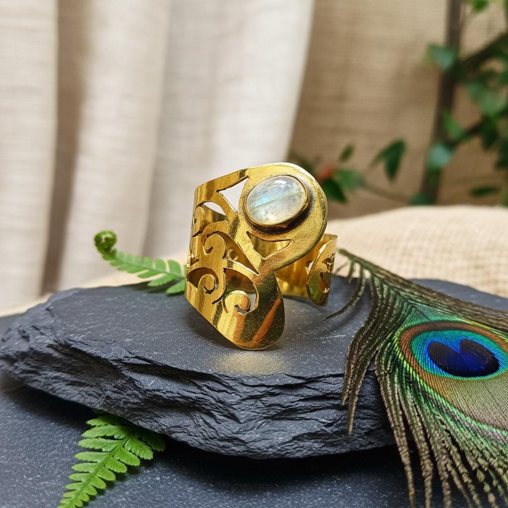 At the center, a stone cabochon adds a soft, luminous accent that enhances the ring’s spiritual and earthy character. The contrast between the organic stone and the warm brass structure creates a powerful yet balanced design.
