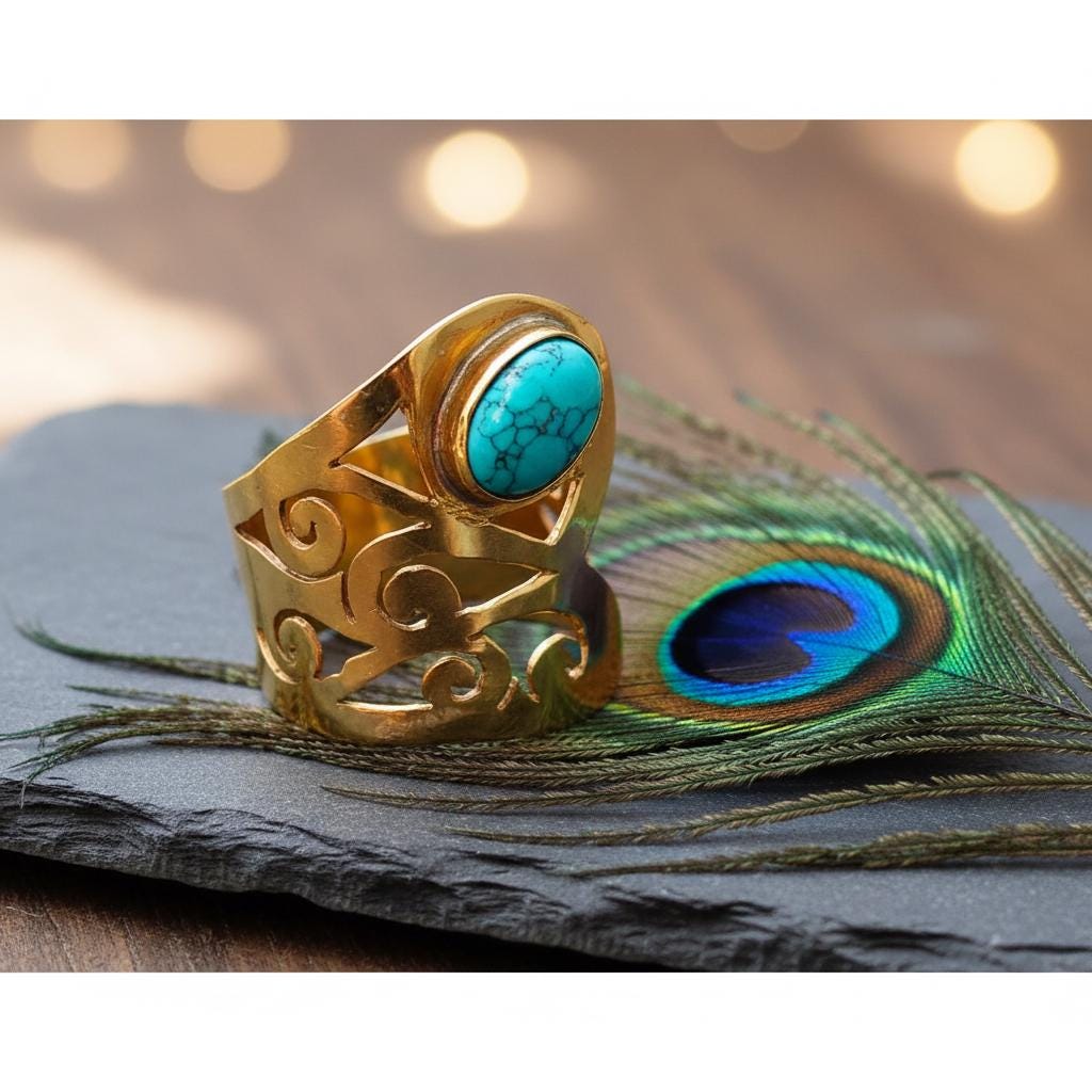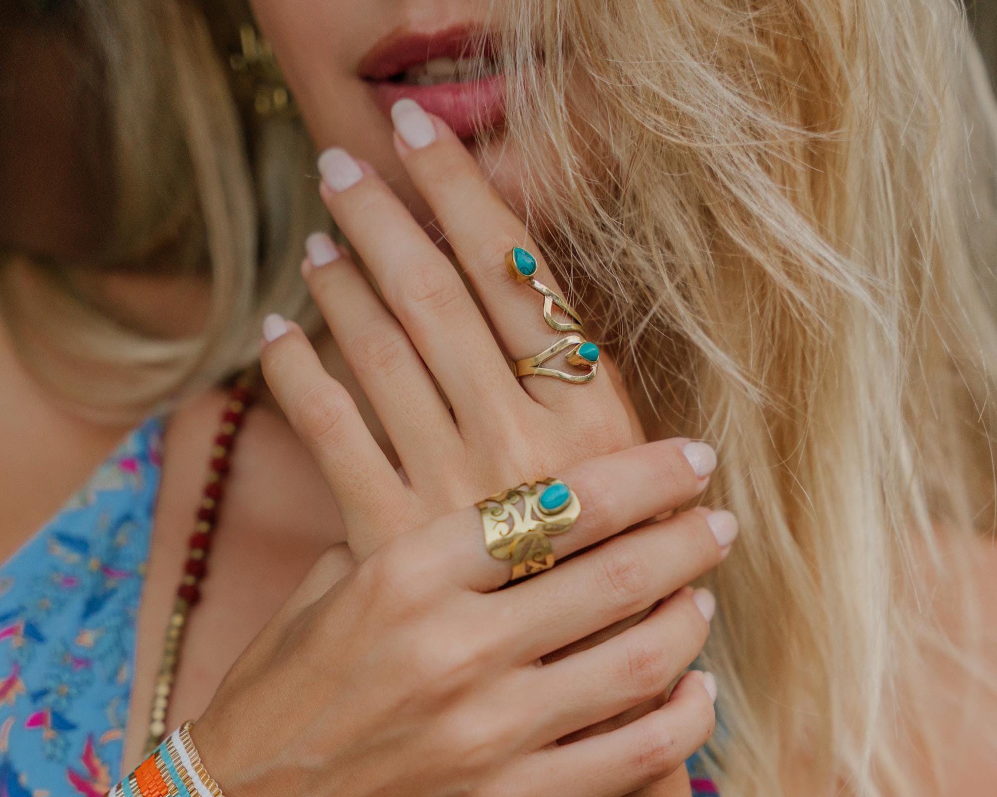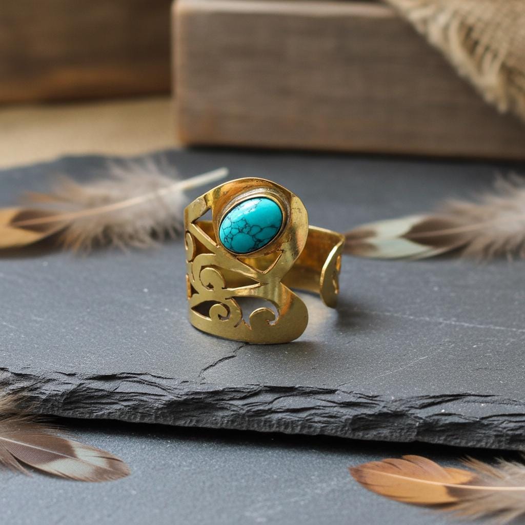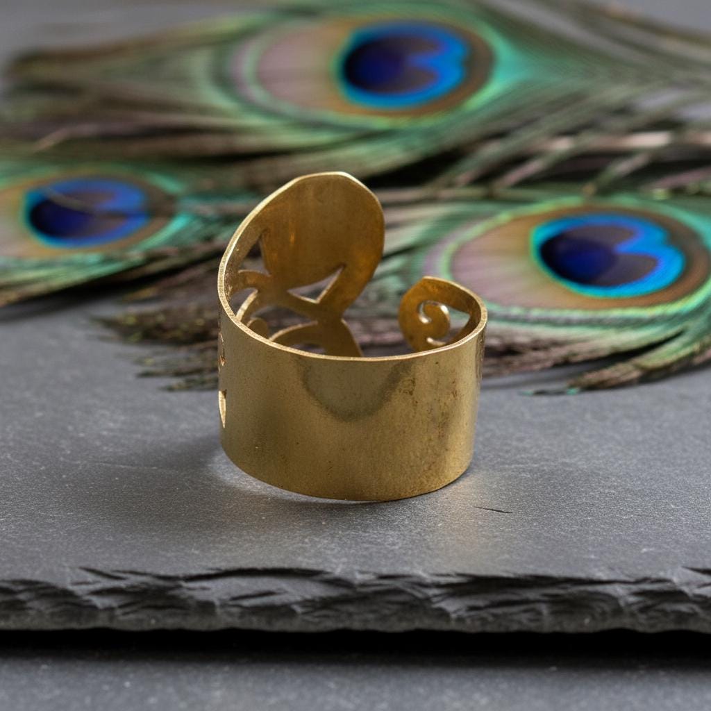 This statement brass ring is a bold and expressive design inspired by boho, oriental, and ethnic jewelry traditions. The wide band is adorned with flowing ornamental cut-out motifs, creating an elegant sculptural look that wraps beautifully around the finger.