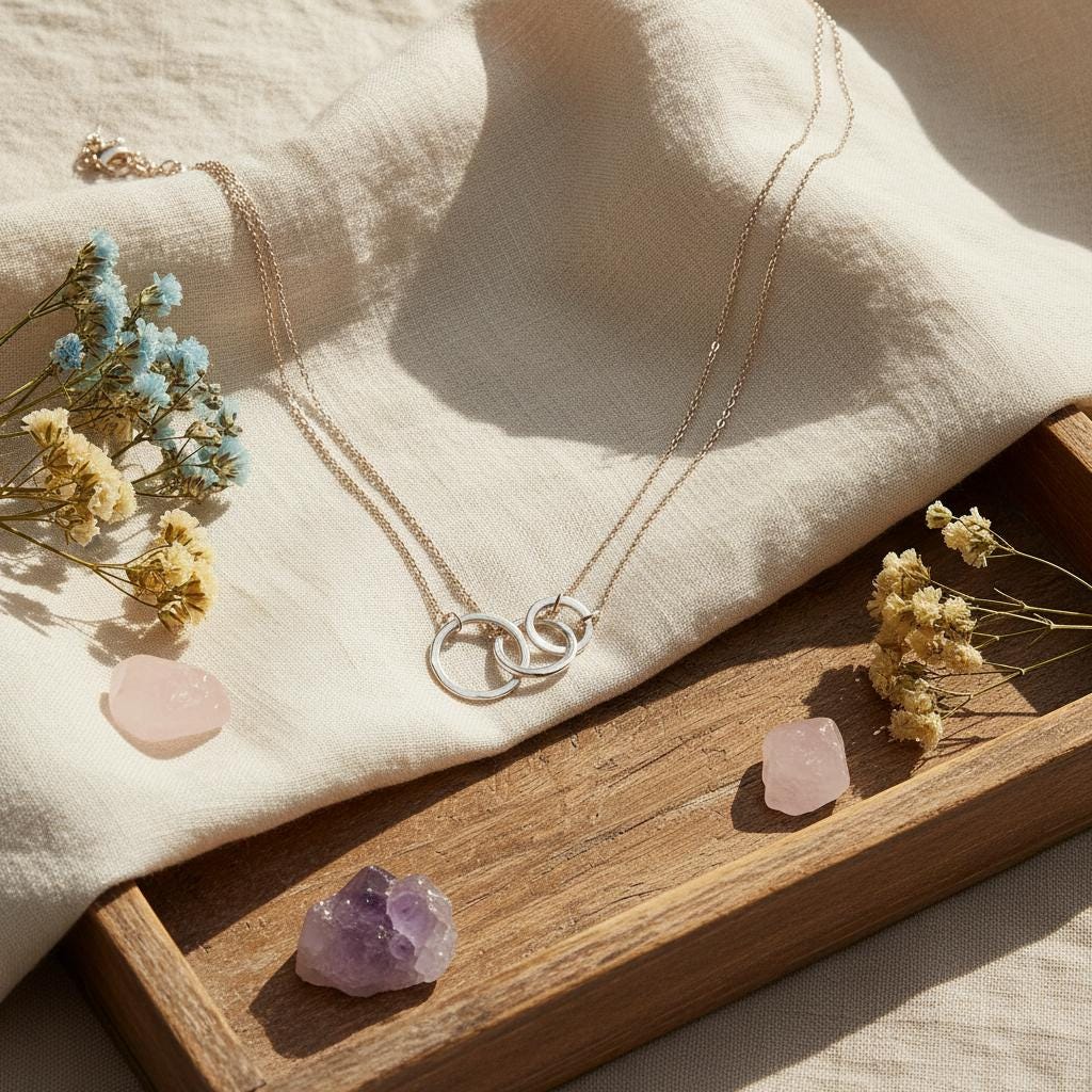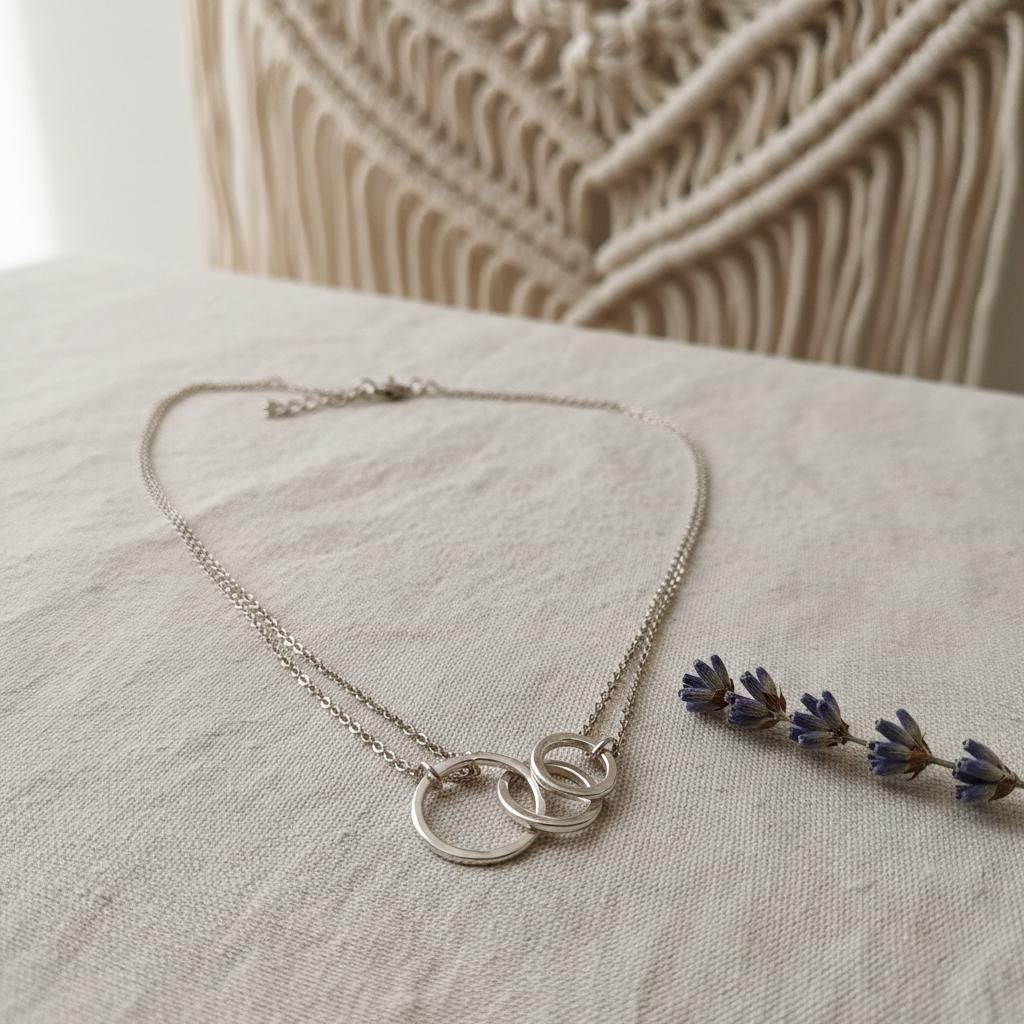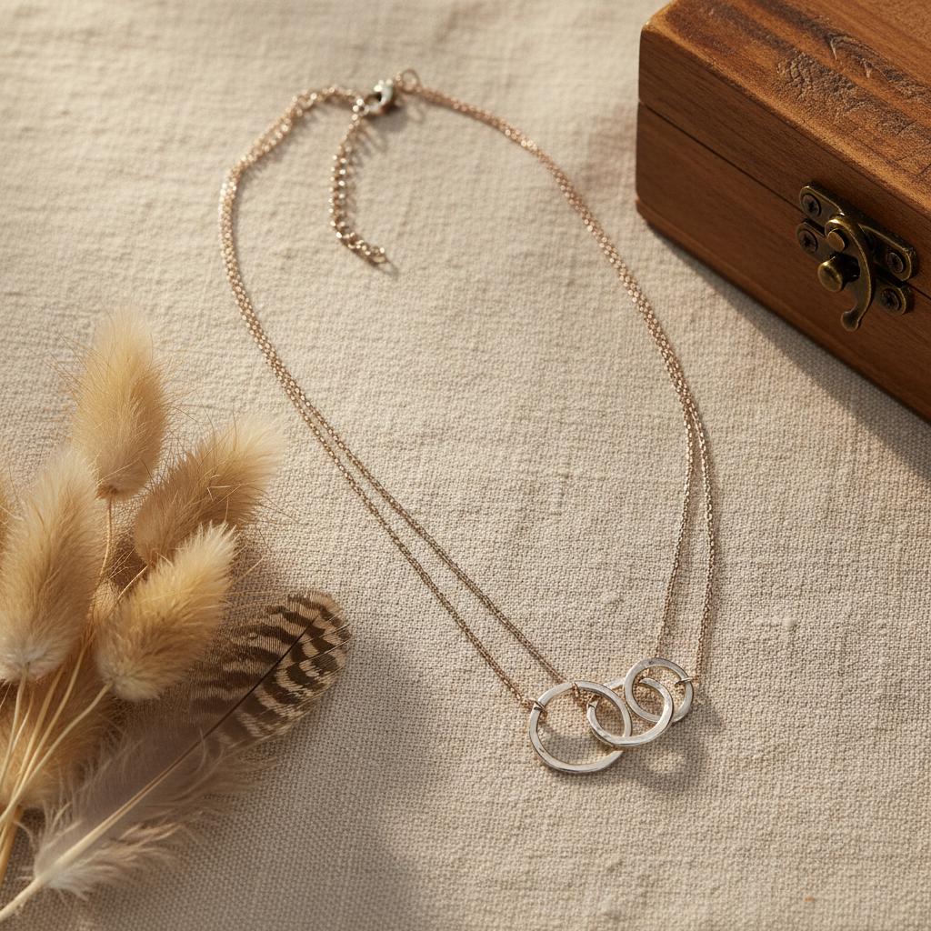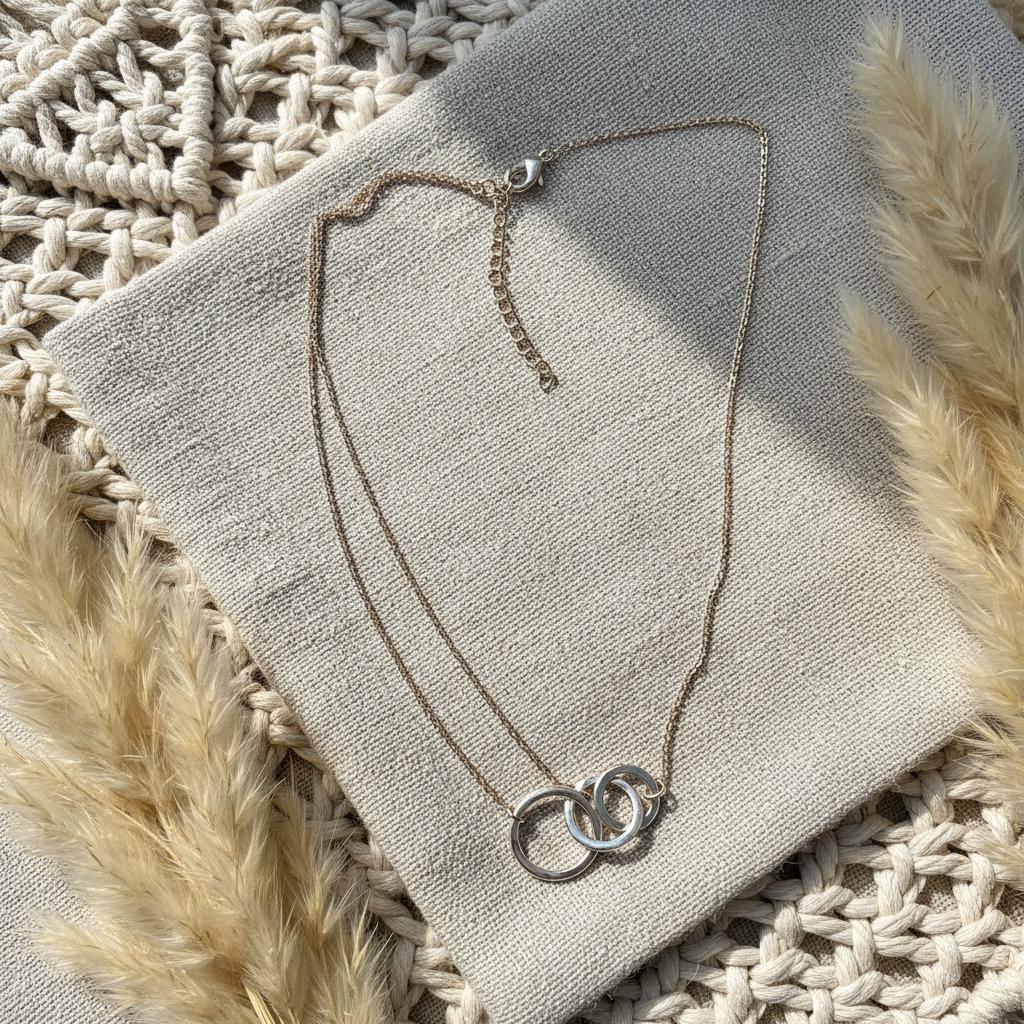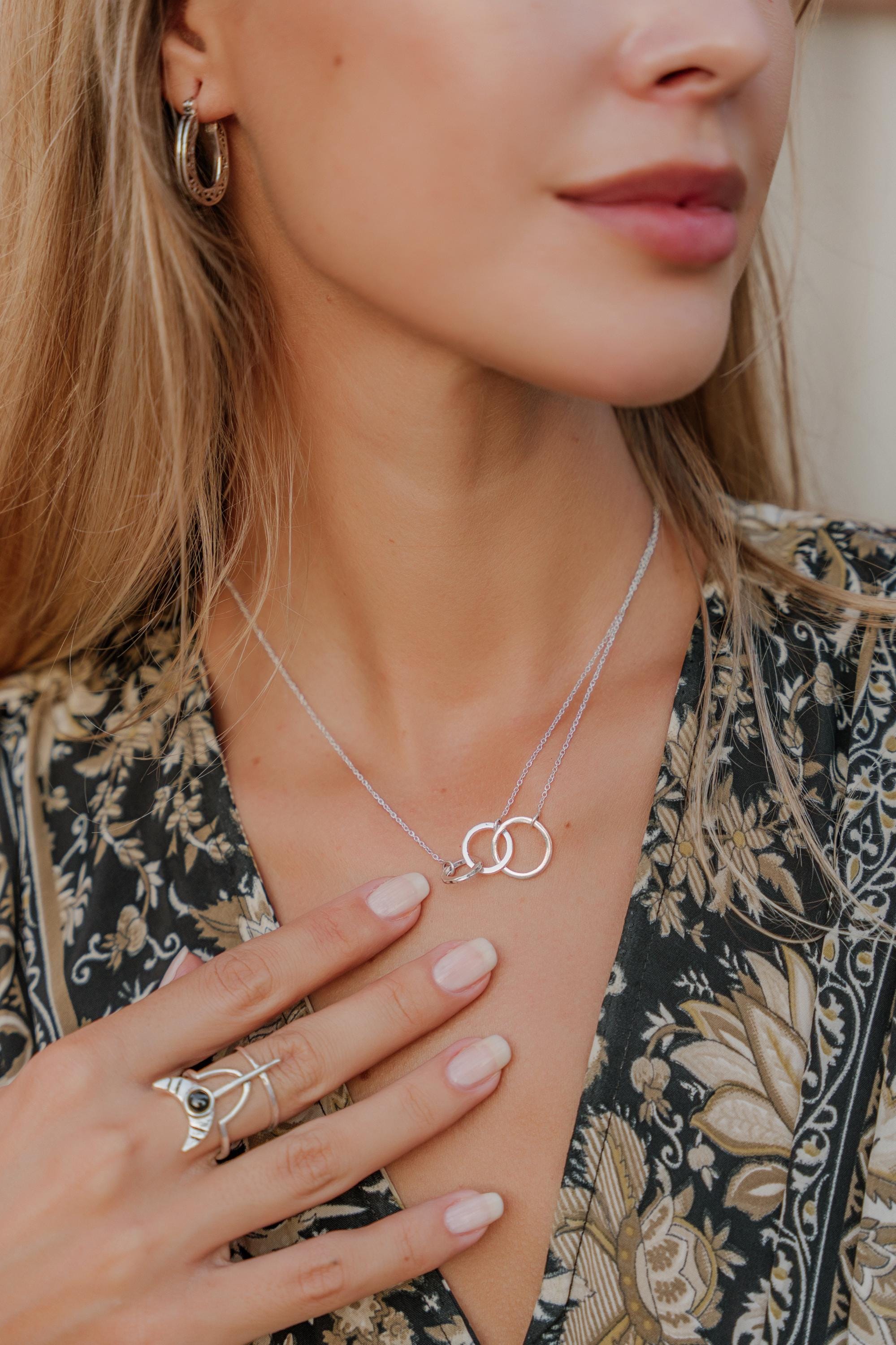 This minimalist interlocking circle necklace is a timeless piece designed for modern, effortless style. Featuring two delicately linked rings suspended on a fine chain, this necklace symbolizes connection, balance, and unity, making it both meaningful and elegant.