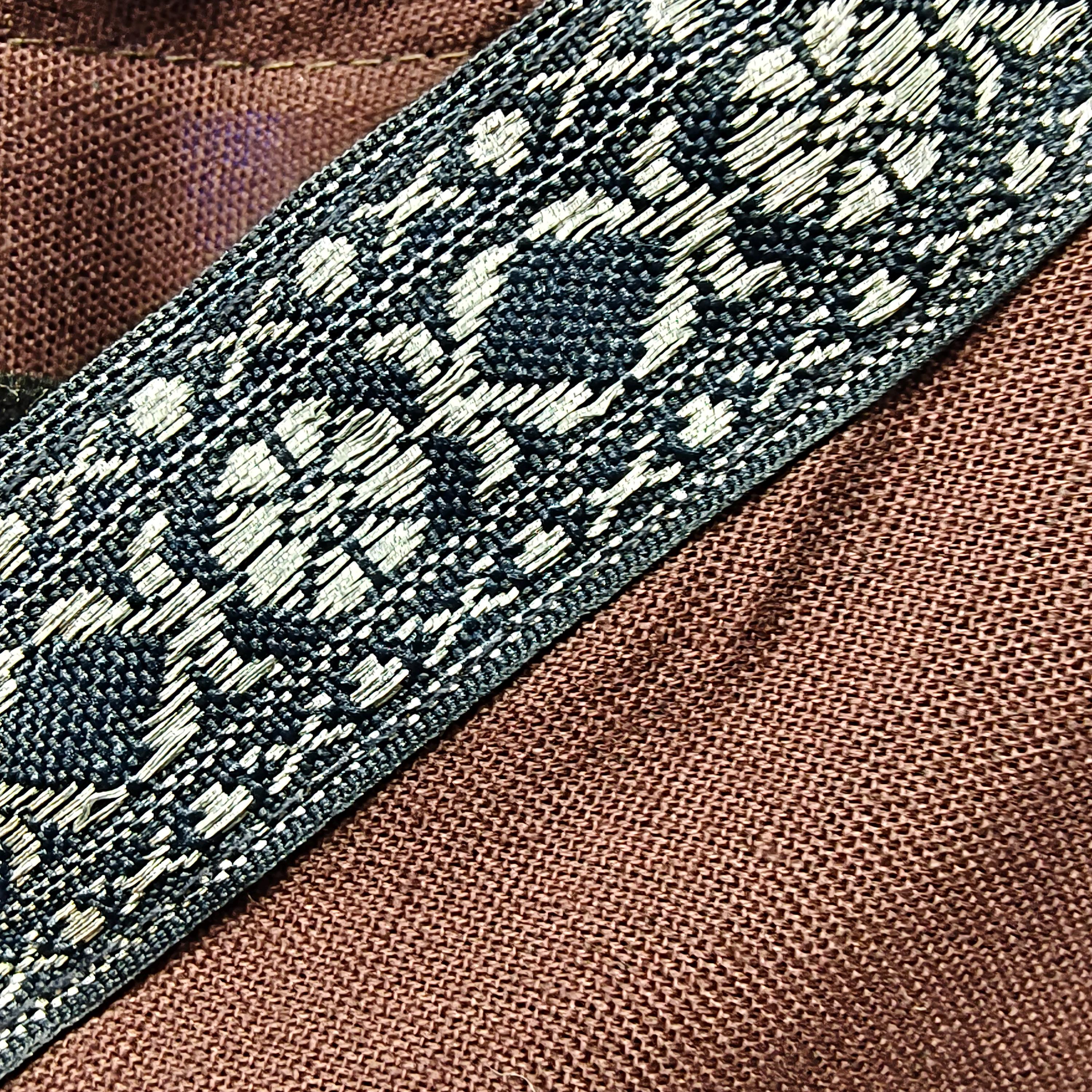 This tunic features a classic V-neck design, subtly enhanced with a stunning silver floral patterns woven ribbon.