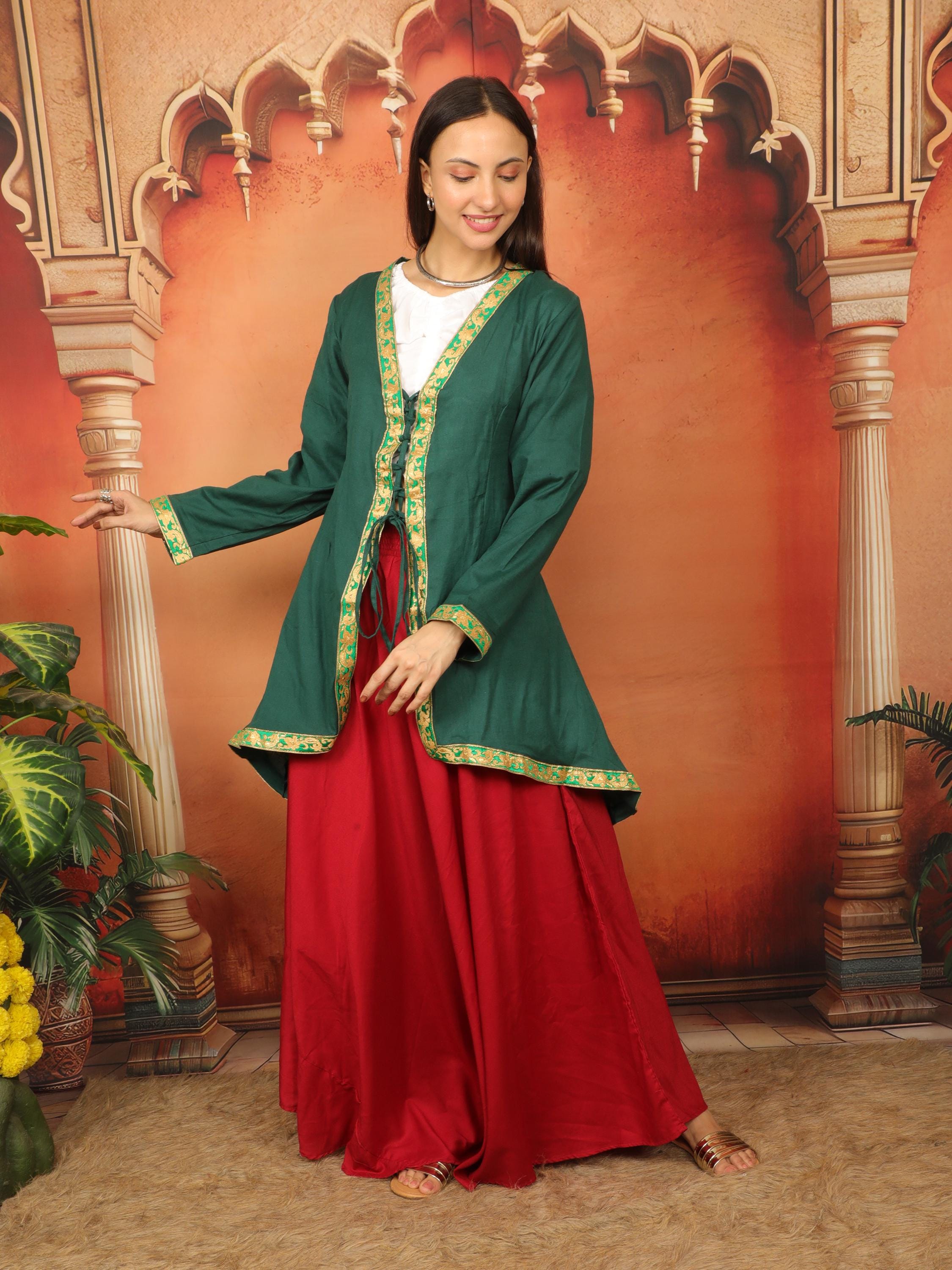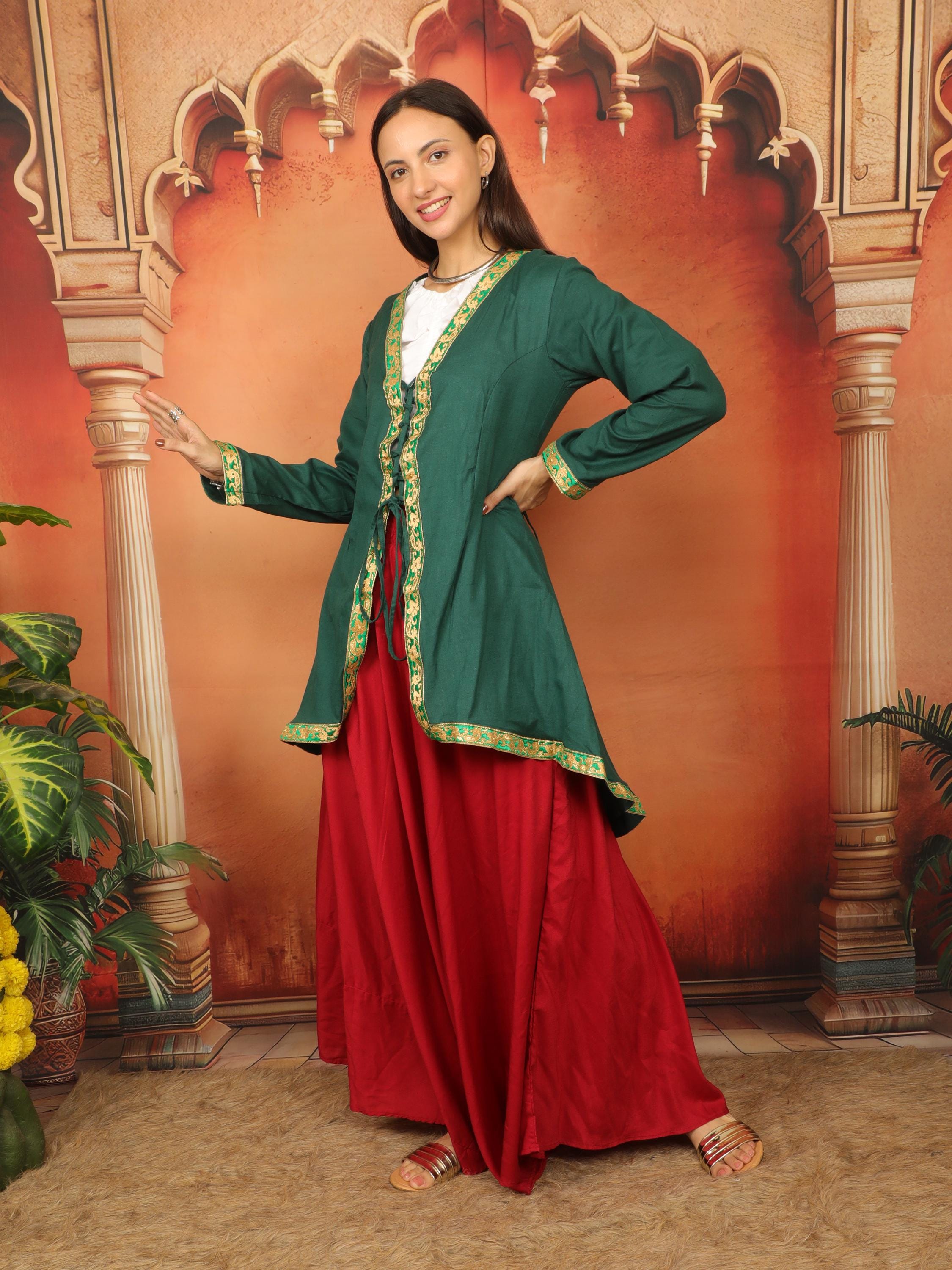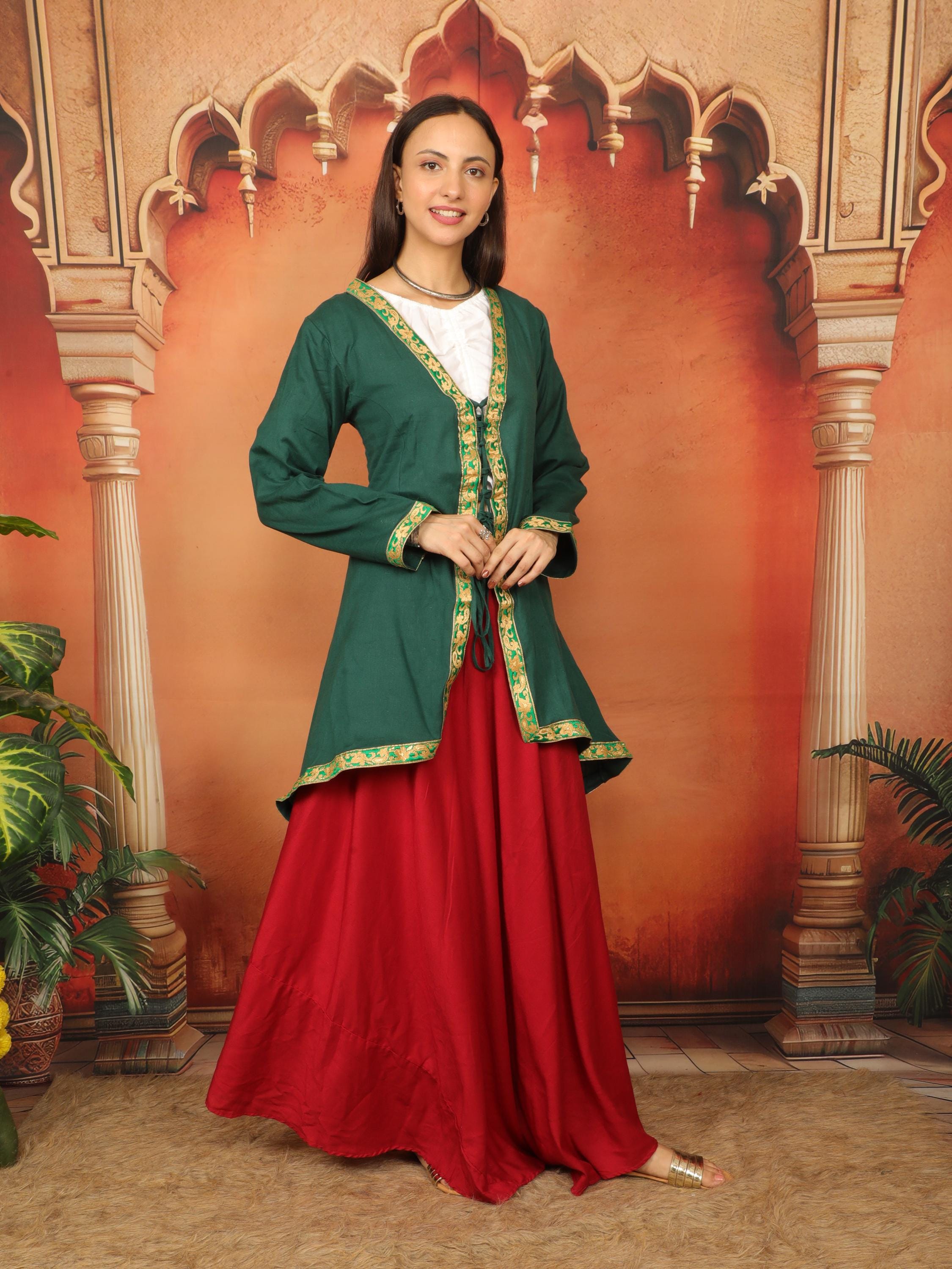 This unique Women's Long Cosplay Vest features a flattering, flared silhouette, crafted from rich dark green-colored cotton.