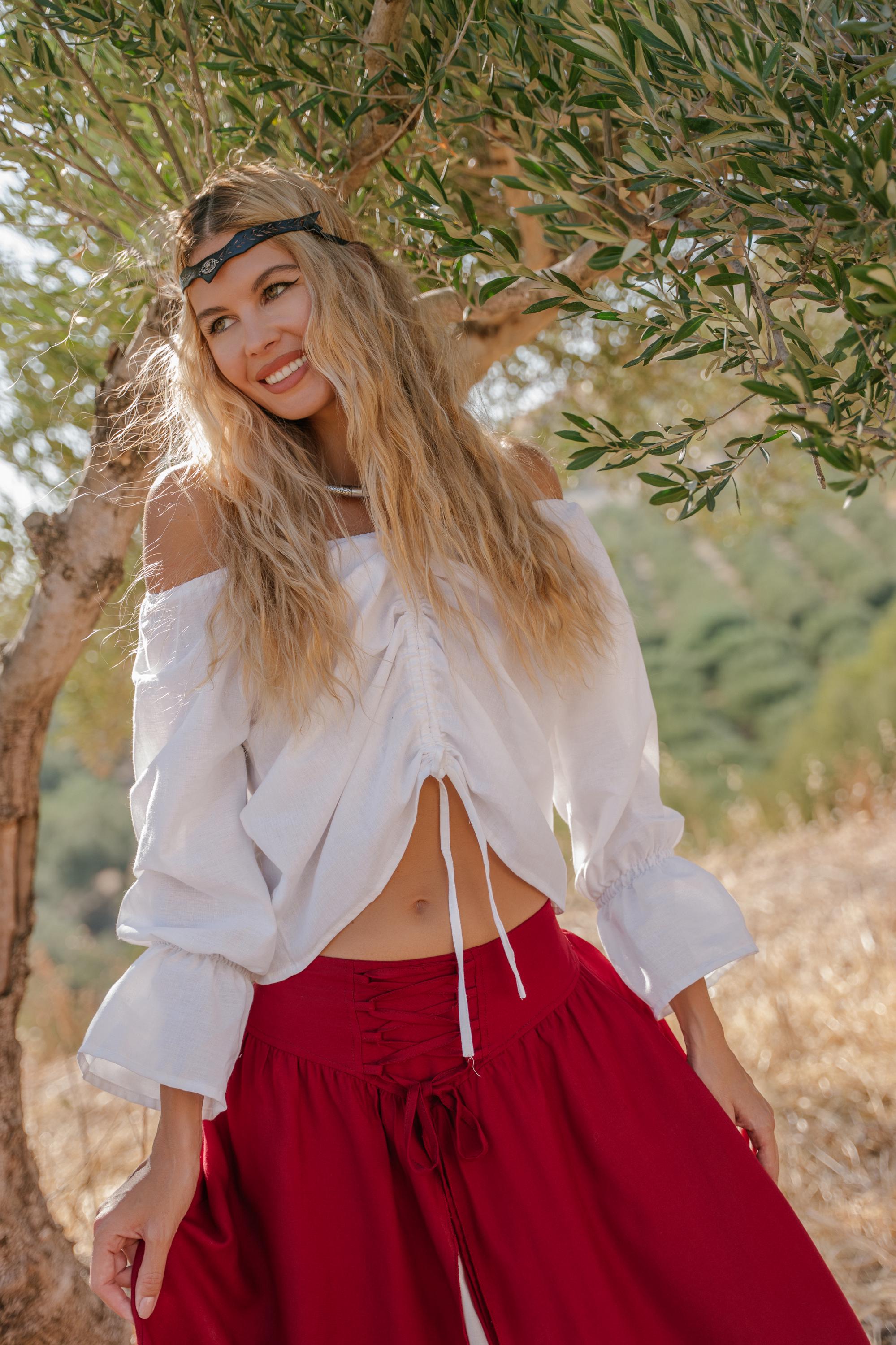 Pair it with a flowing skirt and a leather belt for a complete historical look, or dress it down with jeans for a touch of bohemian flair.